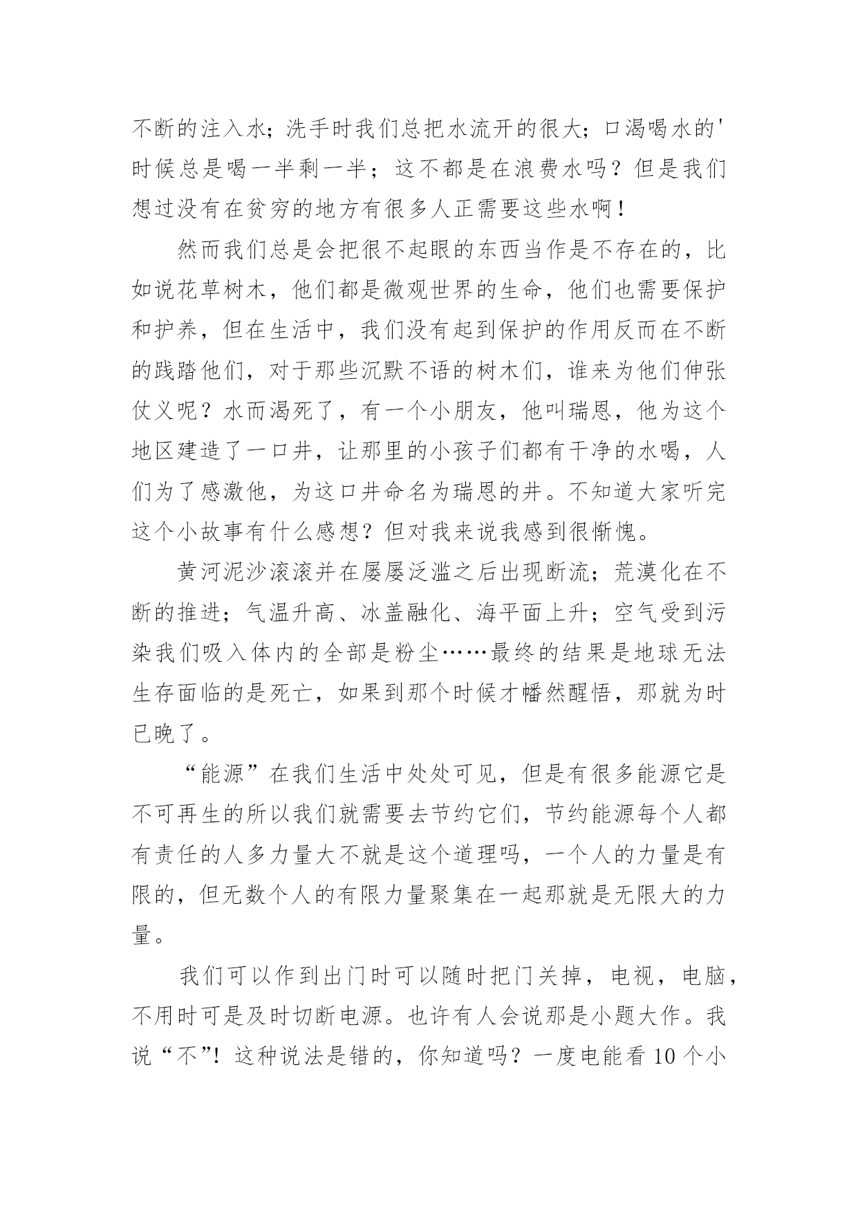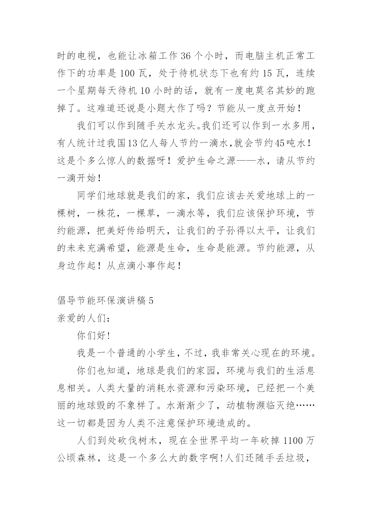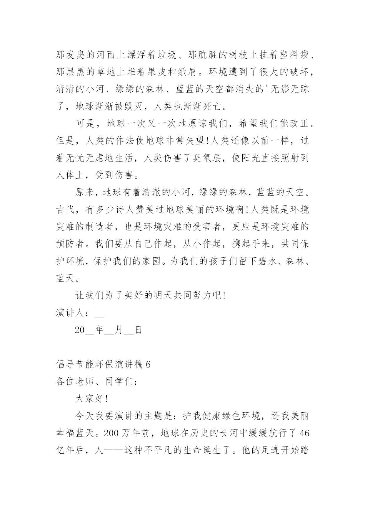 倡导节能环保演讲稿通过对演讲稿语言的推究可以提高语言的表现力,增强语言的感染力。在现在的社会生活中,演讲稿使用的情况越来越多,那么你有了解过演讲稿吗?以下是小编整理的倡导节能环保演讲稿,仅供参考,欢迎大家阅读。倡导节能环保演讲稿1尊敬的老师,亲爱的同学们:大家好!今天我演讲的题目是:低碳环保,人人有责。近几年,低碳环保这个词语越来越热门,因为低碳与环保是一种生活方式。那些低碳环保人士正在努力的呼吁每一个人做到环保的生活。解释低碳与环保这个词很简单,就是指生活作息中所耗用的能量要尽量的减少,从而减低碳排放,特别是二氧化碳的排放。人人都知道,我们吸入氧气,呼出二氧化碳。我们不可以不喘气。但我们可以从生活方面来控制它。现在,越来越多的环境问题出现,温室气体让地球发高烧,本世纪末海平面可能会升高1.9米。生物物种会减少,甚至影响到形体的变化。这些问题都与我们的`生活息息相关,它们在提醒我们要爱护地球母亲,不该让它背负太多的垃圾。地球是我们赖以生存的家园这句话每个人都耳熟能详,但对于地球来说,我们能做的真的很少。我们生活在地球上,就对它有了责任,所以环保,早就应该尽力的开始了。国家也在呼吁节能减排,倡导全社会低碳出行,绿色环保。有人认为低碳生活很艰难,其实不然,降低碳排放量有很多办法。在我们日常生活中就可以轻易做到。夏天快到了,现在的气温比往年都高,许多人会一回家就把空调打开,并且把空调的温度调到最低。这一举动又给了二氧化碳重出江湖创造了机会。每开一小时就增加了0.621KG的碳。我们每一个人开一个小时的空调,那你可以想象二氧化碳的排放有多少,那数目将是大道惊人。所以我们在夏天,还是要做到尽量开风扇,既省电,又低碳。一举两得。如果非要开空调,那么,空调的温度控制在26度。汽车的废气排放量也是非常巨大的,现在越来越多的人家配置了小汽车,小汽车越多,废气的排放量就越大。工具的废气排放量占到温室气体排放的30%。这是多么恐怖的一个数字啊。所以,减少此类气体排放的办法就是低碳出行,那就是骑自行车或乘坐公交车,更是可以步行,同时也锻炼身体。对于我们学生一代来说,我们也可以从很多方面做起,担当起该有的责任。我们可以用学生的力量,大力宣传低碳环保的重要性,学校也可以组织相应的活动来提高学生们的环保意识。同学们可以在学习与生活中学会低碳环保,我们可以从衣食住行等各个方面来体现低碳环保。生活在这个世纪,低碳环保生活很快就会成为一种体现个人品味的生活方式。走进低碳,改造环境。做到低碳环保,更是人人有责。我的演讲到此结束,谢谢大家!倡导节能环保演讲稿2尊敬的老师,亲爱的同学们:大家好!我们的祖国还是发展中国家,如果要发展得更好,就必须要做到低碳环保才可以。也只有如此,我们的国家才能更加繁荣富强。低碳听起来复杂,但是只要实践起来,却是十分简单的。只要每个人有一点儿低碳的意识,并且身体力行地去实践,就能做到低碳。现在,人们被金钱、利益所诱惑,迷失了方向。一栋栋高楼大厦拔地而起;一棵棵绿荫如盖的大树被无情地伐倒;一只只在天空自由自在飞翔的`鸟儿被残忍地射下来。人们太残忍了,如果人们不把钱看得太重的话,今天的环境就会很好,不会被严重地污染了!人们万万没有想到以前的“少年”——地球,现在也一天一天地衰老下去。当一些自然灾害突然来临时,我们难道没有想到造成这种结果的原因,恰恰是人类自己吗?现在,经济已经比较发达,我们的绿色家园——地球,却在为我们默默地牺牲着。汽车的尾气,使人整天头昏脑胀;遍地工厂的烟囱更是让人感觉乌烟瘴气;人类的生命之源——水,却被一些丧失良心的企业污染着……试想一下,我们只有低碳,才能让明天的生活更美好!如果我们少开一天汽车,就可以做到低碳;每天的淘米水可以用来洗手、擦家具,洁净如新;出门购物,自己带环保袋,无论是免费或者收费的塑料袋,都减少使用;出门自带喝水杯,减少使用一次性杯子;养成随手关电源的习惯,避免浪费用电……这些都是我们举手之劳就可以做到的低碳生活啊!人类,醒醒吧!地球将在人类的践踏下慢慢变老,难道只有到了她苟延残喘的时候,我们才惊醒吗?人啊!不要再做害人利己的事情了!不要在金钱的诱惑之下,干一些丧尽天良的事情了。只要我们能做到低碳,只要我们不乱伐树木、不再杀动物们,保护它们……我们的地球会变得越来越好,我们的生活就会越来越幸福。让我们为建立一个全新的绿色家园一起努力吧!保护环境,低碳生活,从你我做起!倡导节能环保演讲稿3敬爱的老师,亲爱的同学们:你们好!从远古时起,我们的祖先就明白利用能源来为自我的生活服务,而到了今日,我们的祖先繁琐衍了一代又一代子孙,我们还是像他们一样,利用着能源。然而能源是有限的,我们不能只研究我们这一代,也要为下一代留有可利用的能源。从我在生活中的观察学习中看,我认为节俭能源的方法有下头这些:首先,对于水资源