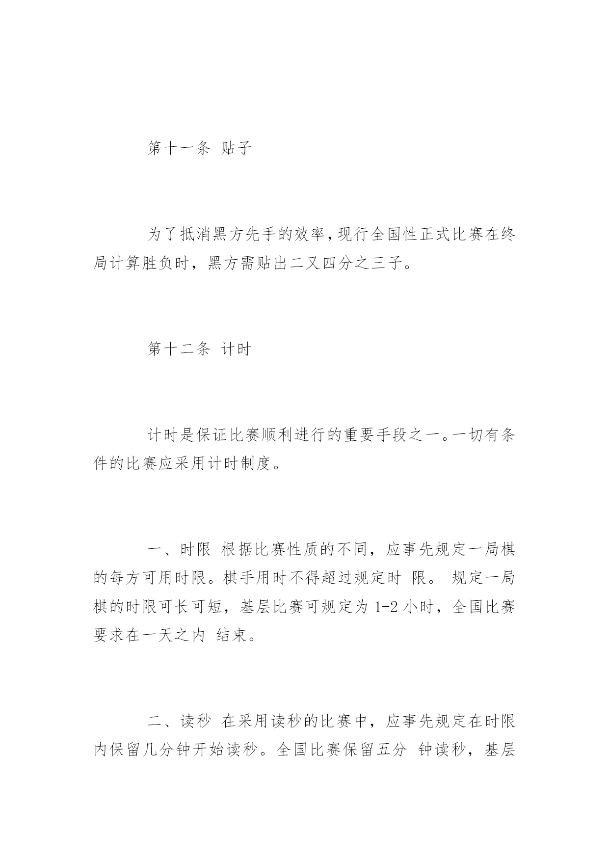 中国围棋竞赛规则第二章竞赛规定中国围棋竞赛规则第二章竞赛规定中国围棋竞赛规则于1988年经中华人民共和国体育运动委员会审定公布,由第一章总则、第二章竞赛规定、第三章裁判法则、第四章比赛办法、第五章竞赛组织及其他这五部分组成。其中本围棋竞赛规则的第二章竞赛规定共包括先后手的确定、贴子、计时、终局、对局的暂停和封棋、赛场纪律、对局者的权利和义务这7条规则。中国围棋竞赛规则(1988)中华人民共和国体育运动委员会审定第二章竞赛规定第十条先后手的确定对局的先后手,由大会抽签编排或对局前猜先决定。第十一条贴子为了抵消黑方先手的效率,现行全国性正式比赛在终局计算胜负时,黑方需贴出二又四分之三子。第十二条计时计时是保证比赛顺利进行的重要手段之一。一切有条件的比赛应采用计时制度。一、时限根据比赛性质的不同,应事先规定一局棋的每方可用时限。棋手用时不得超过规定时限。规定一局棋的时限可长可短,基层比赛可规定为1-2小时,全国比赛要求在一天之内结束。二、读秒在采用读秒的比赛中,应事先规定在时限内保留几分钟开始读秒。全国比赛保留五分钟读秒,基层比赛亦可保留一分钟开始读秒。读秒时,凡一步棋用时不足一分钟的不计时间。每满一分钟则在保留时间内扣除一分钟,但不得用完规定时间。读秒工作由裁判员执行,在30秒、40秒、50秒、55秒、58秒、一分钟时各报秒一次。每扣除保留的一分钟,裁判员应及时通知棋手“还剩X分钟”。最后一分钟读秒的方式是30秒、40秒、50秒、然后1、2、3、4、5、6、7、8、9...以准确的语声逐秒报出。最后的报法是“10,超时判负”。快棋比赛的读秒办法,可根据具体情况由竞赛大会另作规定。第十三条终局一、除总则第七条的规定外,凡比赛一方弃权或因各种原因被裁判员判负、判和的对局,也作终局处理。二、双方确认的终局,确认的次序应是,先由轮走方,后是对方以异色棋子一枚放于已方棋盘右下角的线外。第十四条对局的暂停和封棋规定有暂停的比赛对局中(如一日制比赛,中午须暂停等)暂停时间不计入对局时限。重大的比赛,可采用封棋制度,当比赛到规定的封棋时间,而对局尚未结束。已下过子的一方应立即退场,轮下子的一方思考后,把准备下的点写在记录纸上,然后密封交裁判员。续赛时,裁判员当场启封,按所标记的位置下子,比赛继续进行。第十五条赛场纪律一、对局者不得无故弃权和中途退出比赛。二、比赛时,对局者不得有任何妨碍对方思考的行为。三、比赛中,对局者不得和其他人议论对局的棋势,或查阅有关资料。四、比赛中,对局者不得随意在赛场来回走动,观看他人的棋局。五、对局者应注意言行文明,保持衣着整洁。第十六条对局者的权利和义务一、读秒时,有询问已方还剩几分钟的权利。二、如出现足以妨碍自己正常比赛的现象或发现问题,有向裁判员提出意见的权利。但除较紧迫的事件外,对局者应在自己走棋的时间内提出。三、终局计算胜负时,对局者有要求纠正数子和计算胜负失误的权利。四、裁判员作出判决,对局者必须服从,如有疑义应通过组织程序立即向大会提出申诉。五、对局者有遵守赛场纪律的义务。六、在对手离席时下的子,有告诉对方棋子下在哪里的义务。七、比赛终局后,对局者有整理好棋具和立即退场的义务。