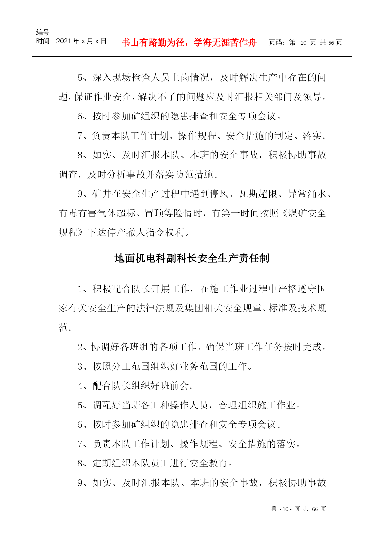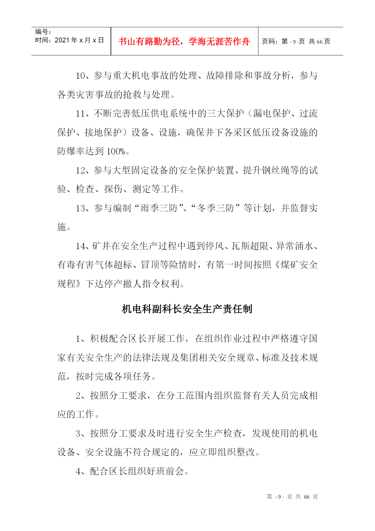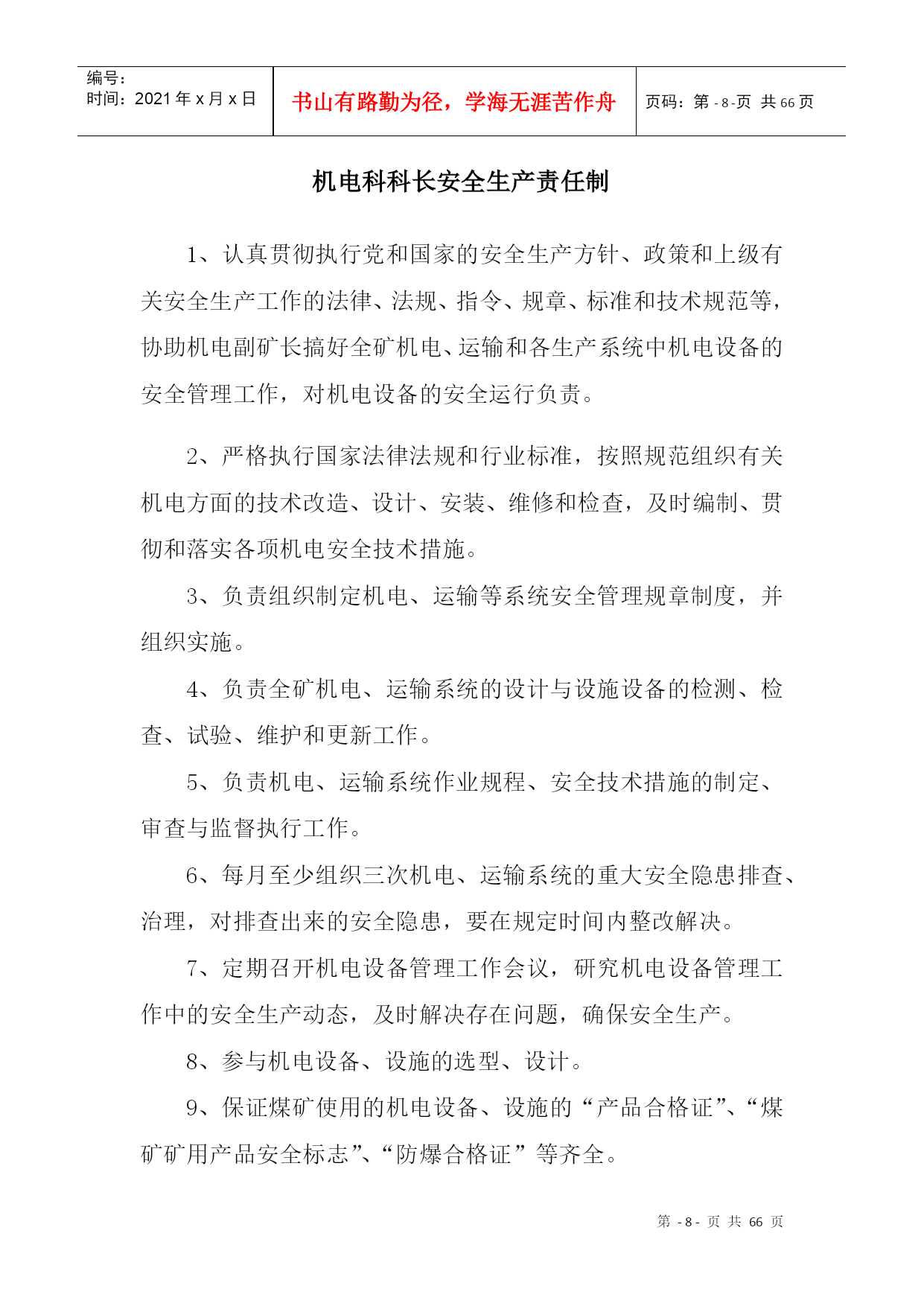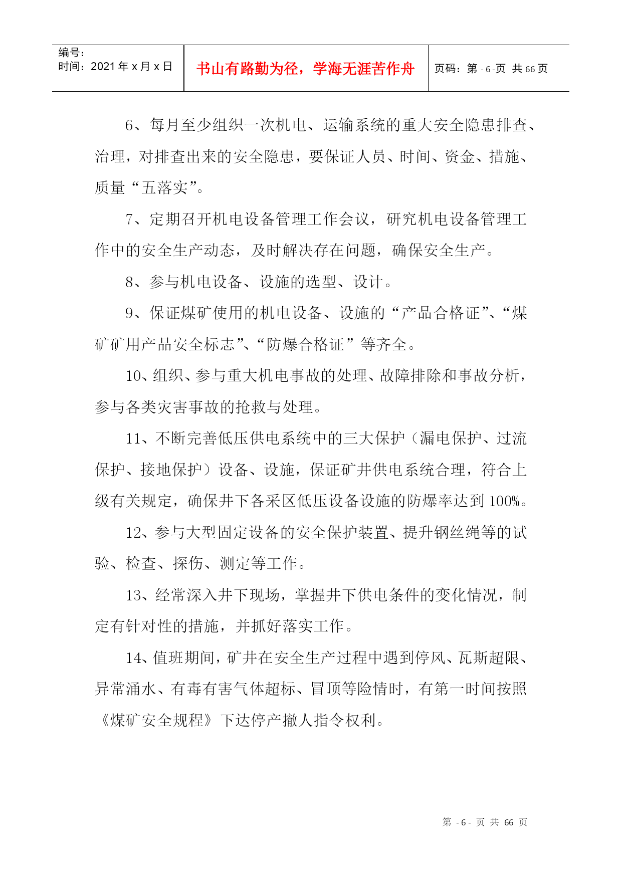 编号:时间:2021年x月x日书山有路勤为径,学海无涯苦作舟页码:第PAGE-66-页共NUMPAGES66页第PAGE\*MERGEFORMAT-66-页共NUMPAGES\*MERGEFORMAT66页目录TOC\o"1-2"\h\uHYPERLINK\l_Toc30275机电矿长安全生产责任制PAGEREF_Toc30275-4-HYPERLINK\l_Toc32264机电总工程师安全生产责任制PAGEREF_Toc32264-5-HYPERLINK\l_Toc10252机电科科长安全生产责任制PAGEREF_Toc10252-6-HYPERLINK\l_Toc31220机电科副科长安全生产责任制PAGEREF_Toc31220-8-HYPERLINK\l_Toc6291地面机电科副科长安全生产责任制PAGEREF_Toc6291-8-HYPERLINK\l_Toc13090机电科班(组)长安全生产责任制PAGEREF_Toc13090-9-HYPERLINK\l_Toc21866井下电钳工安全生产责任制PAGEREF_Toc21866-10-HYPERLINK\l_Toc703井下变电所值班员安全生产责任制PAGEREF_Toc703-11-HYPERLINK\l_Toc9006机电科技术员安全生产责任制PAGEREF_Toc9006-12-HYPERLINK\l_Toc15147井下通讯维护工安全生产责任制PAGEREF_Toc15147-12-HYPERLINK\l_Toc14231机电科设备管理员安全生产责任制PAGEREF_Toc14231-13-HYPERLINK\l_Toc16024机电资料管理员安全生产责任制PAGEREF_Toc16024-14-HYPERLINK\l_Toc6262机电科内务管理员安全生产责任制PAGEREF_Toc6262-14-HYPERLINK\l_Toc21291机电科安装工安全生产责任制PAGEREF_Toc21291-15-HYPERLINK\l_Toc19280机电科电气管理员安全生产责任制PAGEREF_Toc19280-16-HYPERLINK\l_Toc9860机电科防爆管理员安全生产责任制PAGEREF_Toc9860-17-HYPERLINK\l_Toc21678机电科防爆检查员安全生产责任制PAGEREF_Toc21678-18-HYPERLINK\l_Toc10955电焊工安全生产责任制PAGEREF_Toc10955-18-HYPERLINK\l_Toc26326气焊工安全生产责任制PAGEREF_Toc26326-19-HYPERLINK\l_Toc588935KV变电站值班员安全生产责任制PAGEREF_Toc5889-19-HYPERLINK\l_Toc1518035KV变电站检修工安全生产责任制PAGEREF_Toc15180-21-HYPERLINK\l_Toc19197井下高压配电工安全生产责任制PAGEREF_Toc19197-22-HYPERLINK\l_Toc5475电修组组长安全生产责任制PAGEREF_Toc5475-22-HYPERLINK\l_Toc31144地面电工安全生产责任制PAGEREF_Toc31144-23-HYPERLINK\l_Toc4177机修厂班组长安全生产责任制PAGEREF_Toc4177-24-HYPERLINK\l_Toc2266机械修理工安全生产责任制PAGEREF_Toc2266-25-HYPERLINK\l_Toc2403主扇风机司机安全生产责任制PAGEREF_Toc2403-26-HYPERLINK\l_Toc21654空压机司机安全生产责任制PAGEREF_Toc21654-27-HYPERLINK\l_Toc29157电气修理工安全生产责任制PAGEREF_Toc29157-28-HYPERLINK\l_Toc4641备用发电机组司机岗位责任制PAGEREF_Toc4641-29-HYPERLINK\l_Toc21538综掘机司机安全生产责任制PAGEREF_Toc21