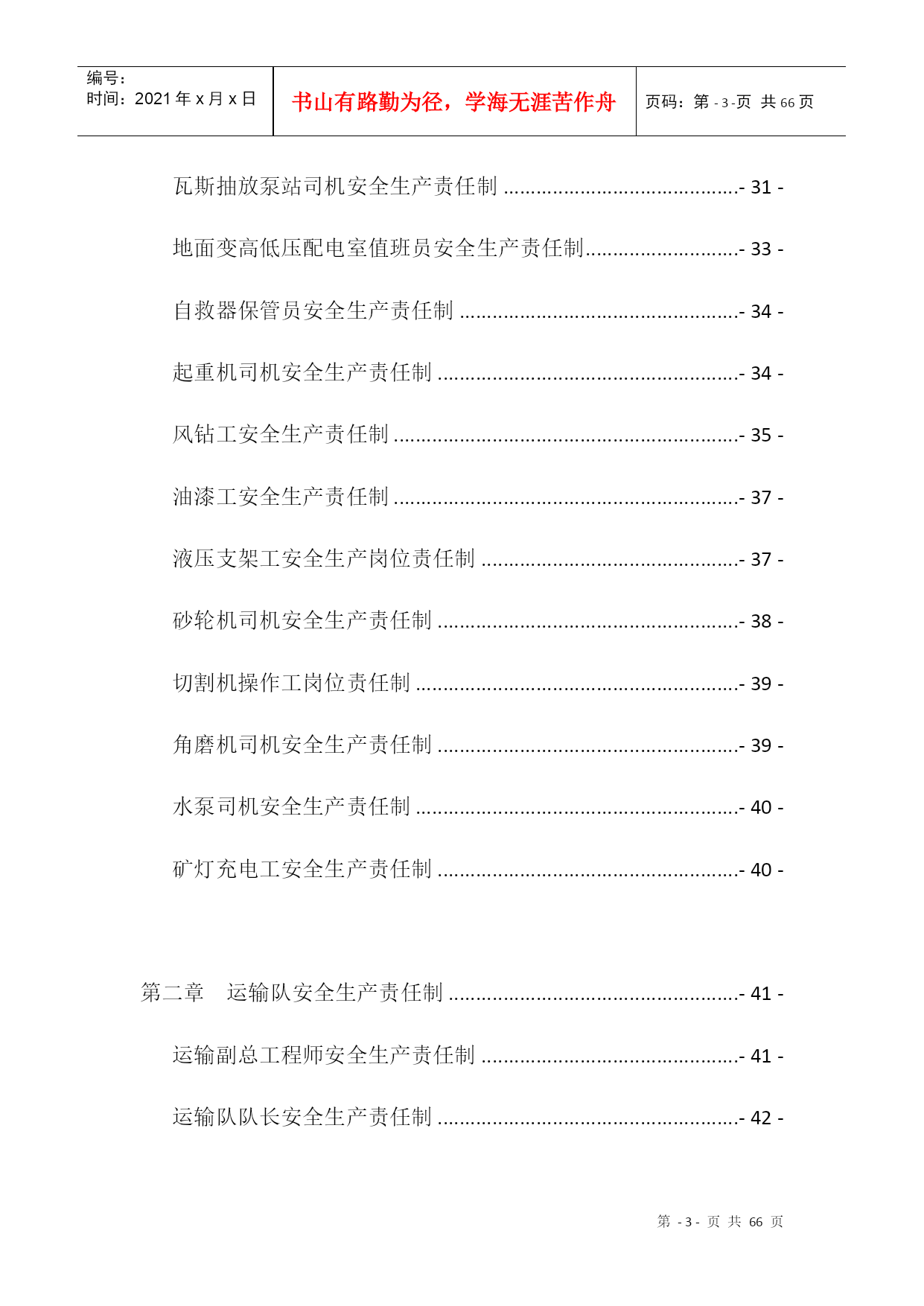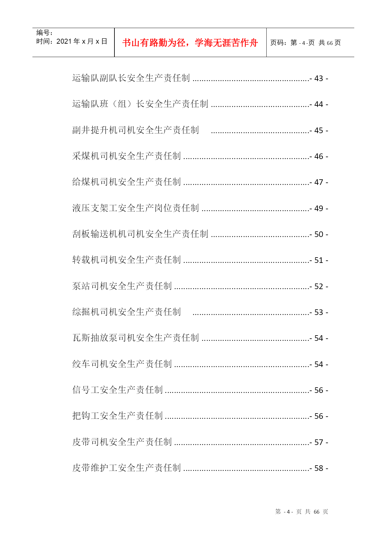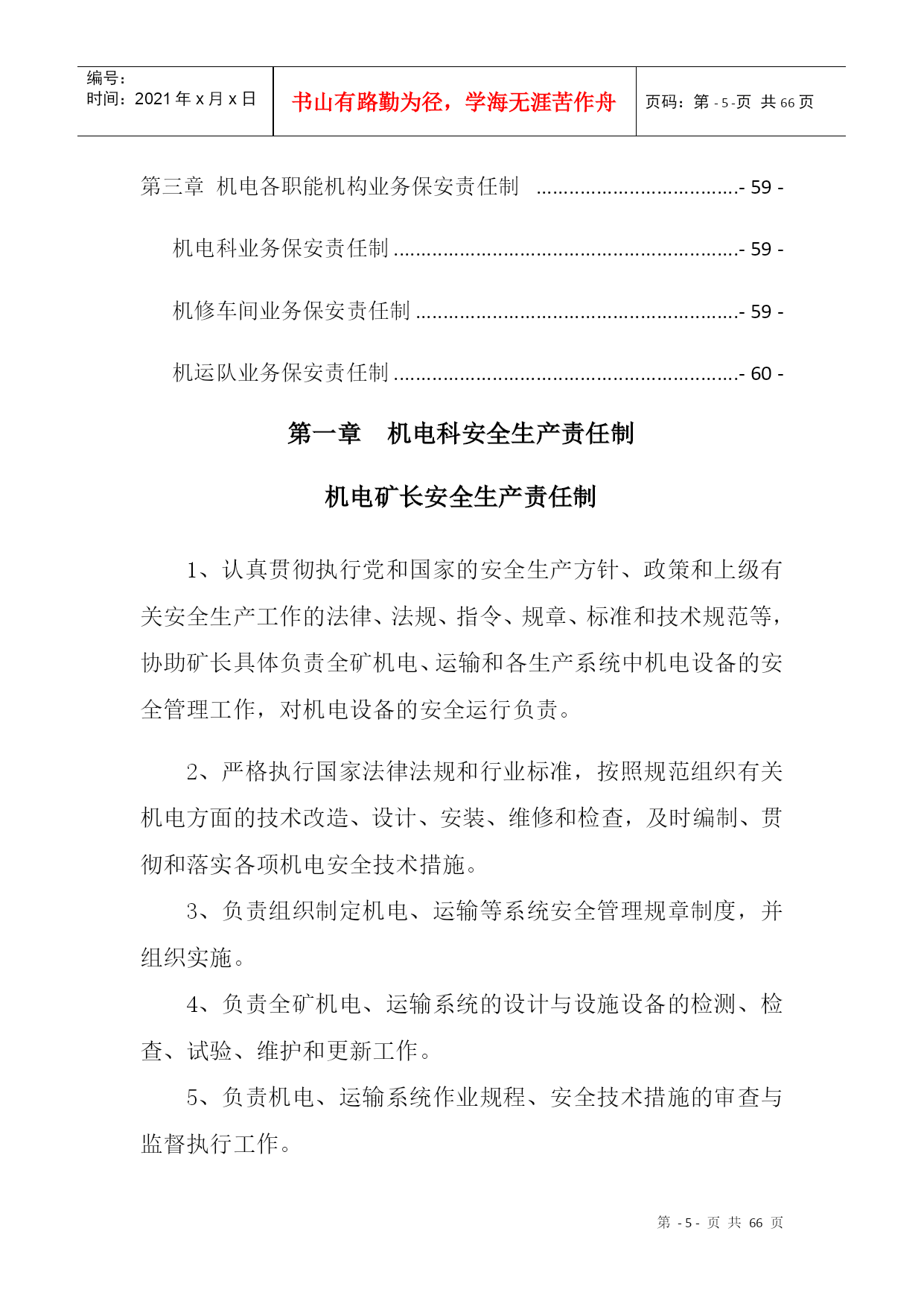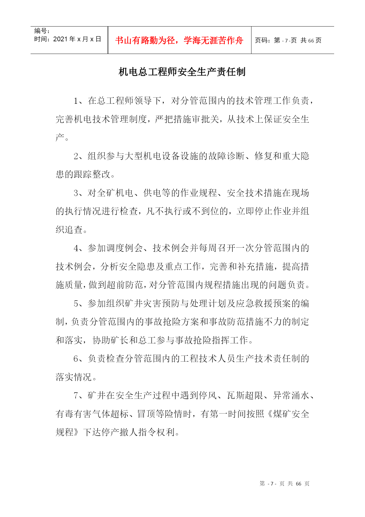 编号:时间:2021年x月x日书山有路勤为径,学海无涯苦作舟页码:第PAGE-66-页共NUMPAGES66页第PAGE\*MERGEFORMAT-66-页共NUMPAGES\*MERGEFORMAT66页目录TOC\o"1-2"\h\uHYPERLINK\l_Toc30275机电矿长安全生产责任制PAGEREF_Toc30275-4-HYPERLINK\l_Toc32264机电总工程师安全生产责任制PAGEREF_Toc32264-5-HYPERLINK\l_Toc10252机电科科长安全生产责任制PAGEREF_Toc10252-6-HYPERLINK\l_Toc31220机电科副科长安全生产责任制PAGEREF_Toc31220-8-HYPERLINK\l_Toc6291地面机电科副科长安全生产责任制PAGEREF_Toc6291-8-HYPERLINK\l_Toc13090机电科班(组)长安全生产责任制PAGEREF_Toc13090-9-HYPERLINK\l_Toc21866井下电钳工安全生产责任制PAGEREF_Toc21866-10-HYPERLINK\l_Toc703井下变电所值班员安全生产责任制PAGEREF_Toc703-11-HYPERLINK\l_Toc9006机电科技术员安全生产责任制PAGEREF_Toc9006-12-HYPERLINK\l_Toc15147井下通讯维护工安全生产责任制PAGEREF_Toc15147-12-HYPERLINK\l_Toc14231机电科设备管理员安全生产责任制PAGEREF_Toc14231-13-HYPERLINK\l_Toc16024机电资料管理员安全生产责任制PAGEREF_Toc16024-14-HYPERLINK\l_Toc6262机电科内务管理员安全生产责任制PAGEREF_Toc6262-14-HYPERLINK\l_Toc21291机电科安装工安全生产责任制PAGEREF_Toc21291-15-HYPERLINK\l_Toc19280机电科电气管理员安全生产责任制PAGEREF_Toc19280-16-HYPERLINK\l_Toc9860机电科防爆管理员安全生产责任制PAGEREF_Toc9860-17-HYPERLINK\l_Toc21678机电科防爆检查员安全生产责任制PAGEREF_Toc21678-18-HYPERLINK\l_Toc10955电焊工安全生产责任制PAGEREF_Toc10955-18-HYPERLINK\l_Toc26326气焊工安全生产责任制PAGEREF_Toc26326-19-HYPERLINK\l_Toc588935KV变电站值班员安全生产责任制PAGEREF_Toc5889-19-HYPERLINK\l_Toc1518035KV变电站检修工安全生产责任制PAGEREF_Toc15180-21-HYPERLINK\l_Toc19197井下高压配电工安全生产责任制PAGEREF_Toc19197-22-HYPERLINK\l_Toc5475电修组组长安全生产责任制PAGEREF_Toc5475-22-HYPERLINK\l_Toc31144地面电工安全生产责任制PAGEREF_Toc31144-23-HYPERLINK\l_Toc4177机修厂班组长安全生产责任制PAGEREF_Toc4177-24-HYPERLINK\l_Toc2266机械修理工安全生产责任制PAGEREF_Toc2266-25-HYPERLINK\l_Toc2403主扇风机司机安全生产责任制PAGEREF_Toc2403-26-HYPERLINK\l_Toc21654空压机司机安全生产责任制PAGEREF_Toc21654-27-HYPERLINK\l_Toc29157电气修理工安全生产责任制PAGEREF_Toc29157-28-HYPERLINK\l_Toc4641备用发电机组司机岗位责任制PAGEREF_Toc4641-29-HYPERLINK\l_Toc21538综掘机司机安全生产责任制PAGEREF_Toc21