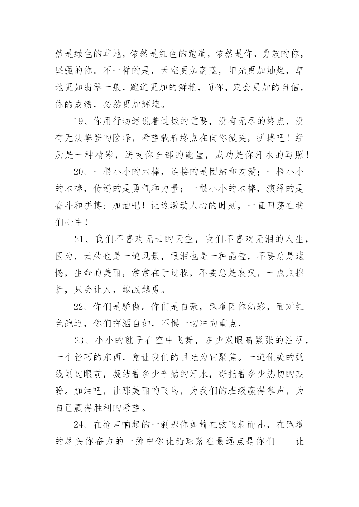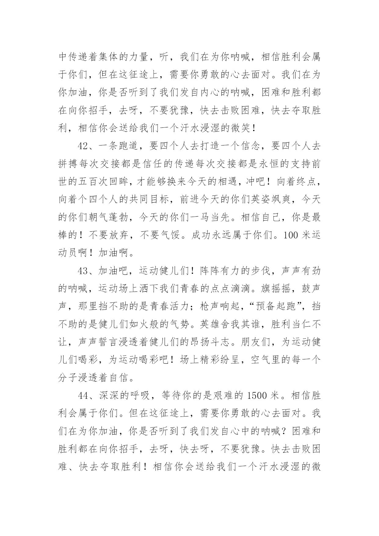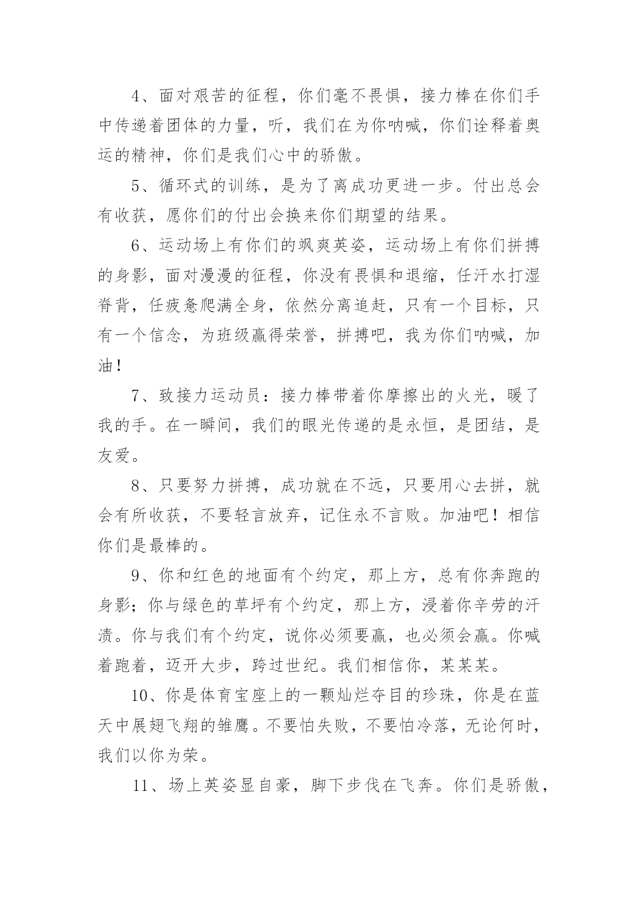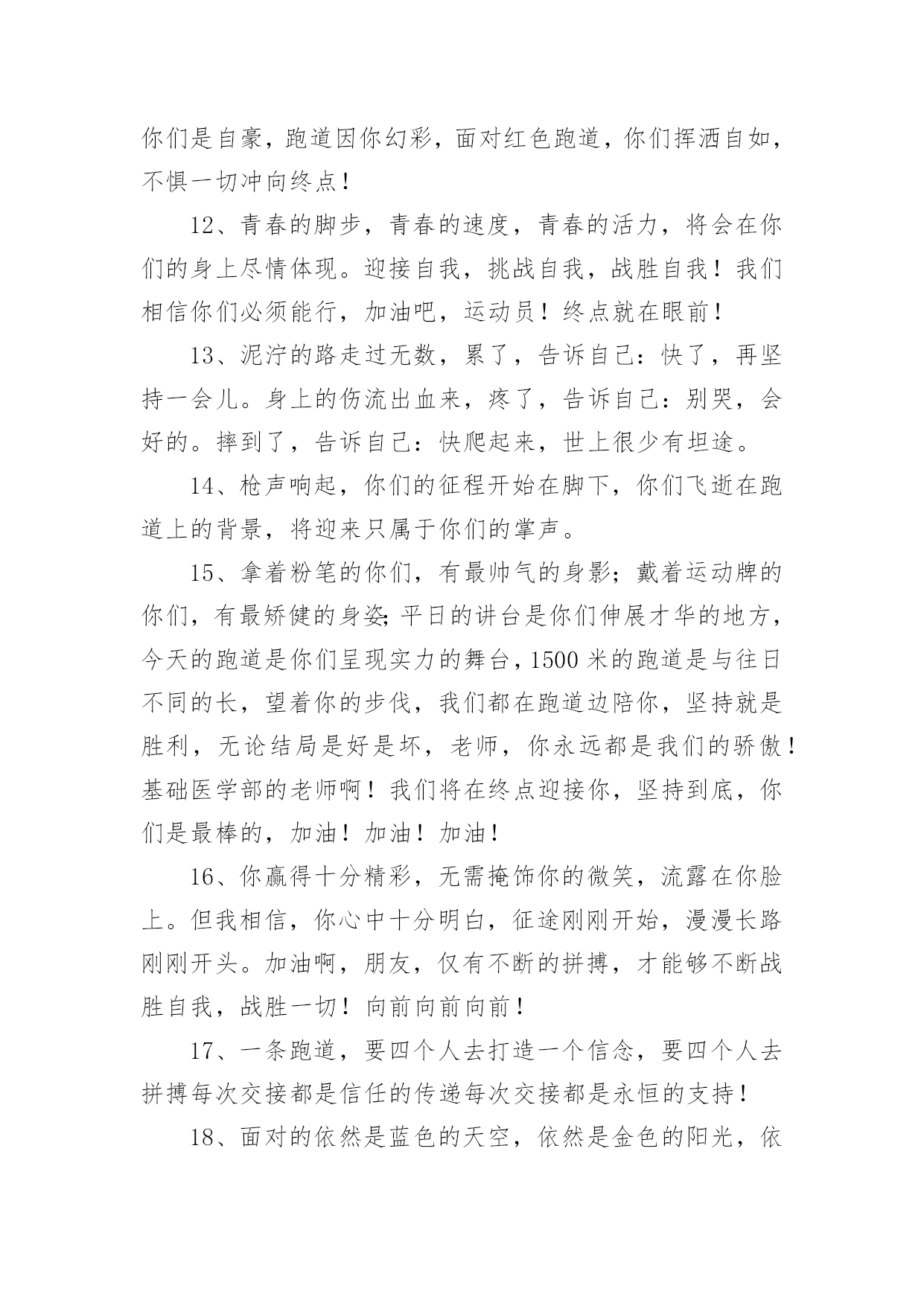 运动会加油稿运动会加油稿在不断进步的社会中,越来越多人会去使用加油稿,借助加油稿往往可以提升对方的气势。你知道加油稿怎样写才规范吗?以下是小编精心整理的运动会加油稿,欢迎大家借鉴与参考,希望对大家有所帮助。运动会加油稿1有种胜利叫坚持三千米,对于我来说是一个遥远的距离。想到的时候,觉得颤栗。然而对于站在起跑线上的每一位运动员来说这将是她们将要面临的比赛。我认为将会有人无法跑完全程,毕竟三千米对于一个女生来说这足以是一次长征。可结果只能让我意外没有一个运动员在中途退出所有的运动员都坚持到了终点。虽然最后一名与第一名之间有将近一圈的差距然而她们都是胜利者,因为有种胜利叫坚持超越极限或许你努力过,争取过,但还是与成功的掌声和鲜花擦肩而过。或许你尝试过,失败过,但成功的火焰就是无法熊熊燃烧。或许你面对沟壑时,犹豫过,害怕过徘徊过,伤心过,滞步过但朋友,你是否冷静地思考过,或许你再往前一步或许成功便正好与你握手呢?你是否平静地反问过,或许跨越这道沟就是圣洁的'梦的故乡呢?鼓起勇气吧,再向前迈出一步吧超越梦的界限,超越自己的极限,打破成功的极限!超越极限,超越自我,向梦的方向起飞吧运动会加油稿21、坚定而又有力量,眼睛看着的不是眼前的跑道,而是那最终的目标,不管汗洒如雨,步伐迟缓退后,不退缩,不气馁,加油,健儿!2、你用行动述说着过程的重要,没有无尽的终点,没有无法攀登的险峰,希望载着终点在向你微笑,拼搏吧!经历是一种精彩,迸发你全部的能量,成功是你汗水的写照。3、真的,人生要是能有一个草稿,能再誊写一次,那该多好!我们会绝对认真地叙写自己的人生,也许不必须比别人写得更好,但肯定要比自己第一次写得漂亮。或许,人生不可能像自己想象的那样完美,一生的路也不可能都是平坦的,人的情绪也不会永远静如止水。4、面对艰苦的征程,你们毫不畏惧,接力棒在你们手中传递着团体的力量,听,我们在为你呐喊,你们诠释着奥运的精神,你们是我们心中的骄傲。5、循环式的训练,是为了离成功更进一步。付出总会有收获,愿你们的付出会换来你们期望的结果。6、运动场上有你们的飒爽英姿,运动场上有你们拼搏的身影,面对漫漫的征程,你没有畏惧和退缩,任汗水打湿脊背,任疲惫爬满全身,依然分离追赶,只有一个目标,只有一个信念,为班级赢得荣誉,拼搏吧,我为你们呐喊,加油!7、致接力运动员:接力棒带着你摩擦出的火光,暖了我的手。在一瞬间,我们的眼光传递的是永恒,是团结,是友爱。8、只要努力拼搏,成功就在不远,只要用心去拼,就会有所收获,不要轻言放弃,记住永不言败。加油吧!相信你们是最棒的。9、你和红色的地面有个约定,那上方,总有你奔跑的身影;你与绿色的草坪有个约定,那上方,浸着你辛劳的汗渍。你与我们有个约定,说你必须要赢,也必须会赢。你喊着跑着,迈开大步,跨过世纪。我们相信你,某某某。10、你是体育宝座上的一颗灿烂夺目的珍珠,你是在蓝天中展翅飞翔的雏鹰。不要怕失败,不要怕冷落,无论何时,我们以你为荣。11、场上英姿显自豪,脚下步伐在飞奔。你们是骄傲,你们是自豪,跑道因你幻彩,面对红色跑道,你们挥洒自如,不惧一切冲向终点!12、青春的脚步,青春的速度,青春的活力,将会在你们的身上尽情体现。迎接自我,挑战自我,战胜自我!我们相信你们必须能行,加油吧,运动员!终点就在眼前!13、泥泞的路走过无数,累了,告诉自己:快了,再坚持一会儿。身上的伤流出血来,疼了,告诉自己:别哭,会好的。摔到了,告诉自己:快爬起来,世上很少有坦途。14、枪声响起,你们的征程开始在脚下,你们飞逝在跑道上的背景,将迎来只属于你们的掌声。15、拿着粉笔的你们,有最帅气的身影;戴着运动牌的你们,有最矫健的身姿;平日的讲台是你们伸展才华的地方,今天的跑道是你们呈现实力的舞台,1500米的跑道是与往日不同的长,望着你的步伐,我们都在跑道边陪你,坚持就是胜利,无论结局是好是坏,老师,你永远都是我们的骄傲!基础医学部的老师啊!我们将在终点迎接你,坚持到底,你们是最棒的,加油!加油!加油!16、你赢得十分精彩,无需掩饰你的微笑,流露在你脸上。但我相信,你心中十分明白,征途刚刚开始,漫漫长路刚刚开头。加油啊,朋友,仅有不断的拼搏,才能够不断战胜自我,战胜一切!向前向前向前!17、一条跑道,要四个人去打造一个信念,要四个人去拼搏每次交接都是信任的传递每次交接都是永恒的支持!18、面对的依然是蓝色的天空,依然是金色的阳光,依然是绿色的草地,依然是红色的跑道,依然是你,勇敢的你,坚强的你。不一样的是,天空更加蔚蓝,阳光更加灿烂,草地更如翡翠一般,跑道更加的鲜艳,而你,定会更加的自信,你的成绩,必然更加辉煌。19、你用行动述说着过城的重要,没有无尽的终点,没有无法攀登的险峰,希望载着终点在向你微笑,拼搏吧!经历是一种精彩,迸发你全部的能量,成功是你汗