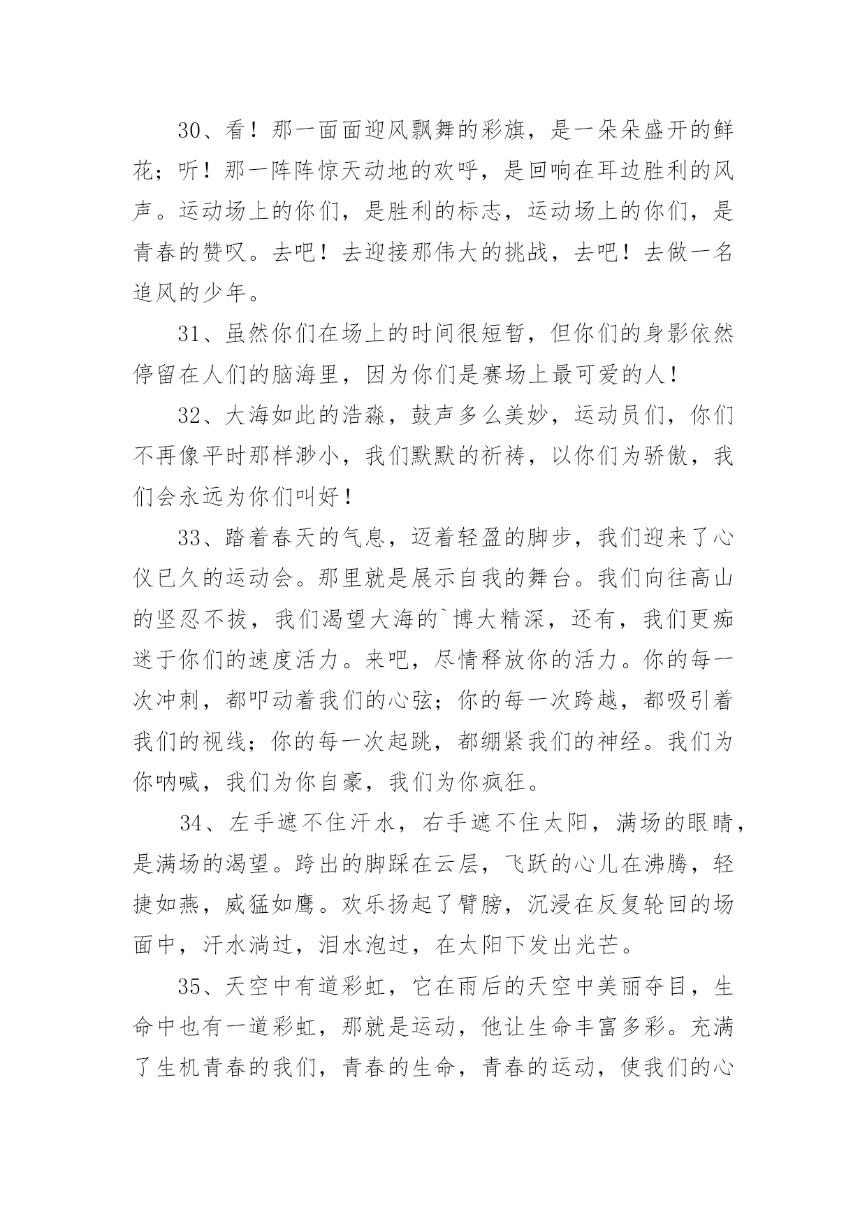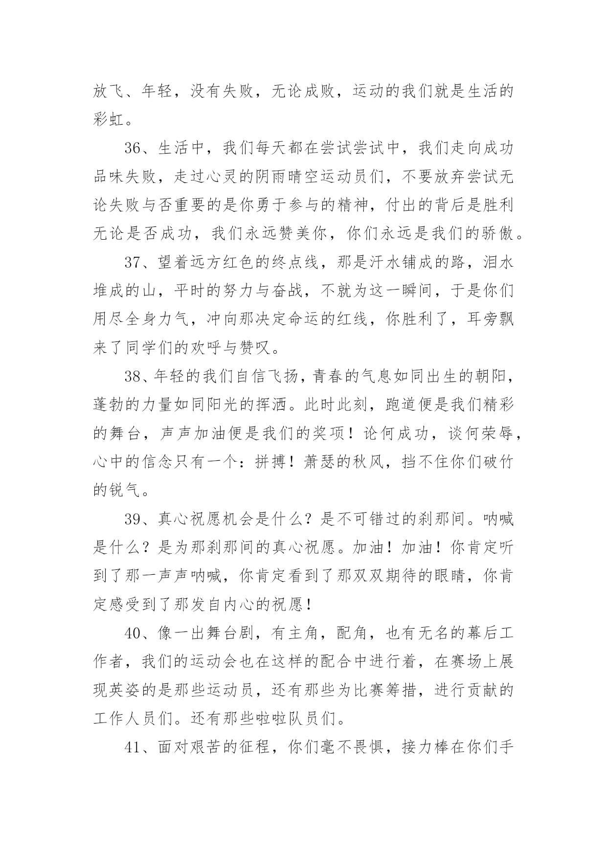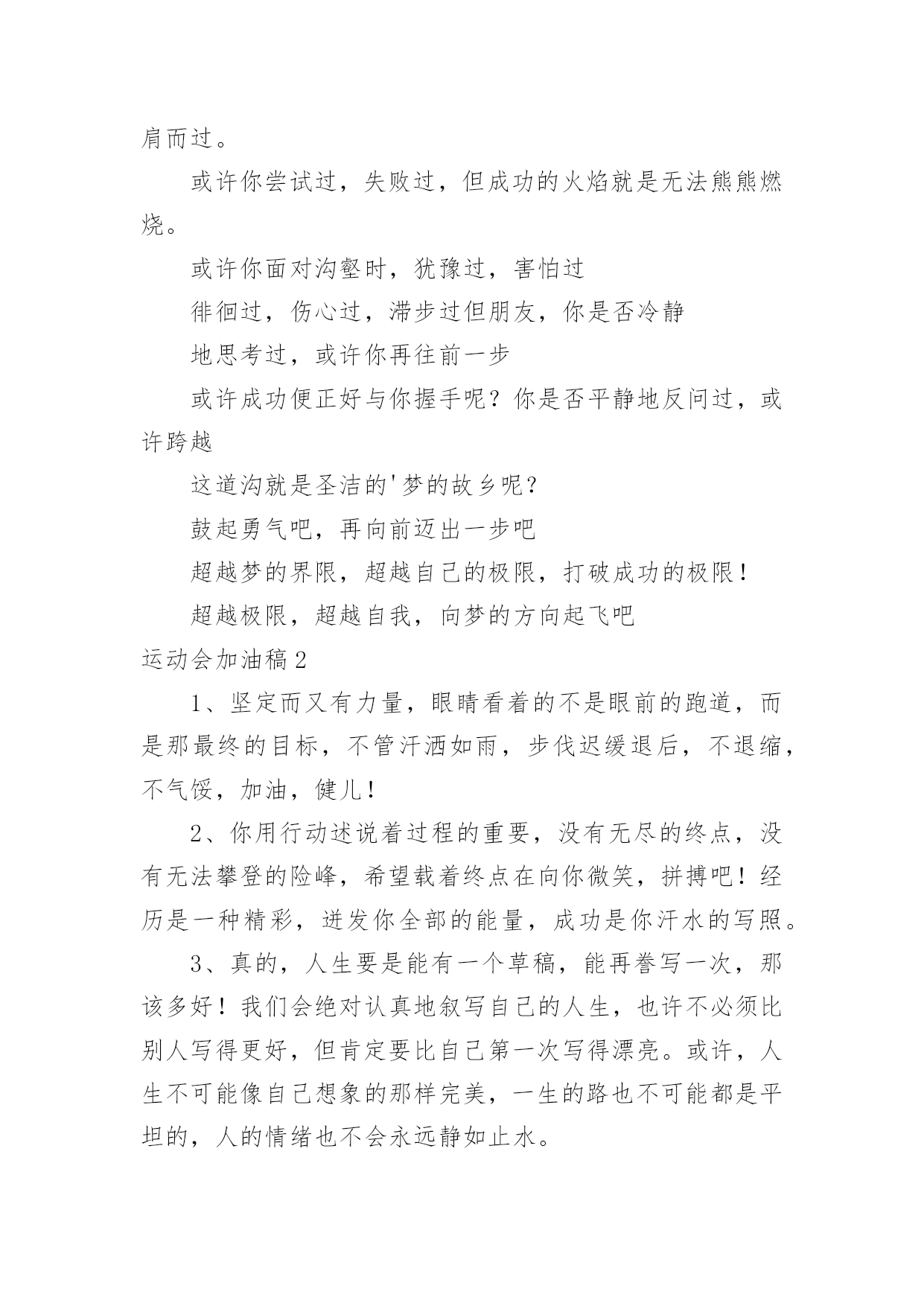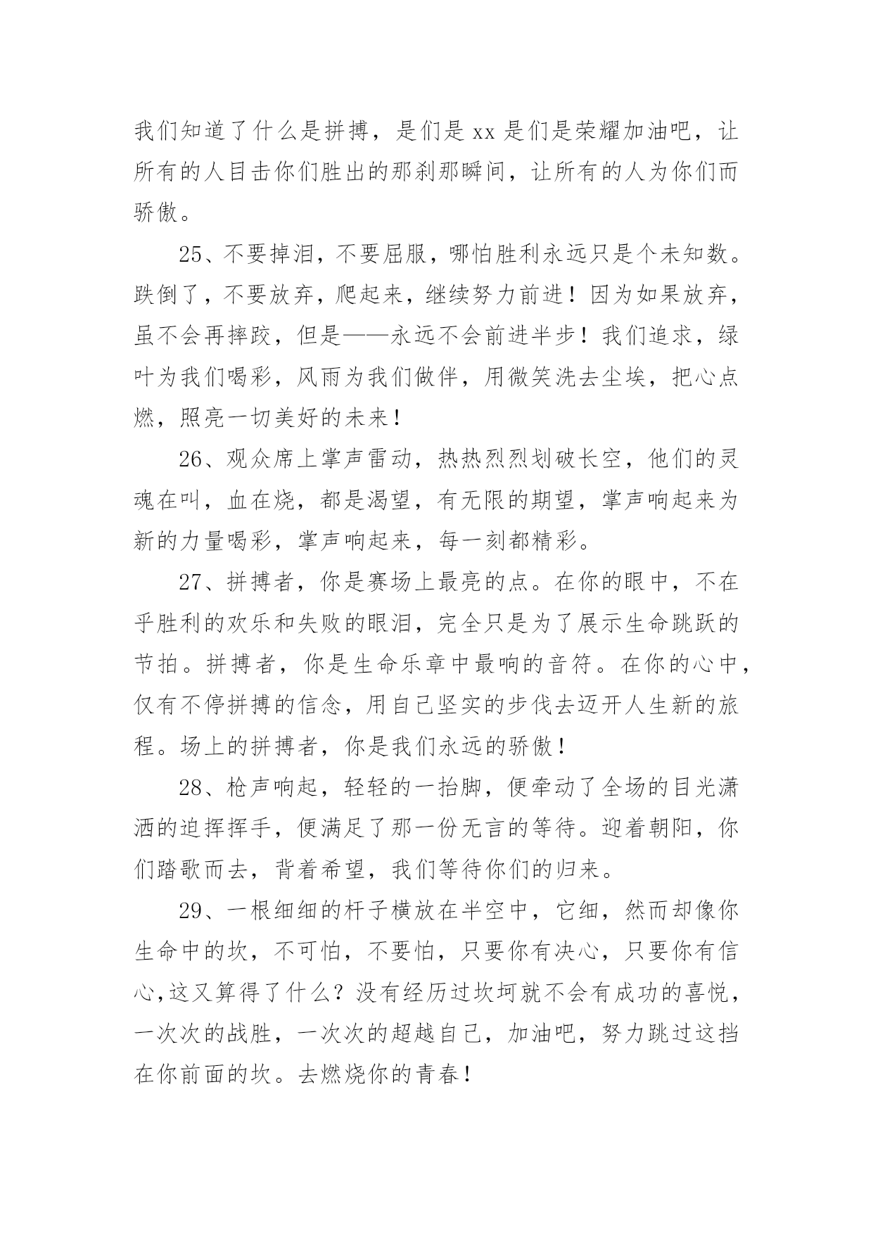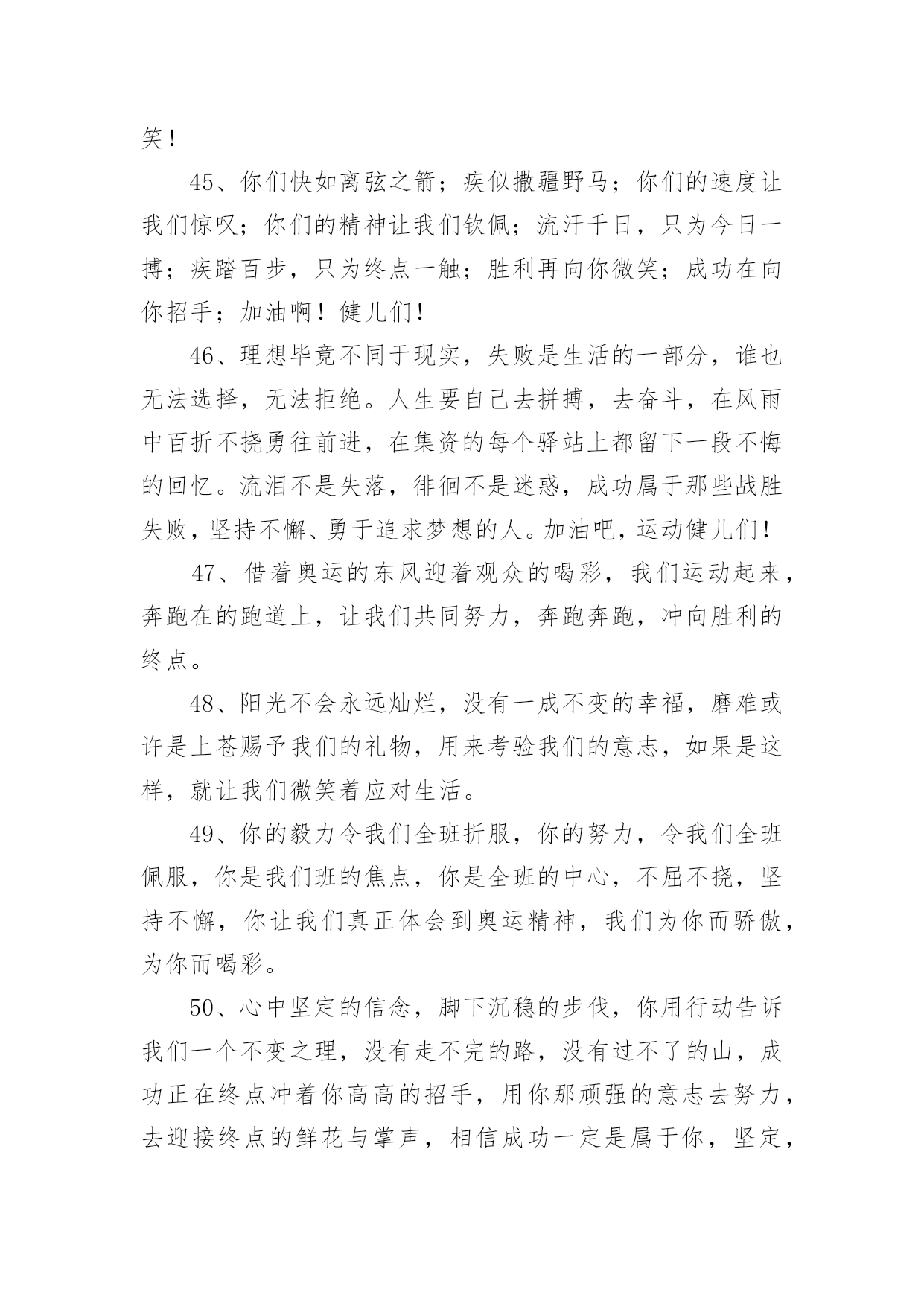 运动会加油稿运动会加油稿在不断进步的社会中,越来越多人会去使用加油稿,借助加油稿往往可以提升对方的气势。你知道加油稿怎样写才规范吗?以下是小编精心整理的运动会加油稿,欢迎大家借鉴与参考,希望对大家有所帮助。运动会加油稿1有种胜利叫坚持三千米,对于我来说是一个遥远的距离。想到的时候,觉得颤栗。然而对于站在起跑线上的每一位运动员来说这将是她们将要面临的比赛。我认为将会有人无法跑完全程,毕竟三千米对于一个女生来说这足以是一次长征。可结果只能让我意外没有一个运动员在中途退出所有的运动员都坚持到了终点。虽然最后一名与第一名之间有将近一圈的差距然而她们都是胜利者,因为有种胜利叫坚持超越极限或许你努力过,争取过,但还是与成功的掌声和鲜花擦肩而过。或许你尝试过,失败过,但成功的火焰就是无法熊熊燃烧。或许你面对沟壑时,犹豫过,害怕过徘徊过,伤心过,滞步过但朋友,你是否冷静地思考过,或许你再往前一步或许成功便正好与你握手呢?你是否平静地反问过,或许跨越这道沟就是圣洁的'梦的故乡呢?鼓起勇气吧,再向前迈出一步吧超越梦的界限,超越自己的极限,打破成功的极限!超越极限,超越自我,向梦的方向起飞吧运动会加油稿21、坚定而又有力量,眼睛看着的不是眼前的跑道,而是那最终的目标,不管汗洒如雨,步伐迟缓退后,不退缩,不气馁,加油,健儿!2、你用行动述说着过程的重要,没有无尽的终点,没有无法攀登的险峰,希望载着终点在向你微笑,拼搏吧!经历是一种精彩,迸发你全部的能量,成功是你汗水的写照。3、真的,人生要是能有一个草稿,能再誊写一次,那该多好!我们会绝对认真地叙写自己的人生,也许不必须比别人写得更好,但肯定要比自己第一次写得漂亮。或许,人生不可能像自己想象的那样完美,一生的路也不可能都是平坦的,人的情绪也不会永远静如止水。4、面对艰苦的征程,你们毫不畏惧,接力棒在你们手中传递着团体的力量,听,我们在为你呐喊,你们诠释着奥运的精神,你们是我们心中的骄傲。5、循环式的训练,是为了离成功更进一步。付出总会有收获,愿你们的付出会换来你们期望的结果。6、运动场上有你们的飒爽英姿,运动场上有你们拼搏的身影,面对漫漫的征程,你没有畏惧和退缩,任汗水打湿脊背,任疲惫爬满全身,依然分离追赶,只有一个目标,只有一个信念,为班级赢得荣誉,拼搏吧,我为你们呐喊,加油!7、致接力运动员:接力棒带着你摩擦出的火光,暖了我的手。在一瞬间,我们的眼光传递的是永恒,是团结,是友爱。8、只要努力拼搏,成功就在不远,只要用心去拼,就会有所收获,不要轻言放弃,记住永不言败。加油吧!相信你们是最棒的。9、你和红色的地面有个约定,那上方,总有你奔跑的身影;你与绿色的草坪有个约定,那上方,浸着你辛劳的汗渍。你与我们有个约定,说你必须要赢,也必须会赢。你喊着跑着,迈开大步,跨过世纪。我们相信你,某某某。10、你是体育宝座上的一颗灿烂夺目的珍珠,你是在蓝天中展翅飞翔的雏鹰。不要怕失败,不要怕冷落,无论何时,我们以你为荣。11、场上英姿显自豪,脚下步伐在飞奔。你们是骄傲,你们是自豪,跑道因你幻彩,面对红色跑道,你们挥洒自如,不惧一切冲向终点!12、青春的脚步,青春的速度,青春的活力,将会在你们的身上尽情体现。迎接自我,挑战自我,战胜自我!我们相信你们必须能行,加油吧,运动员!终点就在眼前!13、泥泞的路走过无数,累了,告诉自己:快了,再坚持一会儿。身上的伤流出血来,疼了,告诉自己:别哭,会好的。摔到了,告诉自己:快爬起来,世上很少有坦途。14、枪声响起,你们的征程开始在脚下,你们飞逝在跑道上的背景,将迎来只属于你们的掌声。15、拿着粉笔的你们,有最帅气的身影;戴着运动牌的你们,有最矫健的身姿;平日的讲台是你们伸展才华的地方,今天的跑道是你们呈现实力的舞台,1500米的跑道是与往日不同的长,望着你的步伐,我们都在跑道边陪你,坚持就是胜利,无论结局是好是坏,老师,你永远都是我们的骄傲!基础医学部的老师啊!我们将在终点迎接你,坚持到底,你们是最棒的,加油!加油!加油!16、你赢得十分精彩,无需掩饰你的微笑,流露在你脸上。但我相信,你心中十分明白,征途刚刚开始,漫漫长路刚刚开头。加油啊,朋友,仅有不断的拼搏,才能够不断战胜自我,战胜一切!向前向前向前!17、一条跑道,要四个人去打造一个信念,要四个人去拼搏每次交接都是信任的传递每次交接都是永恒的支持!18、面对的依然是蓝色的天空,依然是金色的阳光,依然是绿色的草地,依然是红色的跑道,依然是你,勇敢的你,坚强的你。不一样的是,天空更加蔚蓝,阳光更加灿烂,草地更如翡翠一般,跑道更加的鲜艳,而你,定会更加的自信,你的成绩,必然更加辉煌。19、你用行动述说着过城的重要,没有无尽的终点,没有无法攀登的险峰,希望载着终点在向你微笑,拼搏吧!经历是一种精彩,迸发你全部的能量,成功是你汗