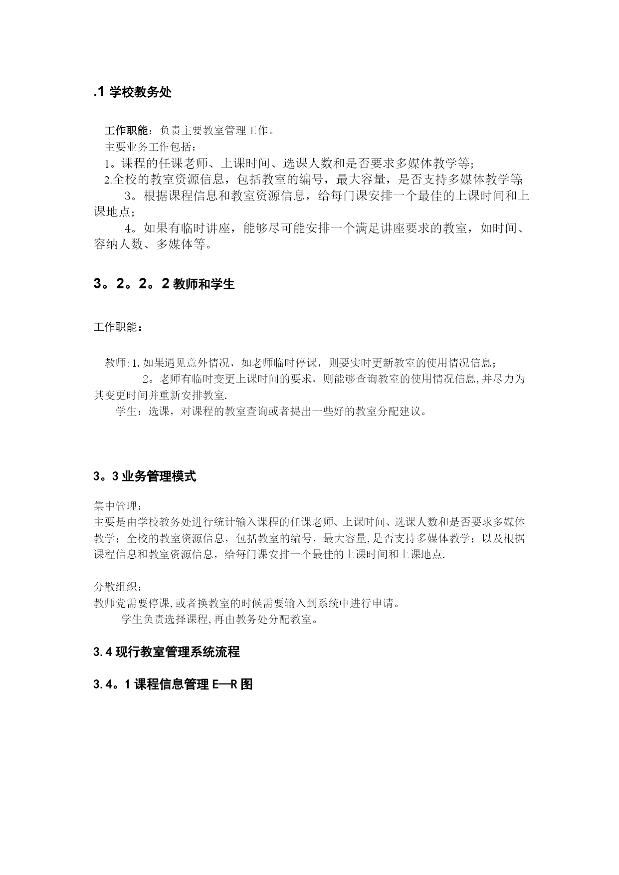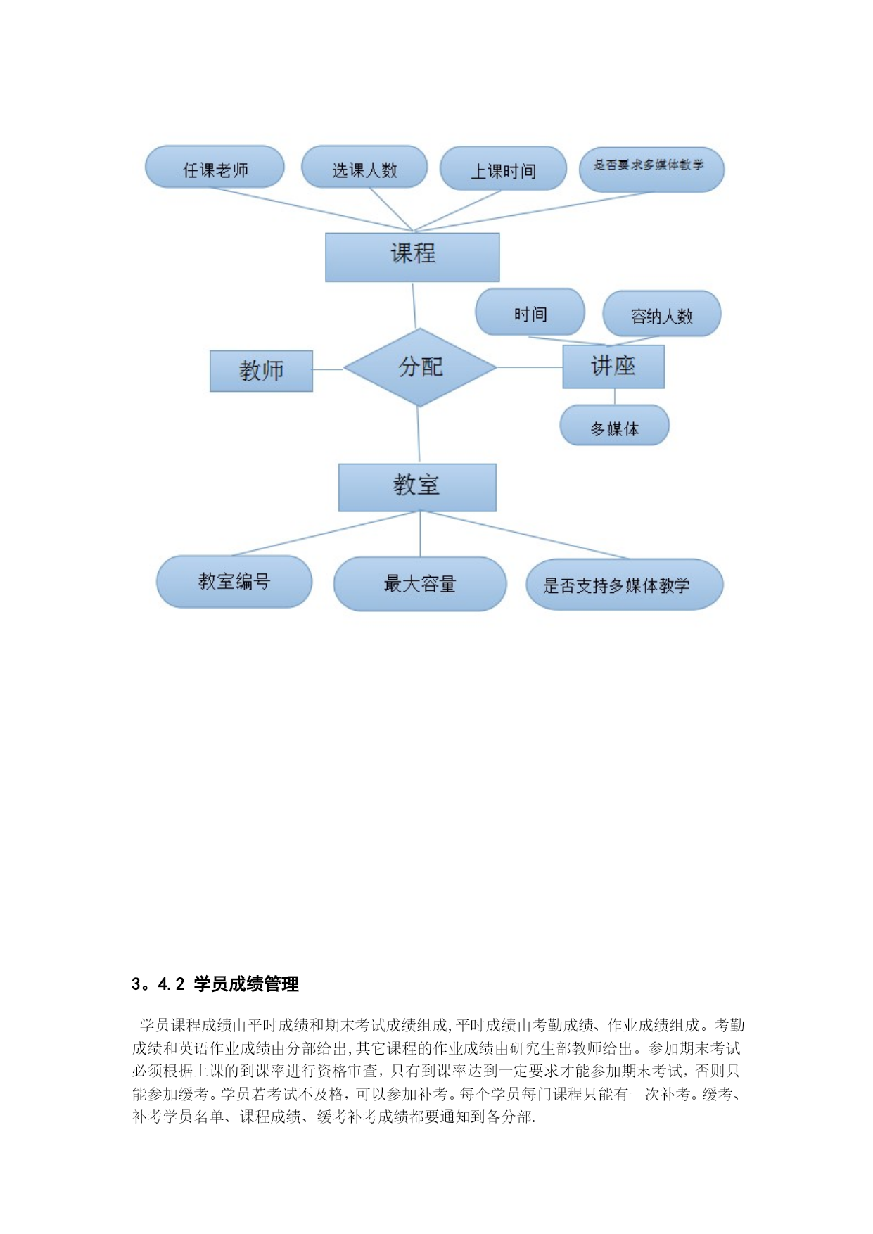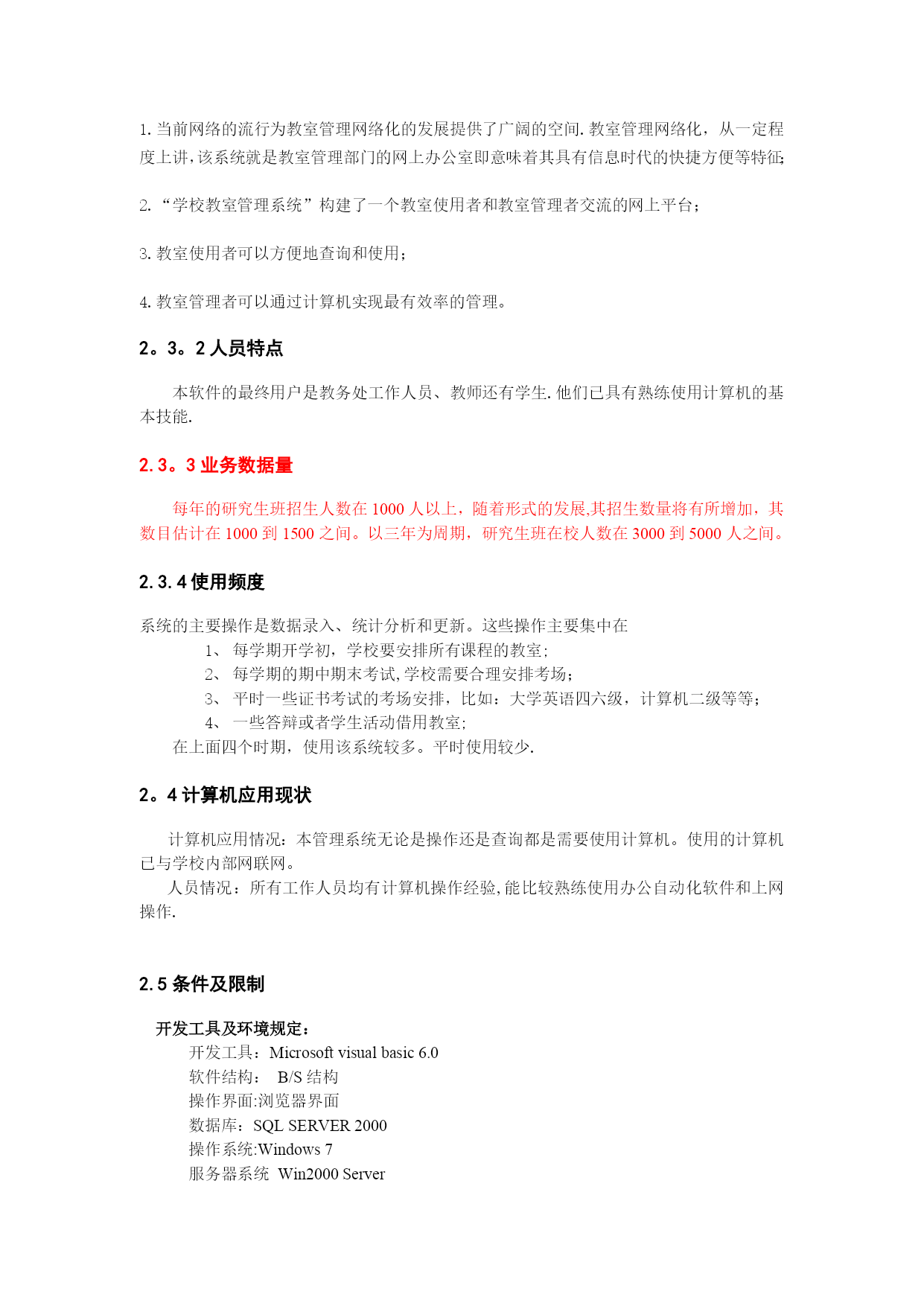 研究生学籍管理信息系统需求分析实用文档(实用文档,可以直接使用,可编辑优秀版资料,欢迎下载)2项目概述现今教室不断的变动,教室信息越来越繁琐,对于教室使用情况管理不方便,所以如今开发这套软件以便管理者对教室使用情况快捷、准确的查询。2。1系统建设背景本系统以西南交通大学内部网为基础进行开发。学校内部网通过联通网络同时可以全国范围内使用,网络带宽可以满足数据库系统的实时操作要求。2.1.1系统规模由于所有教室都是在学校内部,但教室管理活动却可能分布于几个校区(甚至全国各地),因此教室管理系统十一个用户地域分布广阔的管理信息系统。业务范围限定多个方面,因此包括有开课信息管理子系统;课程安排子系统;临时调用教室子系统;教室信息更新子系统等.2.1.2预期目标通过开发《教室管理系统》,实现给每门课安排一个最佳的上课时间和上课地点、如果有临时讲座,能够尽可能安排一个满足讲座要求的教室以及临时教室变更等,提高工作效率、提高科学管理和科学决策水平。2。2项目目标本软件系统的开发目标是实现对教室管理的最优化和便捷化.主要功能是实现:开课课程信息的管理;教室的最优化安排;讲座借用教室的安排以及意外情况教室信息的变更.2。3用户特点2。3.1行业特点教室管理系统的特点有:当前网络的流行为教室管理网络化的发展提供了广阔的空间.教室管理网络化,从一定程度上讲,该系统就是教室管理部门的网上办公室即意味着其具有信息时代的快捷方便等特征;“学校教室管理系统”构建了一个教室使用者和教室管理者交流的网上平台;教室使用者可以方便地查询和使用;教室管理者可以通过计算机实现最有效率的管理。2。3。2人员特点本软件的最终用户是教务处工作人员、教师还有学生.他们已具有熟练使用计算机的基本技能.2.3。3业务数据量每年的研究生班招生人数在1000人以上,随着形式的发展,其招生数量将有所增加,其数目估计在1000到1500之间。以三年为周期,研究生班在校人数在3000到5000人之间。2.3.4使用频度系统的主要操作是数据录入、统计分析和更新。这些操作主要集中在每学期开学初,学校要安排所有课程的教室;每学期的期中期末考试,学校需要合理安排考场;平时一些证书考试的考场安排,比如:大学英语四六级,计算机二级等等;一些答辩或者学生活动借用教室;在上面四个时期,使用该系统较多。平时使用较少.2。4计算机应用现状计算机应用情况:本管理系统无论是操作还是查询都是需要使用计算机。使用的计算机已与学校内部网联网。人员情况:所有工作人员均有计算机操作经验,能比较熟练使用办公自动化软件和上网操作.2.5条件及限制开发工具及环境规定:开发工具:Microsoftvisualbasic6.0软件结构:B/S结构操作界面:浏览器界面数据库:SQLSERVER2000操作系统:Windows7服务器系统Win2000Server3.现行系统的基本情况现行系统:指西南交通大学当前使用的教室管理业务的系统。3.1基本现状西南交通大学现行使用的教室管理系统能够为所有课程安排教室,但是灵活度比较小,分配不能达到最优化,不能根据教师的突发状况实现数据的随时更新以便教室的重新分配。3。2组织机构与职能3。2.1组织机构3。2。2组织机构与教室管理有关的职能说明.1学校教务处工作职能:负责主要教室管理工作。主要业务工作包括:1。课程的任课老师、上课时间、选课人数和是否要求多媒体教学等;2.全校的教室资源信息,包括教室的编号,最大容量,是否支持多媒体教学等;3。根据课程信息和教室资源信息,给每门课安排一个最佳的上课时间和上课地点;4。如果有临时讲座,能够尽可能安排一个满足讲座要求的教室,如时间、容纳人数、多媒体等。3。2。2。2教师和学生工作职能:教师:1.如果遇见意外情况,如老师临时停课,则要实时更新教室的使用情况信息;2。老师有临时变更上课时间的要求,则能够查询教室的使用情况信息,并尽力为其变更时间并重新安排教室.学生:选课,对课程的教室查询或者提出一些好的教室分配建议。3。3业务管理模式集中管理:主要是由学校教务处进行统计输入课程的任课老师、上课时间、选课人数和是否要求多媒体教学;全校的教室资源信息,包括教室的编号,最大容量,是否支持多媒体教学;以及根据课程信息和教室资源信息,给每门课安排一个最佳的上课时间和上课地点.分散组织:教师党需要停课,或者换教室的时候需要输入到系统中进行申请。学生负责选择课程,再由教务处分配教室。3.4现行教室管理系统流程3.4。1课程信息管理E—R图3。4.2学员成绩管理学员课程成绩由平时