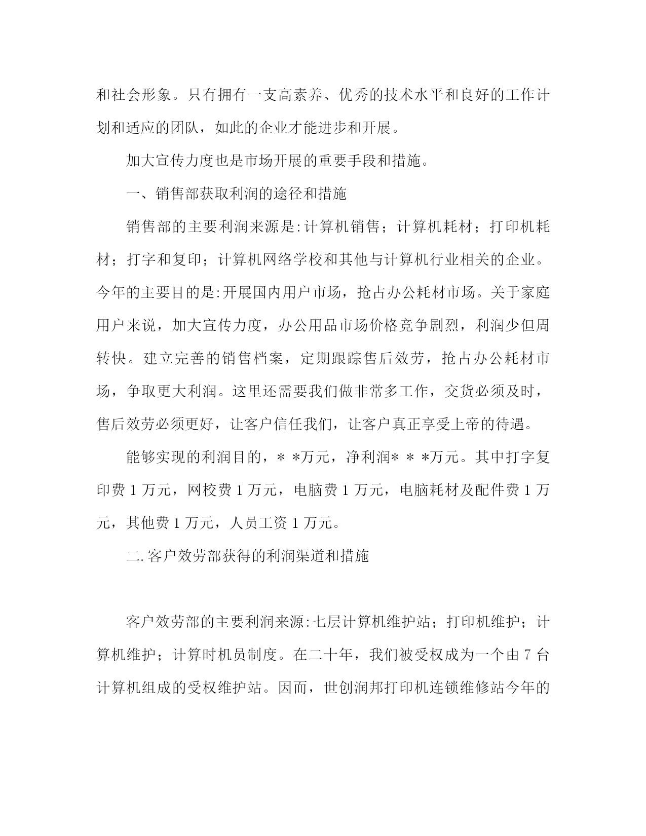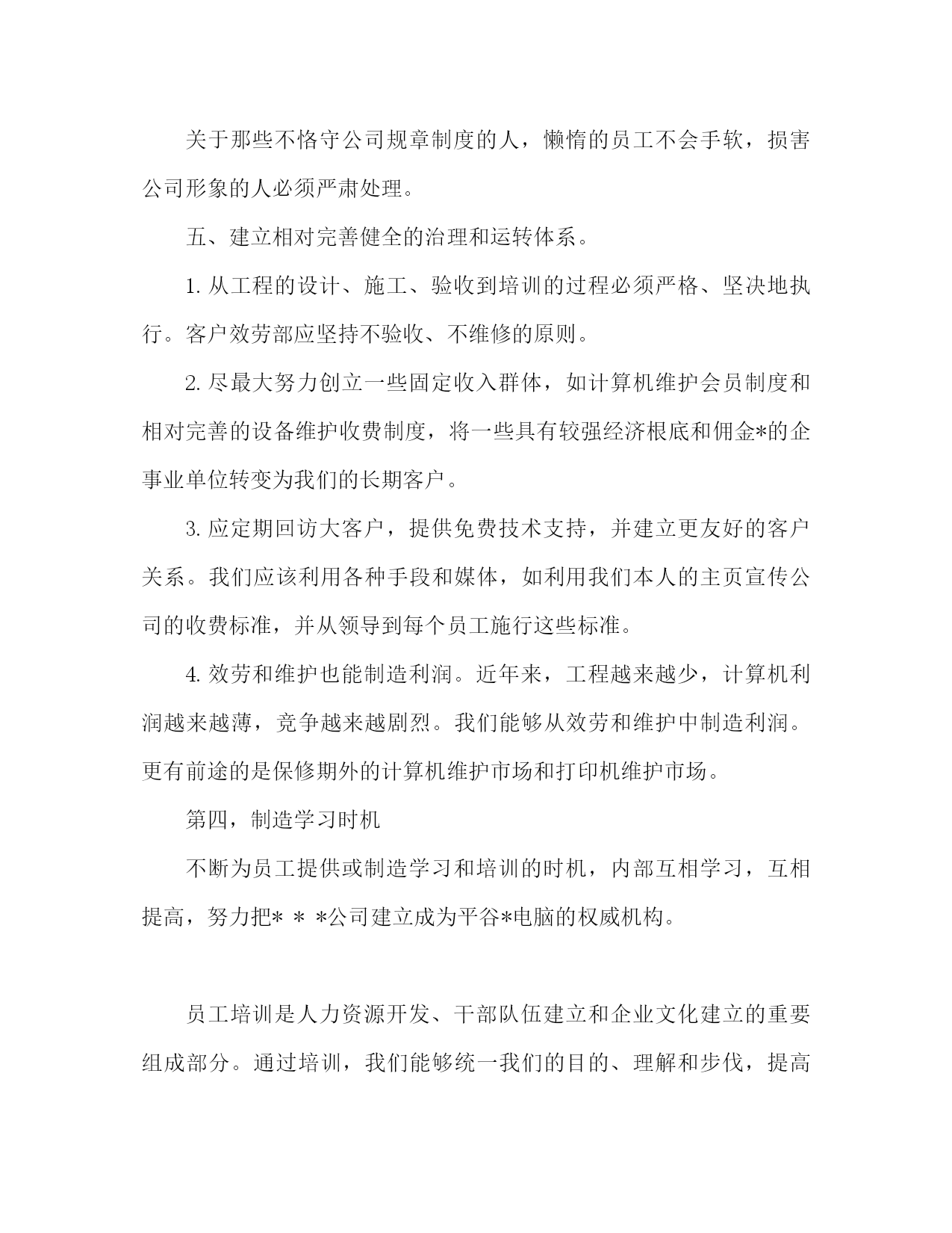 电脑销售工作参考总结(通用)计算机销售工作总结我已经在***公司主要负责市场开发和业务工作3个月了,我已经完全融入这个团队。在过去的三个月里,我们已经处理了尽可能多的咨询题。在过去的三个月里,我的电脑销售工作总结如下:首先,为了降低本钱,要采取的主要措施是:进一步扩大采购渠道,寻找多个供给商,比拟价格和质量,选择质量好、价格低的供给商供给;节俭节约,节约开支,防止浪费,工程计划的设计应合理;减少内部耗费,应节约日常开支、水、电和日常办公耗材,尤其是纸张和车辆。其次,它也是最重要的部分A认识的培养、效劳认识的强化、竞争认识的树立和市场制造认识的培养。我们是一家以效劳为导向的公司,以效劳赢得市场,赢得用户的信任。同事和企业之间不断存在竞争。假如你的业务水平没有提高,你将被公司淘汰。假如你的生意不开展,你将被社会淘汰。近年来,消费品市场竞争剧烈,今年的情势将更加严峻。提高专业水平和员工素养至关重要,关系到整个企业的开展和命运。业务水平妨碍工作效率。员工素养直截了当妨碍企业的社会地位和社会形象。只有拥有一支高素养、优秀的技术水平和良好的工作计划和适应的团队,如此的企业才能进步和开展。加大宣传力度也是市场开展的重要手段和措施。一、销售部获取利润的途径和措施销售部的主要利润来源是:计算机销售;计算机耗材;打印机耗材;打字和复印;计算机网络学校和其他与计算机行业相关的企业。今年的主要目的是:开展国内用户市场,抢占办公耗材市场。关于家庭用户来说,加大宣传力度,办公用品市场价格竞争剧烈,利润少但周转快。建立完善的销售档案,定期跟踪售后效劳,抢占办公耗材市场,争取更大利润。这里还需要我们做非常多工作,交货必须及时,售后效劳必须更好,让客户信任我们,让客户真正享受上帝的待遇。能够实现的利润目的,**万元,净利润***万元。其中打字复印费1万元,网校费1万元,电脑费1万元,电脑耗材及配件费1万元,其他费1万元,人员工资1万元。二.客户效劳部获得的利润渠道和措施客户效劳部的主要利润来源:七层计算机维护站;打印机维护;计算机维护;计算时机员制度。在二十年,我们被受权成为一个由7台计算机组成的受权维护站。因而,世创润邦打印机连锁维修站今年的主要目的是统一、标准和标准客户效劳部,实现自给自足,为来年的效劳市场打下坚实的根底。能完成利润指标,利润***万元。三、工程部获取利润的方法和措施工程部的主要利润来源:计算机网络工程;无线网络工程。随着局域网的施行根本完成,无线网络一旦普及,能够带来更多的利润点,方便计算机网络工程的顺利开展,也为其他部门开展相应的业务工作制造了切入点。今年的主要目的也是盈利的增长点无线网络,部分互联网费用估计将盈利1万元。单机多用户系统、集团、大米销售系统这部分利润为人民币1万元。多功能电子教室和多媒体会议室的费用为人民币1万元。其余网络工程部分***万元;新业务部分为人民币1万元。电脑部分10000元,人员工资10000元,可实现利润目的10000元。在追求利润完成的同时,必须保证工程质量,必须建立完善的工程验收体系,并由客户效劳部进展监视和验收,以鼓励工程部提高工程质量,从而更好地树立公司形象。四、在治理上努力,严格执行公司的各项规章制度,在工作效率、效劳认识上更上一层楼,树立公司的社会形象。关于那些不恪守公司规章制度的人,懒惰的员工不会手软,损害公司形象的人必须严肃处理。五、建立相对完善健全的治理和运转体系。1.从工程的设计、施工、验收到培训的过程必须严格、坚决地执行。客户效劳部应坚持不验收、不维修的原则。2.尽最大努力创立一些固定收入群体,如计算机维护会员制度和相对完善的设备维护收费制度,将一些具有较强经济根底和佣金*的企事业单位转变为我们的长期客户。3.应定期回访大客户,提供免费技术支持,并建立更友好的客户关系。我们应该利用各种手段和媒体,如利用我们本人的主页宣传公司的收费标准,并从领导到每个员工施行这些标准。4.效劳和维护也能制造利润。近年来,工程越来越少,计算机利润越来越薄,竞争越来越剧烈。我们能够从效劳和维护中制造利润。更有前途的是保修期外的计算机维护市场和打印机维护市场。第四,制造学习时机不断为员工提供或制造学习和培训的时机,内部互相学习,互相提高,努力把***公司建立成为平谷*电脑的权威机构。员工培训是人力资源开发、干部队伍建立和企业文化建立的重要组成部分。通过培训,我们能够统一我们的目的、理解和步伐,提高企业的凝聚力、向心力和战斗力。营建学习气氛,不明白咨询,不想学。培训内容:第一,热爱岗位,尊重工作:回忆历史,展望将来,理解企业的荣耀传统和目的,加强使命感和责任感,培养主人翁认识。第二,工作职责:学习公司的制度和员工纪律,定义工作职责和行为准