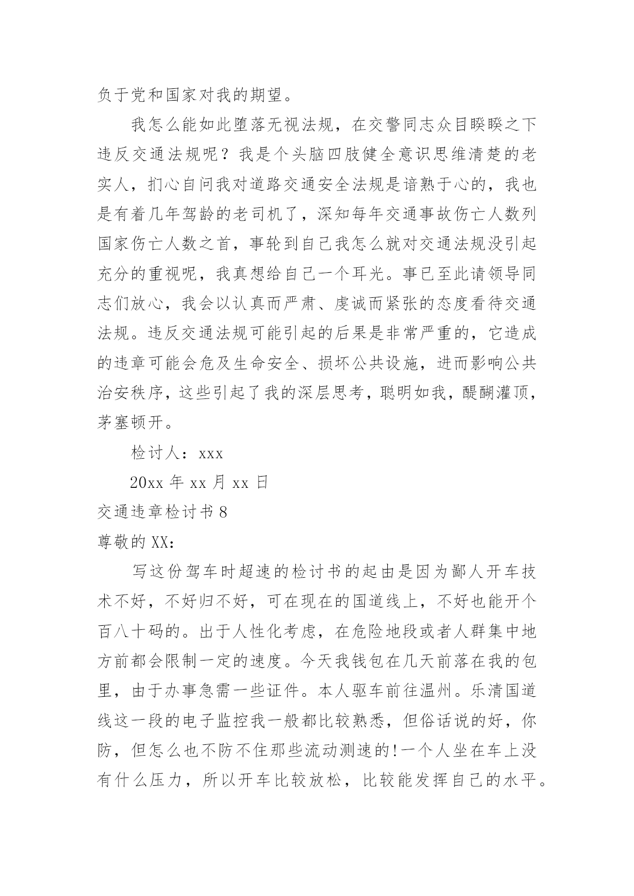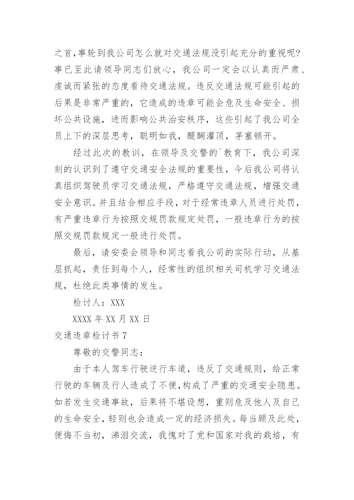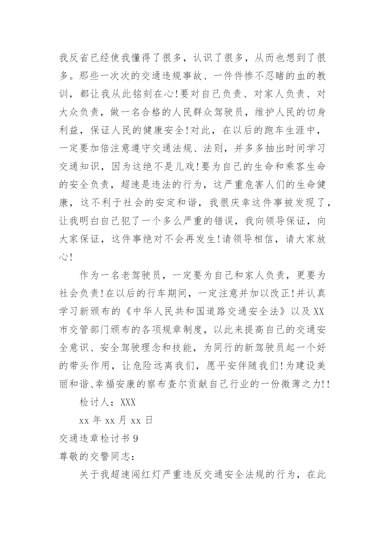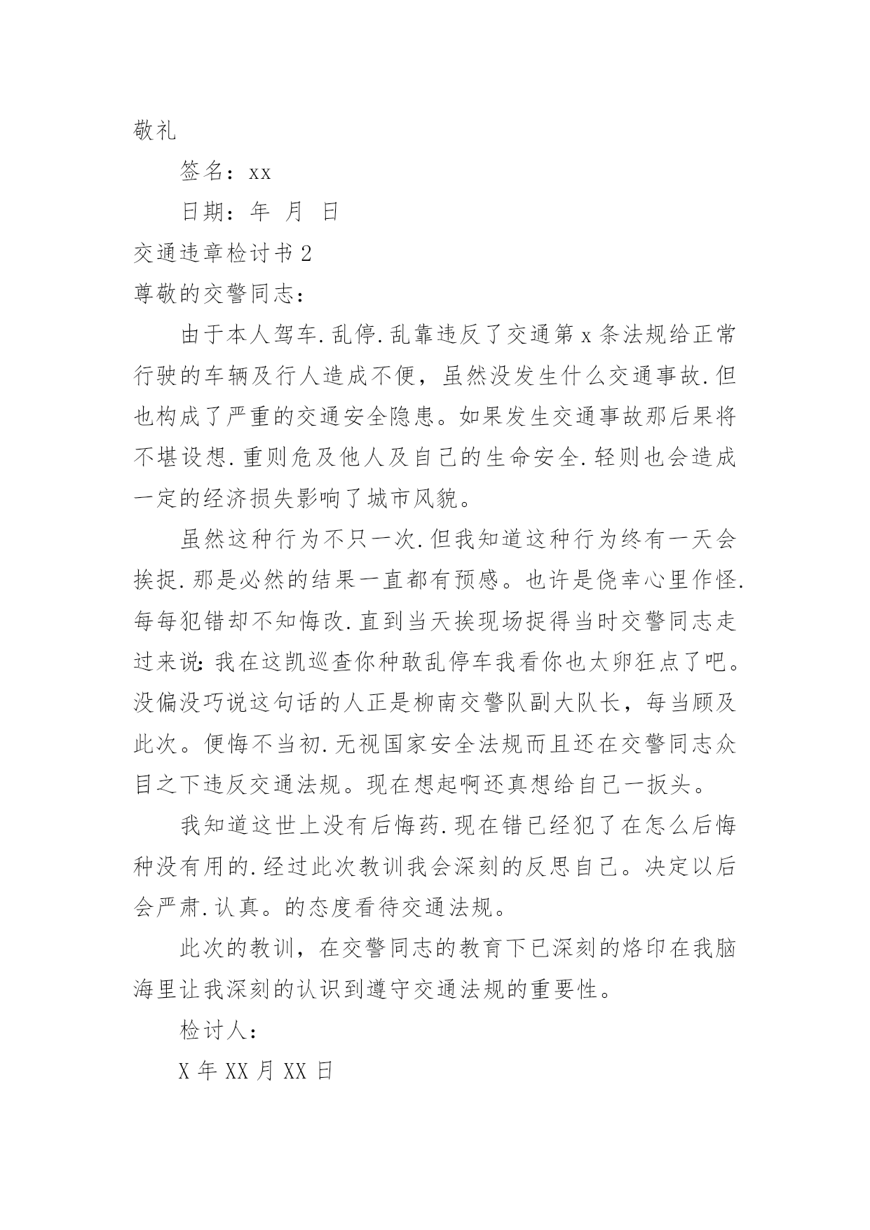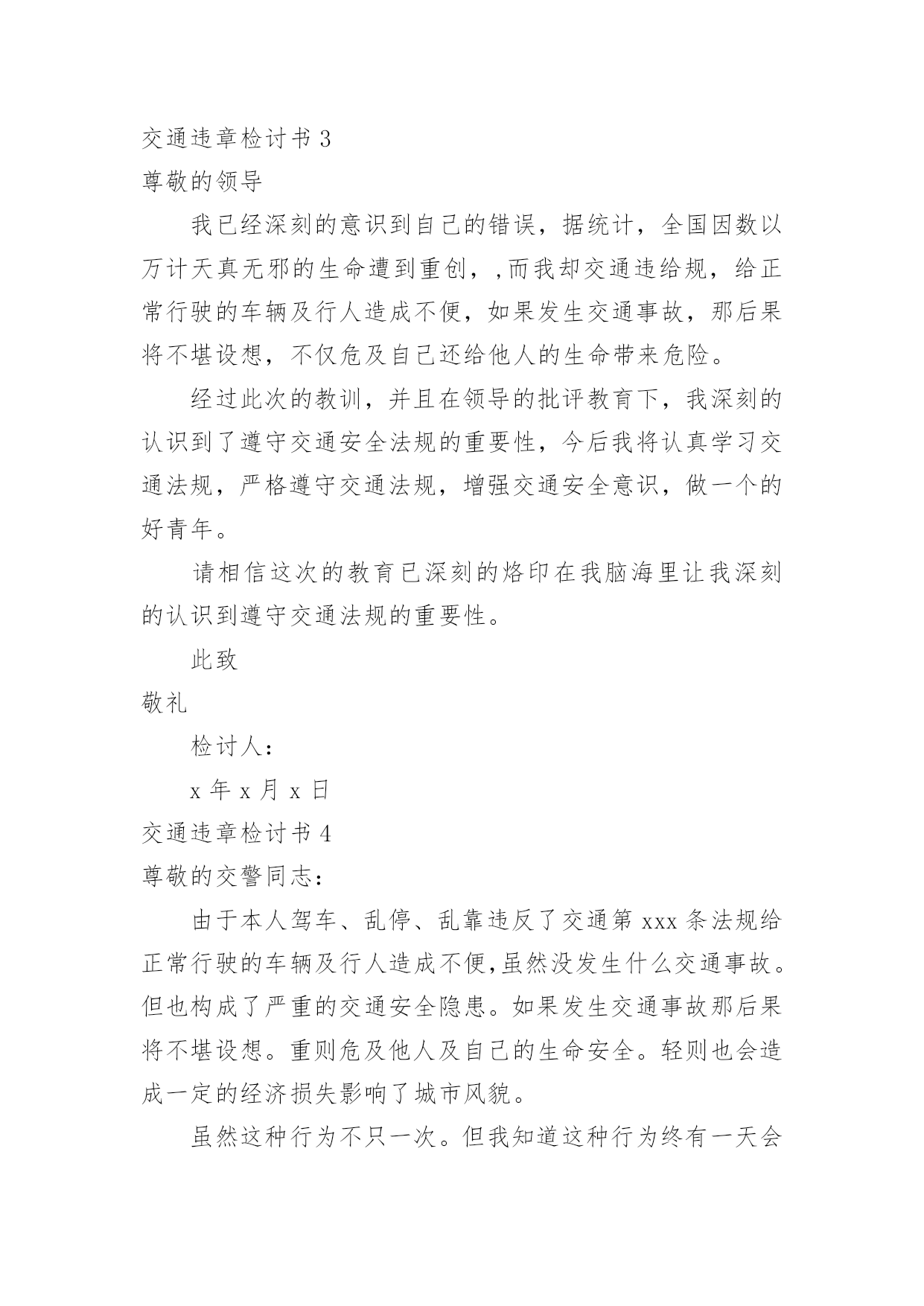 交通违章检讨书交通违章检讨书在学习、工作、生活中犯错误以后,我们要通过写检讨书来反省,在写检讨书时犯错的原因要描述清楚。还是对检讨书一筹莫展吗?以下是小编收集整理的交通违章检讨书,仅供参考,希望能够帮助到大家。交通违章检讨书1尊敬的XXX:我是司机。20xx年xx月xx日在正常上班时间拉乘客从县城至二道桥途中,轮胎被扎破,不得不耽误时间修补轮胎。因此而误了很长的跑班时间,也为此被扣了几分并罚了款。在拉乘客返回的途中路经八乡一个十字路口时,为了争取一点时间而没有做太大的减速慢行,严重的犯了一次错误!!作为一名驾龄大的老驾驶员应该懂得这些交通准则的,更应该以身作则的去遵守它!起一个最起码的带头作用!受到了公司的批评和教育,还有自己对这次原因的反省,自己确实是为了争取一点时间,不被公司罚款而产生的侥幸以及自私心理才造成的此次原因。每天拼了命跑车上班,挣一点钱确实是很不容易,如果真是因为为了争取时间不被罚款而发生了事故,这也绝不是钱能解决的了的问题,这确实是个很严重的后果!所以我应该对这次没有发生任何事故而感到庆幸,对于我的问题,本人诚心接受处罚并决心整改。以后绝不会再因为耽误跑班时间而怕被罚款再次出现超速现象!因为这次自我反省已经使我懂得了很多,认识了很多,从而也想到了很多。那些一次次的交通违规事故、一件件惨不忍睹的血的教训,都让我从此铭刻在心!要对自己负责、对家人负责、对大众负责,做一名合格的人民群众驾驶员,维护人民的切身利益,保证人民的健康安全!对此,在以后的跑车生涯中,一定要加倍注意遵守交通法规、法则,并多多抽出时间学习交通知识,因为这绝不是儿戏!要为自己的生命和乘客生命的安全负责,超速是违法的行为,这严重危害人们的生命健康,这不利于社会的安定和谐,我很庆幸这件事被发现了,让我明白自己犯了一个多么严重的错误,我向领导保证,向大家保证,这件事绝对不会再发生!请领导相信,请大家放心!作为一名老驾驶员,一定要为自己和家人负责,更要为社会负责!在以后的行车期间,一定注意并加以改正!并认真学习新颁布的《中华人民共和国道路交通安全法》以及XX市交管部门颁布的各项规章制度,以此来提高自己的交通安全意识、安全驾驶理念和技能,为同行的新驾驶员起一个好的带头作用,让危险远离我们,愿平安伴随我们!为建设美丽和谐、幸福安康的察布查尔贡献自己行业的一份微薄之力!!此致敬礼签名:xx日期:年月日交通违章检讨书2尊敬的交警同志:由于本人驾车.乱停.乱靠违反了交通第x条法规给正常行驶的车辆及行人造成不便,虽然没发生什么交通事故.但也构成了严重的交通安全隐患。如果发生交通事故那后果将不堪设想.重则危及他人及自己的生命安全.轻则也会造成一定的经济损失影响了城市风貌。虽然这种行为不只一次.但我知道这种行为终有一天会挨捉.那是必然的结果一直都有预感。也许是侥幸心里作怪.每每犯错却不知悔改.直到当天挨现场捉得当时交警同志走过来说:我在这凯巡查你种敢乱停车我看你也太卵狂点了吧。没偏没巧说这句话的人正是柳南交警队副大队长,每当顾及此次。便悔不当初.无视国家安全法规而且还在交警同志众目之下违反交通法规。现在想起啊还真想给自己一扳头。我知道这世上没有后悔药.现在错已经犯了在怎么后悔种没有用的.经过此次教训我会深刻的反思自己。决定以后会严肃.认真。的态度看待交通法规。此次的教训,在交警同志的教育下已深刻的烙印在我脑海里让我深刻的认识到遵守交通法规的重要性。检讨人:X年XX月XX日交通违章检讨书3尊敬的领导我已经深刻的意识到自己的错误,据统计,全国因数以万计天真无邪的生命遭到重创,,而我却交通违给规,给正常行驶的车辆及行人造成不便,如果发生交通事故,那后果将不堪设想,不仅危及自己还给他人的生命带来危险。经过此次的教训,并且在领导的批评教育下,我深刻的认识到了遵守交通安全法规的重要性,今后我将认真学习交通法规,严格遵守交通法规,增强交通安全意识,做一个的好青年。请相信这次的教育已深刻的烙印在我脑海里让我深刻的认识到遵守交通法规的重要性。此致敬礼检讨人:x年x月x日交通违章检讨书4尊敬的交警同志:由于本人驾车、乱停、乱靠违反了交通第xxx条法规给正常行驶的车辆及行人造成不便,虽然没发生什么交通事故。但也构成了严重的交通安全隐患。如果发生交通事故那后果将不堪设想。重则危及他人及自己的生命安全。轻则也会造成一定的经济损失影响了城市风貌。虽然这种行为不只一次。但我知道这种行为终有一天会被捉。那是必然的结果一直都有预感。也许是侥幸心里作怪,每每犯错却不知悔改。直到当天现场被捉,当时交警同志走过来说:“我在这里巡查,你敢乱停车,我看你也太狂点了吧!”每当顾及此次便悔不当初。无视国家安全法规,而且还在交警同志众目之下违反交通法规。现在想起啊还真后悔。我知道这世上没有后悔药。现在错已经犯了在怎