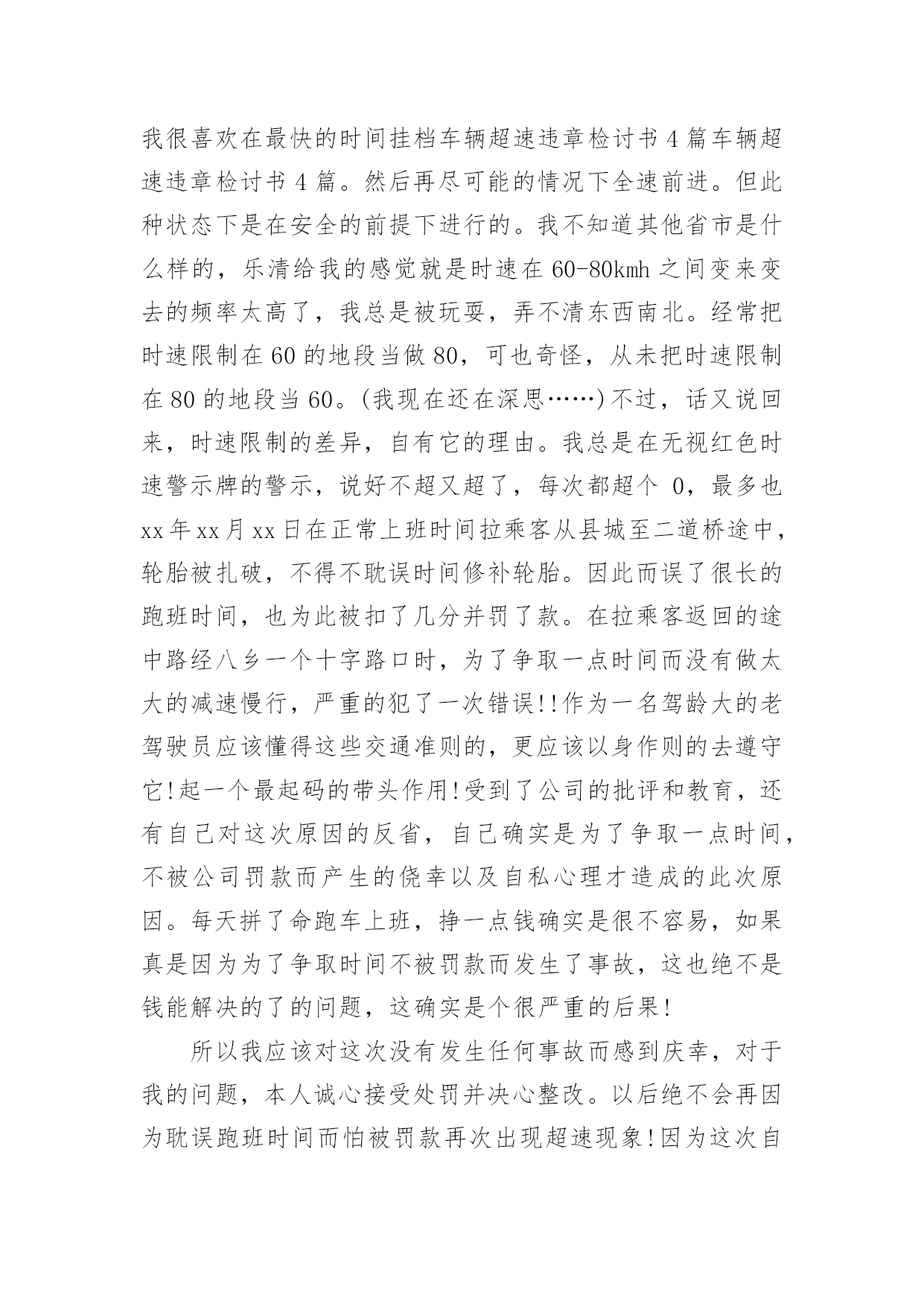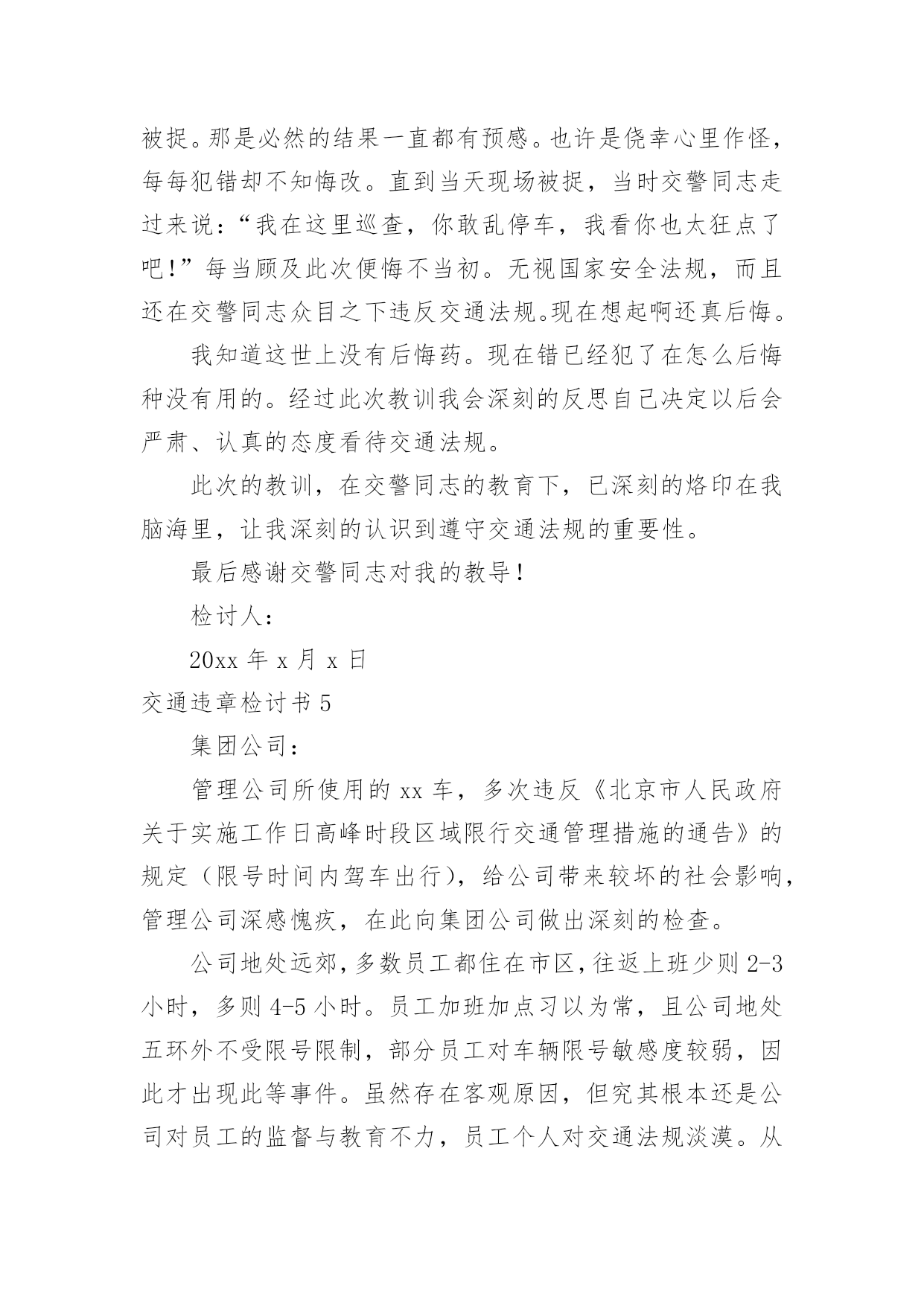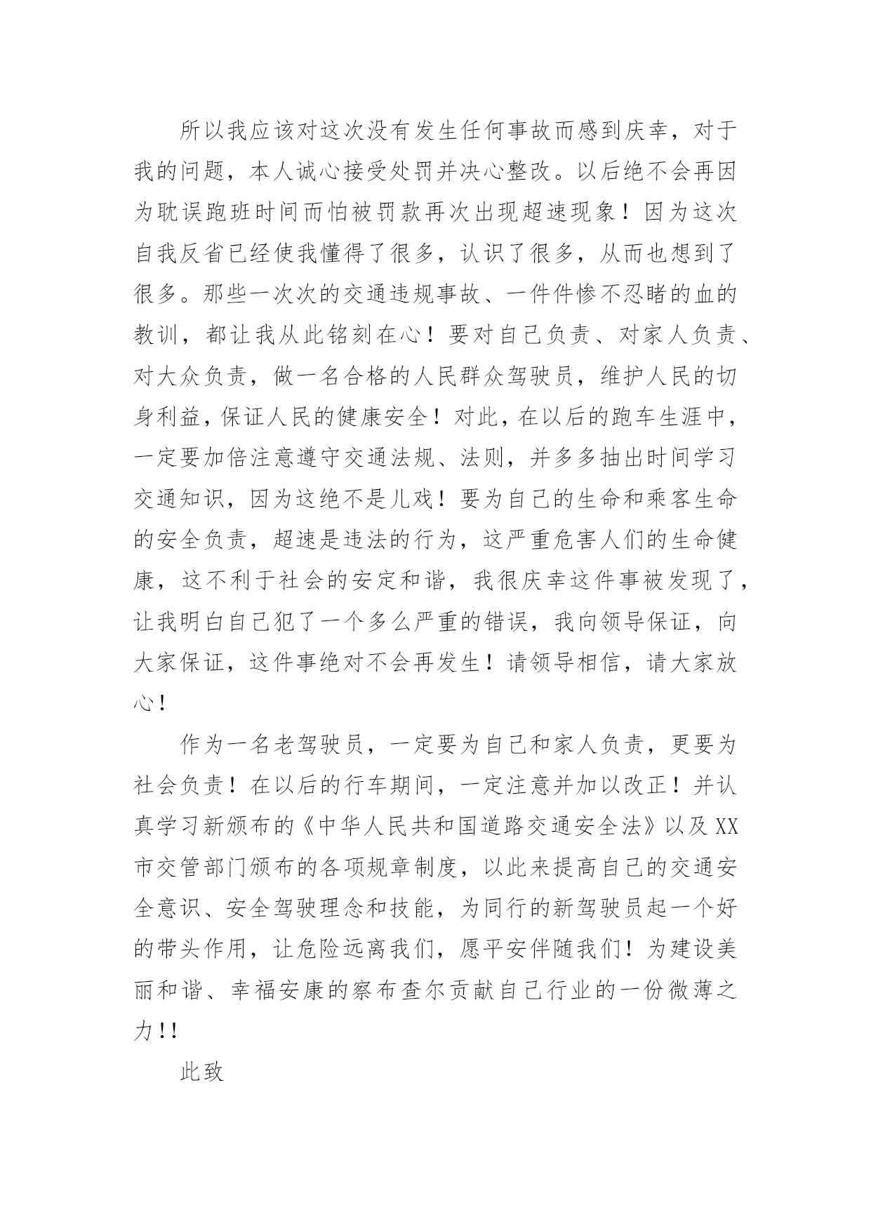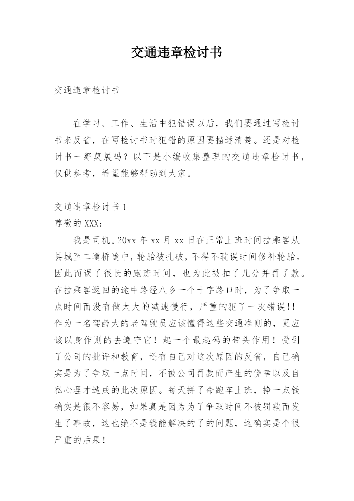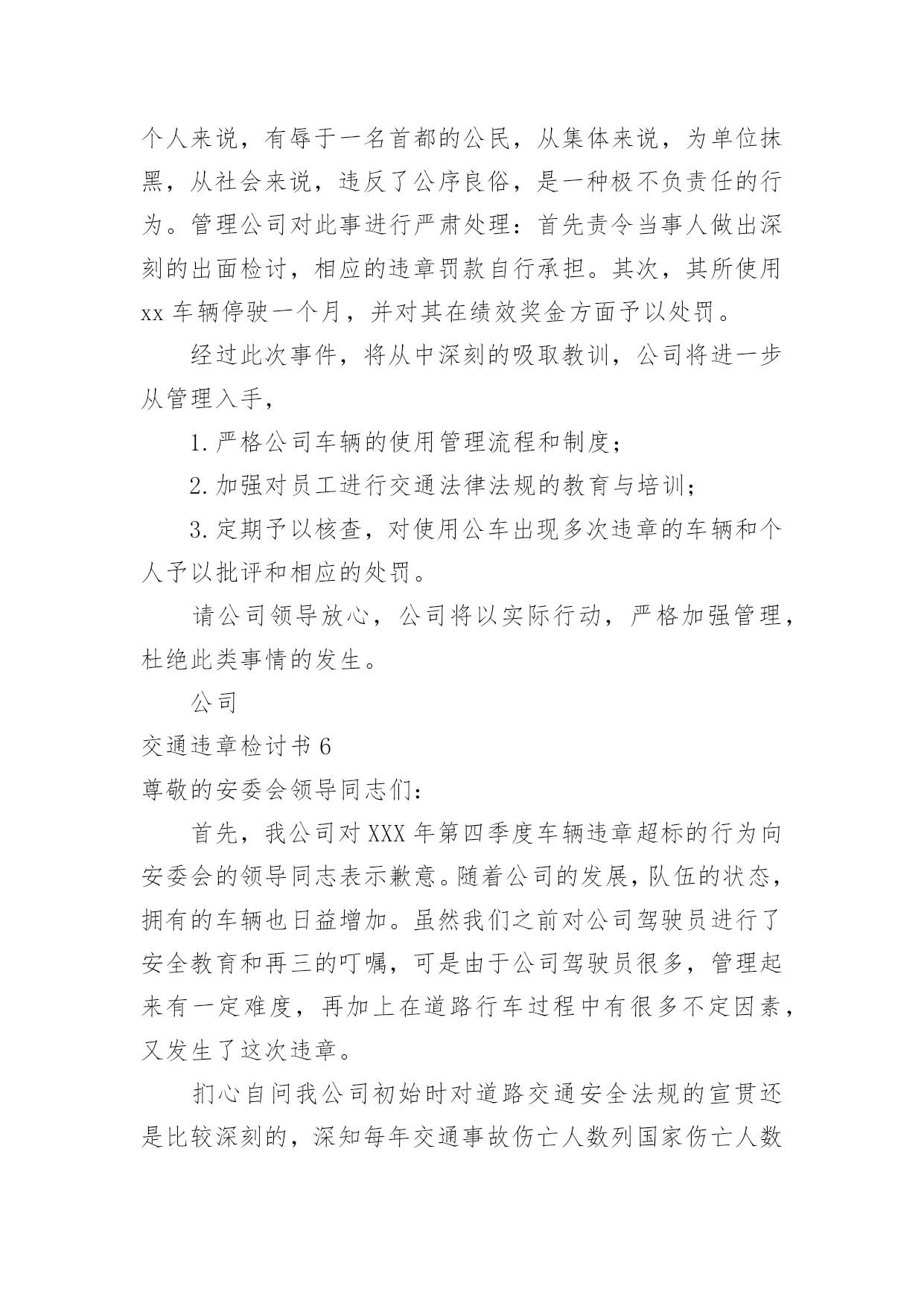 交通违章检讨书交通违章检讨书在学习、工作、生活中犯错误以后,我们要通过写检讨书来反省,在写检讨书时犯错的原因要描述清楚。还是对检讨书一筹莫展吗?以下是小编收集整理的交通违章检讨书,仅供参考,希望能够帮助到大家。交通违章检讨书1尊敬的XXX:我是司机。20xx年xx月xx日在正常上班时间拉乘客从县城至二道桥途中,轮胎被扎破,不得不耽误时间修补轮胎。因此而误了很长的跑班时间,也为此被扣了几分并罚了款。在拉乘客返回的途中路经八乡一个十字路口时,为了争取一点时间而没有做太大的减速慢行,严重的犯了一次错误!!作为一名驾龄大的老驾驶员应该懂得这些交通准则的,更应该以身作则的去遵守它!起一个最起码的带头作用!受到了公司的批评和教育,还有自己对这次原因的反省,自己确实是为了争取一点时间,不被公司罚款而产生的侥幸以及自私心理才造成的此次原因。每天拼了命跑车上班,挣一点钱确实是很不容易,如果真是因为为了争取时间不被罚款而发生了事故,这也绝不是钱能解决的了的问题,这确实是个很严重的后果!所以我应该对这次没有发生任何事故而感到庆幸,对于我的问题,本人诚心接受处罚并决心整改。以后绝不会再因为耽误跑班时间而怕被罚款再次出现超速现象!因为这次自我反省已经使我懂得了很多,认识了很多,从而也想到了很多。那些一次次的交通违规事故、一件件惨不忍睹的血的教训,都让我从此铭刻在心!要对自己负责、对家人负责、对大众负责,做一名合格的人民群众驾驶员,维护人民的切身利益,保证人民的健康安全!对此,在以后的跑车生涯中,一定要加倍注意遵守交通法规、法则,并多多抽出时间学习交通知识,因为这绝不是儿戏!要为自己的生命和乘客生命的安全负责,超速是违法的行为,这严重危害人们的生命健康,这不利于社会的安定和谐,我很庆幸这件事被发现了,让我明白自己犯了一个多么严重的错误,我向领导保证,向大家保证,这件事绝对不会再发生!请领导相信,请大家放心!作为一名老驾驶员,一定要为自己和家人负责,更要为社会负责!在以后的行车期间,一定注意并加以改正!并认真学习新颁布的《中华人民共和国道路交通安全法》以及XX市交管部门颁布的各项规章制度,以此来提高自己的交通安全意识、安全驾驶理念和技能,为同行的新驾驶员起一个好的带头作用,让危险远离我们,愿平安伴随我们!为建设美丽和谐、幸福安康的察布查尔贡献自己行业的一份微薄之力!!此致敬礼签名:xx日期:年月日交通违章检讨书2尊敬的交警同志:由于本人驾车.乱停.乱靠违反了交通第x条法规给正常行驶的车辆及行人造成不便,虽然没发生什么交通事故.但也构成了严重的交通安全隐患。如果发生交通事故那后果将不堪设想.重则危及他人及自己的生命安全.轻则也会造成一定的经济损失影响了城市风貌。虽然这种行为不只一次.但我知道这种行为终有一天会挨捉.那是必然的结果一直都有预感。也许是侥幸心里作怪.每每犯错却不知悔改.直到当天挨现场捉得当时交警同志走过来说:我在这凯巡查你种敢乱停车我看你也太卵狂点了吧。没偏没巧说这句话的人正是柳南交警队副大队长,每当顾及此次。便悔不当初.无视国家安全法规而且还在交警同志众目之下违反交通法规。现在想起啊还真想给自己一扳头。我知道这世上没有后悔药.现在错已经犯了在怎么后悔种没有用的.经过此次教训我会深刻的反思自己。决定以后会严肃.认真。的态度看待交通法规。此次的教训,在交警同志的教育下已深刻的烙印在我脑海里让我深刻的认识到遵守交通法规的重要性。检讨人:X年XX月XX日交通违章检讨书3尊敬的领导我已经深刻的意识到自己的错误,据统计,全国因数以万计天真无邪的生命遭到重创,,而我却交通违给规,给正常行驶的车辆及行人造成不便,如果发生交通事故,那后果将不堪设想,不仅危及自己还给他人的生命带来危险。经过此次的教训,并且在领导的批评教育下,我深刻的认识到了遵守交通安全法规的重要性,今后我将认真学习交通法规,严格遵守交通法规,增强交通安全意识,做一个的好青年。请相信这次的教育已深刻的烙印在我脑海里让我深刻的认识到遵守交通法规的重要性。此致敬礼检讨人:x年x月x日交通违章检讨书4尊敬的交警同志:由于本人驾车、乱停、乱靠违反了交通第xxx条法规给正常行驶的车辆及行人造成不便,虽然没发生什么交通事故。但也构成了严重的交通安全隐患。如果发生交通事故那后果将不堪设想。重则危及他人及自己的生命安全。轻则也会造成一定的经济损失影响了城市风貌。虽然这种行为不只一次。但我知道这种行为终有一天会被捉。那是必然的结果一直都有预感。也许是侥幸心里作怪,每每犯错却不知悔改。直到当天现场被捉,当时交警同志走过来说:“我在这里巡查,你敢乱停车,我看你也太狂点了吧!”每当顾及此次便悔不当初。无视国家安全法规,而且还在交警同志众目之下违反交通法规。现在想起啊还真后悔。我知道这世上没有后悔药。现在错已经犯了在怎