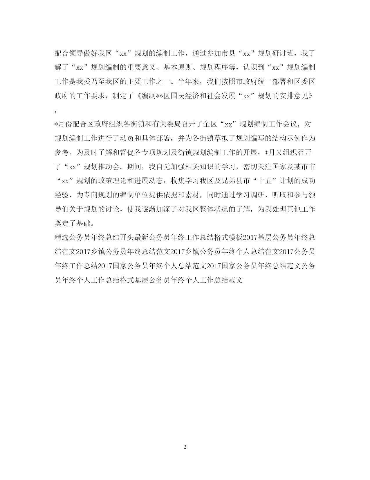 此资料由网络收集而来,如有侵权请告知上传者立即删除。资料共分享,我们负责传递知识。PAGEPAGE2最新公务员年终工作总结模板一、自觉加强理论学习,提高个人素质首先,自觉加强政治理论学习,提高党性修养。两委浓厚的政治学习氛围深深的感染着我,我积极参加委内组织的各项学习活动,并注重自学,认真学习了xx在邓小平诞辰百年纪念大会上的讲话、xx七一重要讲话、xx届四中全会关于加强党的执政能力的决定等,进一步提高了自己的理论水平与政治素质,保证了自己在思想上和党保持一致性,强化了廉洁自律的自觉性。其次,在业务学习方面,我虚心向身边的同事请教,通过多看多听多想多问多做,努力使自己在尽短的时间内熟悉工作环境和内容。同时,我还自觉学习某市企业投资项目备案、核准暂行管理办法、行政许可法等与工作相关的政策、法律常识,积累自己的业务知识。此外,根据组织安排我参加了某市公务员初任培训。在为期三周的培训生活中,严格的军训磨练了我的意志,丰富的课程学习使我的知识储备和层次得到了提高。通过某市经济发展状况及党委政府工作的介绍,使我进一步理解了某市“三步走”战略,看到了某市经济腾飞的巨大潜力,增强了对某市的了解和热爱;通过公务员宗旨和行为规范的教育,使我树立了正确的权力观,增强了全心全意为人民服务的宗旨意识;通过办公室实务的学习,使我了解了公文写作的内涵,提高了办公室实务的处理能力,为我更好的投入工作打下了良好基础。二、踏实肯干,努力完成好各项业务工作在某科工作的半年中,通过领导和同事们的耐心指导,我在熟悉的基础上已经基本能完成科室的各项日常工作,期间我具体参与的工作主要包括以下几个方面:配合领导做好我区“xx”规划的编制工作。通过参加市县“xx”规划研讨班,我了解了“xx”规划编制的重要意义、基本原则、规划程序等,认识到“xx”规划编制工作是我委乃至我区的主要工作之一。半年来,我们按照市政府统一部署和区委区政府的工作要求,制定了《编制**区国民经济和社会发展“xx”规划的安排意见》,*月份配合区政府组织各街镇和有关委局召开了全区“xx”规划编制工作会议,对规划编制工作进行了动员和具体部署,并为各街镇草拟了规划编写的结构示例作为参考。为及时了解和督促各专项规划及街镇规划编制工作的开展,*月又组织召开了“xx”规划推动会。期间,我自觉加强相关知识的学习,密切关注国家及某市市“xx”规划的政策理论和进展动态,收集学习我区及兄弟县市“十五”计划的成功经验,为专向规划的编制单位提供依据和素材,同时通过学习调研、听取和参与领导们关于规划的讨论,使我逐渐加深了对我区整体状况的了解,为我处理其他工作奠定了基础。精选公务员年终总结开头最新公务员年终工作总结格式模板2017基层公务员年终总结范文2017乡镇公务员年终总结范文2017乡镇公务员年终个人总结范文2017公务员年终工作总结2017国家公务员年终个人总结范文2017国家公务员年终总结范文公务员年终个人工作总结格式基层公务员年终个人工作总结范文