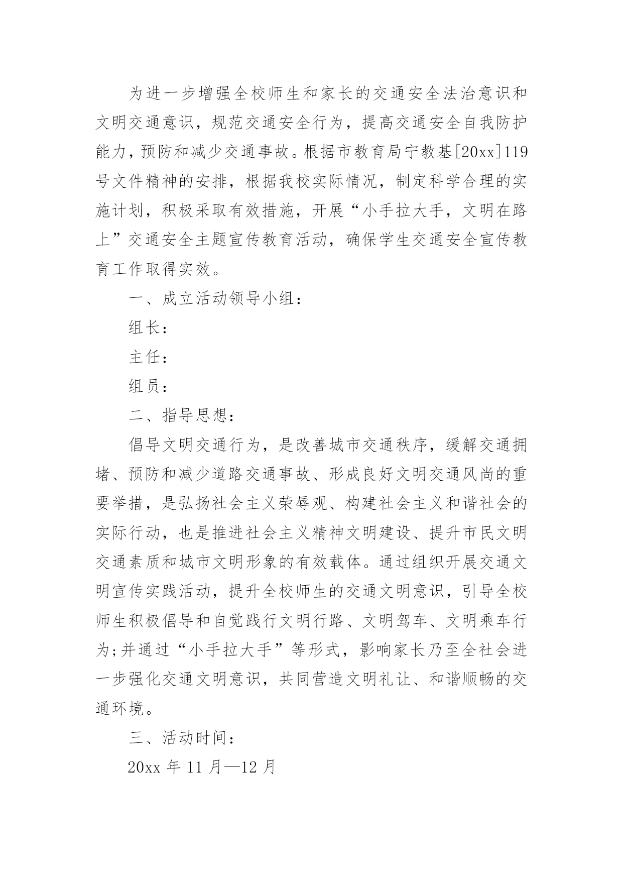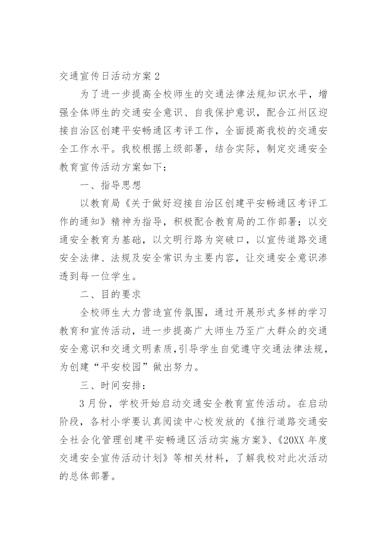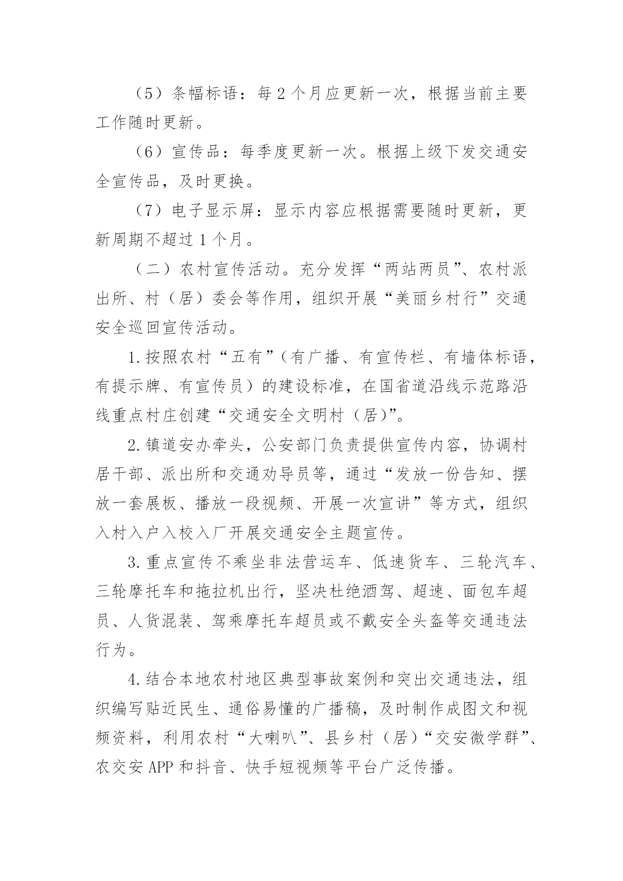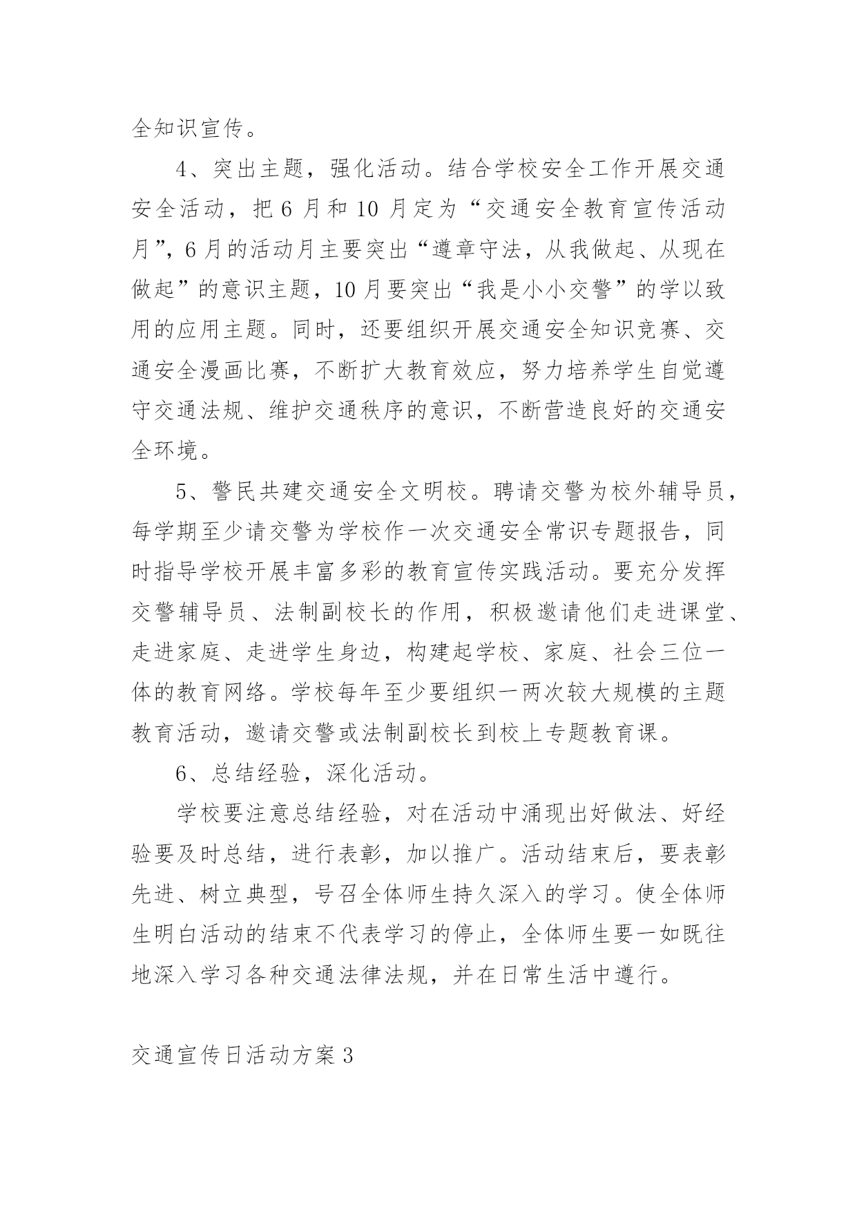 交通宣传日活动方案2022年交通宣传日活动方案(通用10篇)为有力保证活动开展的质量水平,就需要我们事先制定活动方案,活动方案是阐明活动时间,地点,目的,预期效果,预算及活动方法等的书面计划。写活动方案需要注意哪些格式呢?下面是小编帮大家整理的2022年交通宣传日活动方案(通用10篇),希望能够帮助到大家。交通宣传日活动方案1为广泛传播文明交通理念,营造良好的道路交通氛围,经镇政府研究,决定在全镇开展道路交通安全“集中统一宣传日”活动,活动实施方案如下。一、工作目标通过组织每月18日开展“集中统一宣传日”活动,促进线下交通安全定向宣传常态化,逐步构建面向全民的道路交通安全教育体系,强化各单位宣传教育能力建设,普及交通安全自护知识和防御意识,实现道路交通安全宣教工作效果显著增强,全民交通安全、法治和文明意识逐步提升,有效预防和减少道路交通事故,为我镇实现跨越式发展创造更安全、更和谐、更文明的道路交通环境。二、工作内容每月18日为“全镇集中统一宣传日”。(一)阵地宣传活动。突出阵地“普及交法、警示教育、提示安全、倡导文明”四大功能作用。1.建设范围:各村(社区)及有关部门要认真贯彻落实《交通安全宣传教育设施设置规范》(GA/T963-20XX),加强交管业务窗口、派出所综合窗口,警保合作劝导站、客运站、主要道路沿线行政村、学校等交通安全宣传阵地建设和应用管理,及时更新内容,推动规范化、制度化。有条件的地方,要积极协调楼宇梯视、商场超市LED、车站视频播放机、公交车显示屏、各村“村村响”播放等阵地载体通过播放视频、滚动标语开展交通安全宣传提示,营造浓厚的社会舆论氛围。2.宣传内容:与阶段性交安宣传工作保持一致,重点围绕“车靠边、快警示、人撤离、即报警”12字警句以及酒驾、超员、超速、分心驾驶、疲劳驾驶、占用应急车道、突发应急处置、二次事故预防等宣传提示。要结合实际以及宣传对象,注重针对性和实效性,按照因地制宜、方便实用、循序渐进的原则,积极筹建、合理布局、充实完善各种宣传设施,包括固定式宣传橱窗、专栏、标语和移动式宣传展板,以及电视、LED电子显示屏、多媒体触摸屏等音像播放设备,并放置供群众阅读和取用的交通安全宣传资料等。3.更新要求:原则上应定期更新,遇特殊情况随时更新。(1)宣传橱窗、墙(板)报:每季度更新一次内容。(2)宣传展板:每半年更新一次内容。(3)媒体播放机:播放内容应有3种以上,滚动播出。每半年应更新一次。(4)墙体标语:每半年应更新一次。(5)条幅标语:每2个月应更新一次,根据当前主要工作随时更新。(6)宣传品:每季度更新一次。根据上级下发交通安全宣传品,及时更换。(7)电子显示屏:显示内容应根据需要随时更新,更新周期不超过1个月。(二)农村宣传活动。充分发挥“两站两员”、农村派出所、村(居)委会等作用,组织开展“美丽乡村行”交通安全巡回宣传活动。1.按照农村“五有”(有广播、有宣传栏、有墙体标语,有提示牌、有宣传员)的建设标准,在国省道沿线示范路沿线重点村庄创建“交通安全文明村(居)”。2.镇道安办牵头,公安部门负责提供宣传内容,协调村居干部、派出所和交通劝导员等,通过“发放一份告知、摆放一套展板、播放一段视频、开展一次宣讲”等方式,组织入村入户入校入厂开展交通安全主题宣传。3.重点宣传不乘坐非法营运车、低速货车、三轮汽车、三轮摩托车和拖拉机出行,坚决杜绝酒驾、超速、面包车超员、人货混装、驾乘摩托车超员或不戴安全头盔等交通违法行为。4.结合本地农村地区典型事故案例和突出交通违法,组织编写贴近民生、通俗易懂的广播稿,及时制作成图文和视频资料,利用农村“大喇叭”、县乡村(居)“交安微学群”、农交安APP和抖音、快手短视频等平台广泛传播。5.针对性地向农村地区机动车车主和驾驶人发送交通安全提示信息,重点加强农忙出行、雨雾天气出行、夜间出行等安全提示,提升信息通达率和实效性。6.路面执勤民警在开展交通违法查纠时,对农村车辆驾驶人主动开展道路隐患警示、安全驾驶等宣传提示工作。7.结合“一盔一带”安全守护行动,加强对农村私家车、二轮摩托车驾驶人开展宣传提示,督促其规范使用安全带和安全头盔。8.结合传统节日、庙会集会、婚丧嫁娶等,组织开展群众喜闻乐见、形式多样的交通安全主题宣传活动。有条件的地方,要依托“文艺汇演”“电影下乡”“流动宣传车”等形式,提高宣传覆盖面。(三)企业宣传活动。以客货运输、快递外卖、驾校培训、机关车队等为重点,集中开展源头宣传警示、安全教育活动。1.公安部门通过组织客货运输、配送企业、驾校及机关车队等负责人、安全管理员到队部集中(“请进来”),或者上门走访(“走出去”)的形式,通报辖区交通安全形势和重点车辆事故情况,并发放每月新编的交通安全宣传资料。2.公安部门每月要收集汇编本地典型案例宣传资料,提供