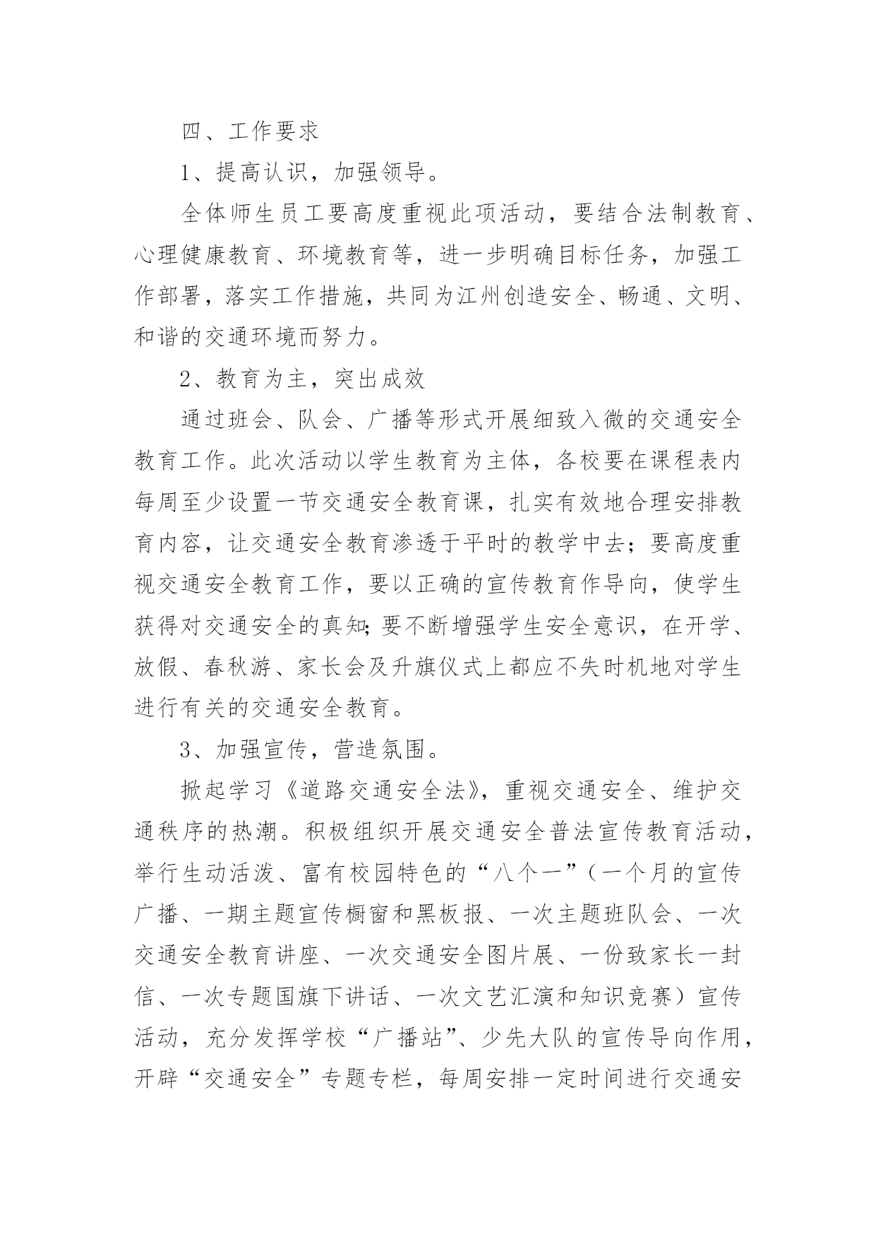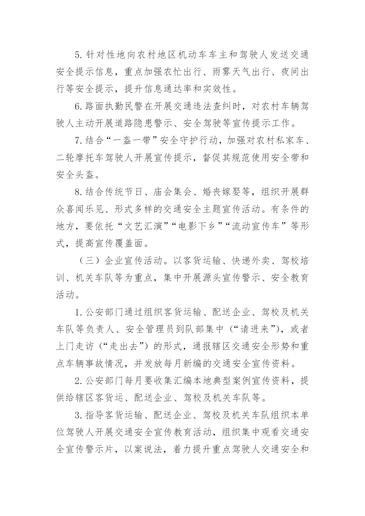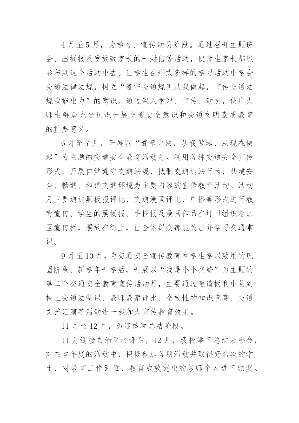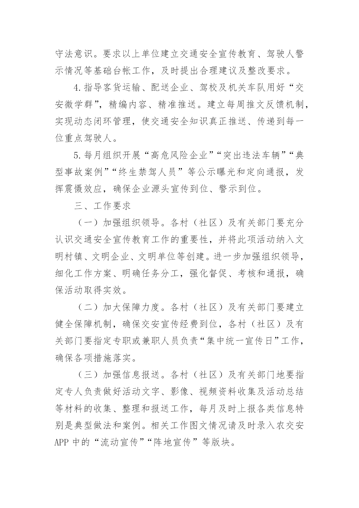 交通宣传日活动方案2022年交通宣传日活动方案(通用10篇)为有力保证活动开展的质量水平,就需要我们事先制定活动方案,活动方案是阐明活动时间,地点,目的,预期效果,预算及活动方法等的书面计划。写活动方案需要注意哪些格式呢?下面是小编帮大家整理的2022年交通宣传日活动方案(通用10篇),希望能够帮助到大家。交通宣传日活动方案1为广泛传播文明交通理念,营造良好的道路交通氛围,经镇政府研究,决定在全镇开展道路交通安全“集中统一宣传日”活动,活动实施方案如下。一、工作目标通过组织每月18日开展“集中统一宣传日”活动,促进线下交通安全定向宣传常态化,逐步构建面向全民的道路交通安全教育体系,强化各单位宣传教育能力建设,普及交通安全自护知识和防御意识,实现道路交通安全宣教工作效果显著增强,全民交通安全、法治和文明意识逐步提升,有效预防和减少道路交通事故,为我镇实现跨越式发展创造更安全、更和谐、更文明的道路交通环境。二、工作内容每月18日为“全镇集中统一宣传日”。(一)阵地宣传活动。突出阵地“普及交法、警示教育、提示安全、倡导文明”四大功能作用。1.建设范围:各村(社区)及有关部门要认真贯彻落实《交通安全宣传教育设施设置规范》(GA/T963-20XX),加强交管业务窗口、派出所综合窗口,警保合作劝导站、客运站、主要道路沿线行政村、学校等交通安全宣传阵地建设和应用管理,及时更新内容,推动规范化、制度化。有条件的地方,要积极协调楼宇梯视、商场超市LED、车站视频播放机、公交车显示屏、各村“村村响”播放等阵地载体通过播放视频、滚动标语开展交通安全宣传提示,营造浓厚的社会舆论氛围。2.宣传内容:与阶段性交安宣传工作保持一致,重点围绕“车靠边、快警示、人撤离、即报警”12字警句以及酒驾、超员、超速、分心驾驶、疲劳驾驶、占用应急车道、突发应急处置、二次事故预防等宣传提示。要结合实际以及宣传对象,注重针对性和实效性,按照因地制宜、方便实用、循序渐进的原则,积极筹建、合理布局、充实完善各种宣传设施,包括固定式宣传橱窗、专栏、标语和移动式宣传展板,以及电视、LED电子显示屏、多媒体触摸屏等音像播放设备,并放置供群众阅读和取用的交通安全宣传资料等。3.更新要求:原则上应定期更新,遇特殊情况随时更新。(1)宣传橱窗、墙(板)报:每季度更新一次内容。(2)宣传展板:每半年更新一次内容。(3)媒体播放机:播放内容应有3种以上,滚动播出。每半年应更新一次。(4)墙体标语:每半年应更新一次。(5)条幅标语:每2个月应更新一次,根据当前主要工作随时更新。(6)宣传品:每季度更新一次。根据上级下发交通安全宣传品,及时更换。(7)电子显示屏:显示内容应根据需要随时更新,更新周期不超过1个月。(二)农村宣传活动。充分发挥“两站两员”、农村派出所、村(居)委会等作用,组织开展“美丽乡村行”交通安全巡回宣传活动。1.按照农村“五有”(有广播、有宣传栏、有墙体标语,有提示牌、有宣传员)的建设标准,在国省道沿线示范路沿线重点村庄创建“交通安全文明村(居)”。2.镇道安办牵头,公安部门负责提供宣传内容,协调村居干部、派出所和交通劝导员等,通过“发放一份告知、摆放一套展板、播放一段视频、开展一次宣讲”等方式,组织入村入户入校入厂开展交通安全主题宣传。3.重点宣传不乘坐非法营运车、低速货车、三轮汽车、三轮摩托车和拖拉机出行,坚决杜绝酒驾、超速、面包车超员、人货混装、驾乘摩托车超员或不戴安全头盔等交通违法行为。4.结合本地农村地区典型事故案例和突出交通违法,组织编写贴近民生、通俗易懂的广播稿,及时制作成图文和视频资料,利用农村“大喇叭”、县乡村(居)“交安微学群”、农交安APP和抖音、快手短视频等平台广泛传播。5.针对性地向农村地区机动车车主和驾驶人发送交通安全提示信息,重点加强农忙出行、雨雾天气出行、夜间出行等安全提示,提升信息通达率和实效性。6.路面执勤民警在开展交通违法查纠时,对农村车辆驾驶人主动开展道路隐患警示、安全驾驶等宣传提示工作。7.结合“一盔一带”安全守护行动,加强对农村私家车、二轮摩托车驾驶人开展宣传提示,督促其规范使用安全带和安全头盔。8.结合传统节日、庙会集会、婚丧嫁娶等,组织开展群众喜闻乐见、形式多样的交通安全主题宣传活动。有条件的地方,要依托“文艺汇演”“电影下乡”“流动宣传车”等形式,提高宣传覆盖面。(三)企业宣传活动。以客货运输、快递外卖、驾校培训、机关车队等为重点,集中开展源头宣传警示、安全教育活动。1.公安部门通过组织客货运输、配送企业、驾校及机关车队等负责人、安全管理员到队部集中(“请进来”),或者上门走访(“走出去”)的形式,通报辖区交通安全形势和重点车辆事故情况,并发放每月新编的交通安全宣传资料。2.公安部门每月要收集汇编本地典型案例宣传资料,提供