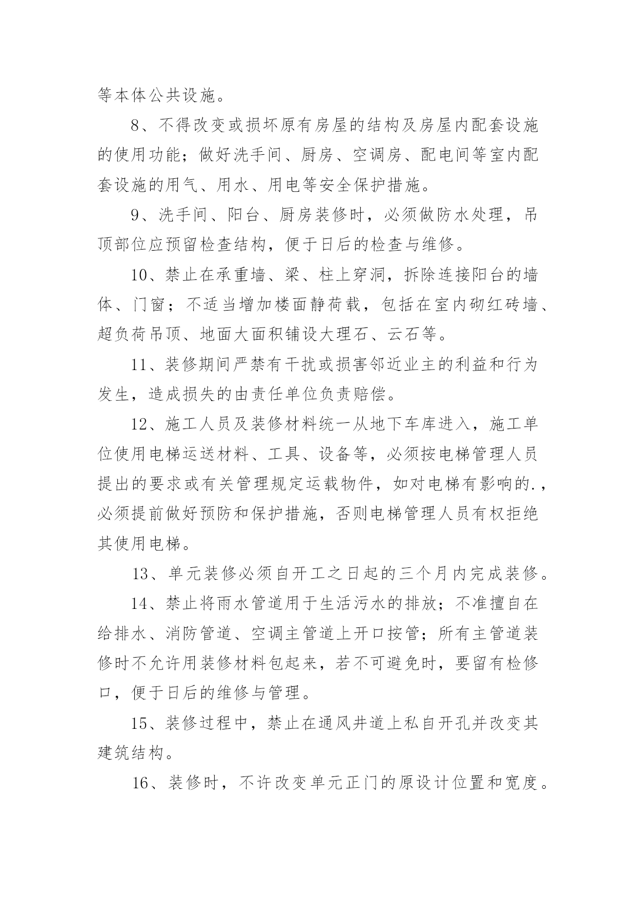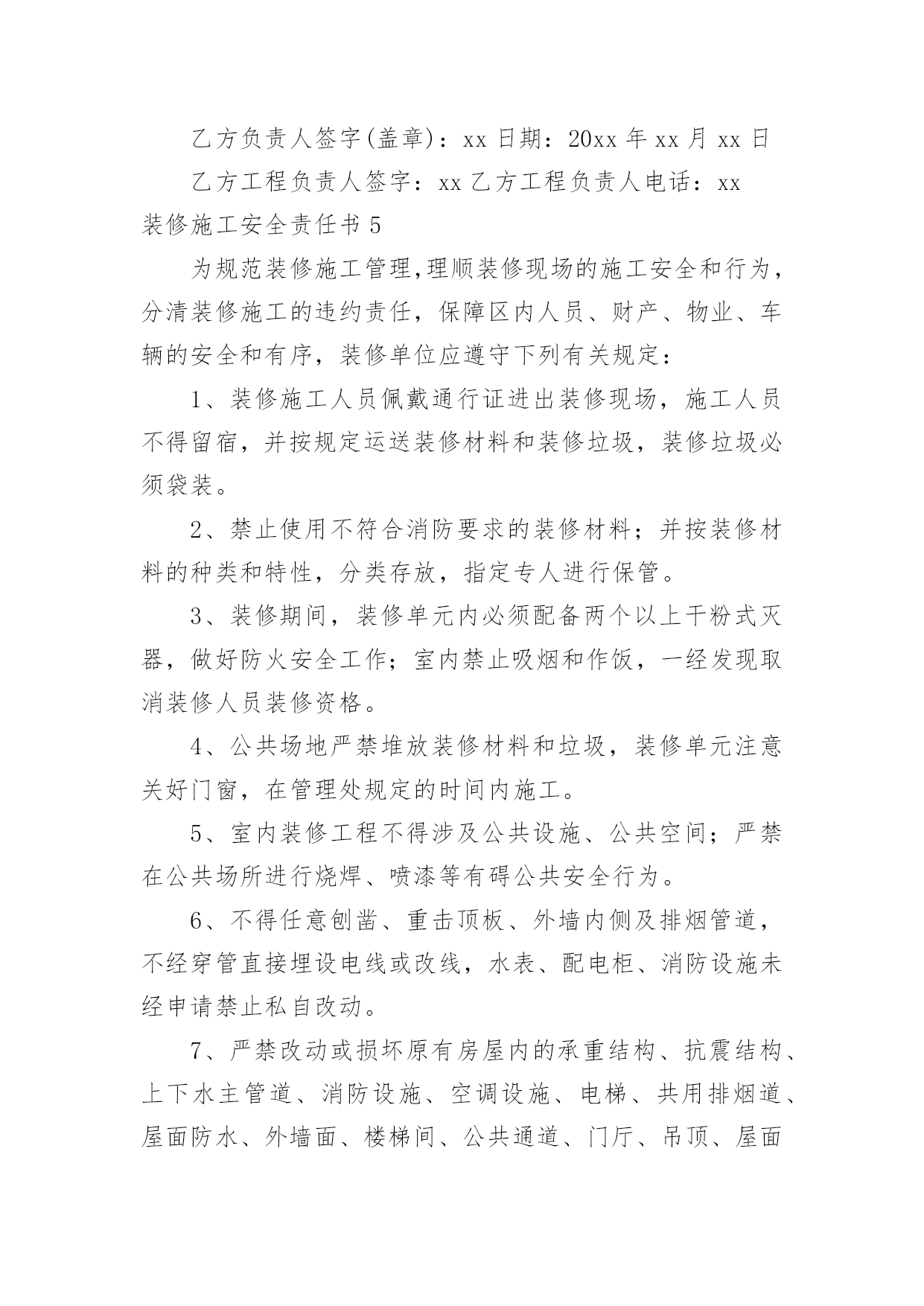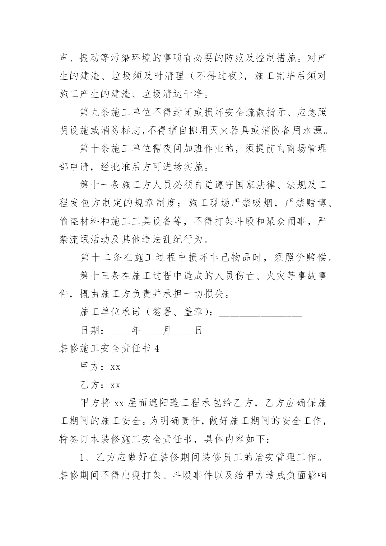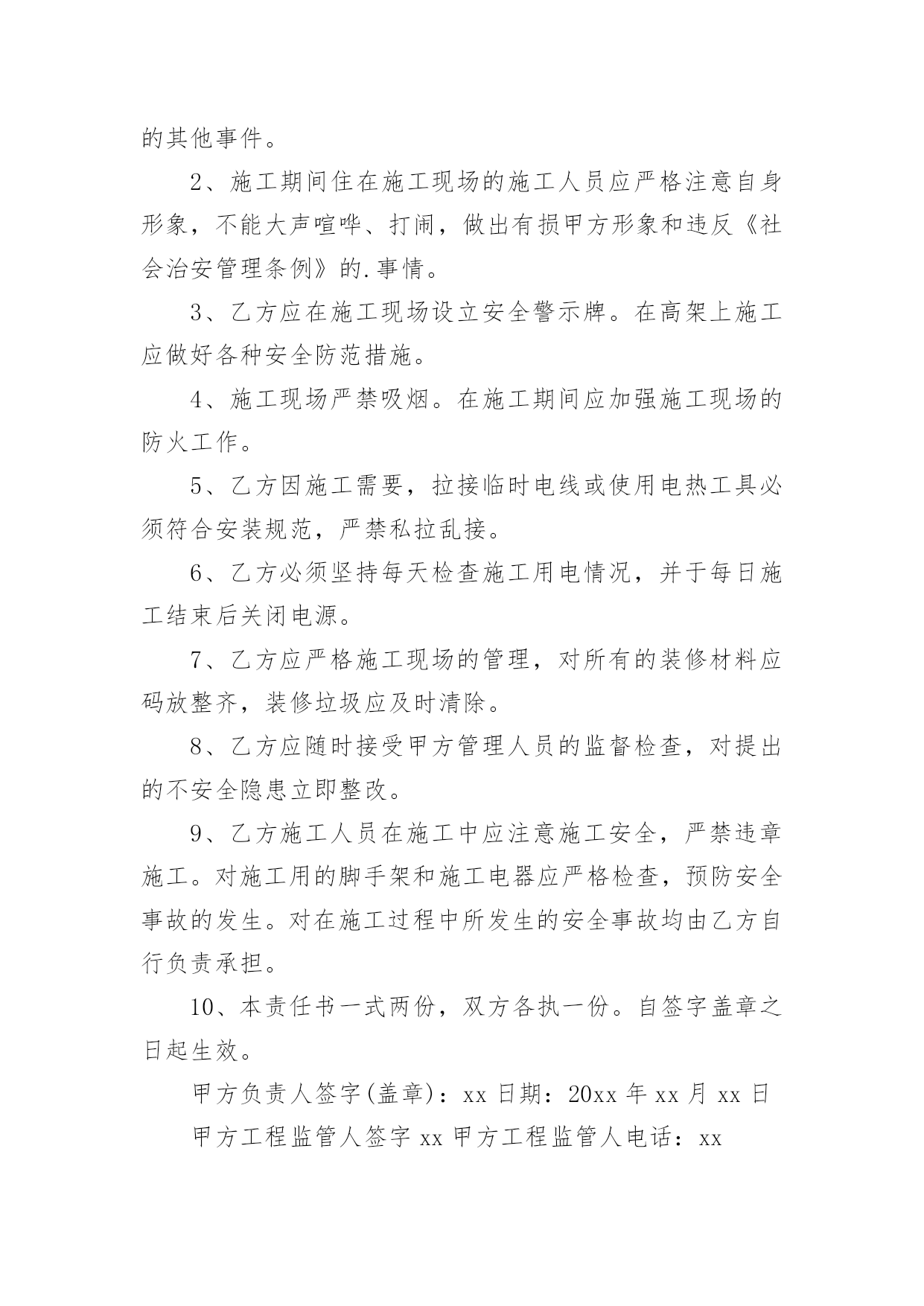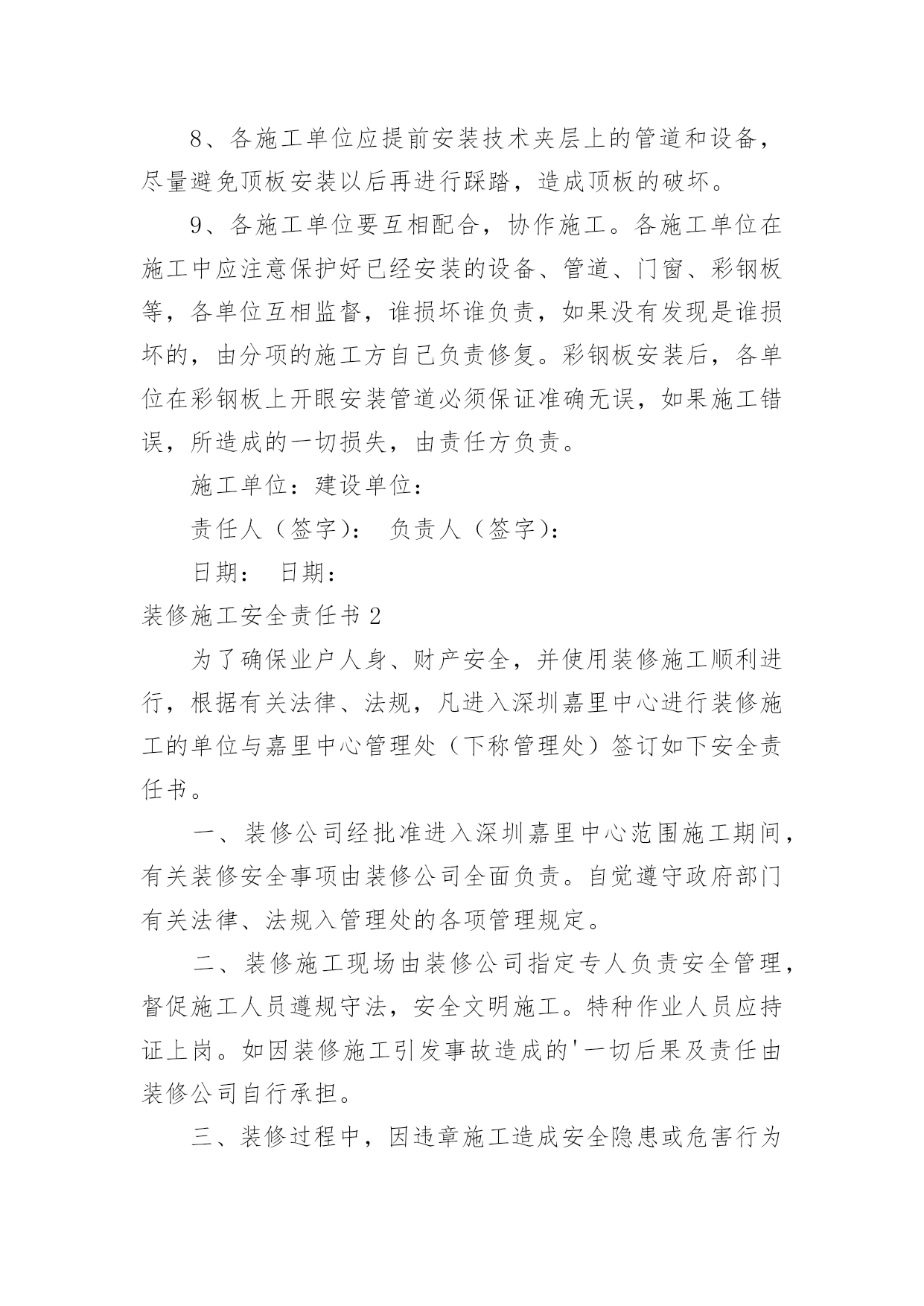 装修施工安全责任书装修施工安全责任书15篇在日常生活和工作中,我们每个人都可能会接触到责任书,签订责任书有助于落实责任。相信很多朋友都对拟定责任书感到非常苦恼吧,以下是小编为大家整理的装修施工安全责任书,欢迎阅读与收藏。装修施工安全责任书1为了搞好新厂房净化装修工程,保证工程的安全顺利、质量优良,特对安全、质量要求进行责任保证:一、文明施工部分:1、施工单位必须遵守国家的法律、法规和本公司的规章制度,服从管理,听从指挥。2、各施工单位在施工前必须进行开始施工申请。要健全项目部组织机构;制定项目规章制度;配备相关的施工技术人员;完善施工组织设计及安全技术措施;做好进场机具、材料准备工作。各方面施工条件具备后,向建设方书面提出开工申请,经审查同意后,方可进行施工。3、施工现场应规范管理,合理设置办公区、生活区、工作区。施工现场的物料要堆放整齐,生活区必须远离净化装修区域,做好文明施工工作。4、施工现场必须按照规定配备项目、技术、安全等施工管理人员。管理人员应常驻施工现场,每月不低于20个工作日,负责施工现场的安全、质量、文明施工等各方面工作。5、特种施工人员必须持证上岗。对于电焊工、电工等施工人员必须要有特种作业上岗证,严禁无证上岗、违章作业。6、施工单位在施工现场用电、动火施工,必须遵守威高《临时用电管理制度》和《动火作业管理制度》。(附《临时用电管理制度》和《动火作业管理制度》)7、应对所有施工人员进行安全教育,提高安全意识,使施工人员懂得安全施工的重要性,从思想上重视安全工作。施工现场应该预防火灾事故、触电事故、高空坠落事故的发生,各单位要把安全工作做到实处,灭火器、保险带以及个人安全防护的安全措施必须到位,防止安全事故的发生。施工单位应为施工人员购买意外伤害保险,保障职工合法权益。如发生意外伤害损失由施工方负责,建设方不负任何责任。8、搞好施工协调工作。在施工时,当一施工方与另一施工方发生冲突时,应立即找建设方代表进行协调,搞好协作,保证工程顺利进行。9、搞好施工现场的文明施工。施工方进入施工现场,首先清理好现场的卫生,做好安全防护措施,方可施工。施工中,施工垃圾、生活垃圾,一定要集中处理,严禁乱扔、乱放,严禁随地大小便。特别是彩板安装及彩板顶棚上,严禁吸烟、小便、乱扔垃圾,如有发现将处1000—5000元的罚款。严禁打架、偷盗等现象的发生,如有发生将移交公安部门处理。各单位要互相监督,做到文明施工。二、技术质量部分:1、按照甲方提供的施工图纸和国家施工技术标准进行施工。施工质量标准按照国家制定的有关施工质量验收规范执行。2、工程施工前必须组织图纸会审,经审核无异议后,方可施工。3、必须做好施工现场的施工技术方案、分部分项验收报告、来料验收报告、安全措施方案、材料的合格证等安全技术资料,确保验收资料齐全。4、在施工现场的.各施工单位,必须按照设计要求进行施工,施工所用的材料必须符合合同要求,严禁使用伪劣不合格产品,按照规范保质、保量搞好净化车间的装修。5、各施工单位做出施工进度计划(报甲方备案),使净化装修工程按期完成。6、施工过程中,应按照分部、分项验收施工。风管制作、吊装后,经过甲方测漏验收后方可保温,风管保温后,方可安装彩板顶板。彩板安装放线后,应经甲方确认,方可施工。7、施工过程中如果发现图纸所设计的与现场实际情况不符、不科学、不美观,或者相互有障碍,应及时与甲方沟通,经研究、协商后进行合理变更。变更方案应经建设方签字认可后,方可施工。未经签字,建设方不予认可。8、各施工单位应提前安装技术夹层上的管道和设备,尽量避免顶板安装以后再进行踩踏,造成顶板的破坏。9、各施工单位要互相配合,协作施工。各施工单位在施工中应注意保护好已经安装的设备、管道、门窗、彩钢板等,各单位互相监督,谁损坏谁负责,如果没有发现是谁损坏的,由分项的施工方自己负责修复。彩钢板安装后,各单位在彩钢板上开眼安装管道必须保证准确无误,如果施工错误,所造成的一切损失,由责任方负责。施工单位:建设单位:责任人(签字):负责人(签字):日期:日期:装修施工安全责任书2为了确保业户人身、财产安全,并使用装修施工顺利进行,根据有关法律、法规,凡进入深圳嘉里中心进行装修施工的单位与嘉里中心管理处(下称管理处)签订如下安全责任书。一、装修公司经批准进入深圳嘉里中心范围施工期间,有关装修安全事项由装修公司全面负责。自觉遵守政府部门有关法律、法规入管理处的各项管理规定。二、装修施工现场由装修公司指定专人负责安全管理,督促施工人员遵规守法,安全文明施工。特种作业人员应持证上岗。如因装修施工引发事故造成的'一切后果及责任由装修公司自行承担。三、装修过程中,因违章施工造成安全隐患或危害行为时,工业滤布管理处有权指正同时依据有关规定停工处理,因此引致停工、误工损失入责任均由
