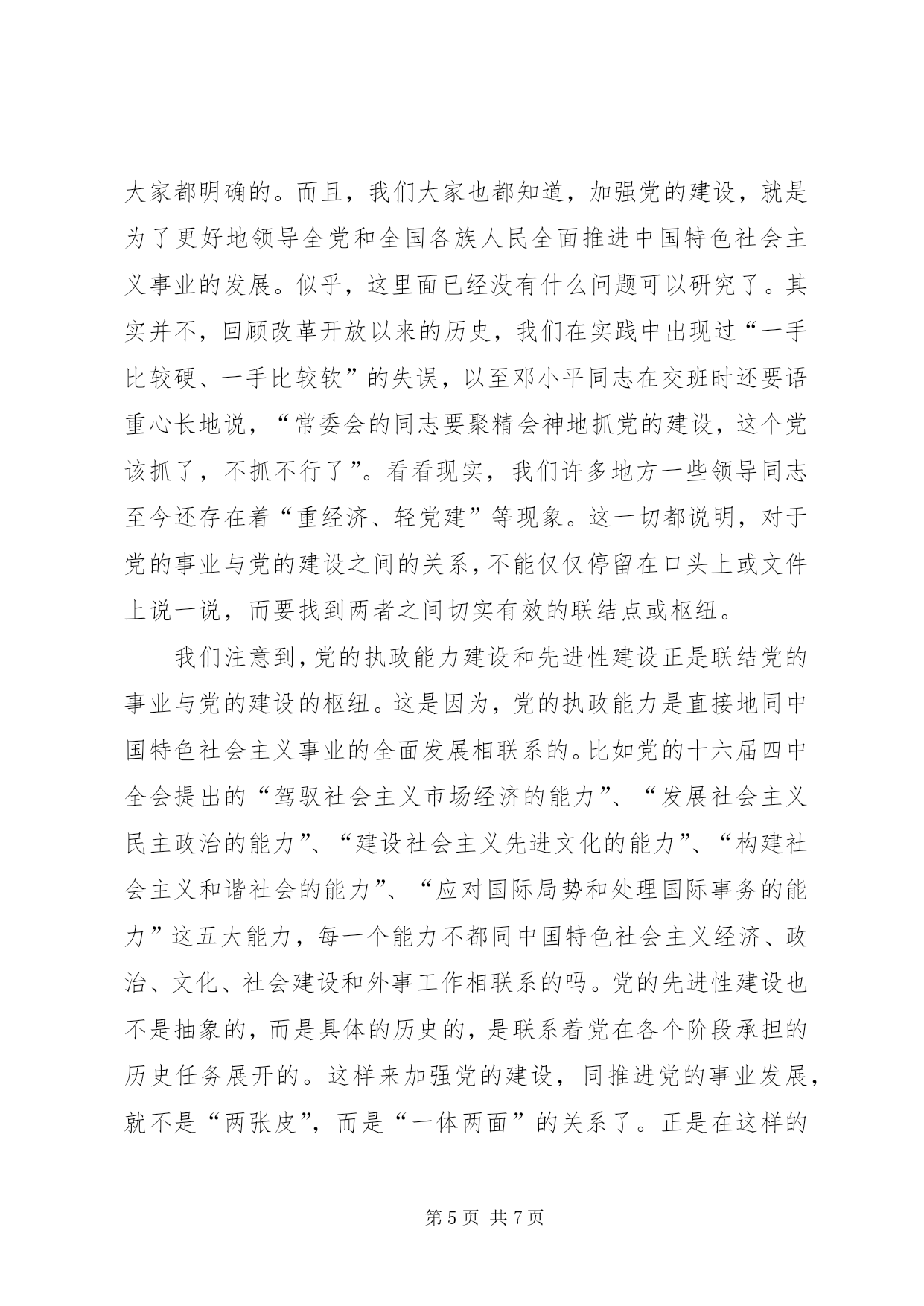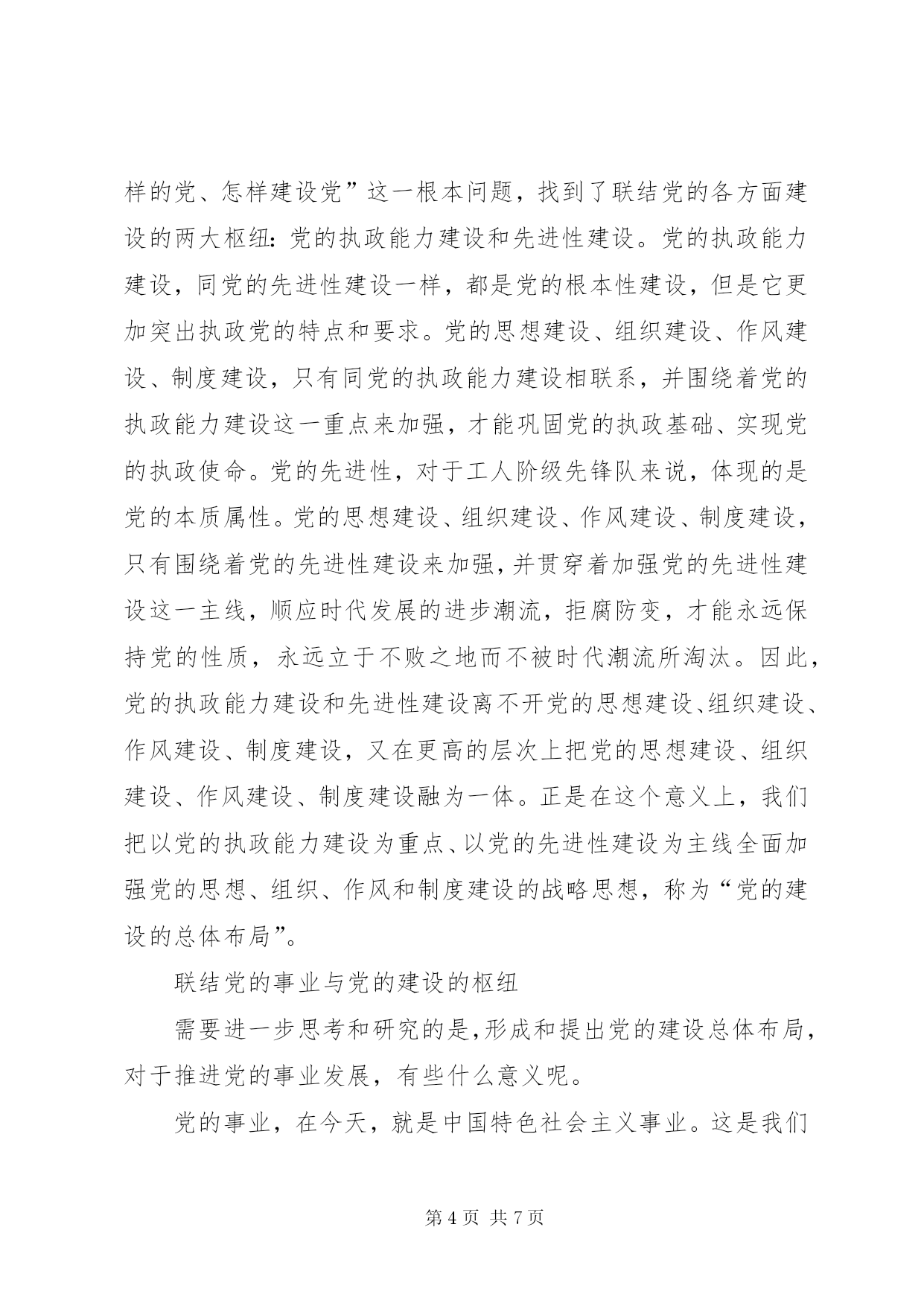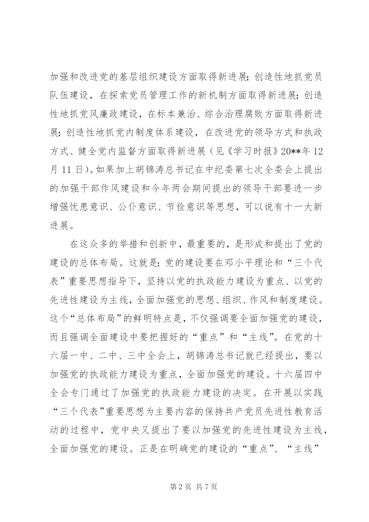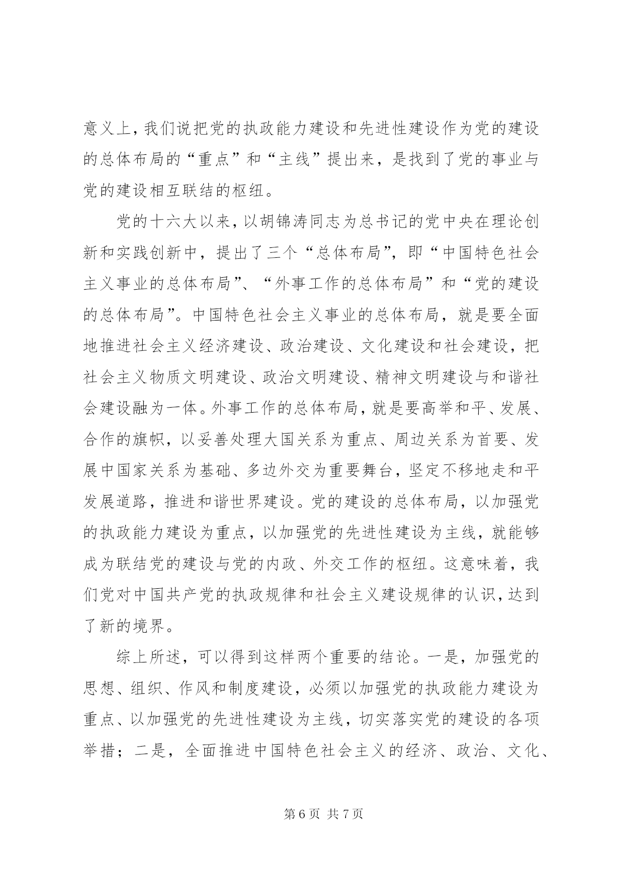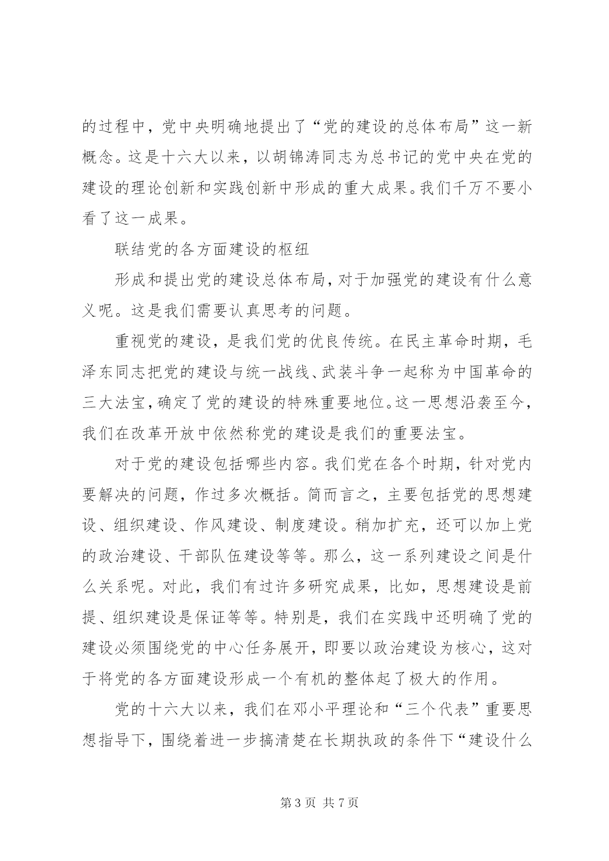 第PAGE\*Arabic\*MERGEFORMAT7页共NUMPAGES\*MERGEFORMAT7页党建设总体布局理论交流为了迎接十七大的胜利召开,一个重要的思想理论准备,就是要回顾总结好十六大以来党中央提出的一系列重大战略思想。这是一个宏大的社会科学工程。在这里,我重点就十六大以来以胡锦涛同志为总书记的党中央形成和提出的党的建设总体布局这一问题,谈几点认识。是党的建设理论创新和实践创新的重大成果十六大以来党中央提出的一系列重大战略思想及其理论创新成果,包括了党的建设方面的战略思想和创新成果。党中央在党的建设方面提出的重大战略思想和创新成果,大家作了很多研究,提出了许多有意义的见解。比如,中央政策研究室副主任何毅亭同志概括过十六大以来党中央在党的建设方面十大新进展,包括:创造性地抓理论武装工作,在推进党的思想理论建设方面取得新进展;创造性地开展以实践“三个代表”重要思想为主要内容的保持共产党员先进性教育活动,在建立健全让党员经常受教育、永葆先进性的长效机制方面取得新进展;创造性地抓干部培训工作,在推进学习型政党建设方面取得新进展;创造性地推进党内民主建设,在发展党内民主方面取得新进展;创造性地推进干部人事制度改革,在加强领导班子和干部队伍建设方面取得新进展;创造性地抓人才工作,在实施人才强国战略方面取得新进展;创造性地做好抓基层、打基础的工作,在加强和改进党的基层组织建设方面取得新进展;创造性地抓党员队伍建设,在探索党员管理工作的新机制方面取得新进展;创造性地抓党风廉政建设,在标本兼治、综合治理腐败方面取得新进展;创造性地抓党内制度体系建设,在改进党的领导方式和执政方式、健全党内监督方面取得新进展(见《学习时报》20**年12月11日)。如果加上胡锦涛总书记在中纪委第七次全委会上提出的加强干部作风建设和今年两会期间提出的领导干部要进一步增强忧患意识、公仆意识、节俭意识等思想,可以说有十一大新进展。在这众多的举措和创新中,最重要的,是形成和提出了党的建设的总体布局。这就是:党的建设要在邓小平理论和“三个代表”重要思想指导下,坚持以党的执政能力建设为重点、以党的先进性建设为主线,全面加强党的思想、组织、作风和制度建设。这个“总体布局”的鲜明特点是,不仅强调要全面加强党的建设,而且强调全面建设中要把握好的“重点”和“主线”。在党的十六届一中、二中、三中全会上,胡锦涛总书记就已经提出,要以加强党的执政能力建设为重点,全面加强党的建设。十六届四中全会专门通过了加强党的执政能力建设的决定。在开展以实践“三个代表”重要思想为主要内容的保持共产党员先进性教育活动的过程中,党中央又提出了要以加强党的先进性建设为主线,全面加强党的建设。正是在明确党的建设的“重点”、“主线”的过程中,党中央明确地提出了“党的建设的总体布局”这一新概念。这是十六大以来,以胡锦涛同志为总书记的党中央在党的建设的理论创新和实践创新中形成的重大成果。我们千万不要小看了这一成果。联结党的各方面建设的枢纽形成和提出党的建设总体布局,对于加强党的建设有什么意义呢。这是我们需要认真思考的问题。重视党的建设,是我们党的优良传统。在民主革命时期,毛泽东同志把党的建设与统一战线、武装斗争一起称为中国革命的三大法宝,确定了党的建设的特殊重要地位。这一思想沿袭至今,我们在改革开放中依然称党的建设是我们的重要法宝。对于党的建设包括哪些内容。我们党在各个时期,针对党内要解决的问题,作过多次概括。简而言之,主要包括党的思想建设、组织建设、作风建设、制度建设。稍加扩充,还可以加上党的政治建设、干部队伍建设等等。那么,这一系列建设之间是什么关系呢。对此,我们有过许多研究成果,比如,思想建设是前提、组织建设是保证等等。特别是,我们在实践中还明确了党的建设必须围绕党的中心任务展开,即要以政治建设为核心,这对于将党的各方面建设形成一个有机的整体起了极大的作用。党的十六大以来,我们在邓小平理论和“三个代表”重要思想指导下,围绕着进一步搞清楚在长期执政的条件下“建设什么样的党、怎样建设党”这一根本问题,找到了联结党的各方面建设的两大枢纽:党的执政能力建设和先进性建设。党的执政能力建设,同党的先进性建设一样,都是党的根本性建设,但是它更加突出执政党的特点和要求。党的思想建设、组织建设、作风建设、制度建设,只有同党的执政能力建设相联系,并围绕着党的执政能力建设这一重点来加强,才能巩固党的执政基础、实现党的执政使命。党的先进性,对于工人阶级先锋队来说,体现的是党的本质属性。党的思想建设、组织建设、作风建设、制度建设,只有围绕着党的先进性建设来加强,并贯穿着加强党的先进性建设这一主线,顺应时代发展的进步潮流,拒腐防变,才能永远保持党的性质,永远立于不败之地而不被时代潮流所淘汰。因此,党的