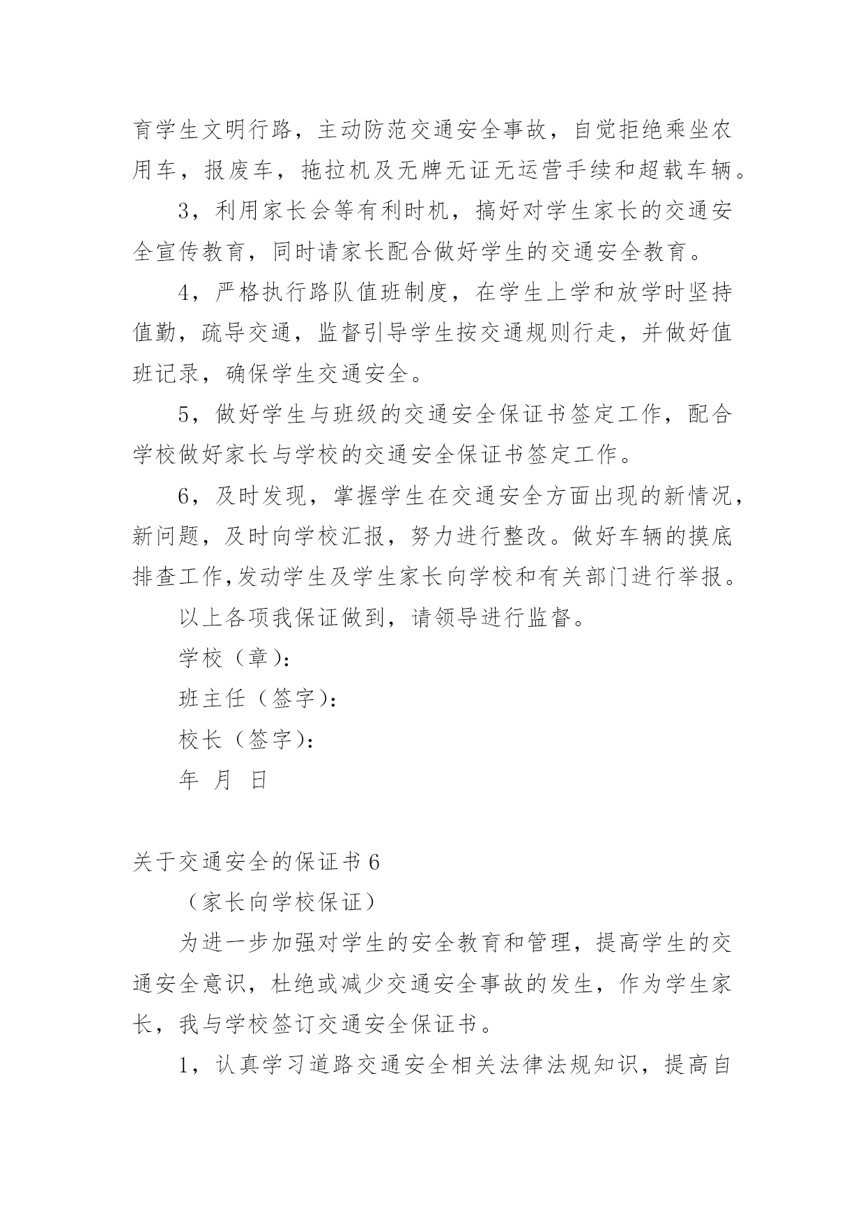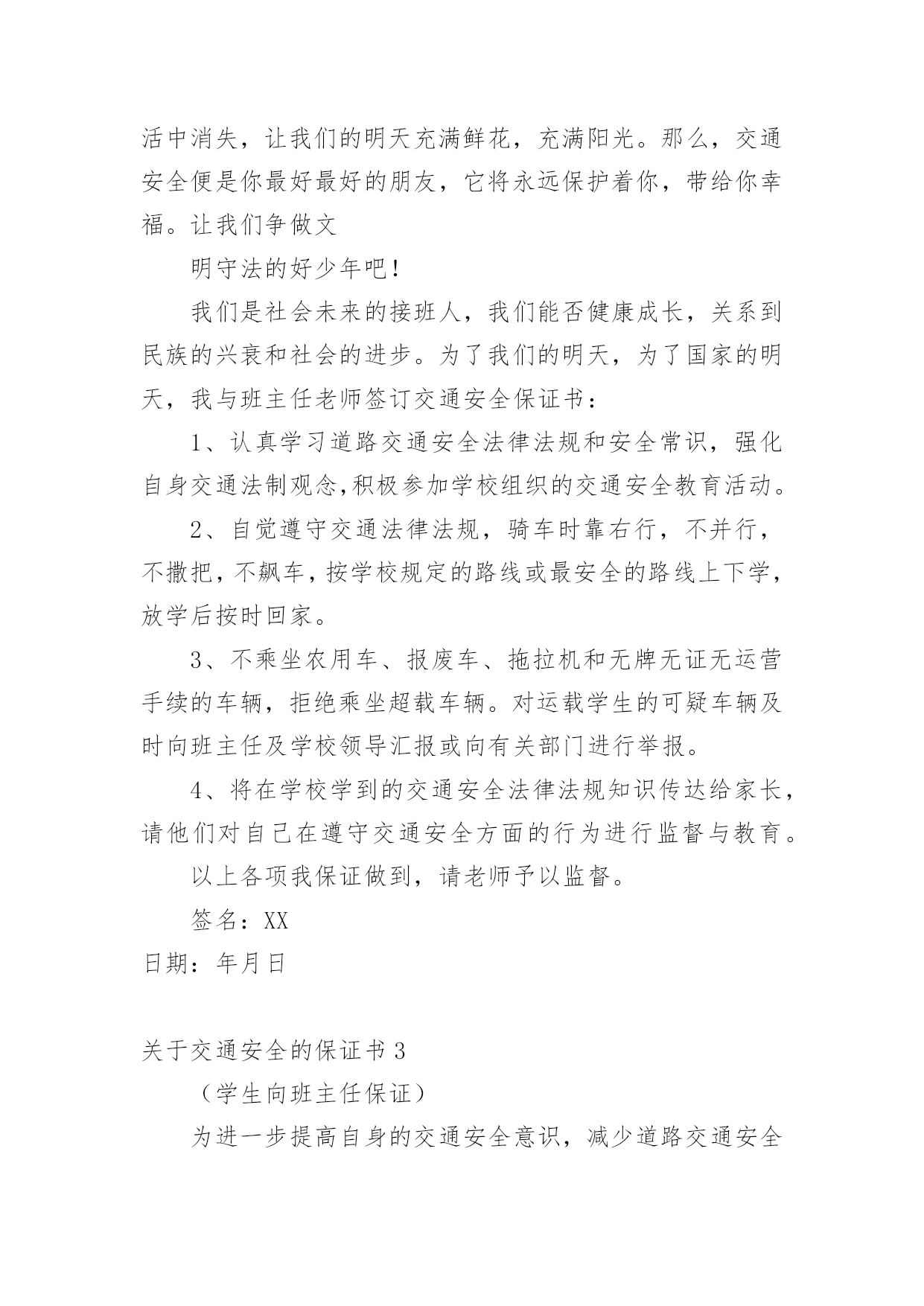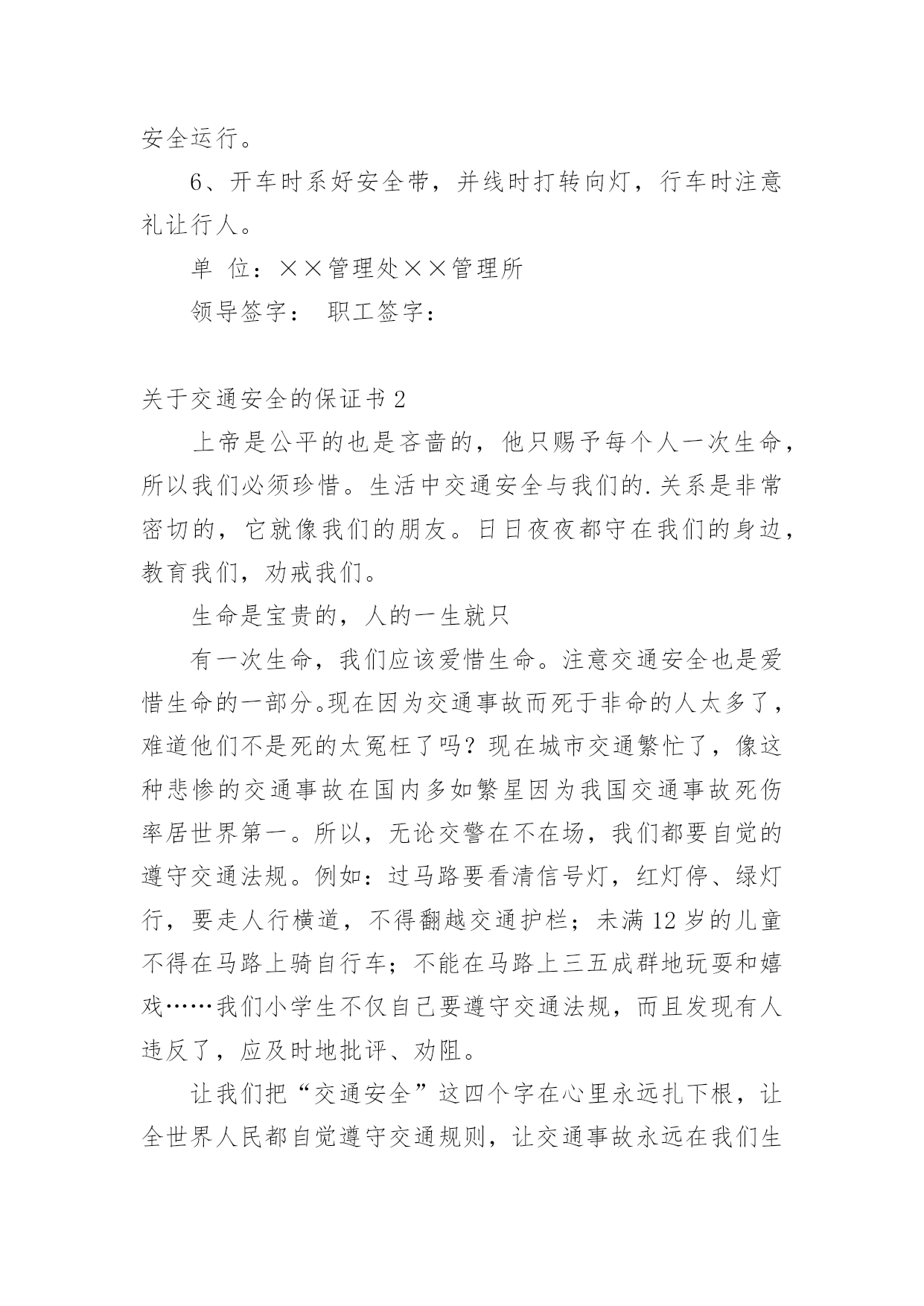 交通安全的保证书关于交通安全的保证书在社会发展不断提速的今天,我们使用保证书的情况越来越多,有效的保证书必须合乎法律的规定。那么保证书应该怎么写才合适呢?以下是小编收集整理的关于交通安全的保证书,欢迎大家借鉴与参考,希望对大家有所帮助。关于交通安全的保证书1为了保证社会的和谐与稳定,家庭的幸福与安康,20xx“元旦”期间,我保证做到:1、树立首都意识,增强法律观念。认真学习道路安全法及有关的法律法规,模范遵守各项有关规章制度,增强自我保护意识和自我的约束能力。2、行车中做到中速行驶,安全礼让。不尾随和穿插有警车护卫的车队,不强行超车,不闯红灯,不酒后驾车,不开带病车辆上路,确保行车安全。3、出行时带齐有关证件以备查验,发生交通违法行为时,虚心接受交通民警的教育与处罚,一旦发生交通事故,及时拨打122报警并积极抢救伤者。4、行人在出行时要注意交通安全,认真遵守交通法规,确保人身安全。5、有私家车同志,出行前对车辆进行检查,确保车辆安全运行。6、开车时系好安全带,并线时打转向灯,行车时注意礼让行人。单位:××管理处××管理所领导签字:职工签字:关于交通安全的保证书2上帝是公平的也是吝啬的,他只赐予每个人一次生命,所以我们必须珍惜。生活中交通安全与我们的.关系是非常密切的,它就像我们的朋友。日日夜夜都守在我们的身边,教育我们,劝戒我们。生命是宝贵的,人的一生就只有一次生命,我们应该爱惜生命。注意交通安全也是爱惜生命的一部分。现在因为交通事故而死于非命的人太多了,难道他们不是死的太冤枉了吗?现在城市交通繁忙了,像这种悲惨的交通事故在国内多如繁星因为我国交通事故死伤率居世界第一。所以,无论交警在不在场,我们都要自觉的遵守交通法规。例如:过马路要看清信号灯,红灯停、绿灯行,要走人行横道,不得翻越交通护栏;未满12岁的儿童不得在马路上骑自行车;不能在马路上三五成群地玩耍和嬉戏……我们小学生不仅自己要遵守交通法规,而且发现有人违反了,应及时地批评、劝阻。让我们把“交通安全”这四个字在心里永远扎下根,让全世界人民都自觉遵守交通规则,让交通事故永远在我们生活中消失,让我们的明天充满鲜花,充满阳光。那么,交通安全便是你最好最好的朋友,它将永远保护着你,带给你幸福。让我们争做文明守法的好少年吧!我们是社会未来的接班人,我们能否健康成长,关系到民族的兴衰和社会的进步。为了我们的明天,为了国家的明天,我与班主任老师签订交通安全保证书:1、认真学习道路交通安全法律法规和安全常识,强化自身交通法制观念,积极参加学校组织的交通安全教育活动。2、自觉遵守交通法律法规,骑车时靠右行,不并行,不撒把,不飙车,按学校规定的路线或最安全的路线上下学,放学后按时回家。3、不乘坐农用车、报废车、拖拉机和无牌无证无运营手续的车辆,拒绝乘坐超载车辆。对运载学生的可疑车辆及时向班主任及学校领导汇报或向有关部门进行举报。4、将在学校学到的交通安全法律法规知识传达给家长,请他们对自己在遵守交通安全方面的行为进行监督与教育。以上各项我保证做到,请老师予以监督。签名:XX日期:年月日关于交通安全的保证书3(学生向班主任保证)为进一步提高自身的交通安全意识,减少道路交通安全事故的发生,我与班主任老师签订交通安全保证书。1,认真学习道路交通安全法律法规和安全常识,强化自身交通法制观念,积极参加学校组织的交通安全教育活动。2,自觉遵守交通法律法规,骑车时靠右行,不并行,不撒把,不飙车,按学校规定的路线或最安全的路线上下学,放学后按时回家。3,不乘坐农用车,报废车,拖拉机和无牌无证无运营手续的车辆,拒绝乘坐超载车辆。对运载学生的可疑车辆及时向班主任及学校领导汇报或向有关部门进行举报。4,将在学校学到的交通安全法律法规知识传达给家长,请他们对自己在遵守交通安全方面的行为进行监督与教育。以上各项我保证做到,请老师予以监督。班主任(签字):学生(签字):年月日关于交通安全的保证书4成都市公安局交通管理局科技规划处:我单位共有职工交通班车共辆,为共创我市文明交通环境,共同维护我市道路交通的有序、安全与畅通,特承诺如下:一、建立并完善交通安全规章制度,严格对单位驾驶人员的教育培训和管理考核,落实安全责任。二、严格遵守道路交通安全法律法规,文明行车,配合交通民警的指挥管理,驾驶车辆不超员、不超速、不饮酒后驾驶机动车、不违反交通信号通行。在设置公交专用车道的道路上在专用车道内通行。三、对公安交通管理部门抄告的驾驶人员交通违法行为,严格按照本单位的安全责任规章制度,追究安全管理责任人和驾驶人员的责任。四、我单位职工交通班车使用情况发生变化,不再作为职工交通班车时,及时向公安机关交通管理部门通报备案,并交回公交专用车道通行证。单位法定代表人签字:(单位公章)20xx年月日关于交通安全的保证书5为进一步加强对学