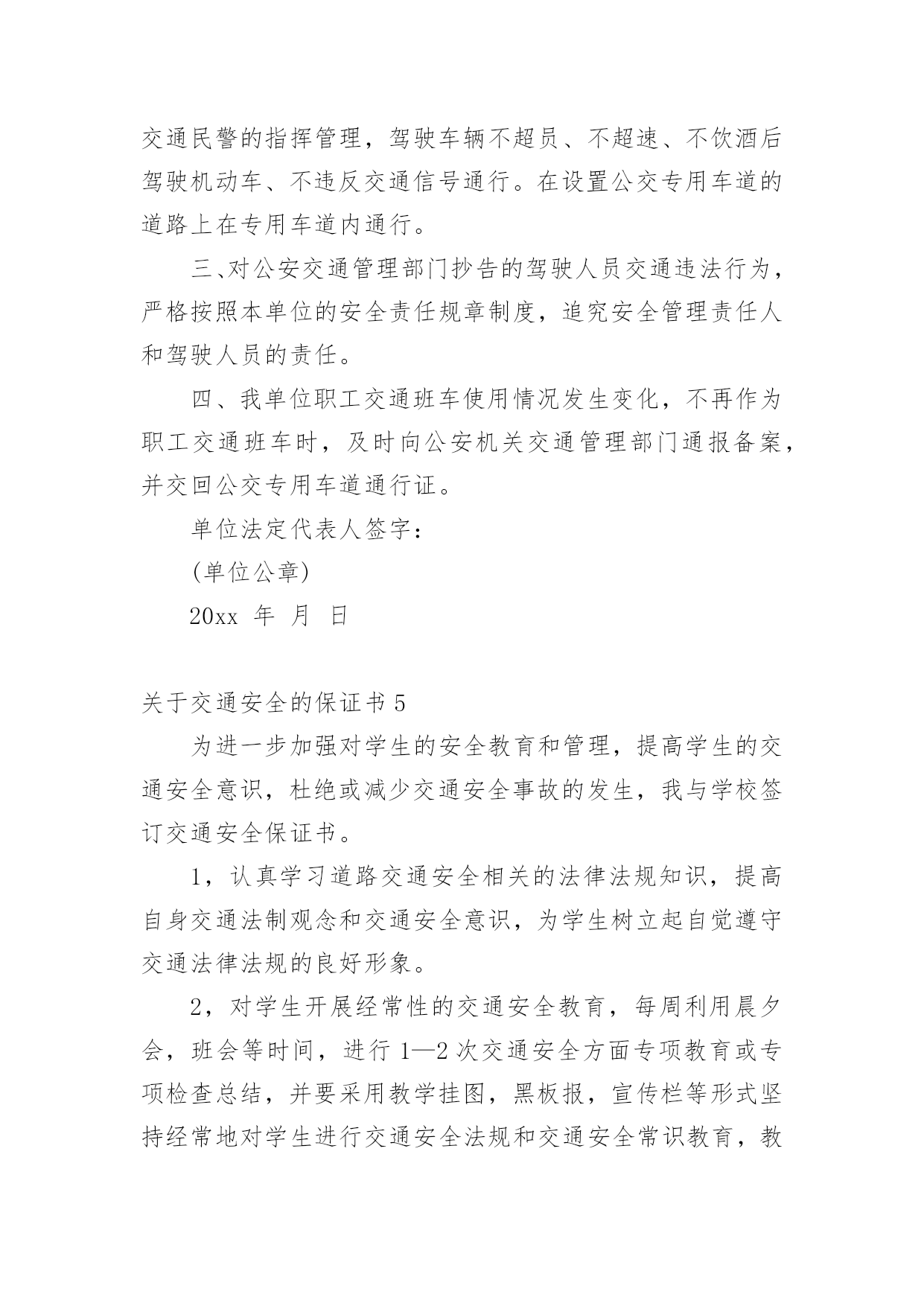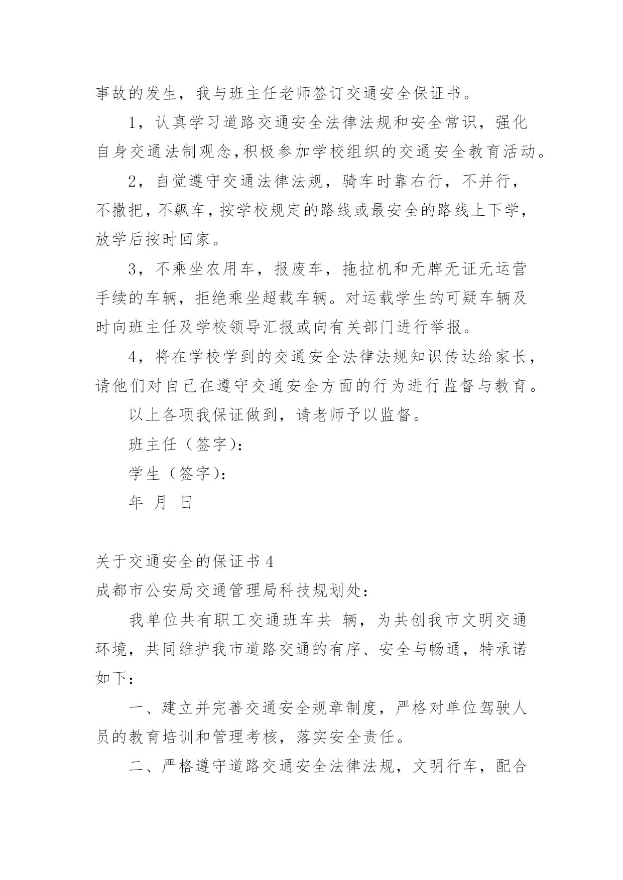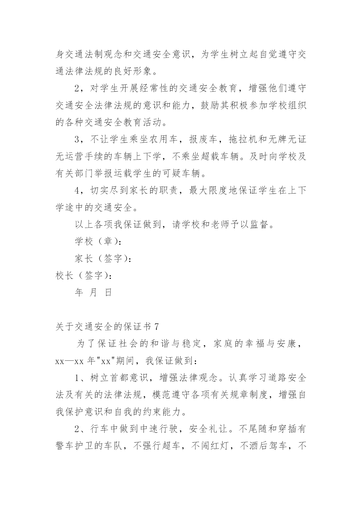 交通安全的保证书关于交通安全的保证书在社会发展不断提速的今天,我们使用保证书的情况越来越多,有效的保证书必须合乎法律的规定。那么保证书应该怎么写才合适呢?以下是小编收集整理的关于交通安全的保证书,欢迎大家借鉴与参考,希望对大家有所帮助。关于交通安全的保证书1为了保证社会的和谐与稳定,家庭的幸福与安康,20xx“元旦”期间,我保证做到:1、树立首都意识,增强法律观念。认真学习道路安全法及有关的法律法规,模范遵守各项有关规章制度,增强自我保护意识和自我的约束能力。2、行车中做到中速行驶,安全礼让。不尾随和穿插有警车护卫的车队,不强行超车,不闯红灯,不酒后驾车,不开带病车辆上路,确保行车安全。3、出行时带齐有关证件以备查验,发生交通违法行为时,虚心接受交通民警的教育与处罚,一旦发生交通事故,及时拨打122报警并积极抢救伤者。4、行人在出行时要注意交通安全,认真遵守交通法规,确保人身安全。5、有私家车同志,出行前对车辆进行检查,确保车辆安全运行。6、开车时系好安全带,并线时打转向灯,行车时注意礼让行人。单位:××管理处××管理所领导签字:职工签字:关于交通安全的保证书2上帝是公平的也是吝啬的,他只赐予每个人一次生命,所以我们必须珍惜。生活中交通安全与我们的.关系是非常密切的,它就像我们的朋友。日日夜夜都守在我们的身边,教育我们,劝戒我们。生命是宝贵的,人的一生就只有一次生命,我们应该爱惜生命。注意交通安全也是爱惜生命的一部分。现在因为交通事故而死于非命的人太多了,难道他们不是死的太冤枉了吗?现在城市交通繁忙了,像这种悲惨的交通事故在国内多如繁星因为我国交通事故死伤率居世界第一。所以,无论交警在不在场,我们都要自觉的遵守交通法规。例如:过马路要看清信号灯,红灯停、绿灯行,要走人行横道,不得翻越交通护栏;未满12岁的儿童不得在马路上骑自行车;不能在马路上三五成群地玩耍和嬉戏……我们小学生不仅自己要遵守交通法规,而且发现有人违反了,应及时地批评、劝阻。让我们把“交通安全”这四个字在心里永远扎下根,让全世界人民都自觉遵守交通规则,让交通事故永远在我们生活中消失,让我们的明天充满鲜花,充满阳光。那么,交通安全便是你最好最好的朋友,它将永远保护着你,带给你幸福。让我们争做文明守法的好少年吧!我们是社会未来的接班人,我们能否健康成长,关系到民族的兴衰和社会的进步。为了我们的明天,为了国家的明天,我与班主任老师签订交通安全保证书:1、认真学习道路交通安全法律法规和安全常识,强化自身交通法制观念,积极参加学校组织的交通安全教育活动。2、自觉遵守交通法律法规,骑车时靠右行,不并行,不撒把,不飙车,按学校规定的路线或最安全的路线上下学,放学后按时回家。3、不乘坐农用车、报废车、拖拉机和无牌无证无运营手续的车辆,拒绝乘坐超载车辆。对运载学生的可疑车辆及时向班主任及学校领导汇报或向有关部门进行举报。4、将在学校学到的交通安全法律法规知识传达给家长,请他们对自己在遵守交通安全方面的行为进行监督与教育。以上各项我保证做到,请老师予以监督。签名:XX日期:年月日关于交通安全的保证书3(学生向班主任保证)为进一步提高自身的交通安全意识,减少道路交通安全事故的发生,我与班主任老师签订交通安全保证书。1,认真学习道路交通安全法律法规和安全常识,强化自身交通法制观念,积极参加学校组织的交通安全教育活动。2,自觉遵守交通法律法规,骑车时靠右行,不并行,不撒把,不飙车,按学校规定的路线或最安全的路线上下学,放学后按时回家。3,不乘坐农用车,报废车,拖拉机和无牌无证无运营手续的车辆,拒绝乘坐超载车辆。对运载学生的可疑车辆及时向班主任及学校领导汇报或向有关部门进行举报。4,将在学校学到的交通安全法律法规知识传达给家长,请他们对自己在遵守交通安全方面的行为进行监督与教育。以上各项我保证做到,请老师予以监督。班主任(签字):学生(签字):年月日关于交通安全的保证书4成都市公安局交通管理局科技规划处:我单位共有职工交通班车共辆,为共创我市文明交通环境,共同维护我市道路交通的有序、安全与畅通,特承诺如下:一、建立并完善交通安全规章制度,严格对单位驾驶人员的教育培训和管理考核,落实安全责任。二、严格遵守道路交通安全法律法规,文明行车,配合交通民警的指挥管理,驾驶车辆不超员、不超速、不饮酒后驾驶机动车、不违反交通信号通行。在设置公交专用车道的道路上在专用车道内通行。三、对公安交通管理部门抄告的驾驶人员交通违法行为,严格按照本单位的安全责任规章制度,追究安全管理责任人和驾驶人员的责任。四、我单位职工交通班车使用情况发生变化,不再作为职工交通班车时,及时向公安机关交通管理部门通报备案,并交回公交专用车道通行证。单位法定代表人签字:(单位公章)20xx年月日关于交通安全的保证书5为进一步加强对学