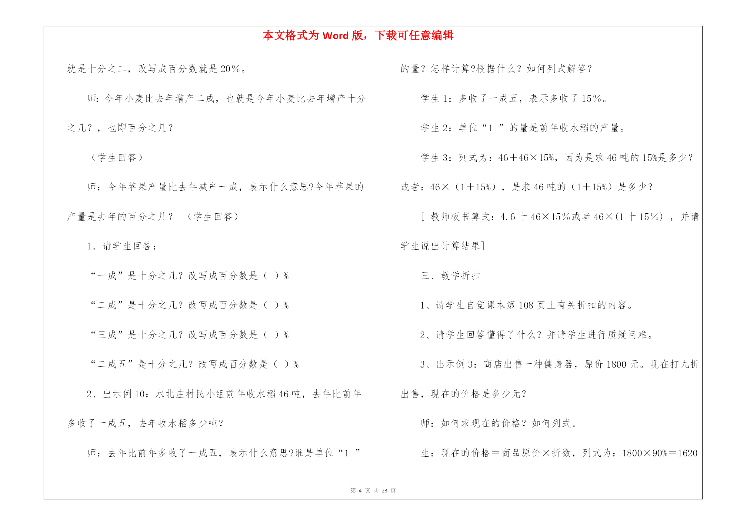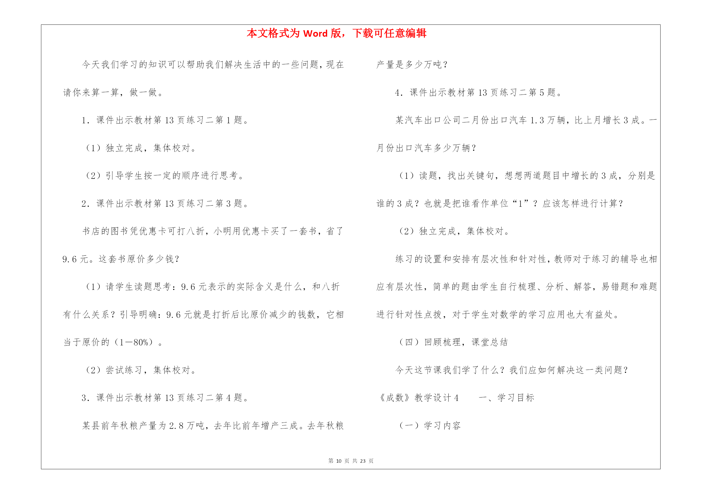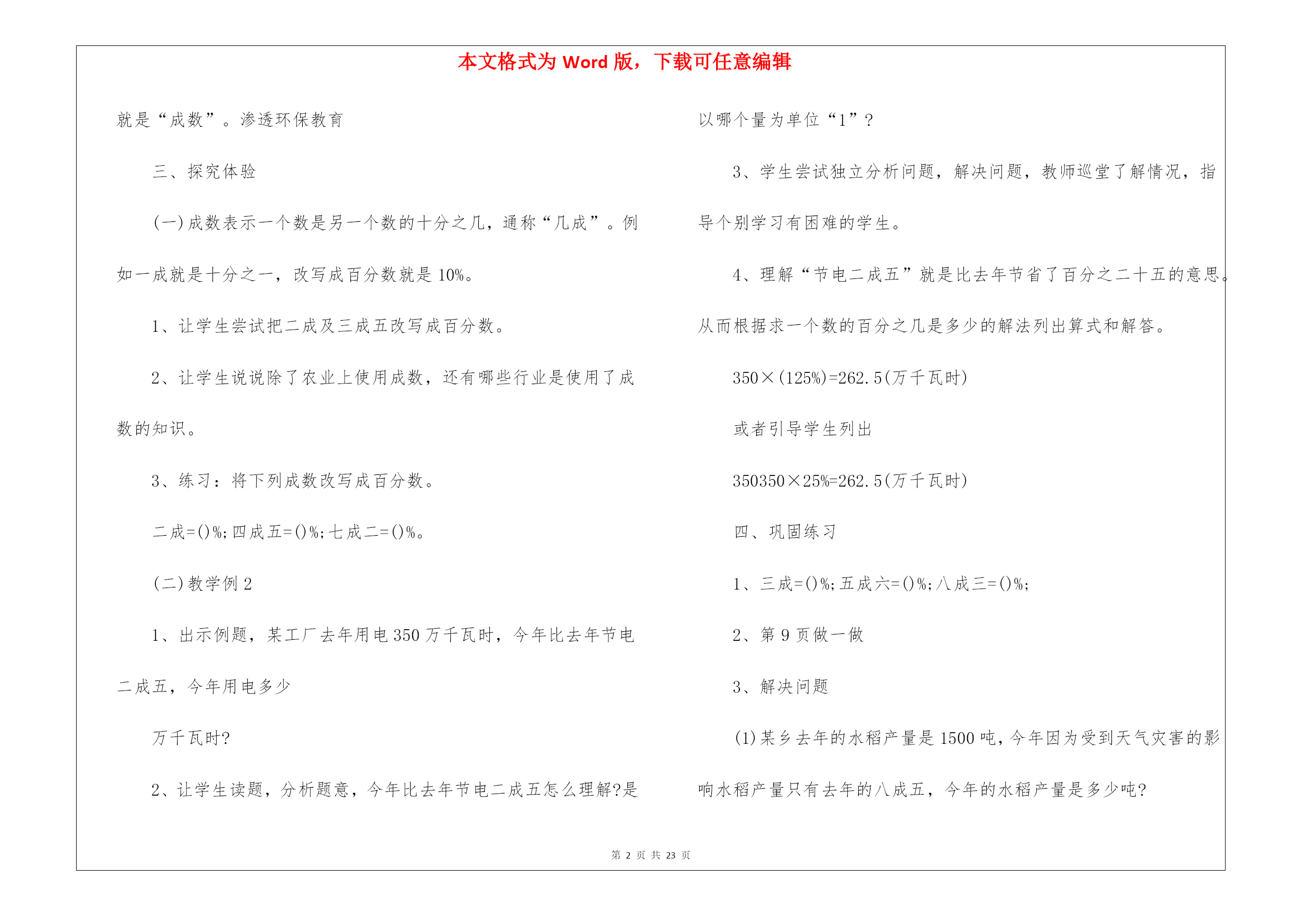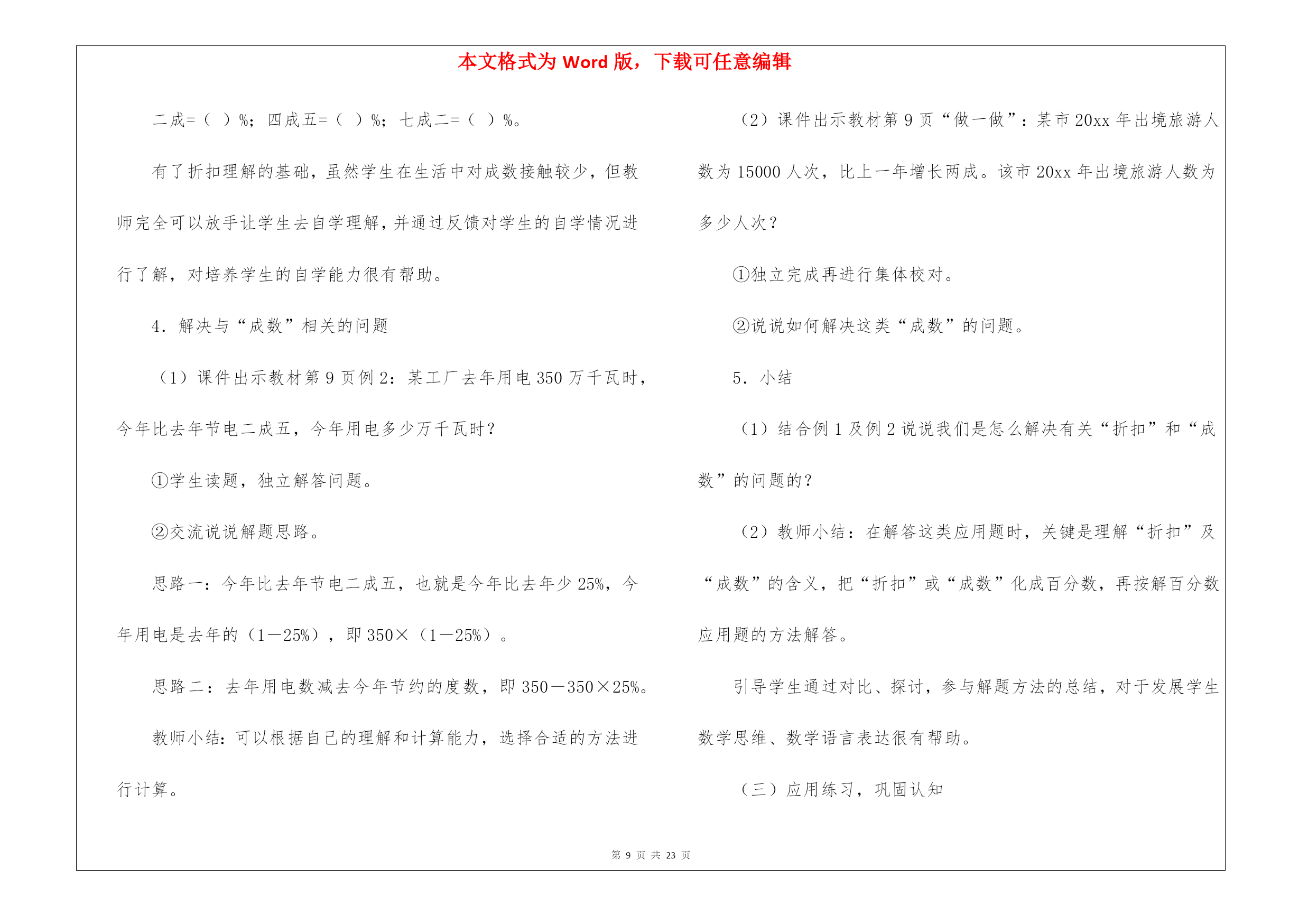本文格式为Word版,下载可任意编辑第PAGE\*MERGEFORMAT23页共NUMPAGES\*MERGEFORMAT23页《成数》教学设计《成数》教学设计作为一名专为他人授业解惑的人民教师,编写教学设计是必不可少的,借助教学设计可以更大幅度地提高学生各方面的能力,从而使学生获得良好的发展。我们该怎么去写教学设计呢?下面是我整理的《成数》教学设计,欢迎阅读与收藏。《成数》教学设计1教学目标:1、结合具体事物,经历认识“成数”,解答有关“成数”的实际问题的过程。2、对“成数”问题有好奇心,获得运用已有知识解决问题的成功体验。教学重点:理解“成数”的意义。教学难点:解决解答有关“成数”的实际问题。教学过程:一、复习1、填空①四折是十分之(),改写成百分数是()。②六折是十分之(),改写成百分数是()。③七五折是十分之(),改写成百分数是()。2、商店里花了56元钱买了一条牛仔裤,因为那儿的牛仔裤正在打七折销售,这条牛仔裤原价多少元?二、创设情境,导入新课同学们有听农民们说:“今年我家的稻谷比去年增产二成”,“我家的桂皮晒干后只有五成”等吗?他们说的是什么意思呢?原来商业上与百分数有关的术语是“折扣”,而农业上与百分数有关的术语就是“成数”。渗透环保教育三、探究体验(一)成数表示一个数是另一个数的十分之几,通称“几成”。例如一成就是十分之一,改写成百分数就是10%。1、让学生尝试把二成及三成五改写成百分数。2、让学生说说除了农业上使用成数,还有哪些行业是使用了成数的知识。3、练习:将下列成数改写成百分数。二成=()%;四成五=()%;七成二=()%。(二)教学例21、出示例题,某工厂去年用电350万千瓦时,今年比去年节电二成五,今年用电多少万千瓦时?2、让学生读题,分析题意,今年比去年节电二成五怎么理解?是以哪个量为单位“1”?3、学生尝试独立分析问题,解决问题,教师巡堂了解情况,指导个别学习有困难的学生。4、理解“节电二成五”就是比去年节省了百分之二十五的意思。从而根据求一个数的百分之几是多少的解法列出算式和解答。350×(125%)=262.5(万千瓦时)或者引导学生列出350350×25%=262.5(万千瓦时)四、巩固练习1、三成=()%;五成六=()%;八成三=()%;2、做一做3、解决问题(1)某乡去年的水稻产量是1500吨,今年因为受到天气灾害的影响水稻产量只有去年的八成五,今年的水稻产量是多少吨?(2)鼎湖山20xx年累计旅游人次是18万人次,20xx年累计旅游人次比20xx年增加一成五,20xx年累计旅游人次是多少?(出外玩要做好垃圾分类)(3)我校20xx年的在校生人数有820人,比20xx年在校生人数减少了二成,我校20xx年的在校生人数是多少?(4)某鞋厂20xx年的年产量为30万双,20xx年年产量比20xx年增加了一成六,20xx年年产量又比20xx年增加一成,这个鞋厂20xx年的年产量是多少万双?五、课堂总结这节课你收获了什么?《成数》教学设计2教学目标:1、理解成数的意义,知道它在实际生产生活中的简单应用,会进行一些简单计算。2、努力培养学生自主学习的能力,培养学生灵巧解题的能力,拓宽他们的视野。教学重点:成数的意义,并会进行一些简单计算。教学难点:成数的意义教学过程:一、引言:师:前面我们学习了百分数的一些应用,像计算发芽率,出勤率,成活率,还有计算储蓄的利息等。今天我们来学习“成数”。(板书课题;成数)二、教学成数师:成数常常用来说明农业的收成,比如说今年的小麦比去上增产二成,苹果比去上减产一成,这“二成”和“一成”是用来说明收成情况的。“一成”就是十分之一,改写成百分数就是10%;“二成”就是十分之二,改写成百分数就是20%。师:今年小麦比去年增产二成,也就是今年小麦比去年增产十分之几?,也即百分之几?(学生回答)师:今年苹果产量比去年减产一成,表示什么意思?今年苹果的产量是去年的百分之几?(学生回答)1、请学生回答:“一成”是十分之几?改写成百分数是()%“二成”是十分之几?改写成百分数是()%“三成”是十分之几?改写成百分数是()%“二成五”是十分之几?改写成百分数是()%2、出示例10:水北庄村民小组前年收水稻46吨,去年比前年多收了一成五,去年收水稻多少吨?师:去年比前年多收了一成五,表示什么意思?谁是单位“1”的量?怎样计算?根据什么?如何列式解答?学生1:多收了一成五,表示多收了15%。学生2:单位“1”的量是前年收水稻的产量。学生3:列式为:46+46×15%,因为是求46吨的15%是多少?或者:46×(1+15%),是求46吨的(1+15%)是多少?[教师板书算式:4.6十46×15%或者46×(1十15%),并请学生说出计算结果]三、教学折扣1、请学生自