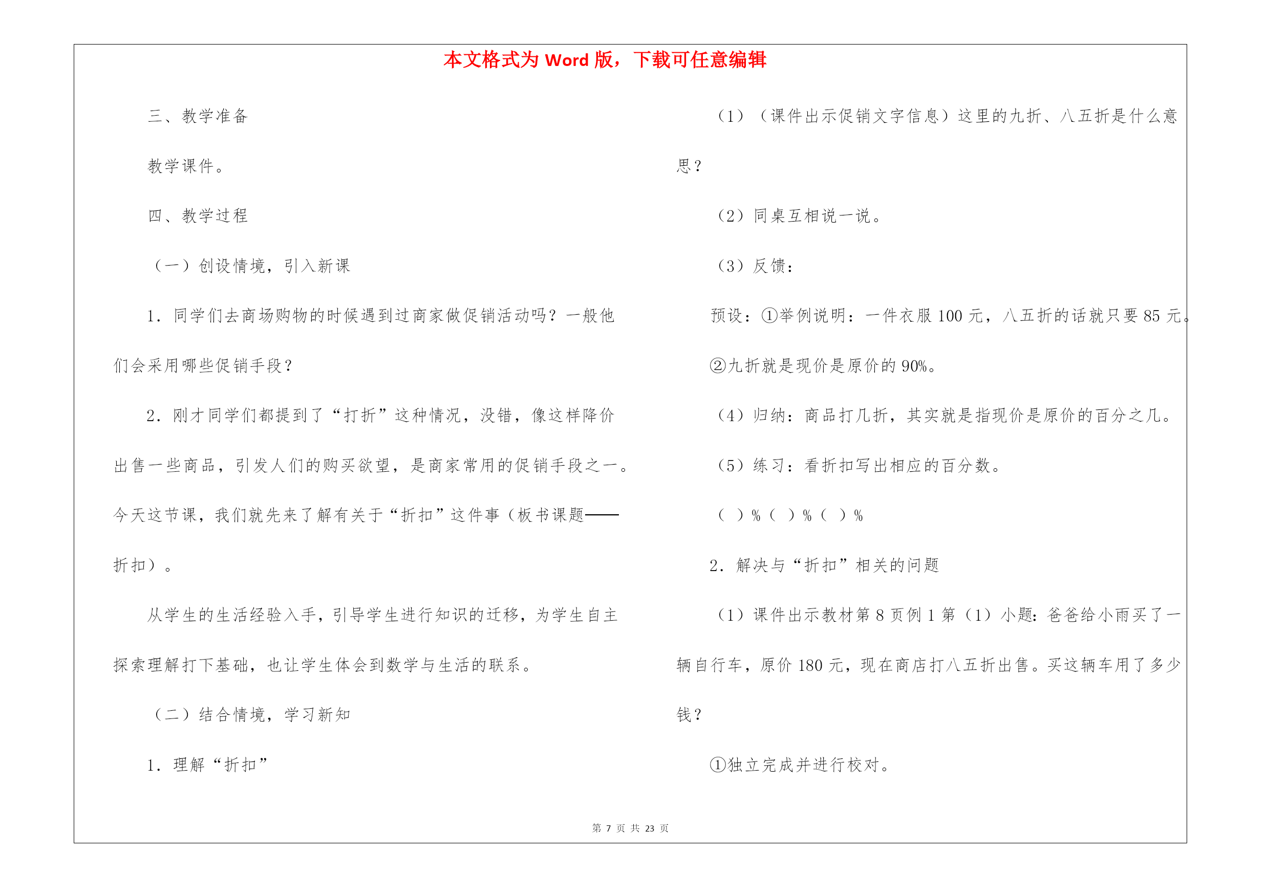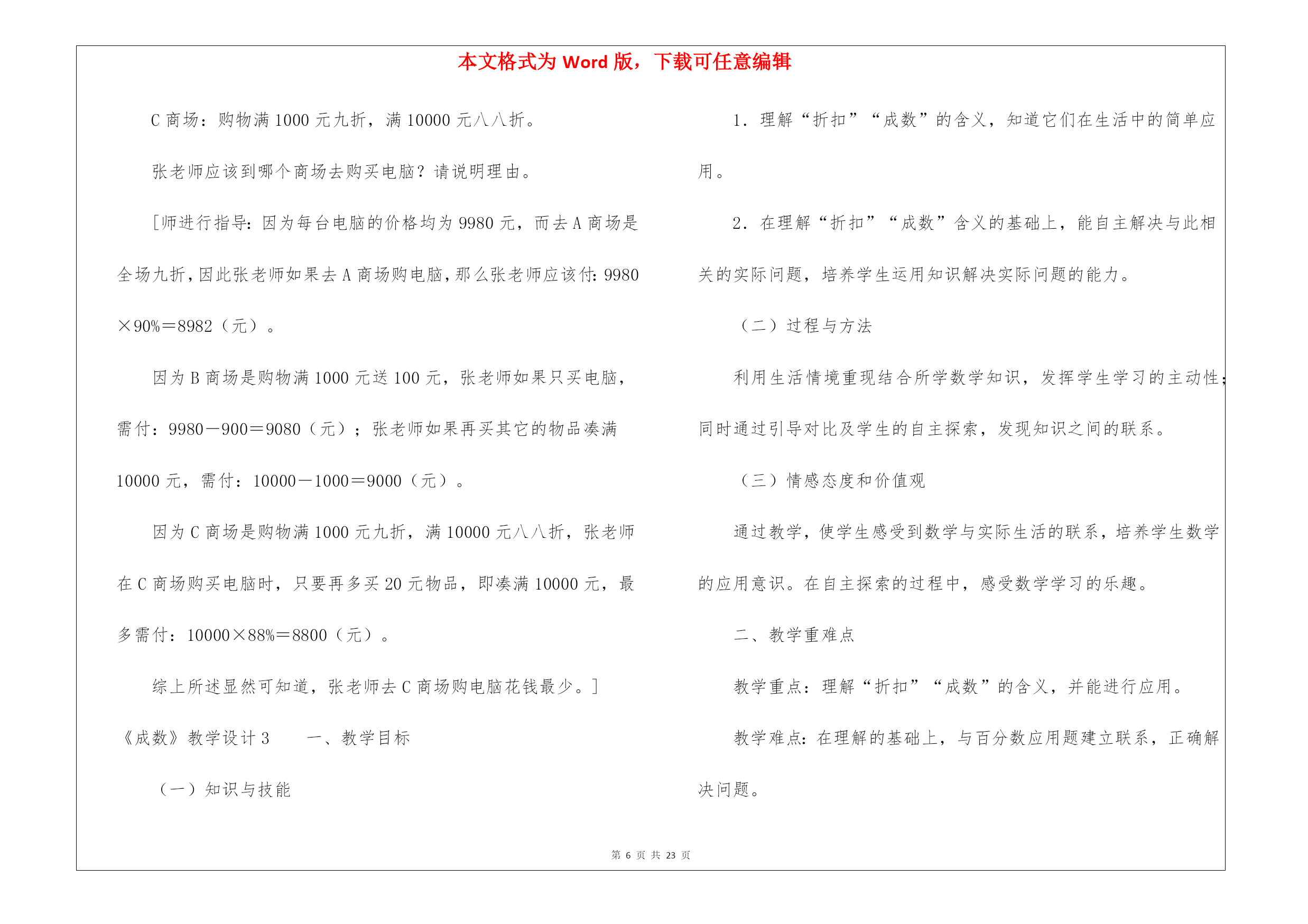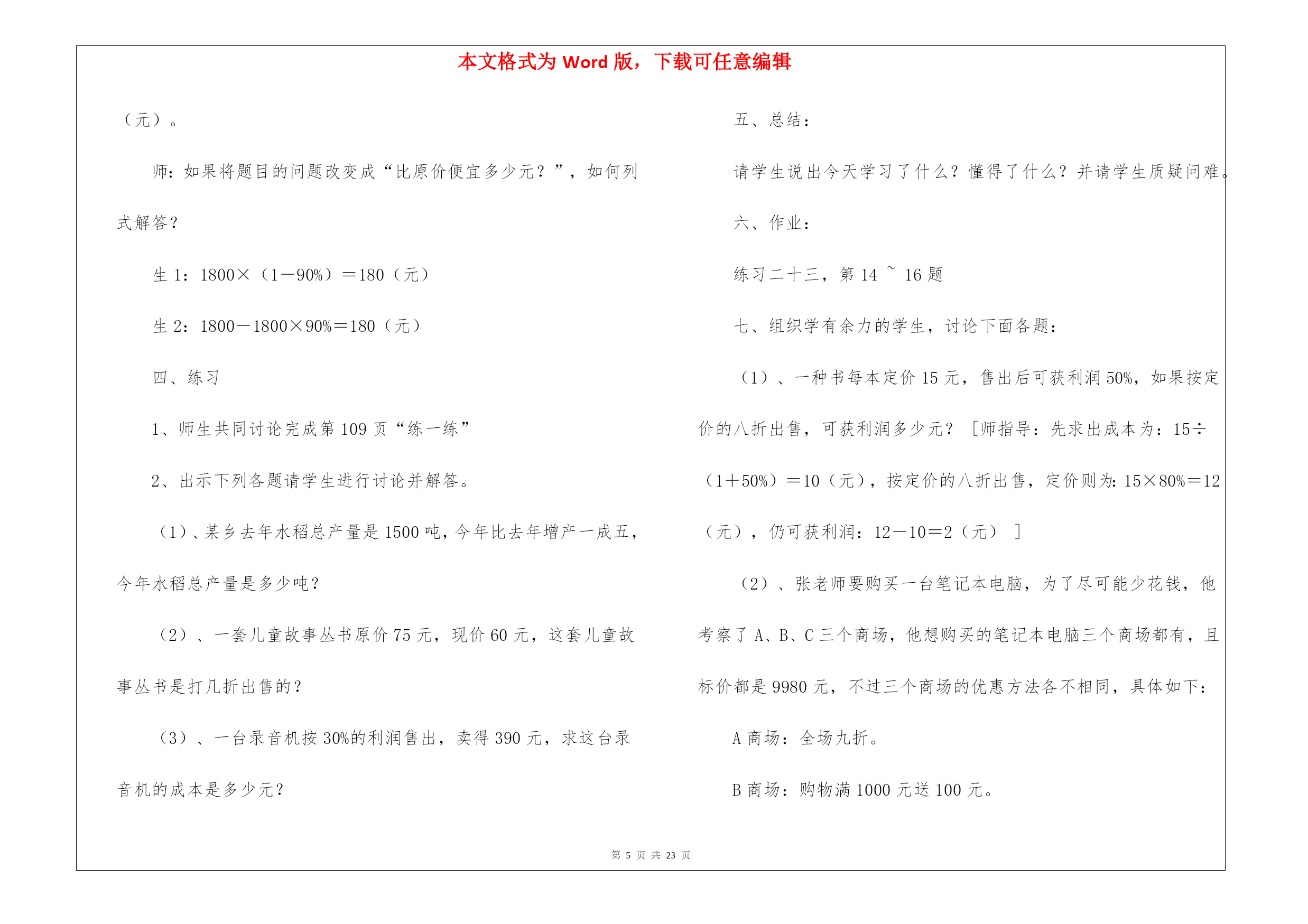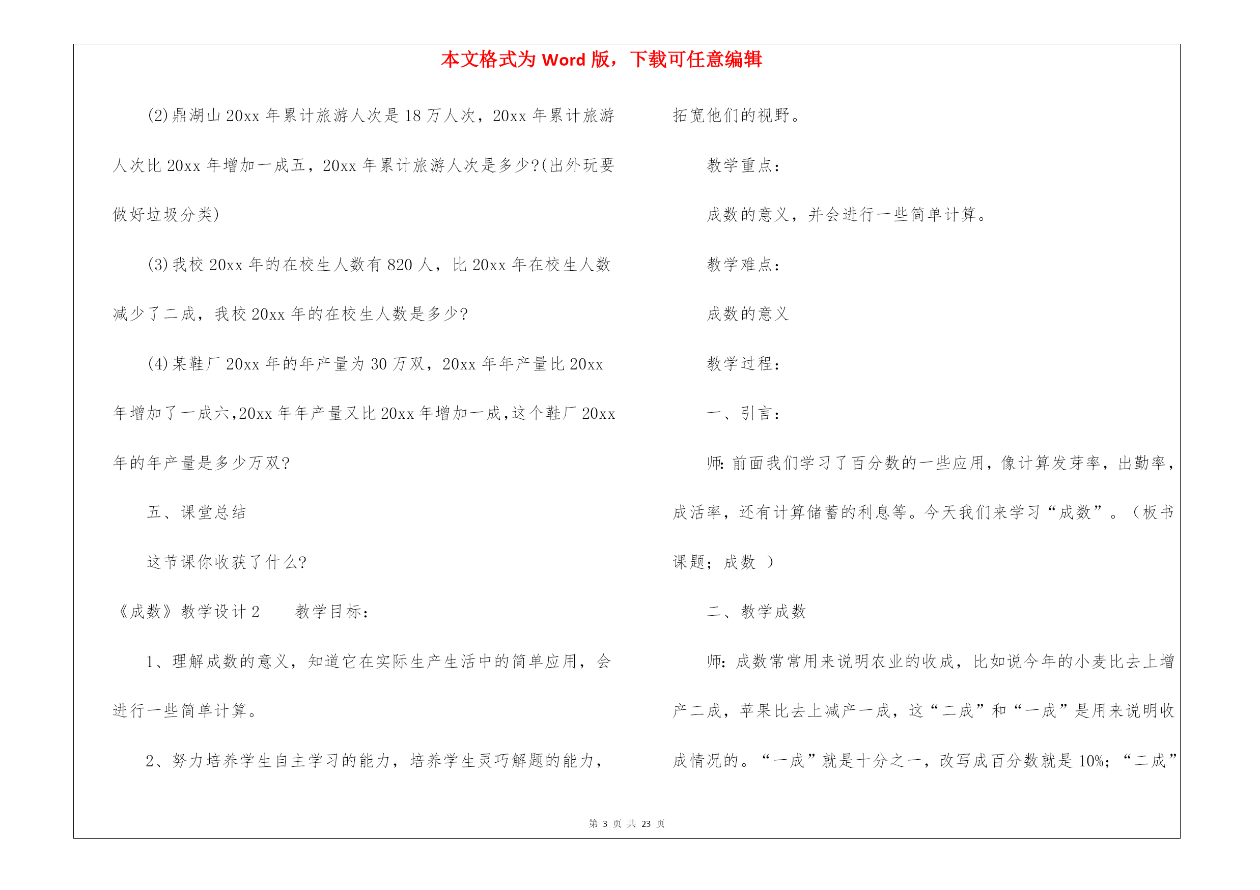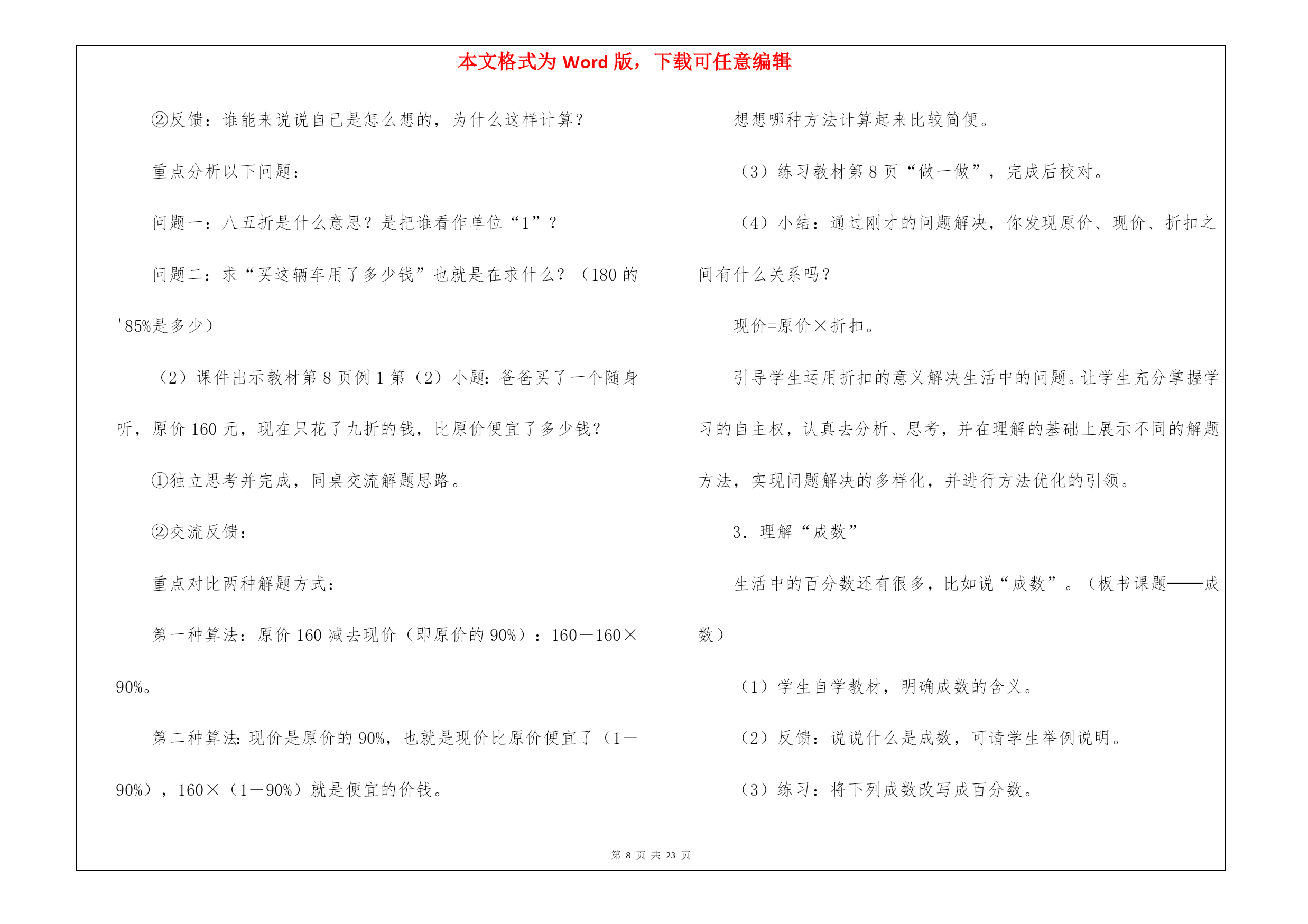 本文格式为Word版,下载可任意编辑第PAGE\*MERGEFORMAT23页共NUMPAGES\*MERGEFORMAT23页《成数》教学设计《成数》教学设计作为一名专为他人授业解惑的人民教师,编写教学设计是必不可少的,借助教学设计可以更大幅度地提高学生各方面的能力,从而使学生获得良好的发展。我们该怎么去写教学设计呢?下面是我整理的《成数》教学设计,欢迎阅读与收藏。《成数》教学设计1教学目标:1、结合具体事物,经历认识“成数”,解答有关“成数”的实际问题的过程。2、对“成数”问题有好奇心,获得运用已有知识解决问题的成功体验。教学重点:理解“成数”的意义。教学难点:解决解答有关“成数”的实际问题。教学过程:一、复习1、填空①四折是十分之(),改写成百分数是()。②六折是十分之(),改写成百分数是()。③七五折是十分之(),改写成百分数是()。2、商店里花了56元钱买了一条牛仔裤,因为那儿的牛仔裤正在打七折销售,这条牛仔裤原价多少元?二、创设情境,导入新课同学们有听农民们说:“今年我家的稻谷比去年增产二成”,“我家的桂皮晒干后只有五成”等吗?他们说的是什么意思呢?原来商业上与百分数有关的术语是“折扣”,而农业上与百分数有关的术语就是“成数”。渗透环保教育三、探究体验(一)成数表示一个数是另一个数的十分之几,通称“几成”。例如一成就是十分之一,改写成百分数就是10%。1、让学生尝试把二成及三成五改写成百分数。2、让学生说说除了农业上使用成数,还有哪些行业是使用了成数的知识。3、练习:将下列成数改写成百分数。二成=()%;四成五=()%;七成二=()%。(二)教学例21、出示例题,某工厂去年用电350万千瓦时,今年比去年节电二成五,今年用电多少万千瓦时?2、让学生读题,分析题意,今年比去年节电二成五怎么理解?是以哪个量为单位“1”?3、学生尝试独立分析问题,解决问题,教师巡堂了解情况,指导个别学习有困难的学生。4、理解“节电二成五”就是比去年节省了百分之二十五的意思。从而根据求一个数的百分之几是多少的解法列出算式和解答。350×(125%)=262.5(万千瓦时)或者引导学生列出350350×25%=262.5(万千瓦时)四、巩固练习1、三成=()%;五成六=()%;八成三=()%;2、做一做3、解决问题(1)某乡去年的水稻产量是1500吨,今年因为受到天气灾害的影响水稻产量只有去年的八成五,今年的水稻产量是多少吨?(2)鼎湖山20xx年累计旅游人次是18万人次,20xx年累计旅游人次比20xx年增加一成五,20xx年累计旅游人次是多少?(出外玩要做好垃圾分类)(3)我校20xx年的在校生人数有820人,比20xx年在校生人数减少了二成,我校20xx年的在校生人数是多少?(4)某鞋厂20xx年的年产量为30万双,20xx年年产量比20xx年增加了一成六,20xx年年产量又比20xx年增加一成,这个鞋厂20xx年的年产量是多少万双?五、课堂总结这节课你收获了什么?《成数》教学设计2教学目标:1、理解成数的意义,知道它在实际生产生活中的简单应用,会进行一些简单计算。2、努力培养学生自主学习的能力,培养学生灵巧解题的能力,拓宽他们的视野。教学重点:成数的意义,并会进行一些简单计算。教学难点:成数的意义教学过程:一、引言:师:前面我们学习了百分数的一些应用,像计算发芽率,出勤率,成活率,还有计算储蓄的利息等。今天我们来学习“成数”。(板书课题;成数)二、教学成数师:成数常常用来说明农业的收成,比如说今年的小麦比去上增产二成,苹果比去上减产一成,这“二成”和“一成”是用来说明收成情况的。“一成”就是十分之一,改写成百分数就是10%;“二成”就是十分之二,改写成百分数就是20%。师:今年小麦比去年增产二成,也就是今年小麦比去年增产十分之几?,也即百分之几?(学生回答)师:今年苹果产量比去年减产一成,表示什么意思?今年苹果的产量是去年的百分之几?(学生回答)1、请学生回答:“一成”是十分之几?改写成百分数是()%“二成”是十分之几?改写成百分数是()%“三成”是十分之几?改写成百分数是()%“二成五”是十分之几?改写成百分数是()%2、出示例10:水北庄村民小组前年收水稻46吨,去年比前年多收了一成五,去年收水稻多少吨?师:去年比前年多收了一成五,表示什么意思?谁是单位“1”的量?怎样计算?根据什么?如何列式解答?学生1:多收了一成五,表示多收了15%。学生2:单位“1”的量是前年收水稻的产量。学生3:列式为:46+46×15%,因为是求46吨的15%是多少?或者:46×(1+15%),是求46吨的(1+15%)是多少?[教师板书算式:4.6十46×15%或者46×(1十15%),并请学生说出计算结果]三、教学折扣1、请学生自