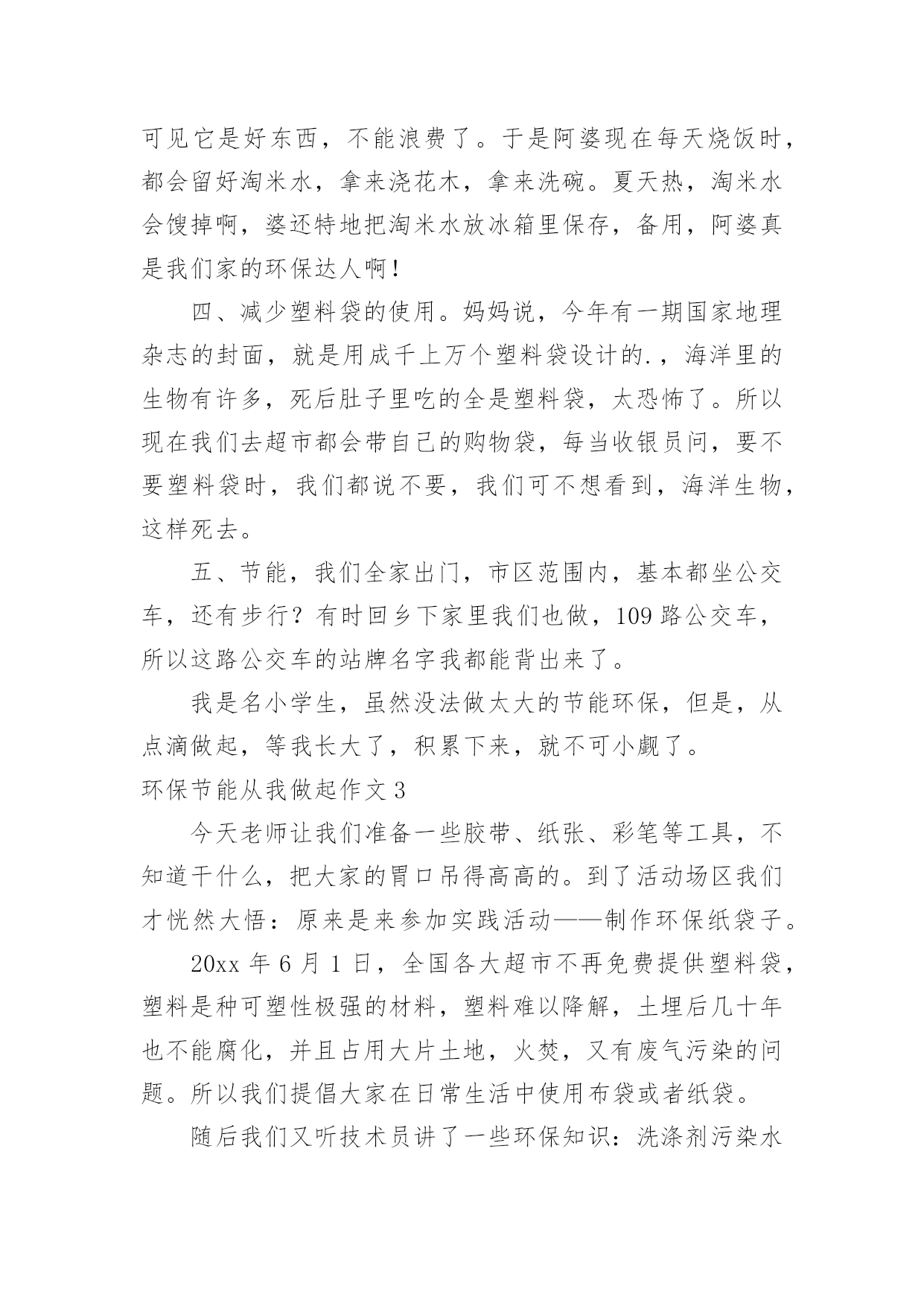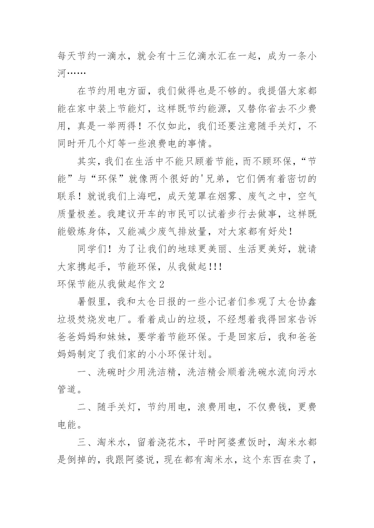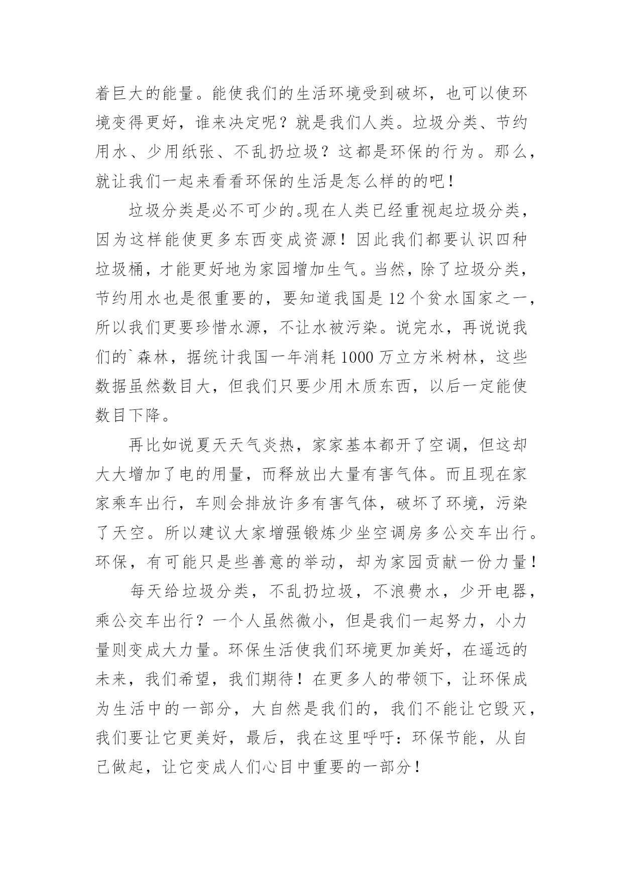 环保节能从我做起作文环保节能从我做起作文在平平淡淡的日常中,大家一定都接触过作文吧,写作文可以锻炼我们的独处习惯,让自己的心静下来,思考自己未来的方向。那么一般作文是怎么写的呢?以下是小编精心整理的环保节能从我做起作文,仅供参考,大家一起来看看吧。环保节能从我做起作文1地球上的资源是有限的,所以我们现在提倡建立节约型社会。我国是一个高耗能、高污染、粗放型发展社会。据有关资料显示,我国每年都要采原煤二十几亿吨,除百姓取暖、煮饭之用外,大部分用在火力发电和城市取暖上,不但使用率低,而且造成运力紧张。特别是今年南方大部分地区遇到雪灾,使以煤炭发电为主力军的电力网频频告急。现在,我们国家有些地区经常出现缺水、缺电、缺煤“三缺”的情况。所以,我们一定要节能。“节能”,顾名思义,就是要节约能源,说到节约能源,我可是有很多妙招哦!首先我们来谈谈怎样节约用水。我们中国江河湖海多得是,可是,能用的淡水却少得可怜,这就告诉我们,要懂得每一滴水的来之不易。在淘完米后,留下的淘米水可以用来浇花;洗衣服剩下的水可以用来拖地;在洗澡时,最好选择淋浴的方式,在擦肥皂时,就可以将水关小,或者关掉。如果每人每天节约一滴水,就会有十三亿滴水汇在一起,成为一条小河……在节约用电方面,我们做得也是不够的。我提倡大家都能在家中装上节能灯,这样既节约能源,又替你省去不少费用,真是一举两得!不仅如此,我们还要注意随手关灯,不同时开几个灯等一些浪费电的事情。其实,我们在生活中不能只顾着节能,而不顾环保,“节能”与“环保”就像两个很好的'兄弟,它们俩有着密切的联系!就说我们上海吧,成天笼罩在烟雾、废气之中,空气质量极差。我建议开车的市民可以试着步行去做事,这样既能锻炼身体,又能减少废气排放量,对大家都有好处!同学们!为了让我们的地球更美丽、生活更美好,就请大家携起手,节能环保,从我做起!!!环保节能从我做起作文2暑假里,我和太仓日报的一些小记者们参观了太仓协鑫垃圾焚烧发电厂。看着成山的垃圾,不经想着我得回家告诉爸爸妈妈和妹妹,要学着节能环保。于是回家后,我和爸爸妈妈制定了我们家的小小环保计划。一、洗碗时少用洗洁精,洗洁精会顺着洗碗水流向污水管道。二、随手关灯,节约用电,浪费用电,不仅费钱,更费电能。三、淘米水,留着浇花木,平时阿婆煮饭时,淘米水都是倒掉的,我跟阿婆说,现在都有淘米水,这个东西在卖了,可见它是好东西,不能浪费了。于是阿婆现在每天烧饭时,都会留好淘米水,拿来浇花木,拿来洗碗。夏天热,淘米水会馊掉啊,婆还特地把淘米水放冰箱里保存,备用,阿婆真是我们家的环保达人啊!四、减少塑料袋的使用。妈妈说,今年有一期国家地理杂志的封面,就是用成千上万个塑料袋设计的.,海洋里的生物有许多,死后肚子里吃的全是塑料袋,太恐怖了。所以现在我们去超市都会带自己的购物袋,每当收银员问,要不要塑料袋时,我们都说不要,我们可不想看到,海洋生物,这样死去。五、节能,我们全家出门,市区范围内,基本都坐公交车,还有步行?有时回乡下家里我们也做,109路公交车,所以这路公交车的站牌名字我都能背出来了。我是名小学生,虽然没法做太大的节能环保,但是,从点滴做起,等我长大了,积累下来,就不可小觑了。环保节能从我做起作文3今天老师让我们准备一些胶带、纸张、彩笔等工具,不知道干什么,把大家的胃口吊得高高的。到了活动场区我们才恍然大悟:原来是来参加实践活动——制作环保纸袋子。20xx年6月1日,全国各大超市不再免费提供塑料袋,塑料是种可塑性极强的材料,塑料难以降解,土埋后几十年也不能腐化,并且占用大片土地,火焚,又有废气污染的问题。所以我们提倡大家在日常生活中使用布袋或者纸袋。随后我们又听技术员讲了一些环保知识:洗涤剂污染水源,使得鱼虾丧失了它们赖以生存的家园;人们认为天然气太贵,就自己在路边烧煤,浓烟滚滚,熏得路人挡鼻捂嘴,同时对空气也大大不好。工业废水、废气乱放乱排污染水源,影响人类健康。地球是我们唯一而美丽的家园,人类不应为了贪图一时利益而忘了长久的.后果,地球是我们的,养育了我们,还给予了我们一切,我们也应该善待地球,还国民一个“干净”的地球。从小事做起,从我做起。我们国家虽然物产丰富,但却是有限的,不可以滥开发。我们的原始森林,在短短几十年中,减少了多少万亩?如今国家环保意识重了,环境好了,有了不少最佳人居城市,但仍有一些浪费资源,破坏环境得行为:用有毒化学杀虫剂,乱丢废旧电池,浪费水电,制造白色垃圾,乱砍乱划树木等……只有环境好才能算个好国家,小朋友你们说呢?环保节能从我做起作文4在爷爷奶奶那时,最节约;在爸爸妈妈那时,还行;可在现在就不行了。浪费,是最不节能环保的了,有的人用电水壶烧水,一忘记在烧水,水就没多少了,电也用了好多,再比如:空调、电扇、电视、电都开着,但没有人;大街小巷上,这边霓虹灯,