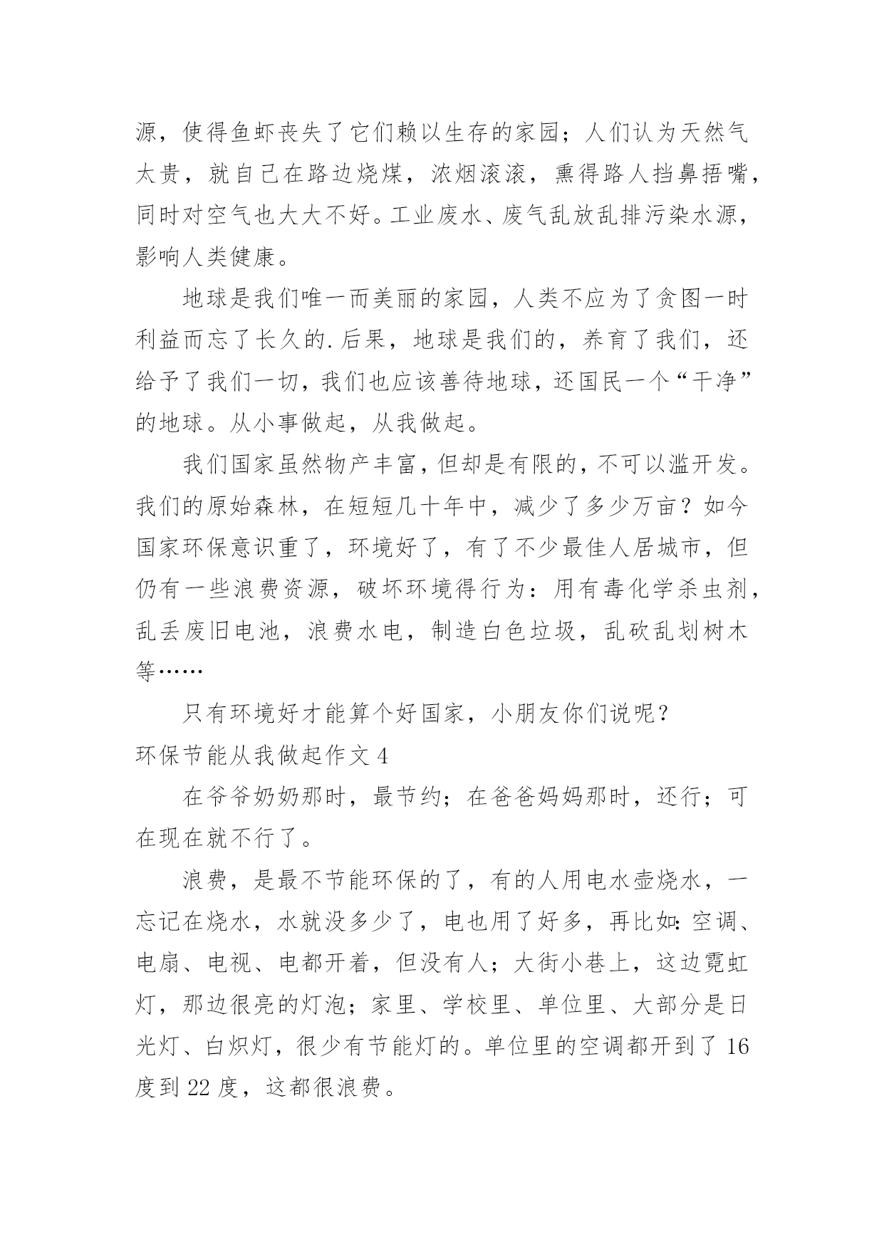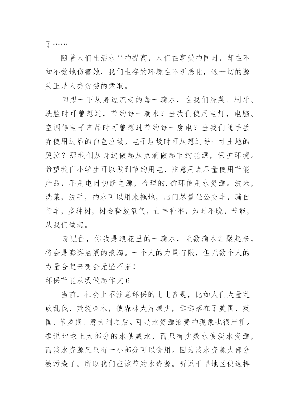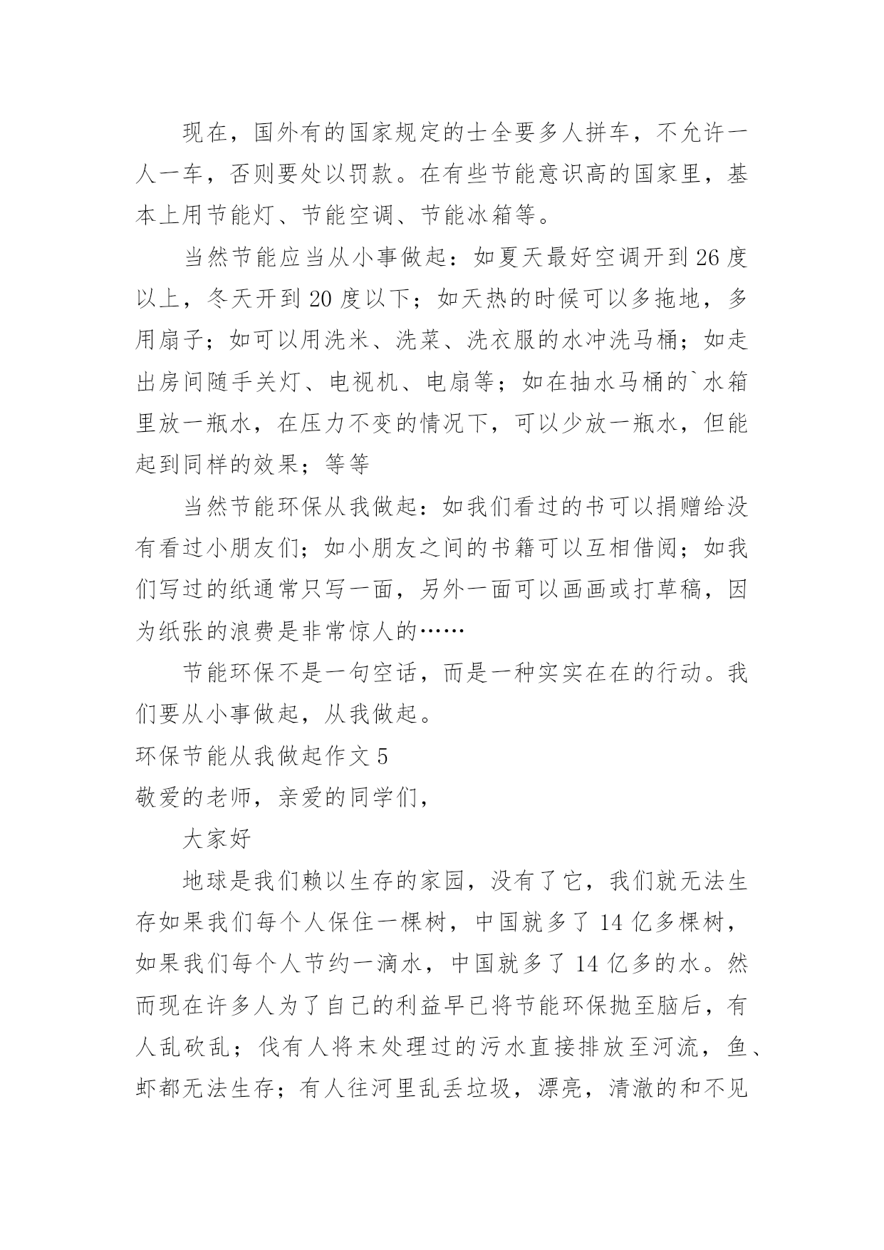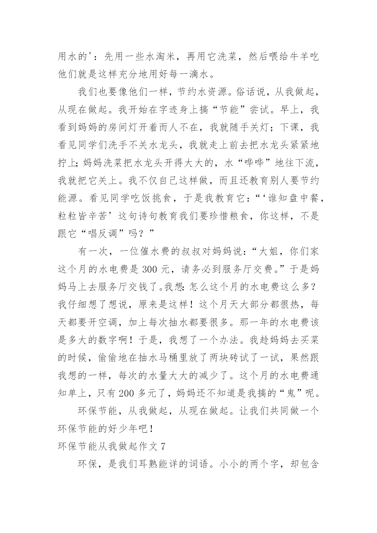 环保节能从我做起作文环保节能从我做起作文在平平淡淡的日常中,大家一定都接触过作文吧,写作文可以锻炼我们的独处习惯,让自己的心静下来,思考自己未来的方向。那么一般作文是怎么写的呢?以下是小编精心整理的环保节能从我做起作文,仅供参考,大家一起来看看吧。环保节能从我做起作文1地球上的资源是有限的,所以我们现在提倡建立节约型社会。我国是一个高耗能、高污染、粗放型发展社会。据有关资料显示,我国每年都要采原煤二十几亿吨,除百姓取暖、煮饭之用外,大部分用在火力发电和城市取暖上,不但使用率低,而且造成运力紧张。特别是今年南方大部分地区遇到雪灾,使以煤炭发电为主力军的电力网频频告急。现在,我们国家有些地区经常出现缺水、缺电、缺煤“三缺”的情况。所以,我们一定要节能。“节能”,顾名思义,就是要节约能源,说到节约能源,我可是有很多妙招哦!首先我们来谈谈怎样节约用水。我们中国江河湖海多得是,可是,能用的淡水却少得可怜,这就告诉我们,要懂得每一滴水的来之不易。在淘完米后,留下的淘米水可以用来浇花;洗衣服剩下的水可以用来拖地;在洗澡时,最好选择淋浴的方式,在擦肥皂时,就可以将水关小,或者关掉。如果每人每天节约一滴水,就会有十三亿滴水汇在一起,成为一条小河……在节约用电方面,我们做得也是不够的。我提倡大家都能在家中装上节能灯,这样既节约能源,又替你省去不少费用,真是一举两得!不仅如此,我们还要注意随手关灯,不同时开几个灯等一些浪费电的事情。其实,我们在生活中不能只顾着节能,而不顾环保,“节能”与“环保”就像两个很好的'兄弟,它们俩有着密切的联系!就说我们上海吧,成天笼罩在烟雾、废气之中,空气质量极差。我建议开车的市民可以试着步行去做事,这样既能锻炼身体,又能减少废气排放量,对大家都有好处!同学们!为了让我们的地球更美丽、生活更美好,就请大家携起手,节能环保,从我做起!!!环保节能从我做起作文2暑假里,我和太仓日报的一些小记者们参观了太仓协鑫垃圾焚烧发电厂。看着成山的垃圾,不经想着我得回家告诉爸爸妈妈和妹妹,要学着节能环保。于是回家后,我和爸爸妈妈制定了我们家的小小环保计划。一、洗碗时少用洗洁精,洗洁精会顺着洗碗水流向污水管道。二、随手关灯,节约用电,浪费用电,不仅费钱,更费电能。三、淘米水,留着浇花木,平时阿婆煮饭时,淘米水都是倒掉的,我跟阿婆说,现在都有淘米水,这个东西在卖了,可见它是好东西,不能浪费了。于是阿婆现在每天烧饭时,都会留好淘米水,拿来浇花木,拿来洗碗。夏天热,淘米水会馊掉啊,婆还特地把淘米水放冰箱里保存,备用,阿婆真是我们家的环保达人啊!四、减少塑料袋的使用。妈妈说,今年有一期国家地理杂志的封面,就是用成千上万个塑料袋设计的.,海洋里的生物有许多,死后肚子里吃的全是塑料袋,太恐怖了。所以现在我们去超市都会带自己的购物袋,每当收银员问,要不要塑料袋时,我们都说不要,我们可不想看到,海洋生物,这样死去。五、节能,我们全家出门,市区范围内,基本都坐公交车,还有步行?有时回乡下家里我们也做,109路公交车,所以这路公交车的站牌名字我都能背出来了。我是名小学生,虽然没法做太大的节能环保,但是,从点滴做起,等我长大了,积累下来,就不可小觑了。环保节能从我做起作文3今天老师让我们准备一些胶带、纸张、彩笔等工具,不知道干什么,把大家的胃口吊得高高的。到了活动场区我们才恍然大悟:原来是来参加实践活动——制作环保纸袋子。20xx年6月1日,全国各大超市不再免费提供塑料袋,塑料是种可塑性极强的材料,塑料难以降解,土埋后几十年也不能腐化,并且占用大片土地,火焚,又有废气污染的问题。所以我们提倡大家在日常生活中使用布袋或者纸袋。随后我们又听技术员讲了一些环保知识:洗涤剂污染水源,使得鱼虾丧失了它们赖以生存的家园;人们认为天然气太贵,就自己在路边烧煤,浓烟滚滚,熏得路人挡鼻捂嘴,同时对空气也大大不好。工业废水、废气乱放乱排污染水源,影响人类健康。地球是我们唯一而美丽的家园,人类不应为了贪图一时利益而忘了长久的.后果,地球是我们的,养育了我们,还给予了我们一切,我们也应该善待地球,还国民一个“干净”的地球。从小事做起,从我做起。我们国家虽然物产丰富,但却是有限的,不可以滥开发。我们的原始森林,在短短几十年中,减少了多少万亩?如今国家环保意识重了,环境好了,有了不少最佳人居城市,但仍有一些浪费资源,破坏环境得行为:用有毒化学杀虫剂,乱丢废旧电池,浪费水电,制造白色垃圾,乱砍乱划树木等……只有环境好才能算个好国家,小朋友你们说呢?环保节能从我做起作文4在爷爷奶奶那时,最节约;在爸爸妈妈那时,还行;可在现在就不行了。浪费,是最不节能环保的了,有的人用电水壶烧水,一忘记在烧水,水就没多少了,电也用了好多,再比如:空调、电扇、电视、电都开着,但没有人;大街小巷上,这边霓虹灯,