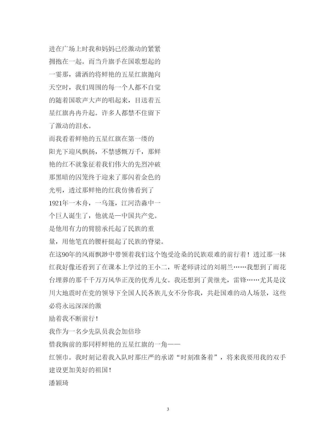 此资料由网络收集而来,如有侵权请告知上传者立即删除。资料共分享,我们负责传递知识。PAGEPAGE4观升国旗观后感篇一:升旗仪式感想升旗活动感想这是到大学以来第一次参加升国旗的活动,我内心激动万分。虽然早上有瑟瑟寒风,但依然抑制不住激动的心情。升国旗是件很严肃的事情,看着那慢慢升起的五星红旗,心里总是有一种难以用言语形容的澎湃感。雄壮的国歌,神圣的国旗,唤起我心中无比的骄傲和自豪。还记得昨晚班长告诉了我升旗的事情,说实话,我很激动。为什么?因为我能够再次站在国旗下感受那份庄严,那份自豪!我们今天能够在这里举行升旗仪式,这是多少革命先烈用自己的鲜血用自己的生命换来的啊,我们的国旗正是用他们的热血染红的呀!尽管仪式是那样简单,但意义深远。我相信,我们在场的每一个人,都深深体会到了那与众不同的心动时刻,感受到了那鼓舞人心的振奋。每次升旗仪式都是一次生动的爱国主义教育,这次也不例外,从某种意义上来说更具特殊意义,因为这次活动是我们刚刚步入大学的第一次升旗仪式,所以在我心中显得更加庄严神圣。望着鲜艳的五星红旗,心中异常激动。国旗是国家的象征,社会在发展,祖国在腾飞,惟有强大才能不受欺,想到这,自豪之感油然而生。作为大学生更要不忘历史,珍惜现在,踏实学习。终于听到了他们的脚步声,齐刷刷的队伍,齐刷刷的眼睛。随着我们嘹亮的国歌响起,国旗迎着朝阳冉冉升起,我心中油然而生一种莫明的感动。那一刻的庄严肃穆,那一刻的骄傲与自豪,是不言而喻的。歌声里满含着我们每一个人对祖国的热爱、对国旗的尊重。冉冉升起的五星红旗,象征我们的国家日益繁荣昌盛,提醒我们国家利益高于一切,告诫我们时刻都要忠于祖国、忠于人民。愿五星红旗在岁月的长河中永远飘扬。我深情地注视那抹永恒的红色,刹那间染红了祖国的天空,也染红了我的一颗中国心。每一次抬头仰望迎风招展的五星红旗,就有一股无形的力量在激励着我。像歌里唱到的那样,中华民族到了最危急的时刻,我们全民抗争才得来今天的幸福生活。在枪林弹雨的战争年代,我们的民族能在艰难中前进,在和平发展的当今世界,我们的民族更是日趋强大,而作为中华民族子孙后代的我们更有一种在挫折中崛起的奋斗精神。尽管仪式是那样简单,但意义深远。我相信,在场的每一个人,都深深体会到了那与众不同的心动时刻,感受到了那鼓舞人心的振奋。不管我们离祖国的心脏有多么遥远,但那腔爱国的热血同样是沸腾的,那份爱国之情同样是真挚的。现在的祖国虽已飞在了世界的前列,但我们应该让这双腾飞的翅膀变得更强劲有力,这是我们新时代大学生的责任与义务,让我们共同努力,为祖国的明天而奋斗。国运昌盛,国旗飘扬,同心协力,看我民族豪迈屹立在东方!篇二:观升旗观后感升国旗时间以北京照进第一缕阳光的时间为准,所以每天早上升国旗的时间也尽不相同,于是头天晚上爸爸便从网上查询升旗时间为5:19分。第二天凌晨四点,我们全家便起床了,收拾完毕便飞奔下楼,乘坐出租车直驶天安门广场。来到天安门前,广场上已是人山人海、人头攒动,司机师傅把车停在离升旗广场最近的地方,到了观景台这时我尽力掂起脚尖,终于看到了天安门上升期的第一幕,我特别激动!!升旗仪仗队护旗队出场了,他们穿着统一的服装,迈着整齐的步伐,从天安门中央金水桥走了过来,那飒爽英姿令全场人惊叹不已。走到升旗台前,两名护旗手从其余护旗队员手中接过国旗,然后庄严地捧上升旗台。这时奏起国歌,全场观众安静下来,嘴里不由自主地唱起国歌,行着注目礼,目送国旗冉冉升起。篇三:观北京天安门升国旗有感观北京天安门有感每次听到雄壮激扬的国歌声,我都禁不住想起那个寒冷的早上我和妈妈来到天安门看国旗班的战士升旗时的场景。当看到年轻的战士们踏着威武整齐的步伐,挺着矫健的身躯,仪态庄严的行进在广场上时我和妈妈已经激动的紧紧拥抱在一起。而当升旗手在国歌想起的一霎那,潇洒的将鲜艳的五星红旗抛向天空时,我们周围的每一个人都不自觉的随着国歌声大声的唱起来,目送着五星红旗冉冉升起。许多人都禁不住留下了激动的泪水。而我看着鲜艳的五星红旗在第一缕的阳光下迎风飘扬,不禁感慨万千,那鲜艳的红不就象征着我们伟大的先烈冲破那黑暗的囚笼终于迎来了那闪着金色的光明,透过那鲜艳的红我仿佛看到了1921年一木舟,一乌篷,江河浩淼中一个巨人诞生了,他就是—中国共产党。是他用有力的臂膀承托起了民族的重量,用他笔直的腰杆挺起了民族的脊梁。在这90年的风雨飘渺中带领着我们这个饱受沧桑的民族艰难的前行着!透过那一抹红我好像还看到了在课本上学过的王小二,听老师讲过的刘胡兰……我想到了雨花台埋葬的那千千万万风华正茂的优秀儿女。我还想到了黄继光,雷锋……尤其是汶川大地震时在党的领导下全国人民各族儿女不分你我,共赴国难的动人场景,这些必将永远深深的