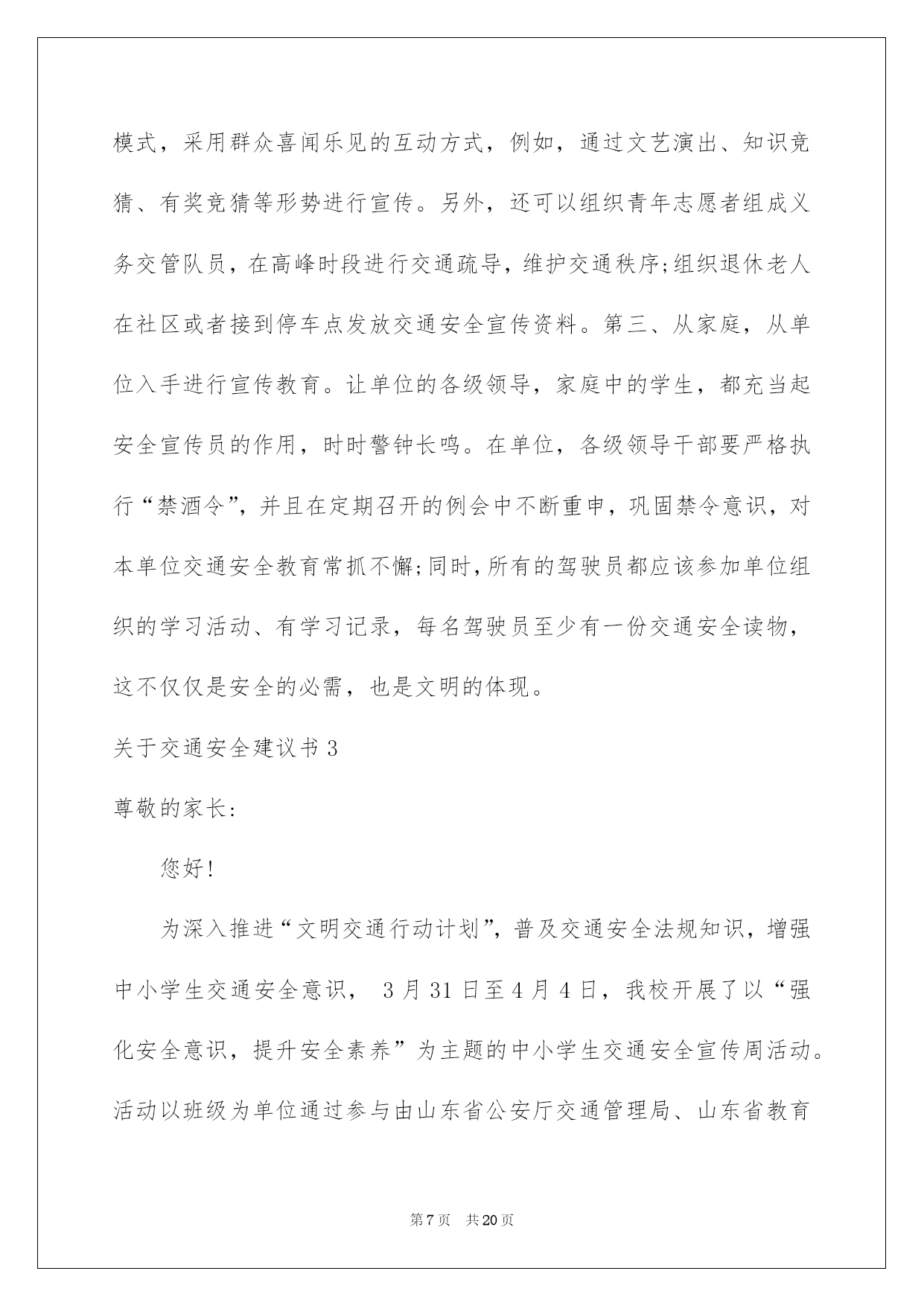 第PAGE\*Arabic\*MERGEFORMAT20页共NUMPAGES\*Arabic\*MERGEFORMAT20页第PAGE\*MERGEFORMAT20页共NUMPAGES\*MERGEFORMAT20页第PAGE\*MERGEFORMAT20页共NUMPAGES\*MERGEFORMAT20页第PAGE\*MERGEFORMAT20页共NUMPAGES\*MERGEFORMAT20页第PAGE\*MERGEFORMAT20页共NUMPAGES\*MERGEFORMAT20页第PAGE\*MERGEFORMAT20页共NUMPAGES\*MERGEFORMAT20页第PAGE\*MERGEFORMAT20页共NUMPAGES\*MERGEFORMAT20页第PAGE\*MERGEFORMAT20页共NUMPAGES\*MERGEFORMAT20页第PAGE\*MERGEFORMAT20页共NUMPAGES\*MERGEFORMAT20页第PAGE\*MERGEFORMAT20页共NUMPAGES\*MERGEFORMAT20页第PAGE\*MERGEFORMAT20页共NUMPAGES\*MERGEFORMAT20页2022关于交通安全建议书关于交通安全建议书现如今,建议书使用的情况越来越多,建议书是就某项工作提出某种建议时使用的一种常用书信,也叫意见书。怎么写建议书才能避免踩雷呢?下面是我收集整理的关于交通安全建议书,欢迎大家借鉴与参考,希望对大家有所帮助。关于交通安全建议书1随着社会的发展,交通日益繁忙,交通安全是现代社会不容忽视的问题。交通事故伤亡人数触目惊心,“车祸猛于虎”,也许一次交通事故就会造成终生遗憾。拥有安全、文明、畅通的交通环境是人人梦寐以求的,但是畅通交通,必须从我们每一个人做起。在我们现实生活中,随意可见的是行人横穿马路,大摇大摆的对红绿灯视而不见,或司机酒后驾驶,不遵守路面交通安全,造成一幕幕触目惊心的交通事故,一则则报纸上新闻上的交通事故,一个个家庭的破碎,依然不能引起我们足够的警觉与重视,大多数人为了图方便就横穿马路,时常抱着一种侥幸心理,认为自己不会那么倒霉,这是一种可怕的心理行为,关键在我们脑子中,根本就没有树立足够的交通安全意识。对安全不够重视,换而言之,就是对自己的生命不珍爱,这样的结果往往会让人后悔不已。而我们每一个人,我们不由的深思,我们是不是该做点什么,来使我们这个美丽的城市更加美好,真爱每一个生命。美好的人生从安全开始,只有保证了健康与安全,才能创造美好的未来,大家一定要培养文明交通意识,养成自觉遵守交通法规的良好习惯。那么,从今天起,就让我们与生命同行,与安全同行!在此,XX公司为增强员工的交通安全意识,拟开展“交通安全,百日行动”签名活动,并倡议如下:一、关爱生命,从遵守交通安全起。二、多等三分钟,不抢一秒钟。三、细读交通规则,遵守从自己先做起。四、牢记“三个安全”:安全走路,安全乘车,安全行车。五、注意加强宣传,在全公司内掀起遵守交通规则,真爱生命的风气。通过本次“关爱生命、文明出行”签名活动,让我们心中有交通安全的意识,关爱我们的生命,爱护我们的生活,营造我们的便利人生,是我们的宗旨与主张。让我们一起遵守交通规则。要从我做起,从今天做起。为了你我他的健康、家庭的幸福、社会的安定,让我们积极行动起来,尽自己的一份力,自觉遵守交通规则,珍惜彼此宝贵的生命,共同营造一个讲交通安全、守交通法规的良好氛围,一起走向更加美好的明天!关于交通安全建议书2据统计,20xx年全国共发生道路交通事故238351起,造成67759人死亡、275125人受伤,直接财产损失9.1亿元,虽然与前一年相比各项指标略有下降,但是,我们仍然会被交通事故吞噬的无数健康、生命与财富所震惊,进而感到惋惜。最近,杭州少年飙车案,南京6.30特大交通事故等还历历在目。另外,据苏州市110指挥中心最新统计,1月10目下午4点到1月11日下午4点,市区共发生各类事故1100多起。面对如此高发的交通事故,面对如此惨痛的教训,我作为一名人大代表,不得不呼吁这个社会需要提高全民素质,增强交通意识,加强交通安全管理。一要培养文明意识。道路交通事故不断发生,交通秩序不良,原因是多方面的,不可仅仅归咎于道路设施与车辆技术状况。统计数据表明,交通事故的发生90%以上责任在驾驶员与行人,交通不畅主要原因是由于乱停乱放、抢超强会与交通参与者随心所欲的交通行为的形成。减轻灾难,缓解混乱的交通秩序,公众的文明交通意识的养成就显得格外重要。由于陋习根深蒂固,文明交通风气的形成不是
