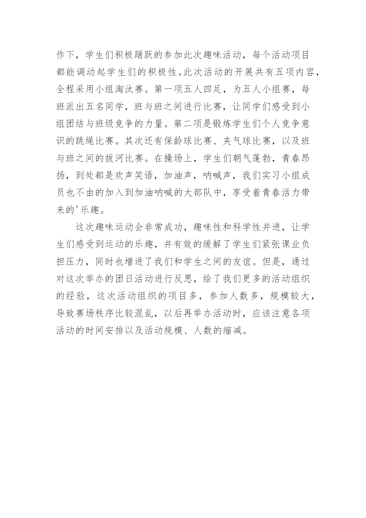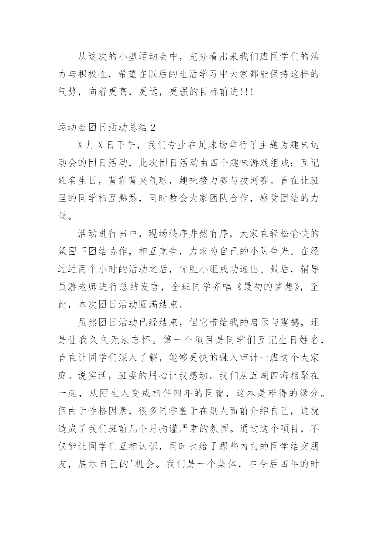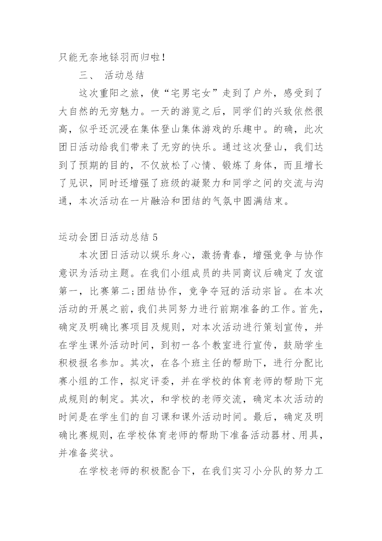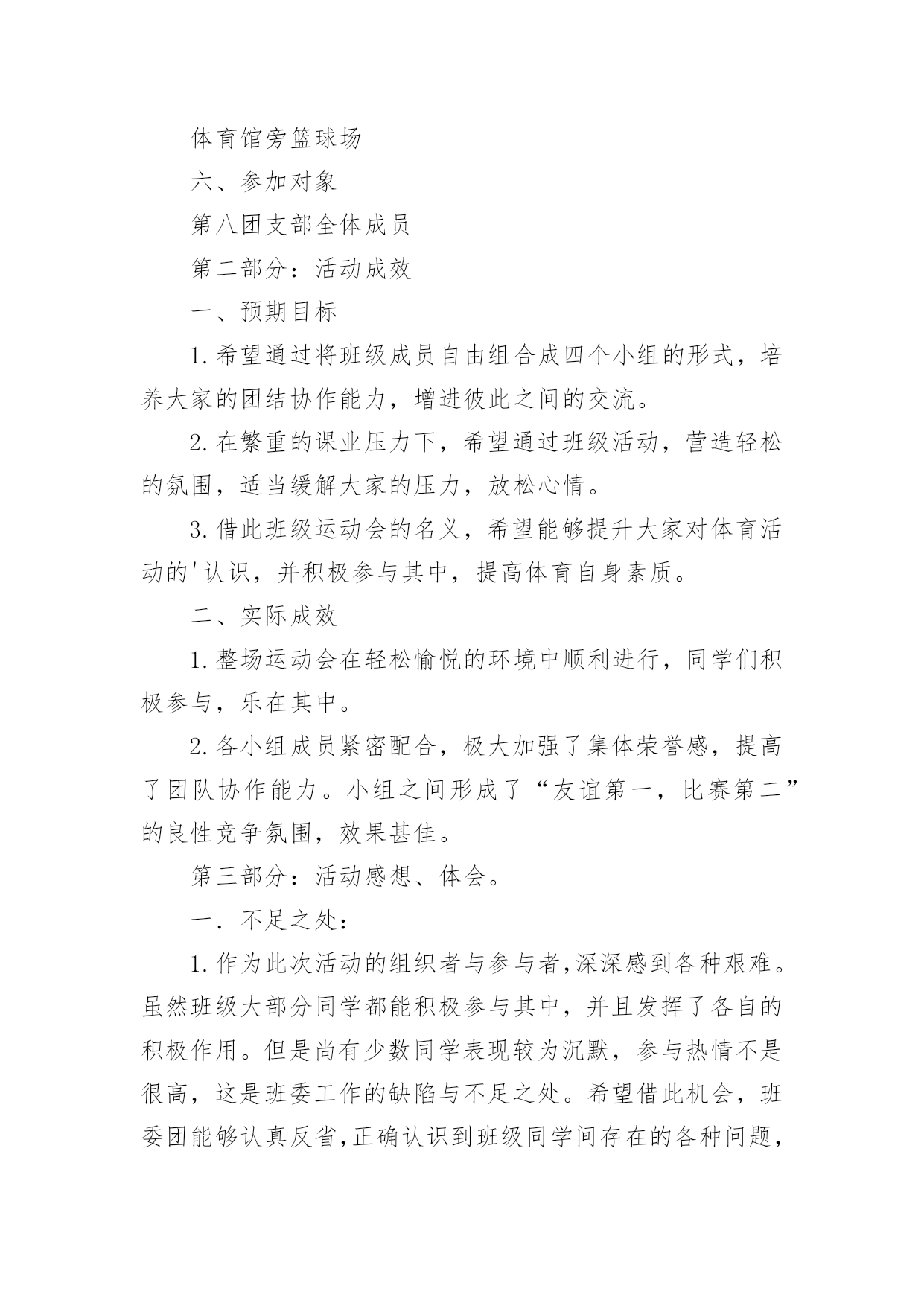 运动会团日活动总结总结是指社会团体、企业单位和个人在自身的某一时期、某一项目或某些工作告一段落或者全部完成后进行回顾检查、分析评价,从而肯定成绩,得到经验,找出差距,得出教训和一些规律性认识的一种书面材料,它可使零星的、肤浅的、表面的感性认知上升到全面的、系统的、本质的理性认识上来,让我们好好写一份总结吧。你想知道总结怎么写吗?以下是小编帮大家整理的运动会团日活动总结,仅供参考,希望能够帮助到大家。运动会团日活动总结1大型运动会是我们班这次团日活动的内容之一,形式丰富多彩,而我们在这次运动会上不仅展示自己,而且要发扬亚运精神,为即将到来的亚运做一个名副其实的“领头羊”。跑步是同学们再熟悉不过的了,古希腊的一块山崖上有这样的.三句话:“如果你想健壮,跑步吧!如果你想健美,跑步吧!如果你想聪明,跑步吧!”我参加的项目正是跑步,在听到起跑的指示后,参赛的同学就像脱缰的野马似的向终点奔跑过去,那股劲简直可以跟亚运选手媲美。虽然不是正式的比赛,但同学们都拿出了自己的热情参与其中,实在是给力啊!除了跑步之外,篮球、足球、羽毛球等等项目也各有各的精彩,同学们都积极投入,使我们这次的团日小活动在一片欢呼呐喊中圆满结束。从这次的小型运动会中,充分看出来我们班同学们的活力与积极性,希望在以后的生活学习中大家都能保持这样的气势,向着更高,更远,更强的目标前进!!!运动会团日活动总结2X月X日下午,我们专业在足球场举行了主题为趣味运动会的团日活动,此次团日活动由四个趣味游戏组成:互记姓名生日,背靠背夹气球,趣味接力赛与拔河赛。旨在让班里的同学相互熟悉,同时教会大家团队合作,感受团结的力量。活动进行当中,现场秩序井然有序,大家在轻松愉快的氛围下团结协作,相互竞争,力求为自己的小队争光。在经过近两个小时的活动之后,优胜小组成功选出。最后,辅导员游老师进行总结发言,全班同学齐唱《最初的梦想》,至此,本次团日活动圆满结束。虽然团日活动已经结束,但它带给我的启示与震撼,还是让我久久无法忘怀。第一个项目是同学们互记生日姓名,旨在让同学们深入了解,能够更快的融入审计一班这个大家庭。说实话,班委的用心让我感动。我们从五湖四海相聚在一起,从陌生人变成相伴四年的同窗,这本是难得的缘分。但由于性格因素,很多同学羞于在别人面前介绍自己,这就造成了我们班前几个月拘谨严肃的氛围。通过这个项目,不仅能让同学们互相认识,同时也给了那些内向的同学结交朋友,展示自己的'机会。我们是一个集体,在今后四年的时光里,我们都会陪伴在彼此的身边,若是一开始就活在自己的世界而不与别人交流,那么,失去的不仅仅是一群挚友,更是一项与他人交流合作的能力。接下来的三项比赛都需要团队中每一个人的力量,需要人人团结一致,共同协作。其实在团日活动之前,我们班并不算是十分团结,在开班会时老是出现班委或班助提出问题却无人回应的尴尬现象。可是,一个班级,只有团结才能聚民心,只有聚民心才能有共同向目标进发的力量。反之,如果人心涣散,人人都觉得事不关己,自己孤军奋战而不懂协作,那么即使他有一天能成功,也不能感受到与他人分享的喜悦。团结就是力量,这句话我十分赞同。一个国家,只有团结才能发展;一个团队,只有团结才能成功。作为新一代的大学生,我们必须学会团结与合作,必须了解团队的重要性,只有这样才能在将来面对社会上的残酷,粗糙与坚硬时,能够有大步走下去的动力与勇气。活动之前,班委们为了搞好这次团日活动,不仅开了大大小小的会,反复完善策划书,而且牺牲自己的休息时间,为优胜队伍采购奖品,在活动之前布置好现场。这些我们虽然没有亲眼看到,但是却能在活动中亲身感受到他们的认真和负责。在此我要替同学们向他们表示感谢,感谢他们的精心策划和用心准备,给了我们这样一个在欢笑中成长与学习的机会。团日活动已经结束,但我们的大学生活才刚刚开始。愿我们所有人都能从这次团日活动中感受到团队与协作的意义,愿我班的第一次团日活动能够成为我们大学时光中一段温暖而珍贵的回忆。运动会团日活动总结3第一部分:一、活动主题在欢笑中参与运动,在合作中收获快乐。二、活动目的11月份,即将迎来我校新一届的校运会。在此次氛围下,同学们积极参与了跑步,球类等各项运动,大家的健身运动热情高涨,故第八团支部特以此为基点,举办此次团日活动,鼓励同学们投身运动热潮。希望通过此次团日活动,使同学们培养正确的运动健身观念,不断提升自身运动技能,提高对运动的认识,并积极参与体育运动。同时在参与活动的过程中,加强班级同学间的配合协作,沟通交流。三、活动内容:班级趣味运动会项目一.两人三脚接力赛项目二.自行车比慢项目三.跳大绳比赛项目四.男女趣味篮球四、活动时间xx年10月26日下午五、活动地点体育馆旁篮球场六、参加对象第八团支部全体成员第二部分:活动成效一、预期目标1.希望通过将班级成员自