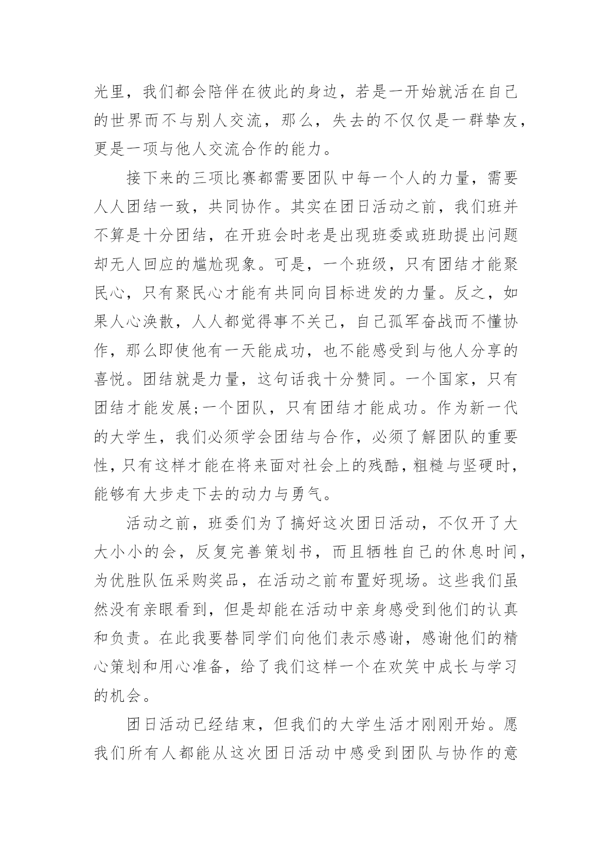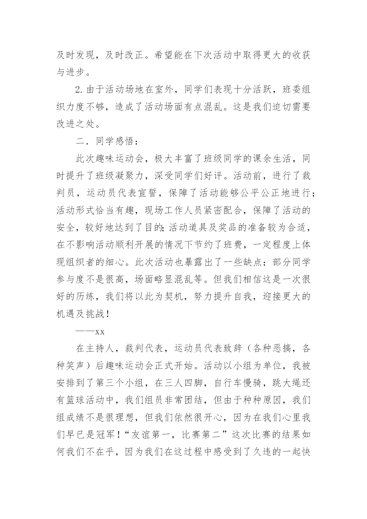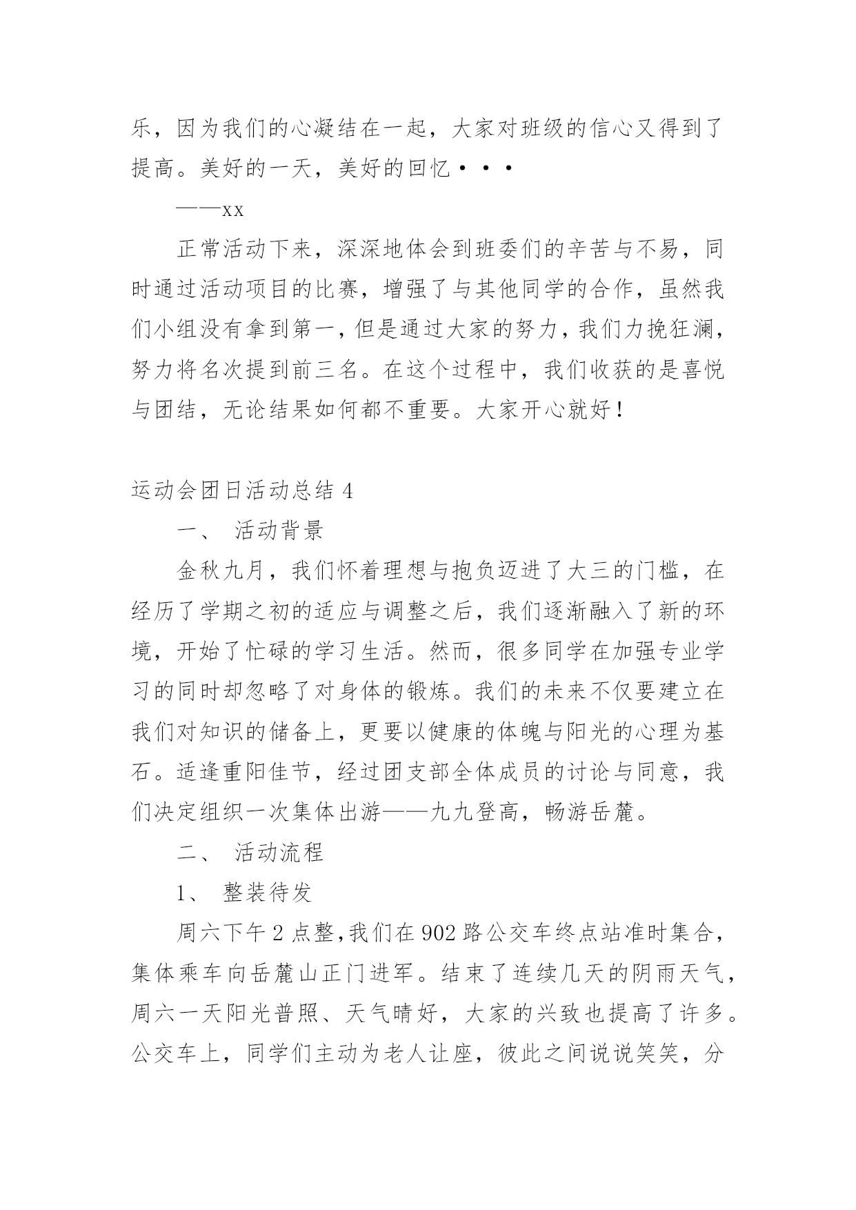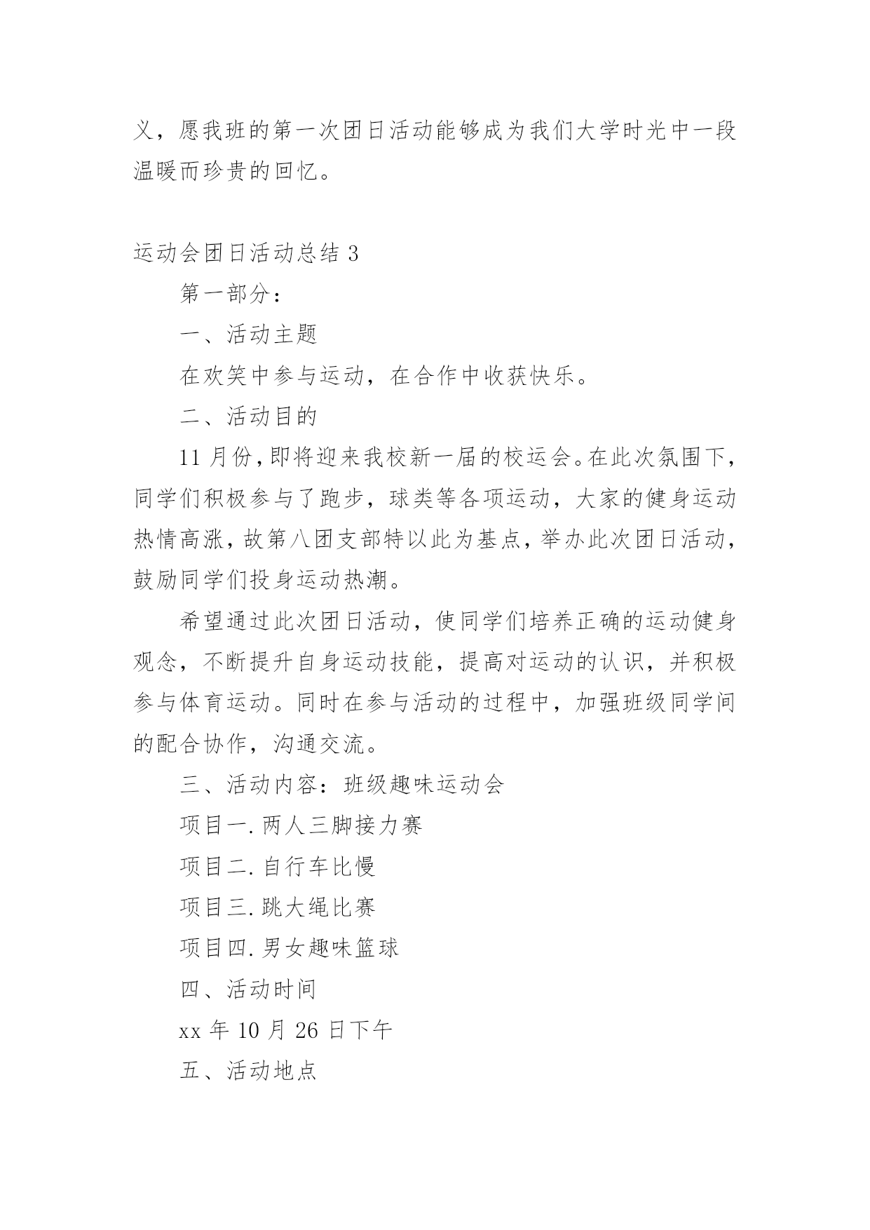 运动会团日活动总结总结是指社会团体、企业单位和个人在自身的某一时期、某一项目或某些工作告一段落或者全部完成后进行回顾检查、分析评价,从而肯定成绩,得到经验,找出差距,得出教训和一些规律性认识的一种书面材料,它可使零星的、肤浅的、表面的感性认知上升到全面的、系统的、本质的理性认识上来,让我们好好写一份总结吧。你想知道总结怎么写吗?以下是小编帮大家整理的运动会团日活动总结,仅供参考,希望能够帮助到大家。运动会团日活动总结1大型运动会是我们班这次团日活动的内容之一,形式丰富多彩,而我们在这次运动会上不仅展示自己,而且要发扬亚运精神,为即将到来的亚运做一个名副其实的“领头羊”。跑步是同学们再熟悉不过的了,古希腊的一块山崖上有这样的.三句话:“如果你想健壮,跑步吧!如果你想健美,跑步吧!如果你想聪明,跑步吧!”我参加的项目正是跑步,在听到起跑的指示后,参赛的同学就像脱缰的野马似的向终点奔跑过去,那股劲简直可以跟亚运选手媲美。虽然不是正式的比赛,但同学们都拿出了自己的热情参与其中,实在是给力啊!除了跑步之外,篮球、足球、羽毛球等等项目也各有各的精彩,同学们都积极投入,使我们这次的团日小活动在一片欢呼呐喊中圆满结束。从这次的小型运动会中,充分看出来我们班同学们的活力与积极性,希望在以后的生活学习中大家都能保持这样的气势,向着更高,更远,更强的目标前进!!!运动会团日活动总结2X月X日下午,我们专业在足球场举行了主题为趣味运动会的团日活动,此次团日活动由四个趣味游戏组成:互记姓名生日,背靠背夹气球,趣味接力赛与拔河赛。旨在让班里的同学相互熟悉,同时教会大家团队合作,感受团结的力量。活动进行当中,现场秩序井然有序,大家在轻松愉快的氛围下团结协作,相互竞争,力求为自己的小队争光。在经过近两个小时的活动之后,优胜小组成功选出。最后,辅导员游老师进行总结发言,全班同学齐唱《最初的梦想》,至此,本次团日活动圆满结束。虽然团日活动已经结束,但它带给我的启示与震撼,还是让我久久无法忘怀。第一个项目是同学们互记生日姓名,旨在让同学们深入了解,能够更快的融入审计一班这个大家庭。说实话,班委的用心让我感动。我们从五湖四海相聚在一起,从陌生人变成相伴四年的同窗,这本是难得的缘分。但由于性格因素,很多同学羞于在别人面前介绍自己,这就造成了我们班前几个月拘谨严肃的氛围。通过这个项目,不仅能让同学们互相认识,同时也给了那些内向的同学结交朋友,展示自己的'机会。我们是一个集体,在今后四年的时光里,我们都会陪伴在彼此的身边,若是一开始就活在自己的世界而不与别人交流,那么,失去的不仅仅是一群挚友,更是一项与他人交流合作的能力。接下来的三项比赛都需要团队中每一个人的力量,需要人人团结一致,共同协作。其实在团日活动之前,我们班并不算是十分团结,在开班会时老是出现班委或班助提出问题却无人回应的尴尬现象。可是,一个班级,只有团结才能聚民心,只有聚民心才能有共同向目标进发的力量。反之,如果人心涣散,人人都觉得事不关己,自己孤军奋战而不懂协作,那么即使他有一天能成功,也不能感受到与他人分享的喜悦。团结就是力量,这句话我十分赞同。一个国家,只有团结才能发展;一个团队,只有团结才能成功。作为新一代的大学生,我们必须学会团结与合作,必须了解团队的重要性,只有这样才能在将来面对社会上的残酷,粗糙与坚硬时,能够有大步走下去的动力与勇气。活动之前,班委们为了搞好这次团日活动,不仅开了大大小小的会,反复完善策划书,而且牺牲自己的休息时间,为优胜队伍采购奖品,在活动之前布置好现场。这些我们虽然没有亲眼看到,但是却能在活动中亲身感受到他们的认真和负责。在此我要替同学们向他们表示感谢,感谢他们的精心策划和用心准备,给了我们这样一个在欢笑中成长与学习的机会。团日活动已经结束,但我们的大学生活才刚刚开始。愿我们所有人都能从这次团日活动中感受到团队与协作的意义,愿我班的第一次团日活动能够成为我们大学时光中一段温暖而珍贵的回忆。运动会团日活动总结3第一部分:一、活动主题在欢笑中参与运动,在合作中收获快乐。二、活动目的11月份,即将迎来我校新一届的校运会。在此次氛围下,同学们积极参与了跑步,球类等各项运动,大家的健身运动热情高涨,故第八团支部特以此为基点,举办此次团日活动,鼓励同学们投身运动热潮。希望通过此次团日活动,使同学们培养正确的运动健身观念,不断提升自身运动技能,提高对运动的认识,并积极参与体育运动。同时在参与活动的过程中,加强班级同学间的配合协作,沟通交流。三、活动内容:班级趣味运动会项目一.两人三脚接力赛项目二.自行车比慢项目三.跳大绳比赛项目四.男女趣味篮球四、活动时间xx年10月26日下午五、活动地点体育馆旁篮球场六、参加对象第八团支部全体成员第二部分:活动成效一、预期目标1.希望通过将班级成员自
