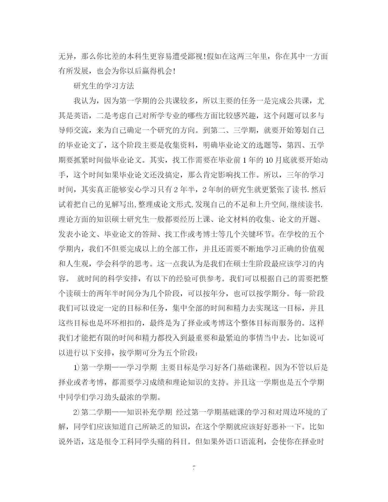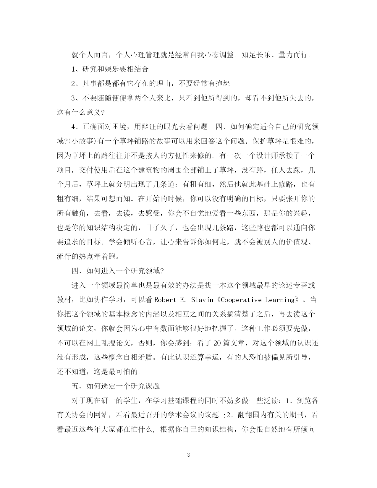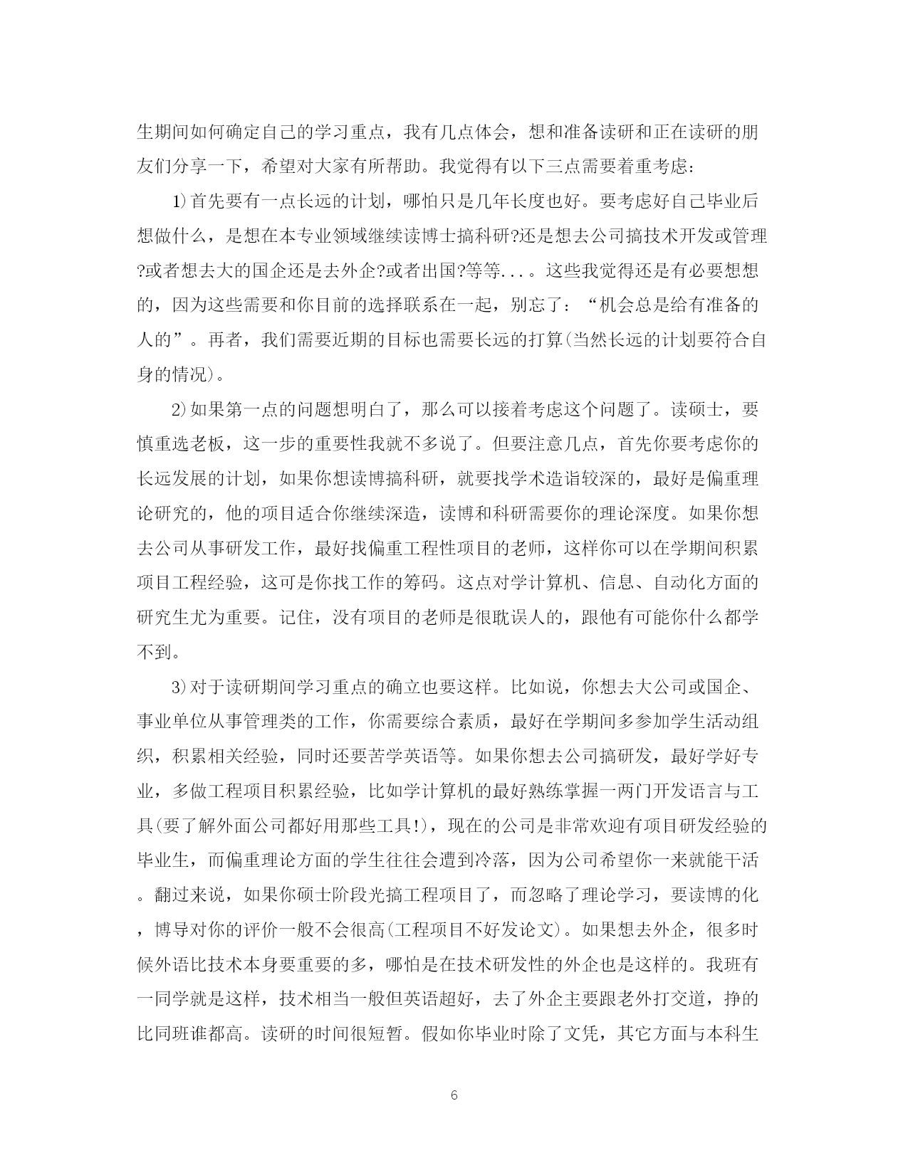 此资料由网络收集而来,如有侵权请告知上传者立即删除。资料共分享,我们负责传递知识。PAGEPAGE9研究生学习计划一、研究生期间我们应该做什么1)建立合理的知识结构:尽量广地涉猎学科基本知识,尽量深地了解所研究领域的方方面面、过去和现在;2)掌握独立研究的方法和技能:尽量多的学习各种研究方法,熟练掌握研究过程和步骤;3)学会写论文:写论文不仅是训练表达能力,更是训练思维的逻辑性,论文体例虽是八股,但却是整理思路、与他人沟通的有效结构,不可不尊重。二、对本专业研究生做研究的要求1)人文与技术相结合2)理论与实践相结合3)渊博知识与独立思考相结合4)理想精神与务实态度相结合三、个人管理包括个人时间管理(PTM)个人知识管理(PKM)个人心理管理(PPM)1)个人时间管理(PTM)1、目标2、事先规划好的行动是成功的关键3、分析的工作。将事情一一列出来4、没有清单,所有遇到的事情都会改变你自己的运行方向5、设定优先次序6、专注力7、时间期限和奖励。做完一件事情后给自己一点奖励。强迫自己设定期限8、工时记录。将时间分配和使用情形记录下来9、注意拖延的现象。重要的事情和紧急的事情。对自己说:“立刻去做!立刻去做!立刻去做!”10、会议。a会议有目标;b有议程;c准时开始准时结束。11、关键成果领域。导师或者上级期待你完成什么?12、分批作业。相同的事情累积起来一起做。13、整洁。清理工作环境,面前只有你现在要处理的资料。14、连续的工时。60分钟、90分钟的时间。一大早起床5点左右的时候可以连续工作几个小时,可以做一些创造性的工作,如写报告等。15、利用零碎的时间。只要花出代价就总会有收获。额外的零散时间,比如上班的路上的时间。16、准时。17、简化工作。a,做久一点;b,做快一点;c,做重要的事情;d,做自己拿手的事情;e,少犯错;f,发挥团队合作的力量。18、学会说不。19、平衡。真正重要的事情:身体健康、年轻的心灵、良好的人际关系。2)个人知识管理(PKM)其实质在于帮助个人提升工作效率,整合自己的信息资源,提高个人的竞争力。通过个人知识管理,让个人拥有的各种资料、随手可得的信息变成更多价值的知识,从而最终利于自己的工作、生活。从个人的角度讲,需要管理的知识资源无外乎以下的内容:1、人际交往资源(如联系人的通讯录、每个人的特点与特长等)2、通讯管理(书信、电子信件、传真等)个人时间管理工具(事务提醒、待办事宜、个人备忘录)3、网络资源管理(网站管理与连接)4、文件档案管理3)个人心理管理(PPM)就个人而言,个人心理管理就是经常自我心态调整。知足长乐、量力而行。1、研究和娱乐要相结合2、凡事都是都有它存在的理由,不要经常有抱怨3、不要随随便便拿两个人来比,只看到他所得到的,却看不到他所失去的,这有什么意义?4、正确面对困境,用辩证的眼光去看问题。四、如何确定适合自己的研究领域?(小故事)有一个草坪铺路的故事可以用来回答这个问题。保护草坪是很难的,因为草坪上的路往往并不是按人的方便性来修的。有一次一个设计师承接了一个项目,交付使用后在这个建筑物的周围全部铺上了草坪,没有路,任人去踩,几个月后,草坪上就分明出现了几条道:有粗有细,然后他就此基础上修路,也有粗有细,结果可想而知。在开始的时候,你可以没有明确的目标,只要张开你的所有触角,去看,去读,去感受,你会不自觉地爱看一些东西,那是你的兴趣,也是你的知识结构决定的,日子久了,也会出现几条路,这些路也都可以通向你要追求的目标。学会倾听心音,让心来告诉你如何走,就不会被别人的价值观、流行的热点牵着跑。四、如何进入一个研究领域?进入一个领域最简单也是最有效的办法是找一本这个领域最早的论述专著或教材,比如协作学习,可以看RobertE.Slavin《CooperativeLearning》。当你把这个领域的基本概念的内涵以及相互之间的关系搞清楚了之后,再去读这个领域的论文,你就会因为心中有数而能够很好地把握了。这种工作必须要先做,不可以在网上乱搜论文,否则,你会感到:看了20篇文章,对这个领域的认识还没有形成,这些概念自相矛盾。有此认识还算幸运,有的人恐怕被偏见所引导,还不知道,这是最可怕的。五、如何选定一个研究课题对于现在研一的学生,在学习基础课程的同时不妨多做一些泛读:1。浏览各有关协会的网站,看看最近召开的学术会议的议题;2。翻翻国内有关的期刊,看看最近这些年大家都在忙什么,根据你自己的知识结构,你会很自然地有所倾向,再多看看你感兴趣的话题,比较之后,也许就形成了你的论文选题了。六、学生论文研究和导师的角色作用有三种指导方式经常被应用:1)让学生自己去找感兴趣