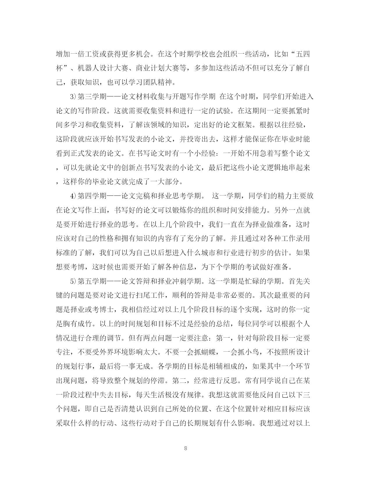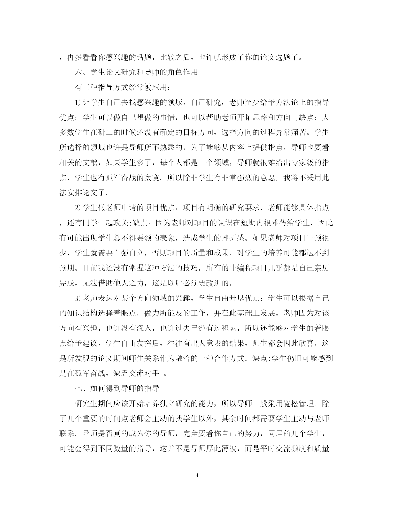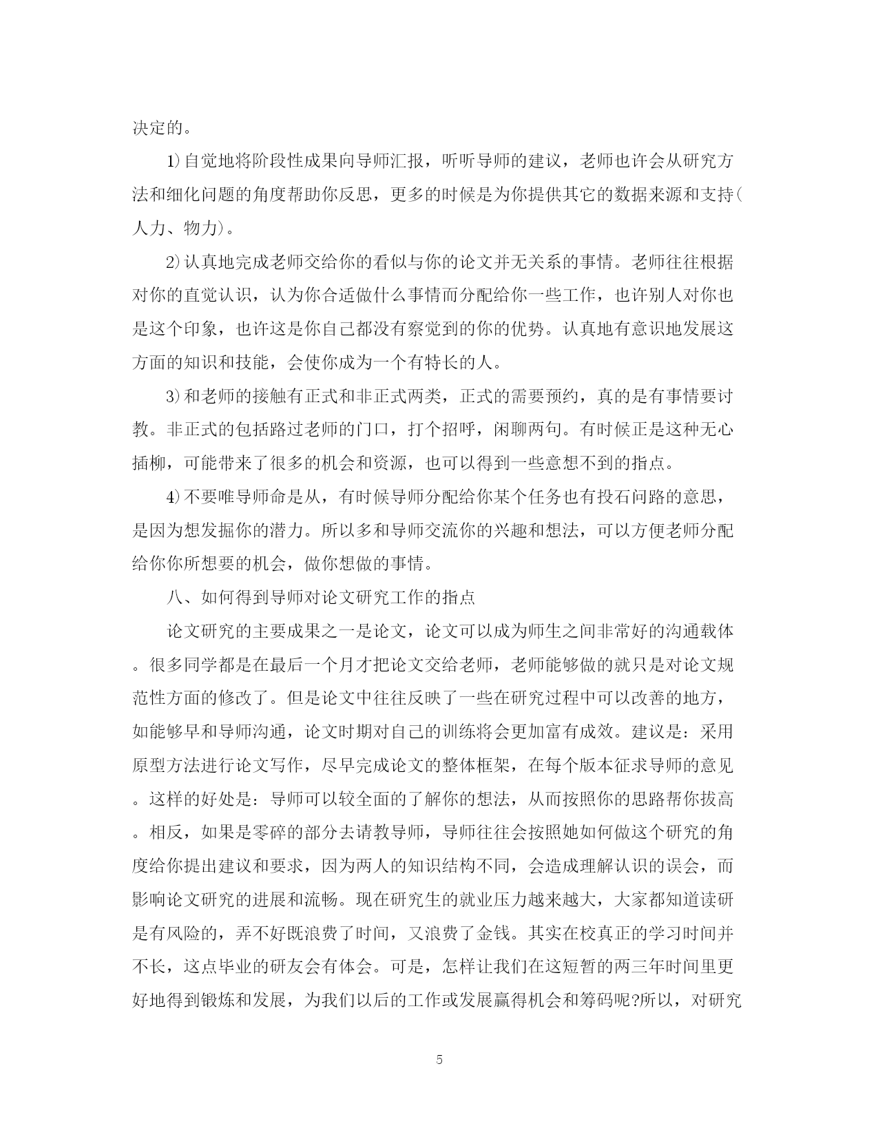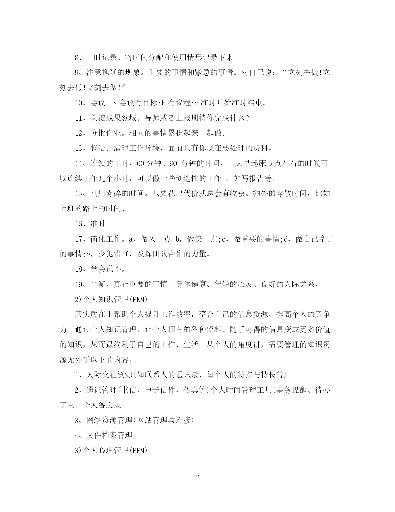 此资料由网络收集而来,如有侵权请告知上传者立即删除。资料共分享,我们负责传递知识。PAGEPAGE9研究生学习计划一、研究生期间我们应该做什么1)建立合理的知识结构:尽量广地涉猎学科基本知识,尽量深地了解所研究领域的方方面面、过去和现在;2)掌握独立研究的方法和技能:尽量多的学习各种研究方法,熟练掌握研究过程和步骤;3)学会写论文:写论文不仅是训练表达能力,更是训练思维的逻辑性,论文体例虽是八股,但却是整理思路、与他人沟通的有效结构,不可不尊重。二、对本专业研究生做研究的要求1)人文与技术相结合2)理论与实践相结合3)渊博知识与独立思考相结合4)理想精神与务实态度相结合三、个人管理包括个人时间管理(PTM)个人知识管理(PKM)个人心理管理(PPM)1)个人时间管理(PTM)1、目标2、事先规划好的行动是成功的关键3、分析的工作。将事情一一列出来4、没有清单,所有遇到的事情都会改变你自己的运行方向5、设定优先次序6、专注力7、时间期限和奖励。做完一件事情后给自己一点奖励。强迫自己设定期限8、工时记录。将时间分配和使用情形记录下来9、注意拖延的现象。重要的事情和紧急的事情。对自己说:“立刻去做!立刻去做!立刻去做!”10、会议。a会议有目标;b有议程;c准时开始准时结束。11、关键成果领域。导师或者上级期待你完成什么?12、分批作业。相同的事情累积起来一起做。13、整洁。清理工作环境,面前只有你现在要处理的资料。14、连续的工时。60分钟、90分钟的时间。一大早起床5点左右的时候可以连续工作几个小时,可以做一些创造性的工作,如写报告等。15、利用零碎的时间。只要花出代价就总会有收获。额外的零散时间,比如上班的路上的时间。16、准时。17、简化工作。a,做久一点;b,做快一点;c,做重要的事情;d,做自己拿手的事情;e,少犯错;f,发挥团队合作的力量。18、学会说不。19、平衡。真正重要的事情:身体健康、年轻的心灵、良好的人际关系。2)个人知识管理(PKM)其实质在于帮助个人提升工作效率,整合自己的信息资源,提高个人的竞争力。通过个人知识管理,让个人拥有的各种资料、随手可得的信息变成更多价值的知识,从而最终利于自己的工作、生活。从个人的角度讲,需要管理的知识资源无外乎以下的内容:1、人际交往资源(如联系人的通讯录、每个人的特点与特长等)2、通讯管理(书信、电子信件、传真等)个人时间管理工具(事务提醒、待办事宜、个人备忘录)3、网络资源管理(网站管理与连接)4、文件档案管理3)个人心理管理(PPM)就个人而言,个人心理管理就是经常自我心态调整。知足长乐、量力而行。1、研究和娱乐要相结合2、凡事都是都有它存在的理由,不要经常有抱怨3、不要随随便便拿两个人来比,只看到他所得到的,却看不到他所失去的,这有什么意义?4、正确面对困境,用辩证的眼光去看问题。四、如何确定适合自己的研究领域?(小故事)有一个草坪铺路的故事可以用来回答这个问题。保护草坪是很难的,因为草坪上的路往往并不是按人的方便性来修的。有一次一个设计师承接了一个项目,交付使用后在这个建筑物的周围全部铺上了草坪,没有路,任人去踩,几个月后,草坪上就分明出现了几条道:有粗有细,然后他就此基础上修路,也有粗有细,结果可想而知。在开始的时候,你可以没有明确的目标,只要张开你的所有触角,去看,去读,去感受,你会不自觉地爱看一些东西,那是你的兴趣,也是你的知识结构决定的,日子久了,也会出现几条路,这些路也都可以通向你要追求的目标。学会倾听心音,让心来告诉你如何走,就不会被别人的价值观、流行的热点牵着跑。四、如何进入一个研究领域?进入一个领域最简单也是最有效的办法是找一本这个领域最早的论述专著或教材,比如协作学习,可以看RobertE.Slavin《CooperativeLearning》。当你把这个领域的基本概念的内涵以及相互之间的关系搞清楚了之后,再去读这个领域的论文,你就会因为心中有数而能够很好地把握了。这种工作必须要先做,不可以在网上乱搜论文,否则,你会感到:看了20篇文章,对这个领域的认识还没有形成,这些概念自相矛盾。有此认识还算幸运,有的人恐怕被偏见所引导,还不知道,这是最可怕的。五、如何选定一个研究课题对于现在研一的学生,在学习基础课程的同时不妨多做一些泛读:1。浏览各有关协会的网站,看看最近召开的学术会议的议题;2。翻翻国内有关的期刊,看看最近这些年大家都在忙什么,根据你自己的知识结构,你会很自然地有所倾向,再多看看你感兴趣的话题,比较之后,也许就形成了你的论文选题了。六、学生论文研究和导师的角色作用有三种指导方式经常被应用:1)让学生自己去找感兴趣