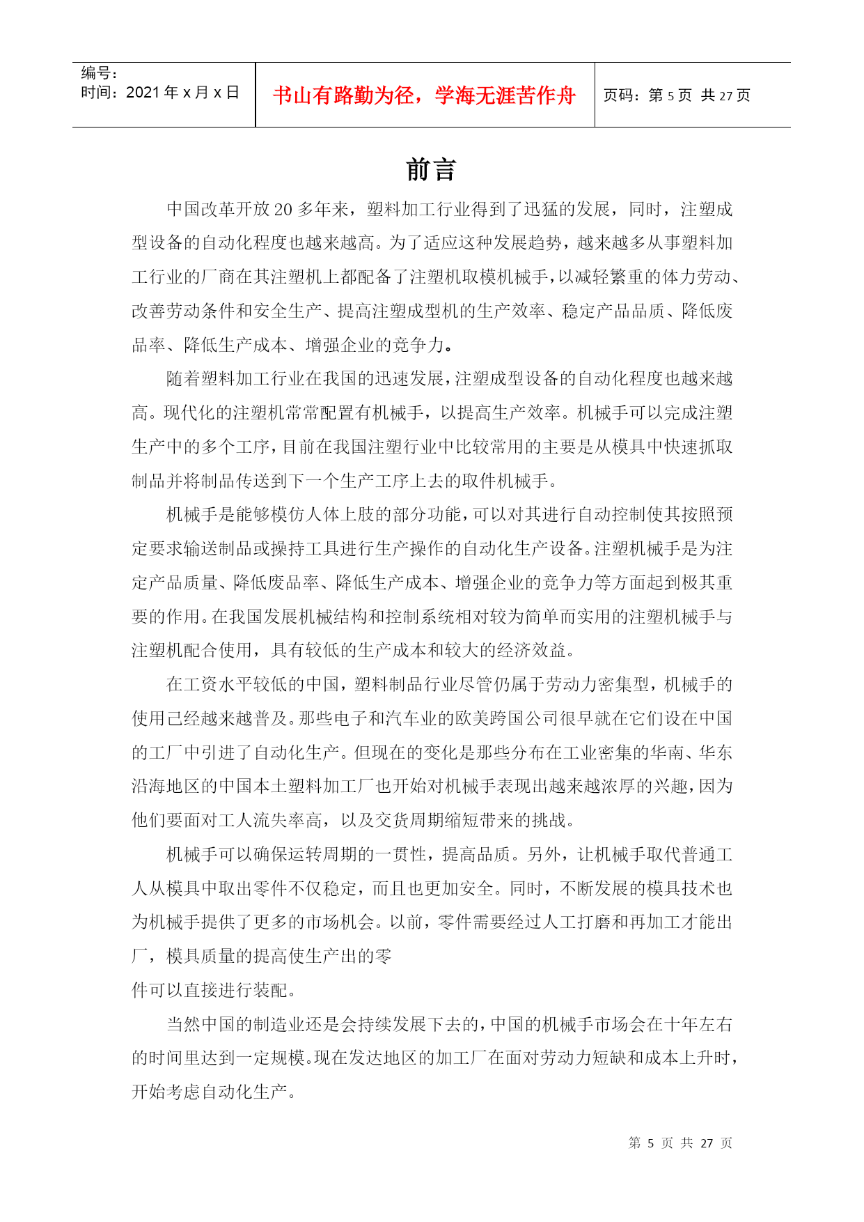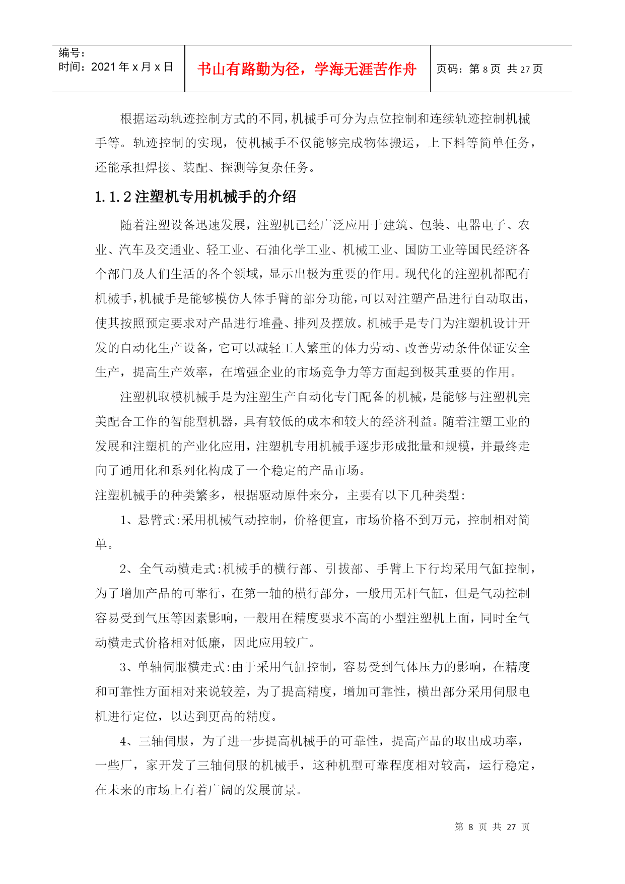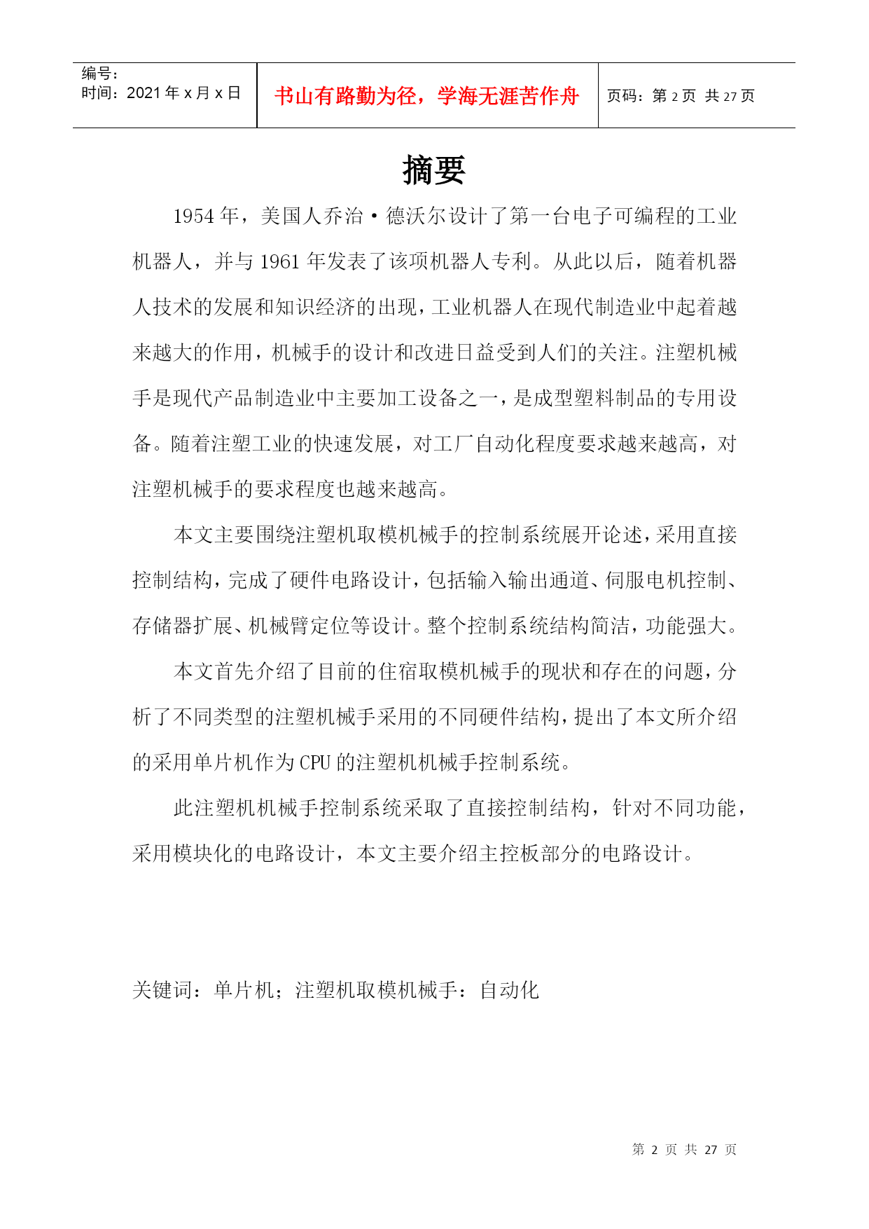 编号:时间:2021年x月x日书山有路勤为径,学海无涯苦作舟页码:第PAGE27页共NUMPAGES27页第PAGE\*MERGEFORMAT27页共NUMPAGES\*MERGEFORMAT27页注塑机械手控制系统Injectionmoldingrobotcontrolsystem摘要1954年,美国人乔治·德沃尔设计了第一台电子可编程的工业机器人,并与1961年发表了该项机器人专利。从此以后,随着机器人技术的发展和知识经济的出现,工业机器人在现代制造业中起着越来越大的作用,机械手的设计和改进日益受到人们的关注。注塑机械手是现代产品制造业中主要加工设备之一,是成型塑料制品的专用设备。随着注塑工业的快速发展,对工厂自动化程度要求越来越高,对注塑机械手的要求程度也越来越高。本文主要围绕注塑机取模机械手的控制系统展开论述,采用直接控制结构,完成了硬件电路设计,包括输入输出通道、伺服电机控制、存储器扩展、机械臂定位等设计。整个控制系统结构简洁,功能强大。本文首先介绍了目前的住宿取模机械手的现状和存在的问题,分析了不同类型的注塑机械手采用的不同硬件结构,提出了本文所介绍的采用单片机作为CPU的注塑机机械手控制系统。此注塑机机械手控制系统采取了直接控制结构,针对不同功能,采用模块化的电路设计,本文主要介绍主控板部分的电路设计。关键词:单片机;注塑机取模机械手:自动化Abstract1954,GeorgeDevol,anAmericanpeopledesignedthefistprogrammablerobot.LaterthefirstrobotmanipulatorpatentwaspublishedbyUSpatentandTrademarkOffice.Sincethen,withthedevelopmentoftherobottechnologyandtheemergenceoftheknowledgeeconomy,industrialrobotsplayaveryimportantroleinthemodernmanufacturinginthe21stcenturymoreandmoreattentionispaidtothedesignandimprovementofindustrialrobots.Injectionmoldingrobotmanufacturingofmodernproducts,oneofthemajorprocessingequipmentisspecialequipmentformoldingplasticproducts.Withtheinjectionmoldingindustry,rapiddevelopmentofincreasinglyhighdemandforfactoryautomation,therequirementsofinjectionmoldingmachineryhandhigherandhigherlevels.Thispapermainlyfocusmoduloroboticinjectionmoldingmachinecontrolsystemtostartdiscussion,theuseofdirectcontrolofthestructure,completehardwaredesign,includingtheinputandoutputchannel,servomotorcontrol,memoryextension,armpositioningdesign.Thewholecontrolsystemstructureissimpleandpowerful.ThispaperintroducesthecurrentaccommodationrobotmodulothecurrentsituationandproblemsofthedifferenttypesofinjectionofdifferentrobothardwareusedinthestructuredescribedinthisarticleproposestheadoptionofSCMastheCPUoftheinjectionmoldingmachinemanipulatorcontrolsystem.Theinjectionmoldingmachinecontrolsystemtotakeadirecthandcontrolstructuresfordifferentfunctions,modularcircuitdesign,thisarticleintroducesthemaincontrolboardpartoft