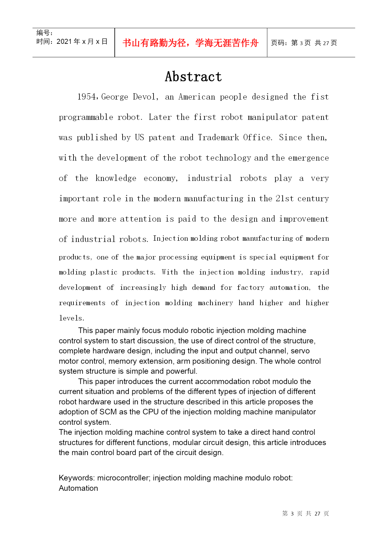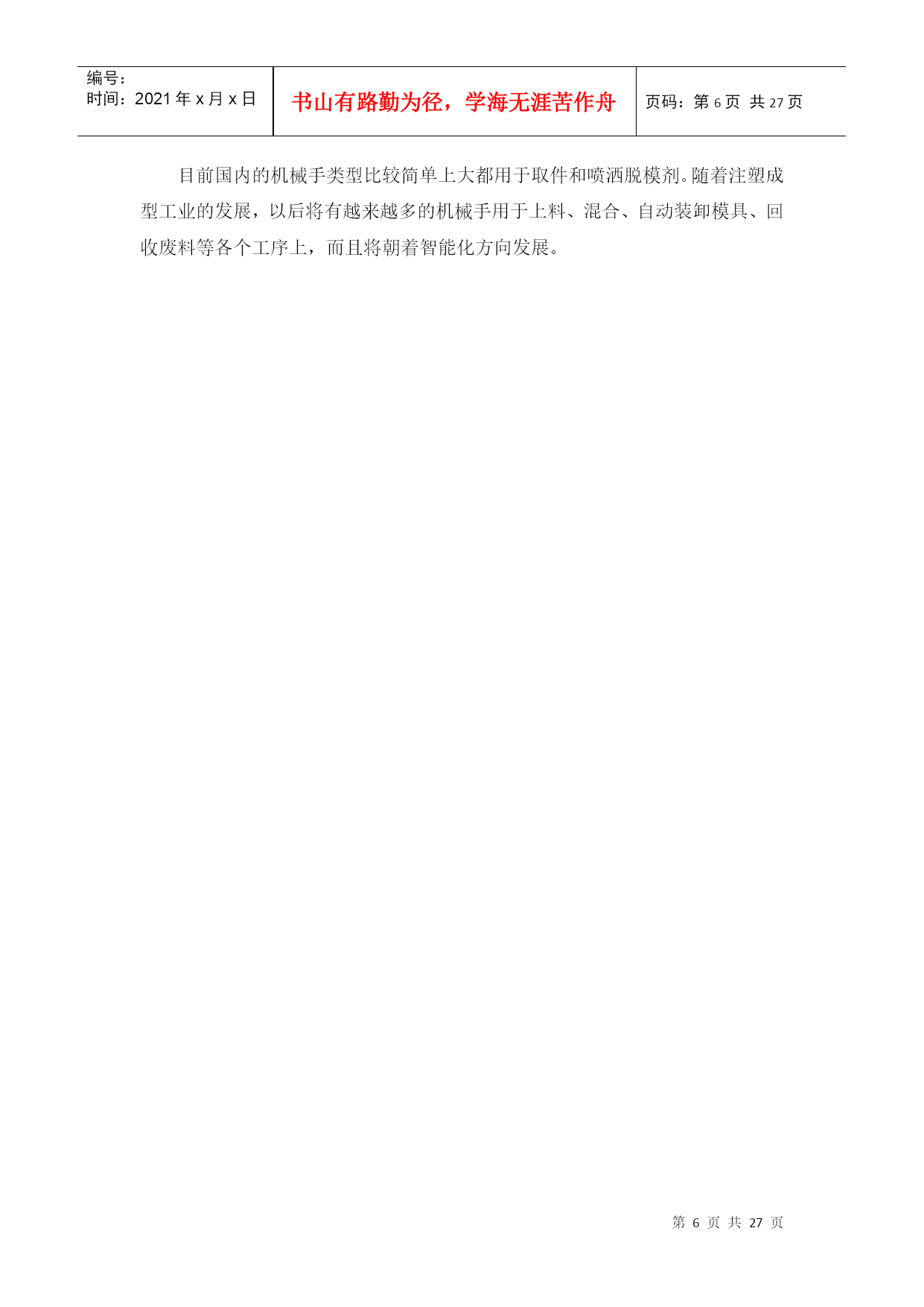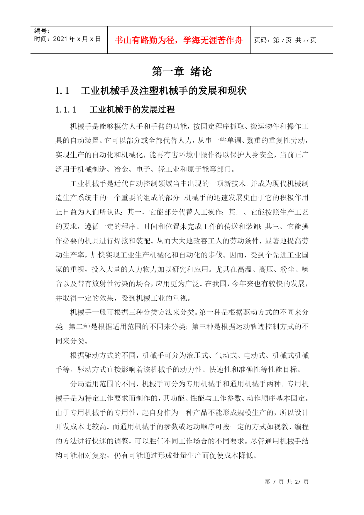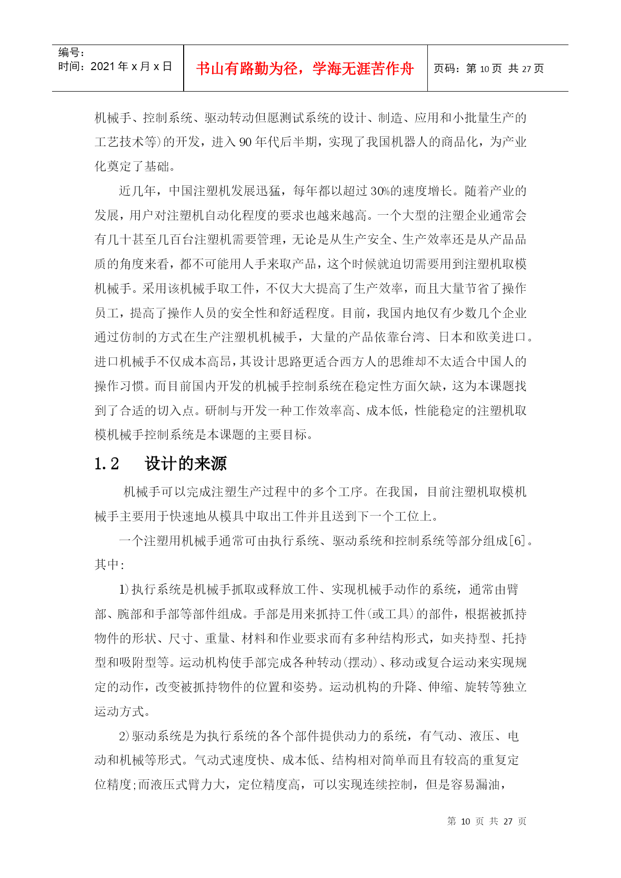 编号:时间:2021年x月x日书山有路勤为径,学海无涯苦作舟页码:第PAGE27页共NUMPAGES27页第PAGE\*MERGEFORMAT27页共NUMPAGES\*MERGEFORMAT27页注塑机械手控制系统Injectionmoldingrobotcontrolsystem摘要1954年,美国人乔治·德沃尔设计了第一台电子可编程的工业机器人,并与1961年发表了该项机器人专利。从此以后,随着机器人技术的发展和知识经济的出现,工业机器人在现代制造业中起着越来越大的作用,机械手的设计和改进日益受到人们的关注。注塑机械手是现代产品制造业中主要加工设备之一,是成型塑料制品的专用设备。随着注塑工业的快速发展,对工厂自动化程度要求越来越高,对注塑机械手的要求程度也越来越高。本文主要围绕注塑机取模机械手的控制系统展开论述,采用直接控制结构,完成了硬件电路设计,包括输入输出通道、伺服电机控制、存储器扩展、机械臂定位等设计。整个控制系统结构简洁,功能强大。本文首先介绍了目前的住宿取模机械手的现状和存在的问题,分析了不同类型的注塑机械手采用的不同硬件结构,提出了本文所介绍的采用单片机作为CPU的注塑机机械手控制系统。此注塑机机械手控制系统采取了直接控制结构,针对不同功能,采用模块化的电路设计,本文主要介绍主控板部分的电路设计。关键词:单片机;注塑机取模机械手:自动化Abstract1954,GeorgeDevol,anAmericanpeopledesignedthefistprogrammablerobot.LaterthefirstrobotmanipulatorpatentwaspublishedbyUSpatentandTrademarkOffice.Sincethen,withthedevelopmentoftherobottechnologyandtheemergenceoftheknowledgeeconomy,industrialrobotsplayaveryimportantroleinthemodernmanufacturinginthe21stcenturymoreandmoreattentionispaidtothedesignandimprovementofindustrialrobots.Injectionmoldingrobotmanufacturingofmodernproducts,oneofthemajorprocessingequipmentisspecialequipmentformoldingplasticproducts.Withtheinjectionmoldingindustry,rapiddevelopmentofincreasinglyhighdemandforfactoryautomation,therequirementsofinjectionmoldingmachineryhandhigherandhigherlevels.Thispapermainlyfocusmoduloroboticinjectionmoldingmachinecontrolsystemtostartdiscussion,theuseofdirectcontrolofthestructure,completehardwaredesign,includingtheinputandoutputchannel,servomotorcontrol,memoryextension,armpositioningdesign.Thewholecontrolsystemstructureissimpleandpowerful.ThispaperintroducesthecurrentaccommodationrobotmodulothecurrentsituationandproblemsofthedifferenttypesofinjectionofdifferentrobothardwareusedinthestructuredescribedinthisarticleproposestheadoptionofSCMastheCPUoftheinjectionmoldingmachinemanipulatorcontrolsystem.Theinjectionmoldingmachinecontrolsystemtotakeadirecthandcontrolstructuresfordifferentfunctions,modularcircuitdesign,thisarticleintroducesthemaincontrolboardpartoft