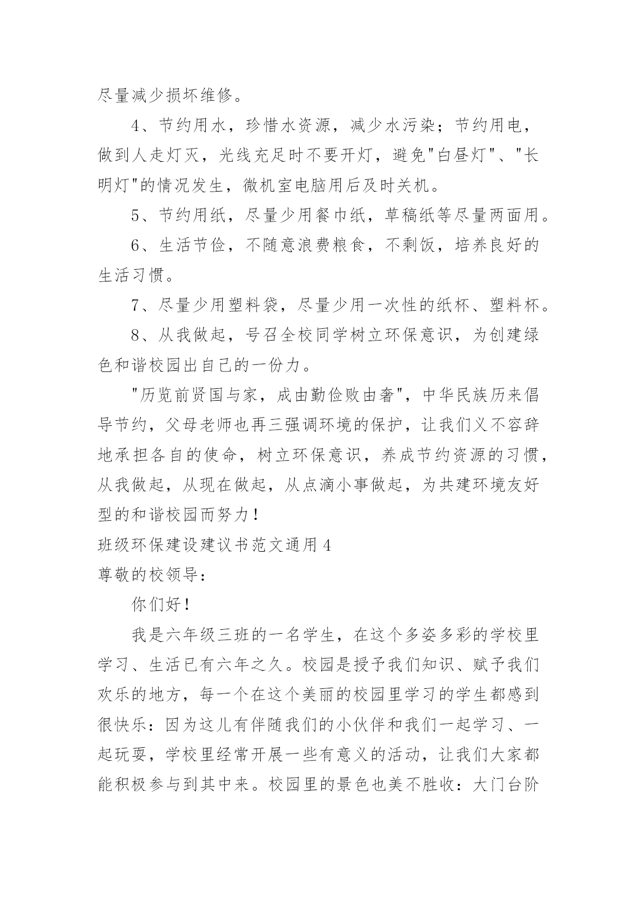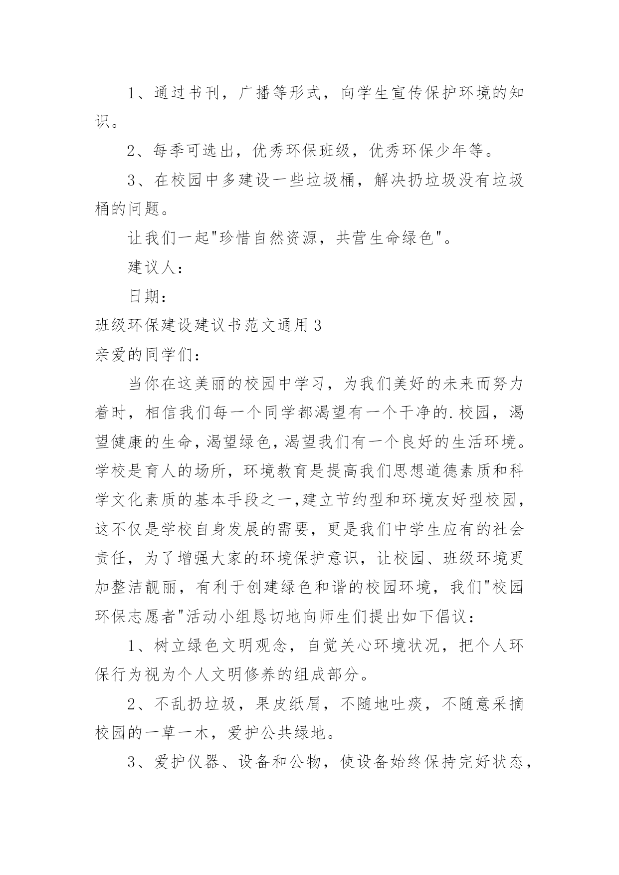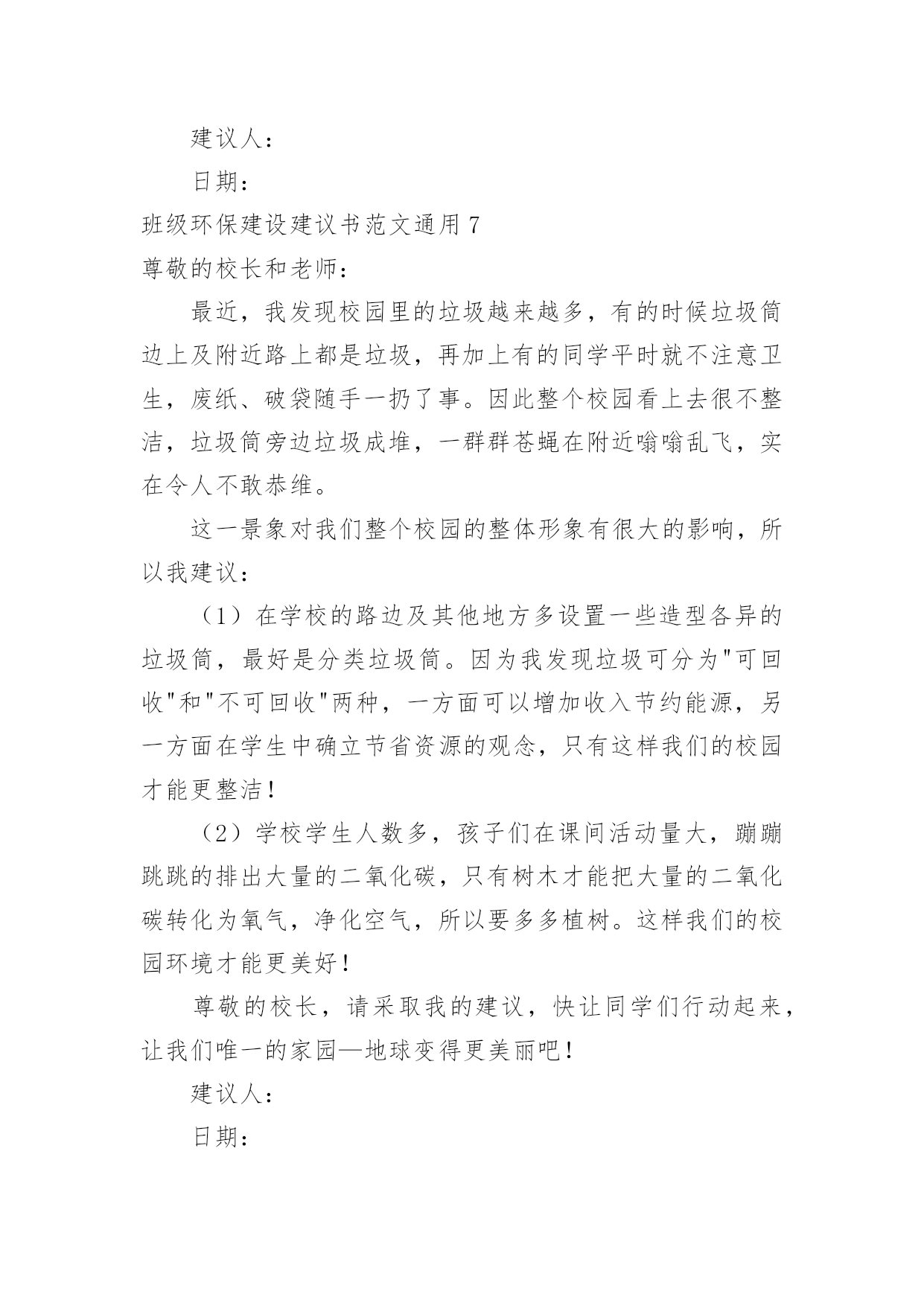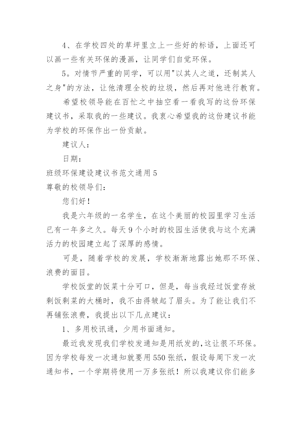班级环保建设建议书班级环保建设建议书范文通用在发展不断提速的社会中,建议书的使用频率越来越高,建议书是单位或集体向有关单位或上级机关和领导,就某项工作提出某种建议时使用的一种常用书信。建议书的注意事项有许多,你确定会写吗?下面是小编整理的班级环保建设建议书范文通用,仅供参考,欢迎大家阅读。班级环保建设建议书范文通用1尊敬的校长:您好!我们的学校是一个漂亮的学校。有一个花坛,有草地,有聚满笑声的操场,周围的树木围满了整个操场。我在这个学校学习已有六年之久。虽然我们的学校很漂亮,但学校正面临着巨大的环境问题。例如有许多同学随便践踏草地,随手把花摘下然后到处乱扔,还把纸揉成一团扔在地上,旁边有垃圾桶却不仍。还有些同学上完厕所洗手不关水龙头,让水白白流了一上午;还有些同学写错字不用橡皮擦,而是直接撕掉扔在地上。像这样的破坏环境、不珍惜资源的事例还有很多。尊敬的校长,为了不让同学们把学校弄得面目全非,请看一下我提出的建议:一、多办一些保护环境的活动,告诉学生保护环境有多重要。也可以通过广播、黑板报等形式向学生宣传保护环境的知识,让学生自愿加入到保护环境的队伍中。二、校园加强管理,对保护环境、珍惜资源的同学进行奖励;对破坏环境、不珍惜资源的同学进行批评和教育。三、让同学自觉做到爱护花草树木,不践踏草坪,不浪费水不浪费纸张,剩下的本子可以做草稿本。希望校长能参考一下我的建议,让学校变得更加美丽、漂亮。建议人:日期:班级环保建设建议书范文通用2尊敬的校领导:您好!昔日的校园,是鸟语花香的,昔日的校园,是生机盎然的,昔日的校园,还是花红柳绿美不胜收的。可今昔不同往日,我们和蔼可亲的校园,发生了巨大的变化,以前如诗如画的校园里面,现在却变成了"垃圾满天"的世界,例如,许多同学买的纸牌,玩完就随手丢弃在操场上,洗完手的水龙头,让它不停的流着泪,却无人理睬,崭新的笔记本躺在垃圾桶里,失去了原有的价值。其实我们的校园里有很多这样的例子。这不仅会让学校的环境变的恶劣,还会使地球上的可再生资源变成不可再生的资源,就算老师每次会给同学们一定的要求,但同学们把自己的恶劣行为视而不见。为了让我们的校园变的更加美丽,我提出以下几点建议:1、通过书刊,广播等形式,向学生宣传保护环境的知识。2、每季可选出,优秀环保班级,优秀环保少年等。3、在校园中多建设一些垃圾桶,解决扔垃圾没有垃圾桶的问题。让我们一起"珍惜自然资源,共营生命绿色"。建议人:日期:班级环保建设建议书范文通用3亲爱的同学们:当你在这美丽的校园中学习,为我们美好的未来而努力着时,相信我们每一个同学都渴望有一个干净的.校园,渴望健康的生命,渴望绿色,渴望我们有一个良好的生活环境。学校是育人的场所,环境教育是提高我们思想道德素质和科学文化素质的基本手段之一,建立节约型和环境友好型校园,这不仅是学校自身发展的需要,更是我们中学生应有的社会责任,为了增强大家的环境保护意识,让校园、班级环境更加整洁靓丽,有利于创建绿色和谐的校园环境,我们"校园环保志愿者"活动小组恳切地向师生们提出如下倡议:1、树立绿色文明观念,自觉关心环境状况,把个人环保行为视为个人文明修养的组成部分。2、不乱扔垃圾,果皮纸屑,不随地吐痰,不随意采摘校园的一草一木,爱护公共绿地。3、爱护仪器、设备和公物,使设备始终保持完好状态,尽量减少损坏维修。4、节约用水,珍惜水资源,减少水污染;节约用电,做到人走灯灭,光线充足时不要开灯,避免"白昼灯"、"长明灯"的情况发生,微机室电脑用后及时关机。5、节约用纸,尽量少用餐巾纸,草稿纸等尽量两面用。6、生活节俭,不随意浪费粮食,不剩饭,培养良好的生活习惯。7、尽量少用塑料袋,尽量少用一次性的纸杯、塑料杯。8、从我做起,号召全校同学树立环保意识,为创建绿色和谐校园出自己的一份力。"历览前贤国与家,成由勤俭败由奢",中华民族历来倡导节约,父母老师也再三强调环境的保护,让我们义不容辞地承担各自的使命,树立环保意识,养成节约资源的习惯,从我做起,从现在做起,从点滴小事做起,为共建环境友好型的和谐校园而努力!班级环保建设建议书范文通用4尊敬的校领导:你们好!我是六年级三班的一名学生,在这个多姿多彩的学校里学习、生活已有六年之久。校园是授予我们知识、赋予我们欢乐的地方,每一个在这个美丽的校园里学习的学生都感到很快乐:因为这儿有伴随我们的小伙伴和我们一起学习、一起玩耍,学校里经常开展一些有意义的活动,让我们大家都能积极参与到其中来。校园里的景色也美不胜收:大门台阶上摆放着一盆盆美丽含香的花儿,每当我们走近校园,那些花儿都对我们笑,让我们感到无比的舒心和愉快。教学楼下的"米老鼠"花坛里,松树的枝叶无比繁茂,小草生机勃勃、富有活力,让校园中的每一个同学玩得开心,生活也开心。可是,我们在打扫公共场地的过程中经常发现:原本美丽