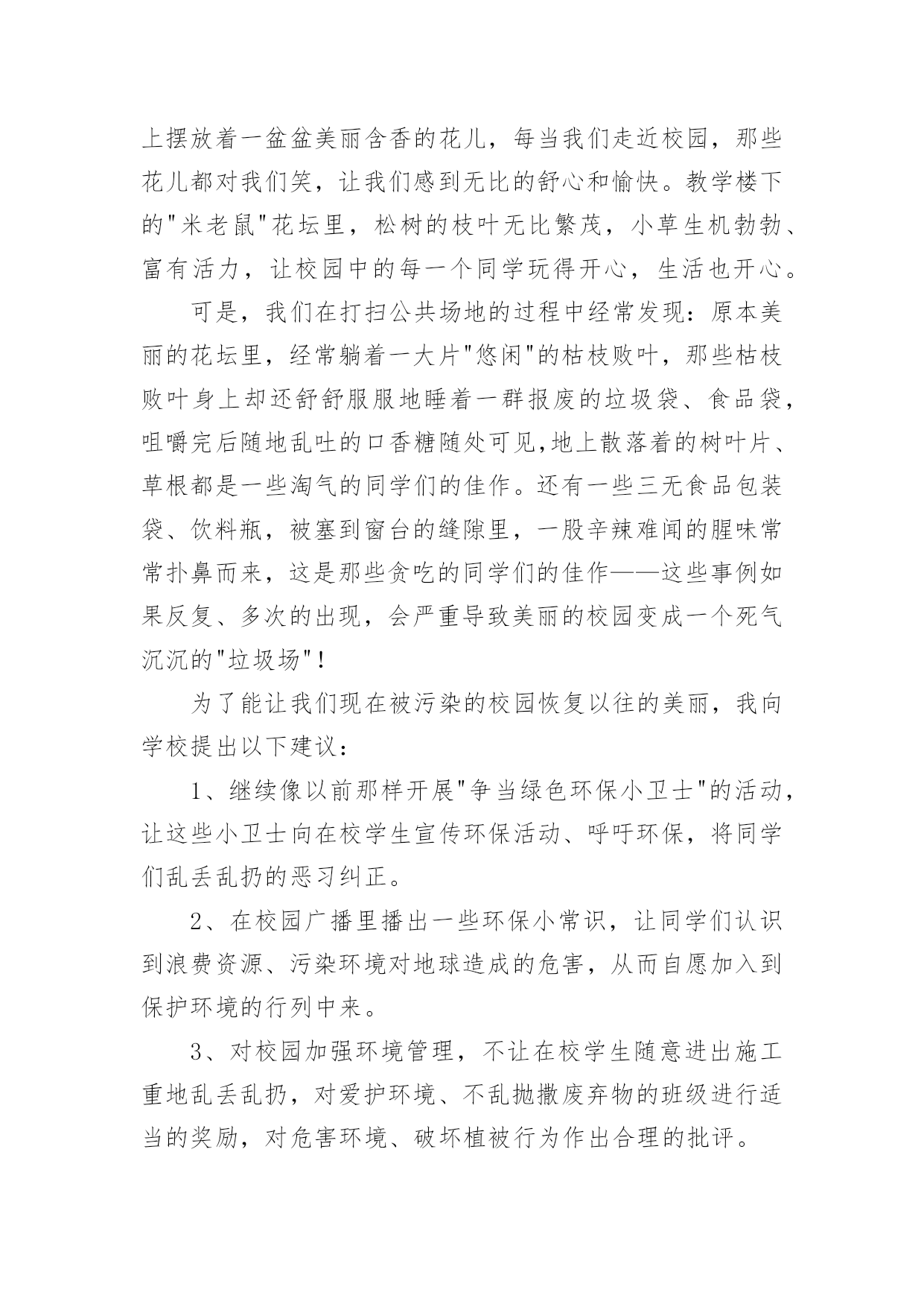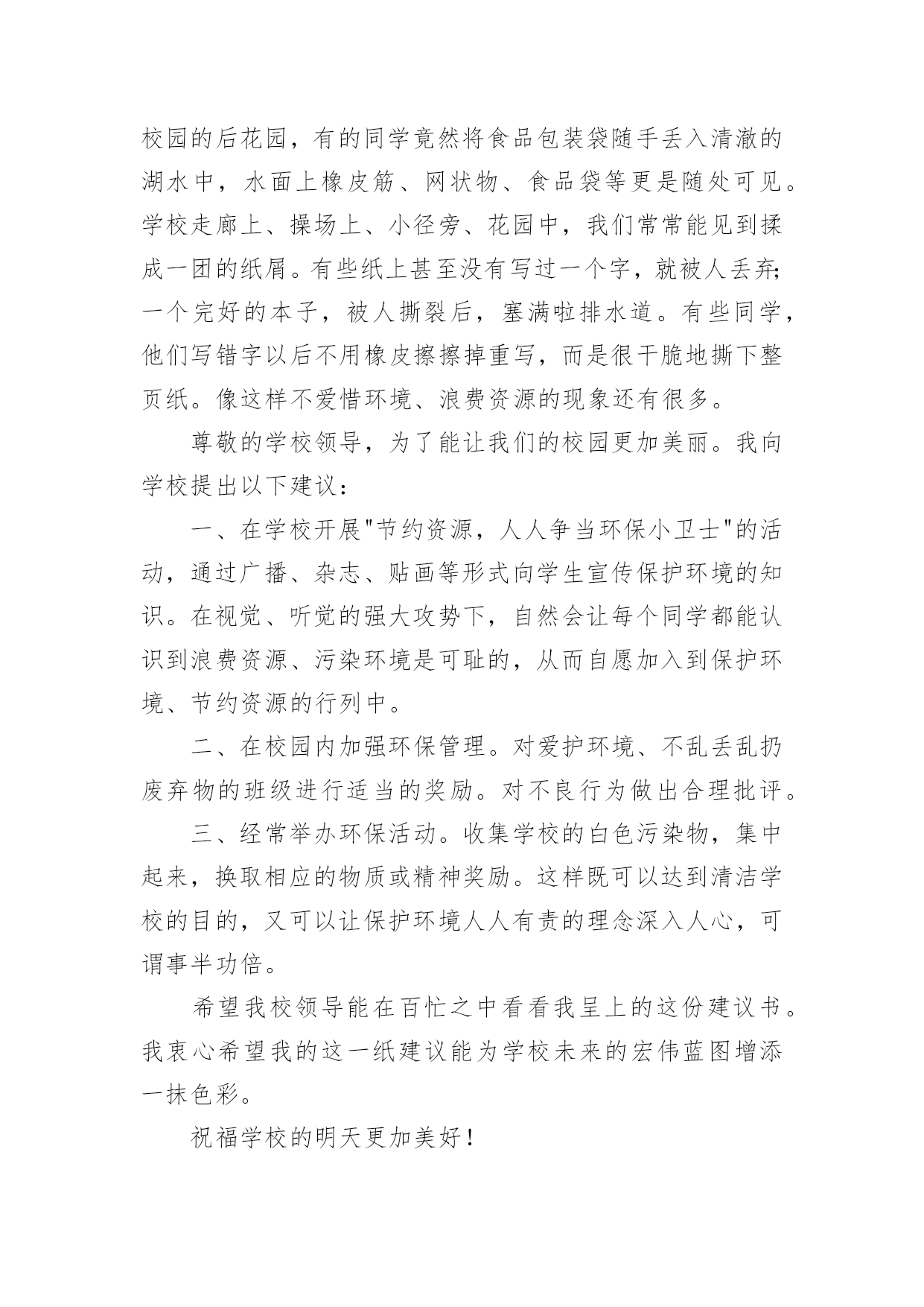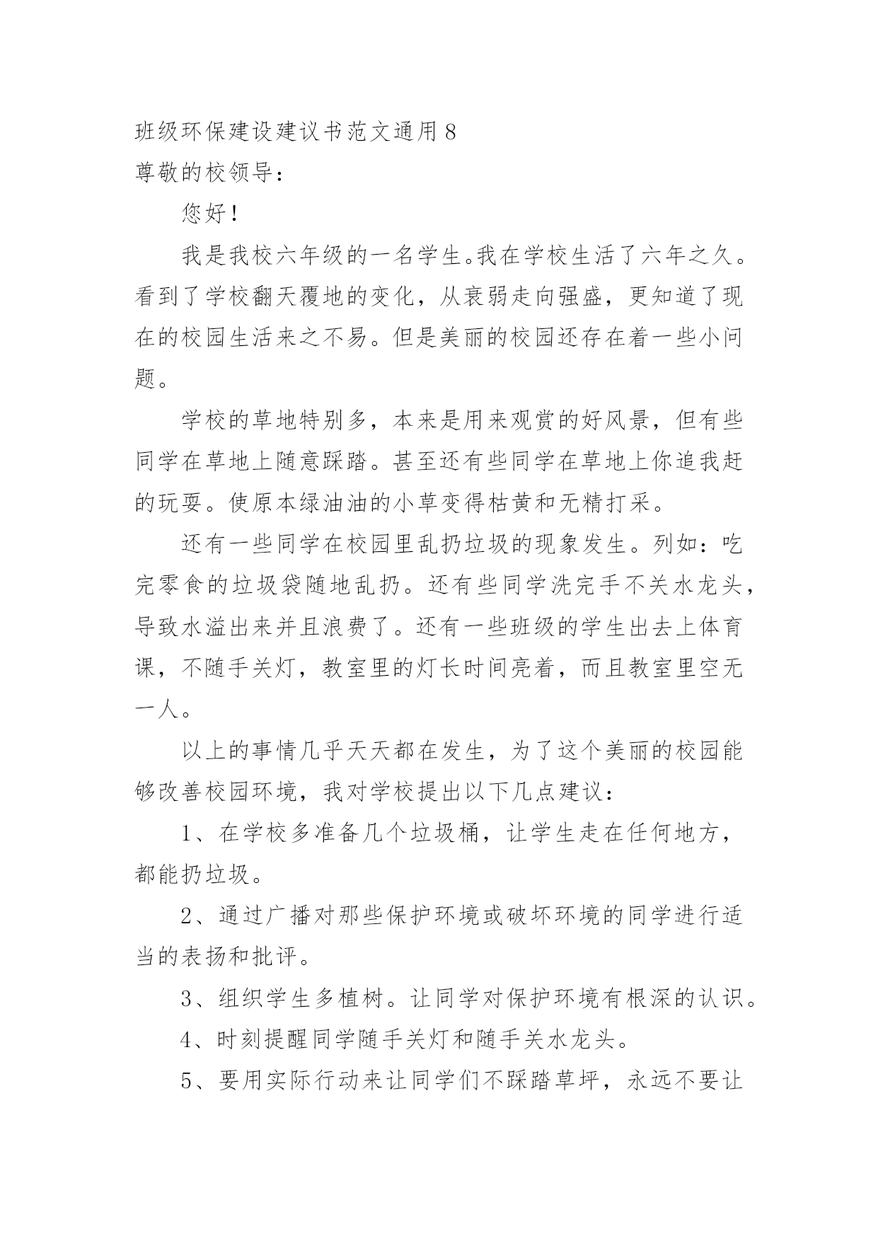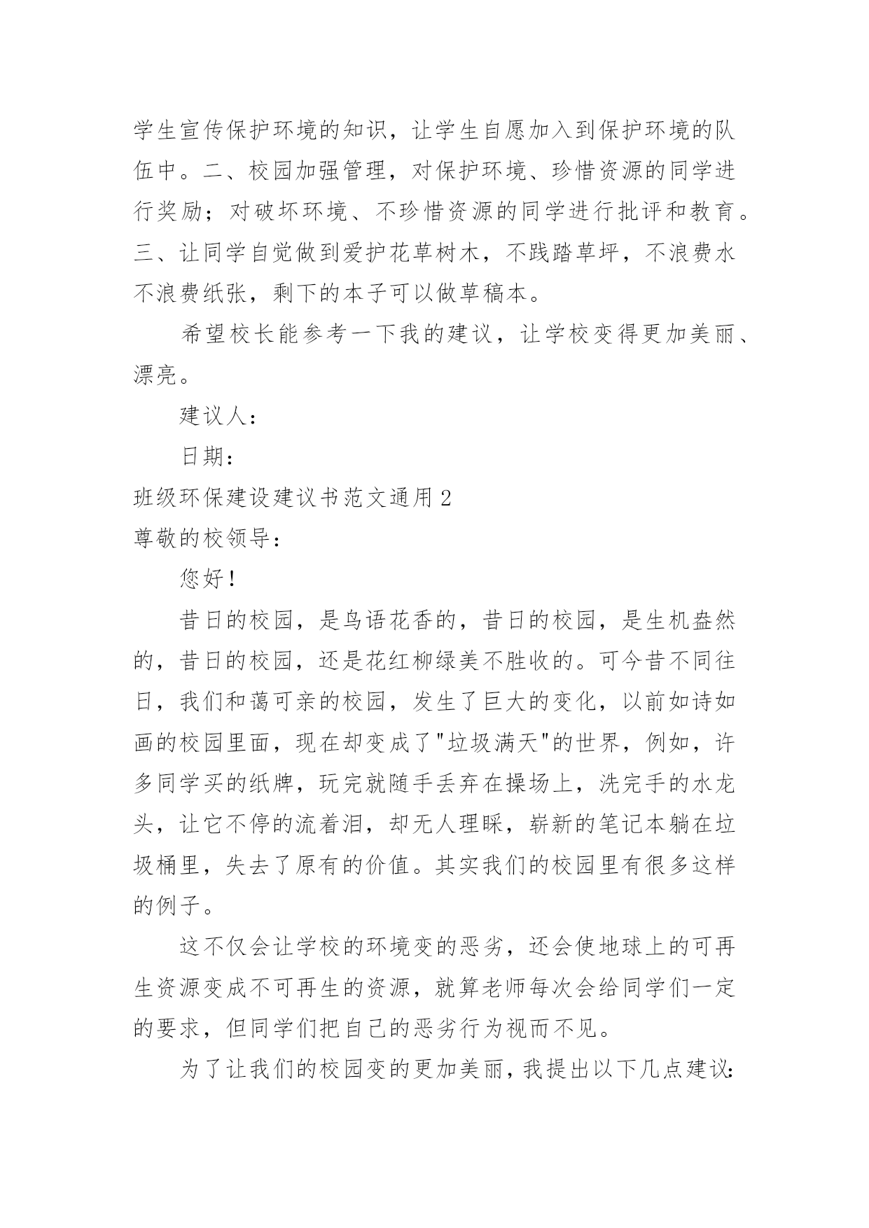 班级环保建设建议书班级环保建设建议书范文通用在发展不断提速的社会中,建议书的使用频率越来越高,建议书是单位或集体向有关单位或上级机关和领导,就某项工作提出某种建议时使用的一种常用书信。建议书的注意事项有许多,你确定会写吗?下面是小编整理的班级环保建设建议书范文通用,仅供参考,欢迎大家阅读。班级环保建设建议书范文通用1尊敬的校长:您好!我们的学校是一个漂亮的学校。有一个花坛,有草地,有聚满笑声的操场,周围的树木围满了整个操场。我在这个学校学习已有六年之久。虽然我们的学校很漂亮,但学校正面临着巨大的环境问题。例如有许多同学随便践踏草地,随手把花摘下然后到处乱扔,还把纸揉成一团扔在地上,旁边有垃圾桶却不仍。还有些同学上完厕所洗手不关水龙头,让水白白流了一上午;还有些同学写错字不用橡皮擦,而是直接撕掉扔在地上。像这样的破坏环境、不珍惜资源的事例还有很多。尊敬的校长,为了不让同学们把学校弄得面目全非,请看一下我提出的建议:一、多办一些保护环境的活动,告诉学生保护环境有多重要。也可以通过广播、黑板报等形式向学生宣传保护环境的知识,让学生自愿加入到保护环境的队伍中。二、校园加强管理,对保护环境、珍惜资源的同学进行奖励;对破坏环境、不珍惜资源的同学进行批评和教育。三、让同学自觉做到爱护花草树木,不践踏草坪,不浪费水不浪费纸张,剩下的本子可以做草稿本。希望校长能参考一下我的建议,让学校变得更加美丽、漂亮。建议人:日期:班级环保建设建议书范文通用2尊敬的校领导:您好!昔日的校园,是鸟语花香的,昔日的校园,是生机盎然的,昔日的校园,还是花红柳绿美不胜收的。可今昔不同往日,我们和蔼可亲的校园,发生了巨大的变化,以前如诗如画的校园里面,现在却变成了"垃圾满天"的世界,例如,许多同学买的纸牌,玩完就随手丢弃在操场上,洗完手的水龙头,让它不停的流着泪,却无人理睬,崭新的笔记本躺在垃圾桶里,失去了原有的价值。其实我们的校园里有很多这样的例子。这不仅会让学校的环境变的恶劣,还会使地球上的可再生资源变成不可再生的资源,就算老师每次会给同学们一定的要求,但同学们把自己的恶劣行为视而不见。为了让我们的校园变的更加美丽,我提出以下几点建议:1、通过书刊,广播等形式,向学生宣传保护环境的知识。2、每季可选出,优秀环保班级,优秀环保少年等。3、在校园中多建设一些垃圾桶,解决扔垃圾没有垃圾桶的问题。让我们一起"珍惜自然资源,共营生命绿色"。建议人:日期:班级环保建设建议书范文通用3亲爱的同学们:当你在这美丽的校园中学习,为我们美好的未来而努力着时,相信我们每一个同学都渴望有一个干净的.校园,渴望健康的生命,渴望绿色,渴望我们有一个良好的生活环境。学校是育人的场所,环境教育是提高我们思想道德素质和科学文化素质的基本手段之一,建立节约型和环境友好型校园,这不仅是学校自身发展的需要,更是我们中学生应有的社会责任,为了增强大家的环境保护意识,让校园、班级环境更加整洁靓丽,有利于创建绿色和谐的校园环境,我们"校园环保志愿者"活动小组恳切地向师生们提出如下倡议:1、树立绿色文明观念,自觉关心环境状况,把个人环保行为视为个人文明修养的组成部分。2、不乱扔垃圾,果皮纸屑,不随地吐痰,不随意采摘校园的一草一木,爱护公共绿地。3、爱护仪器、设备和公物,使设备始终保持完好状态,尽量减少损坏维修。4、节约用水,珍惜水资源,减少水污染;节约用电,做到人走灯灭,光线充足时不要开灯,避免"白昼灯"、"长明灯"的情况发生,微机室电脑用后及时关机。5、节约用纸,尽量少用餐巾纸,草稿纸等尽量两面用。6、生活节俭,不随意浪费粮食,不剩饭,培养良好的生活习惯。7、尽量少用塑料袋,尽量少用一次性的纸杯、塑料杯。8、从我做起,号召全校同学树立环保意识,为创建绿色和谐校园出自己的一份力。"历览前贤国与家,成由勤俭败由奢",中华民族历来倡导节约,父母老师也再三强调环境的保护,让我们义不容辞地承担各自的使命,树立环保意识,养成节约资源的习惯,从我做起,从现在做起,从点滴小事做起,为共建环境友好型的和谐校园而努力!班级环保建设建议书范文通用4尊敬的校领导:你们好!我是六年级三班的一名学生,在这个多姿多彩的学校里学习、生活已有六年之久。校园是授予我们知识、赋予我们欢乐的地方,每一个在这个美丽的校园里学习的学生都感到很快乐:因为这儿有伴随我们的小伙伴和我们一起学习、一起玩耍,学校里经常开展一些有意义的活动,让我们大家都能积极参与到其中来。校园里的景色也美不胜收:大门台阶上摆放着一盆盆美丽含香的花儿,每当我们走近校园,那些花儿都对我们笑,让我们感到无比的舒心和愉快。教学楼下的"米老鼠"花坛里,松树的枝叶无比繁茂,小草生机勃勃、富有活力,让校园中的每一个同学玩得开心,生活也开心。可是,我们在打扫公共场地的过程中经常发现:原本美丽