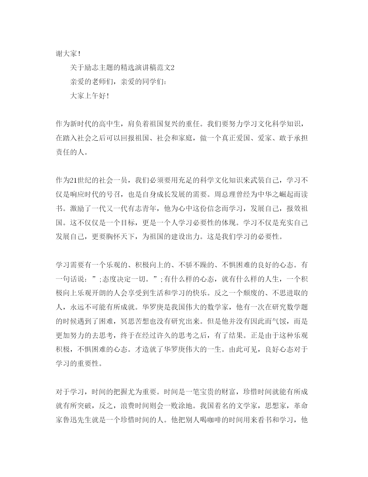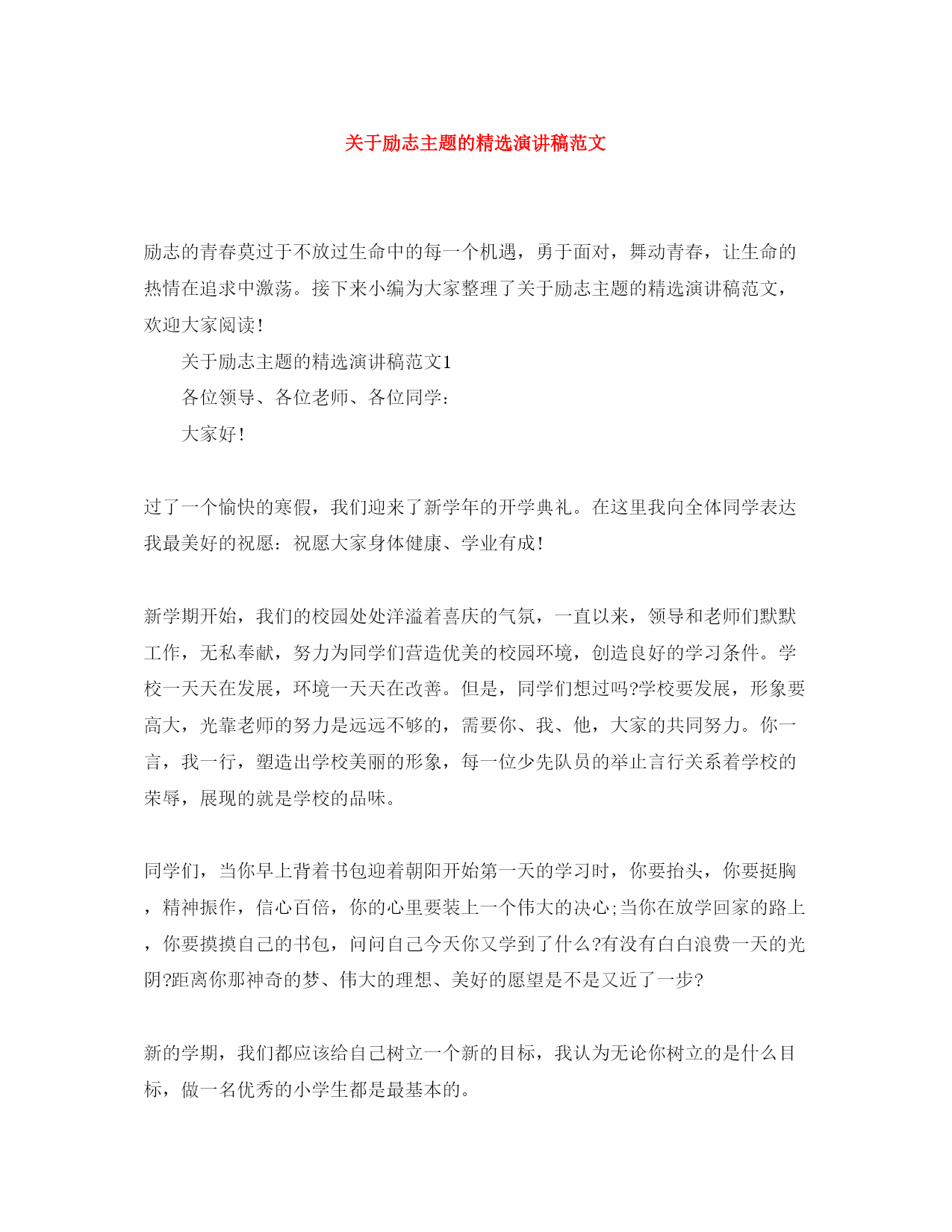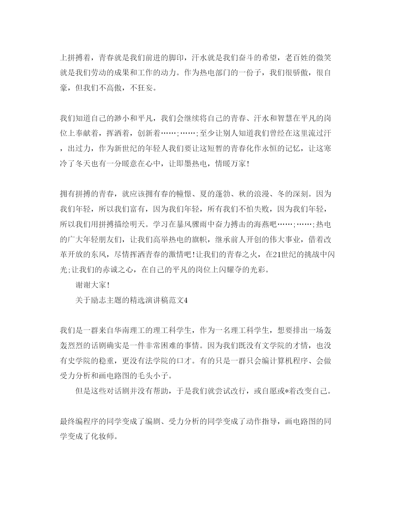 此资料由网络收集而来,如有侵权请告知上传者立即删除。资料共分享,我们负责传递知识。关于励志主题的精选演讲稿范文励志的青春莫过于不放过生命中的每一个机遇,勇于面对,舞动青春,让生命的热情在追求中激荡。接下来小编为大家整理了关于励志主题的精选演讲稿范文,欢迎大家阅读!关于励志主题的精选演讲稿范文1各位领导、各位老师、各位同学:大家好!过了一个愉快的寒假,我们迎来了新学年的开学典礼。在这里我向全体同学表达我最美好的祝愿:祝愿大家身体健康、学业有成!新学期开始,我们的校园处处洋溢着喜庆的气氛,一直以来,领导和老师们默默工作,无私奉献,努力为同学们营造优美的校园环境,创造良好的学习条件。学校一天天在发展,环境一天天在改善。但是,同学们想过吗?学校要发展,形象要高大,光靠老师的努力是远远不够的,需要你、我、他,大家的共同努力。你一言,我一行,塑造出学校美丽的形象,每一位少先队员的举止言行关系着学校的荣辱,展现的就是学校的品味。同学们,当你早上背着书包迎着朝阳开始第一天的学习时,你要抬头,你要挺胸,精神振作,信心百倍,你的心里要装上一个伟大的决心;当你在放学回家的路上,你要摸摸自己的书包,问问自己今天你又学到了什么?有没有白白浪费一天的光阴?距离你那神奇的梦、伟大的理想、美好的愿望是不是又近了一步?新的学期,我们都应该给自己树立一个新的目标,我认为无论你树立的是什么目标,做一名优秀的小学生都是最基本的。要想成为优秀小学生,首先要养成良好的习惯,培养良好的品德。要做到这一点很简单,只要你多从小事做起,不疏忽每一次考验就行了。当你看见地上有一张果皮时,你将它捡起来,然后放入垃圾桶,这时你就很优秀了;当你看到水龙头没有拧紧时,你过去把它拧紧,这时你就很优秀了;当你看见地上的钱物时,你捡起来然后还给失主,这时你就很优秀了;当你早晨遇见老师时,问候老师一声,老师,您早,这时你就很优秀了;当有同学不小心委屈了你,你用微笑去对待别人的过错,这时你就很优秀了。同学们,你们想,这不是很简单吗?其实,高尚的品德和良好的习惯就是这样慢慢从小事培养起来的。要成为一名优秀的小学生,需要成绩不断进步。其实,做到这点也不难,只要你有端正的学习态度和好的学习方法就可以了。每一次你都认真听讲,认真做作业,你的成绩就可以提高了;每次上课前你都预习功课,每一次下课后你都巩固复习,你的成绩就可以提高了;每一次体育课你都认真锻炼,每一次活动你都积极参加,你的成绩一样可以提高。同学们,你们想,这不是很简单吗?不断进步的成绩不就是辛勤的劳动和端正的态度换来的吗?做一名小学生还需要自信。自信是成功的秘诀,你们要用”;天生我才必有用”;这句名言来激励自己,有了信心,你就够胆去奋斗,去拼搏。最后,做一名小学生,还需要勇敢。勇敢地面对一切困难和挫折。在挫折面前你需要勇敢地笑,你应该在困难和挫折中找寻希望,在失败中总结经验教训,请相信”;雨后见彩虹,败后见成功”;这个哲理。同学们,让我们跟着春天,拿起小画笔,把生活描绘得更美丽。让我们放飞心灵,展开歌喉,共唱一首春天的歌。最后祝愿同学们在新的起点,新的航程中扬起前进的风帆,取得更优异的成绩!谢谢大家!关于励志主题的精选演讲稿范文2亲爱的老师们,亲爱的同学们:大家上午好!作为新时代的高中生,肩负着祖国复兴的重任。我们要努力学习文化科学知识,在踏入社会之后可以回报祖国、社会和家庭,做一个真正爱国、爱家、敢于承担责任的人。作为21世纪的社会一员,我们必须要用充足的科学文化知识来武装自己,学习不仅是响应时代的号召,也是自身成长发展的需要。周总理曾经为中华之崛起而读书。激励了一代又一代有志青年,他为心中这份信念而学习,发展自己,报效祖国。这不仅仅是一个目标,更是一个人学习必要性的体现。学习不仅是充实自己发展自己,更要胸怀天下,为祖国的建设出力。这是我们学习的必要性。学习需要有一个乐观的、积极向上的、不骄不躁的、不惧困难的良好的心态。有一句话说:”;态度决定一切。”;有什么样的心态,就有什么样的人生,一个积极向上乐观开朗的人会享受到生活和学习的快乐。反之一个颓废的、不思进取的人,永远不可能有所成就。华罗庚是我国伟大的数学家,他有一次在研究数学题的时候遇到了困难,冥思苦想也没有研究出来。但是他并没有因此而气馁,而是更加努力的去思考,终于在经过许久的思考之后,有了结果。正是由于这种乐观积极,不惧困难的心态。才造就了华罗庚伟大的一生。由此可见,良好心态对于学习的重要性。对于学习,时间的把握尤为重要。时间是一笔宝贵的财富,珍惜时间就能有所成就有所突破,反之,浪费时间则会一败涂地。我国着名的文学家,思想家,革命家鲁迅先生就是一个珍惜时间的人。他把别人喝咖啡的时间用来看书和学习,他曾说过”;时间,就像海绵里的水,只要你挤,总是有