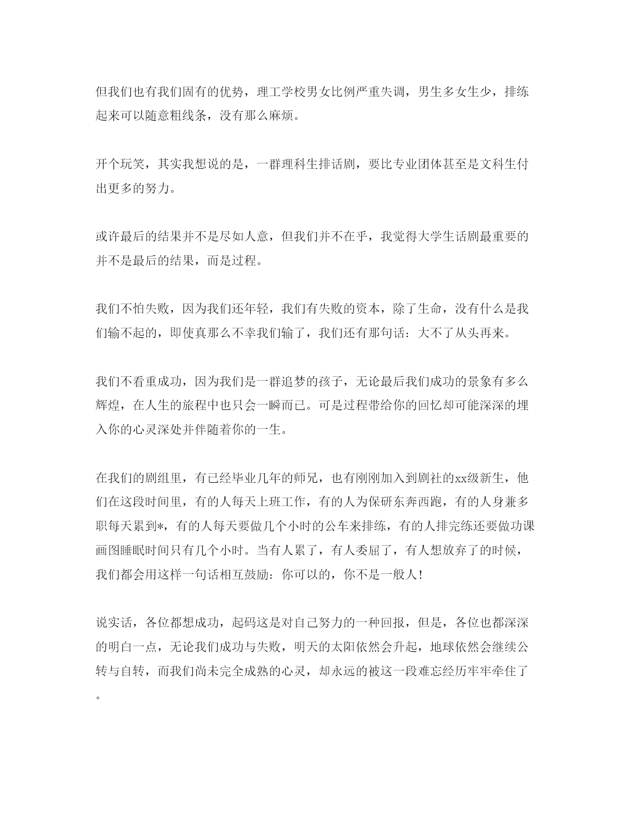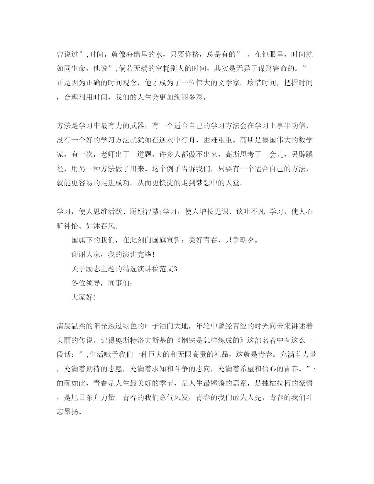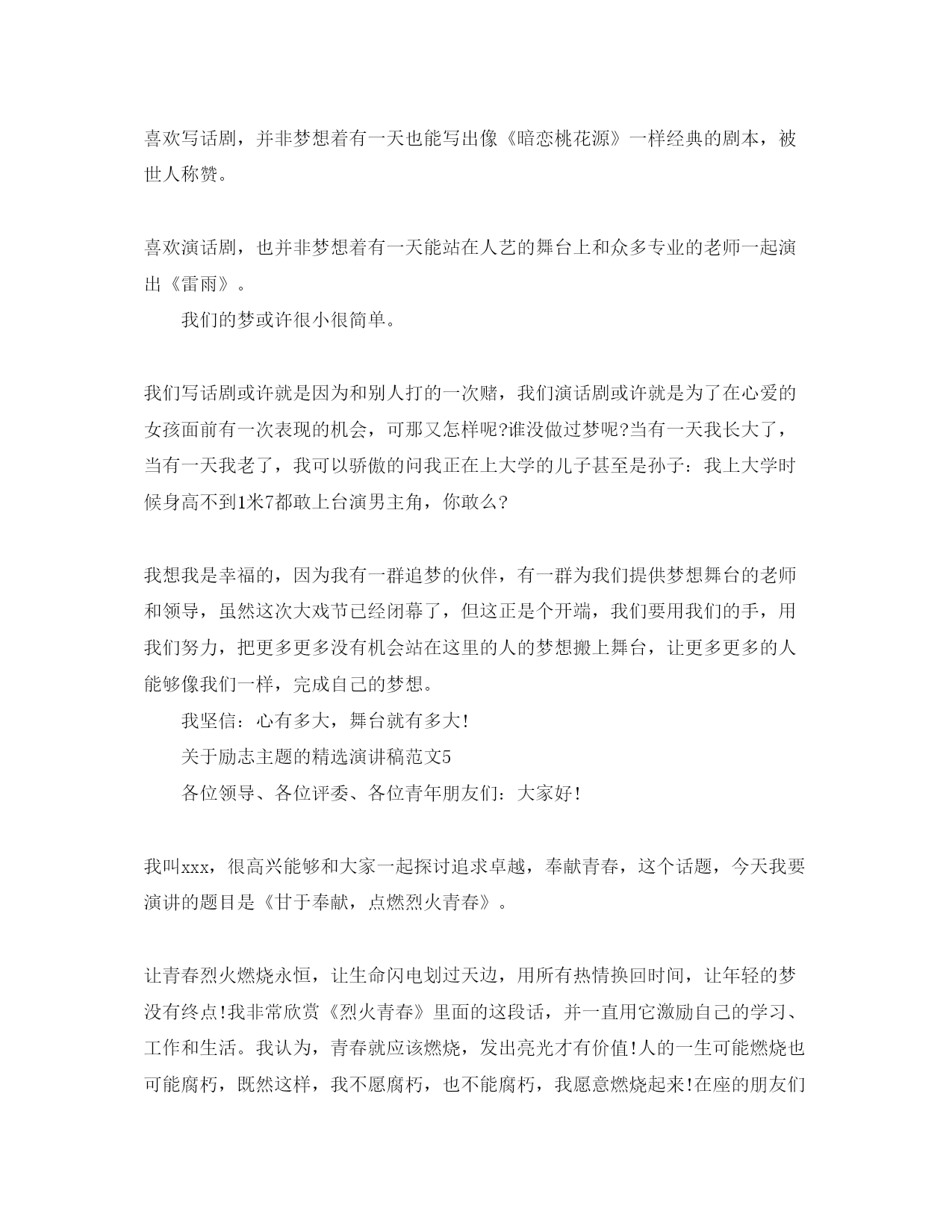 此资料由网络收集而来,如有侵权请告知上传者立即删除。资料共分享,我们负责传递知识。关于励志主题的精选演讲稿范文励志的青春莫过于不放过生命中的每一个机遇,勇于面对,舞动青春,让生命的热情在追求中激荡。接下来小编为大家整理了关于励志主题的精选演讲稿范文,欢迎大家阅读!关于励志主题的精选演讲稿范文1各位领导、各位老师、各位同学:大家好!过了一个愉快的寒假,我们迎来了新学年的开学典礼。在这里我向全体同学表达我最美好的祝愿:祝愿大家身体健康、学业有成!新学期开始,我们的校园处处洋溢着喜庆的气氛,一直以来,领导和老师们默默工作,无私奉献,努力为同学们营造优美的校园环境,创造良好的学习条件。学校一天天在发展,环境一天天在改善。但是,同学们想过吗?学校要发展,形象要高大,光靠老师的努力是远远不够的,需要你、我、他,大家的共同努力。你一言,我一行,塑造出学校美丽的形象,每一位少先队员的举止言行关系着学校的荣辱,展现的就是学校的品味。同学们,当你早上背着书包迎着朝阳开始第一天的学习时,你要抬头,你要挺胸,精神振作,信心百倍,你的心里要装上一个伟大的决心;当你在放学回家的路上,你要摸摸自己的书包,问问自己今天你又学到了什么?有没有白白浪费一天的光阴?距离你那神奇的梦、伟大的理想、美好的愿望是不是又近了一步?新的学期,我们都应该给自己树立一个新的目标,我认为无论你树立的是什么目标,做一名优秀的小学生都是最基本的。要想成为优秀小学生,首先要养成良好的习惯,培养良好的品德。要做到这一点很简单,只要你多从小事做起,不疏忽每一次考验就行了。当你看见地上有一张果皮时,你将它捡起来,然后放入垃圾桶,这时你就很优秀了;当你看到水龙头没有拧紧时,你过去把它拧紧,这时你就很优秀了;当你看见地上的钱物时,你捡起来然后还给失主,这时你就很优秀了;当你早晨遇见老师时,问候老师一声,老师,您早,这时你就很优秀了;当有同学不小心委屈了你,你用微笑去对待别人的过错,这时你就很优秀了。同学们,你们想,这不是很简单吗?其实,高尚的品德和良好的习惯就是这样慢慢从小事培养起来的。要成为一名优秀的小学生,需要成绩不断进步。其实,做到这点也不难,只要你有端正的学习态度和好的学习方法就可以了。每一次你都认真听讲,认真做作业,你的成绩就可以提高了;每次上课前你都预习功课,每一次下课后你都巩固复习,你的成绩就可以提高了;每一次体育课你都认真锻炼,每一次活动你都积极参加,你的成绩一样可以提高。同学们,你们想,这不是很简单吗?不断进步的成绩不就是辛勤的劳动和端正的态度换来的吗?做一名小学生还需要自信。自信是成功的秘诀,你们要用”;天生我才必有用”;这句名言来激励自己,有了信心,你就够胆去奋斗,去拼搏。最后,做一名小学生,还需要勇敢。勇敢地面对一切困难和挫折。在挫折面前你需要勇敢地笑,你应该在困难和挫折中找寻希望,在失败中总结经验教训,请相信”;雨后见彩虹,败后见成功”;这个哲理。同学们,让我们跟着春天,拿起小画笔,把生活描绘得更美丽。让我们放飞心灵,展开歌喉,共唱一首春天的歌。最后祝愿同学们在新的起点,新的航程中扬起前进的风帆,取得更优异的成绩!谢谢大家!关于励志主题的精选演讲稿范文2亲爱的老师们,亲爱的同学们:大家上午好!作为新时代的高中生,肩负着祖国复兴的重任。我们要努力学习文化科学知识,在踏入社会之后可以回报祖国、社会和家庭,做一个真正爱国、爱家、敢于承担责任的人。作为21世纪的社会一员,我们必须要用充足的科学文化知识来武装自己,学习不仅是响应时代的号召,也是自身成长发展的需要。周总理曾经为中华之崛起而读书。激励了一代又一代有志青年,他为心中这份信念而学习,发展自己,报效祖国。这不仅仅是一个目标,更是一个人学习必要性的体现。学习不仅是充实自己发展自己,更要胸怀天下,为祖国的建设出力。这是我们学习的必要性。学习需要有一个乐观的、积极向上的、不骄不躁的、不惧困难的良好的心态。有一句话说:”;态度决定一切。”;有什么样的心态,就有什么样的人生,一个积极向上乐观开朗的人会享受到生活和学习的快乐。反之一个颓废的、不思进取的人,永远不可能有所成就。华罗庚是我国伟大的数学家,他有一次在研究数学题的时候遇到了困难,冥思苦想也没有研究出来。但是他并没有因此而气馁,而是更加努力的去思考,终于在经过许久的思考之后,有了结果。正是由于这种乐观积极,不惧困难的心态。才造就了华罗庚伟大的一生。由此可见,良好心态对于学习的重要性。对于学习,时间的把握尤为重要。时间是一笔宝贵的财富,珍惜时间就能有所成就有所突破,反之,浪费时间则会一败涂地。我国着名的文学家,思想家,革命家鲁迅先生就是一个珍惜时间的人。他把别人喝咖啡的时间用来看书和学习,他曾说过”;时间,就像海绵里的水,只要你挤,总是有