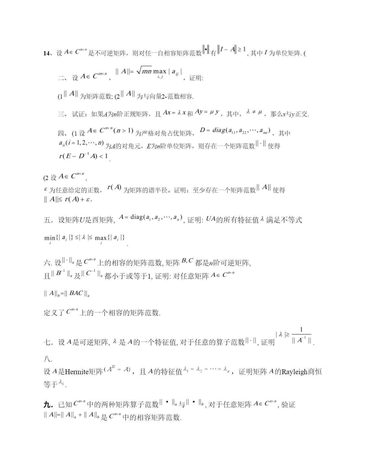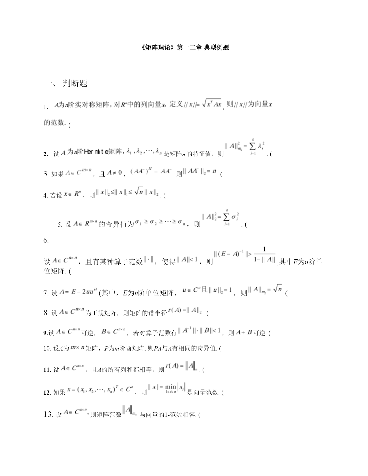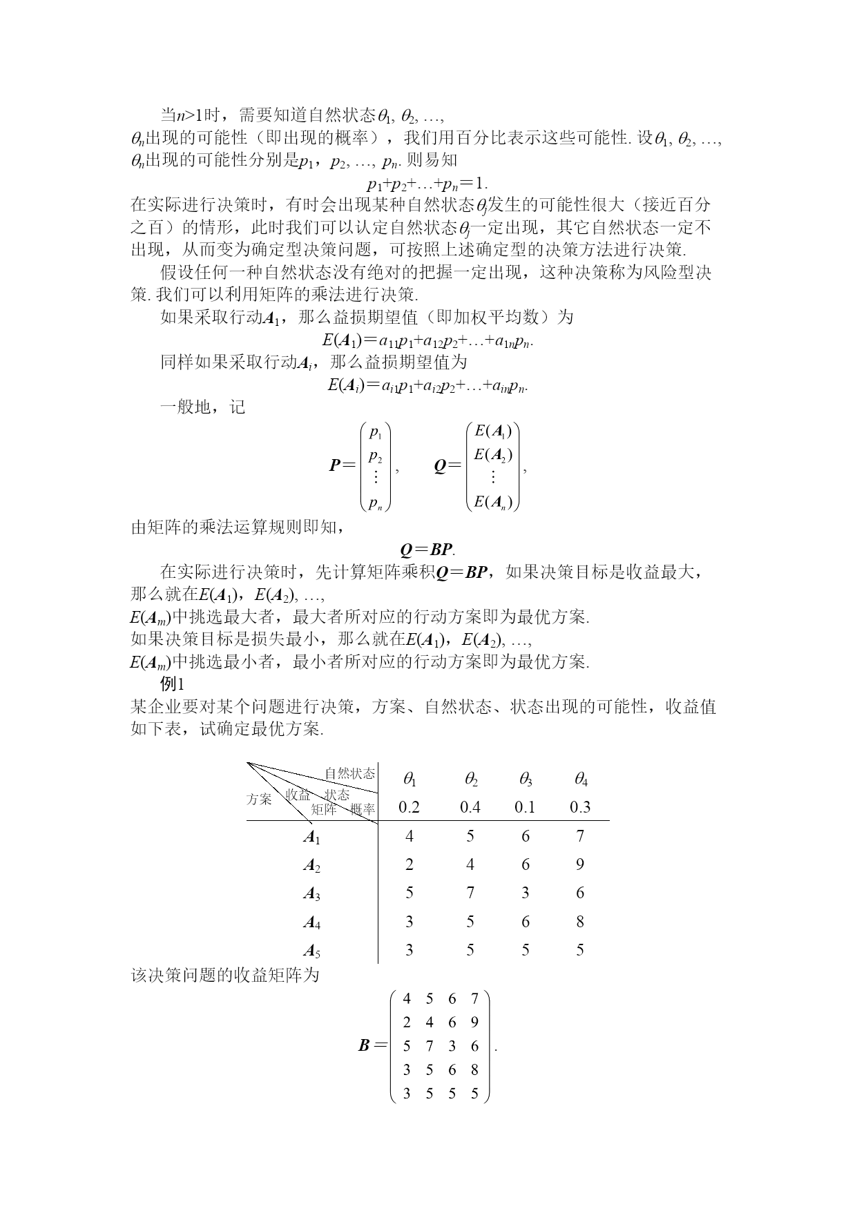 矩阵理论第一二章典型例题(完整版)实用资料(可以直接使用,可编辑完整版实用资料,欢迎下载)《矩阵理论》第一二章典型例题一、判断题1.,(2.设是矩阵A的特征值,则.(3.如果,且,,则.(4.若设,则.(5.设的奇异值为,则.(6.设,且有某种算子范数,使得,则,其中E为n阶单位矩阵.(7.设(其中,E为n阶单位矩阵,,则(8.设为正规矩阵,则矩阵的谱半径.(9.设可逆,,若对算子范数有,则可逆.(10.设A为矩阵,P为m阶酉矩阵,则PA与A有相同的奇异值.(11.设,且A的所有列和都相等,则.(12.如果,则是向量范数.(13.设则矩阵范数与向量的1-范数相容.(14、设是不可逆矩阵,则对任一自相容矩阵范数有,其中为单位矩阵.(二、设,,证明:(1为矩阵范数;(2为与向量2-范数相容.三、试证:如果A为n阶正规矩阵,且和,其中,,那么x与y正交.四、(1设为严格对角占优矩阵,,其中为A的对角元,E为n阶单位矩阵,则存在一个矩阵范数使得.(2设,为任意给定的正数,为矩阵的谱半径。证明:至少存在一个矩阵范数使得五.设矩阵U是酉矩阵,,证明:的所有特征值满足不等式.六.设是上的相容的矩阵范数,矩阵都是n阶可逆矩阵,且及都小于或等于1,证明:对任意矩阵定义了上的一个相容的矩阵范数.七.设是可逆矩阵,是的一个特征值,对于任意的算子范数,证明.八.设是Hermite矩阵,且的特征值,证明矩阵的Rayleigh商恒等于.九.已知中的两种矩阵算子范数与,对于任意矩阵,验证是中的相容矩阵范数.十.设矩阵的非零奇异值为(,求证十一.设矩阵可逆,矩阵范数是上的向量范数诱导出的算子范数,令,证明:.证明:根据算子范数的定义,有,,结论成立.十二.设矩阵为单纯矩阵,证明:的特征值都是实数的充分必要条件是存在正定矩阵,使得为Hermite矩阵.十三.(1设矩阵,则是矩阵范数.(2设,矩阵,求.*§2.5矩阵在决策理论中的应用所谓决策,就是根据预定目标,作出行动的选择.从狭义上解释,决策是在若干个指导行动的方案中作出相对最优的选择.科学的决策必须严格实行科学的决策程序,运用科学的思维方法与决策方法.决策可利用的数学方法很多,这里我们只介绍矩阵在决策中的简单应用.决策者为了达到所希望的目标(例如收益较大或损失较小等),可以采用多种行动方案.许多决策问题都面临着若干种不依决策者主观意志为转移的客观条件或客观现实,我们称为自然状态.例如,投资者将一笔资金投入生产时,有明确的目标,即要使得收益最大.投资者可以采取的方案也有多种,例如投资房地产,投资汽车生产,投资家用计算机生产,投资彩电生产,等等.上述方案即为投资者的行动方案,投资者将在上述方案中选择一种能使收益最大的投资方案.然而不管投资者选择何种方案,将来的产品销售及市场行情都有可能出现好、一般、不好三种情形,这三种情形即为投资者所面临的不依投资者主观意志为转移的自然状态.设决策者可以选择的行动方案的集合为{A1,A2,…,Am},所有的自然状态构成的集合为{1,2,…,n},再设决策者采用行动方案Ai,而自然状态是j时,决策者的益损(收益或损失)值为aij,则可以列出下表:自然状态益损值行动方案12…nA1a11a12…a1nA2a21a22…a2n…………Amam1am2…amn我们可以把上述益损值写成如下的矩阵形式:12…n称此矩阵为益损矩阵(或风险矩阵),记为B或Bmn当n=1时,即自然状态只有一种,这时的决策问题比较简单,称之为确定型决策.决策者只需根据决策的目标(例如收益最大或损失最小)而选择a11,a21,…,am1中的最大者或最小者所对应的行动方案.当B是收益矩阵时,选择最大数对应的行动方案,当B是损失矩阵时,选择最小数对应的行动方案.当n>1时,需要知道自然状态1,2,…,n出现的可能性(即出现的概率),我们用百分比表示这些可能性.设1,2,…,n出现的可能性分别是p1,p2,…,pn.则易知p1+p2+…+pn=1.在实际进行决策时,有时会出现某种自然状态j发生的可能性很大(接近百分之百)的情形,此时我们可以认定自然状态j一定出现,其它自然状态一定不出现,从而变为确定型决策问题,可按照上述确定型的决策方法进行决策.假设任何一种自然状态没有绝对的把握一定出现,这种决策称为风险型决策.我们可以利用矩阵的乘法进行决策.如果采取行动A1,那么益损期望值(即加权平均数)为E(A1)=a11p1+a12p2+…+a1npn.同样如果采取行动Ai,那么益损期望值为E(Ai)=ai1p1+ai2p2+…+ainpn.一般地,记P=