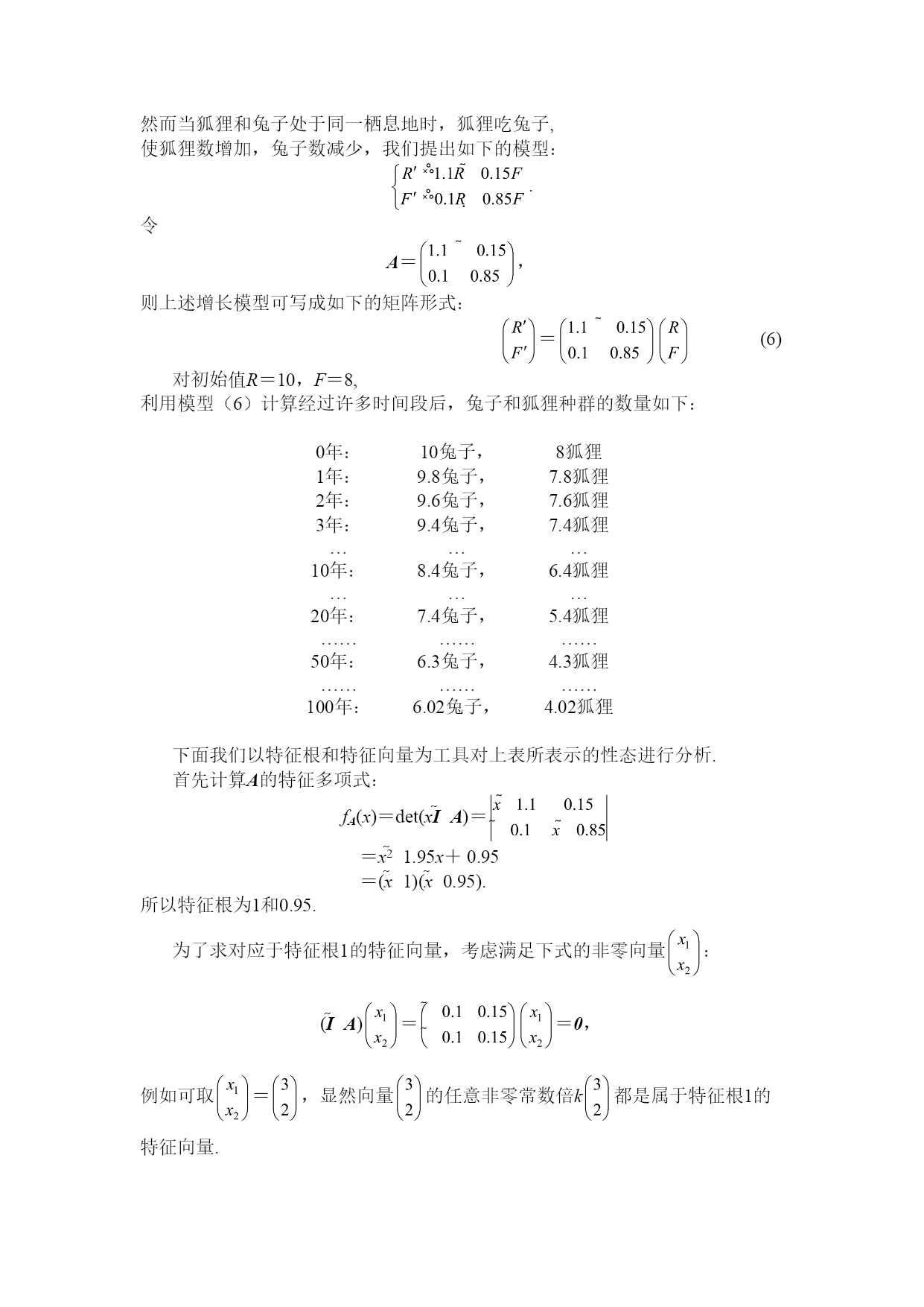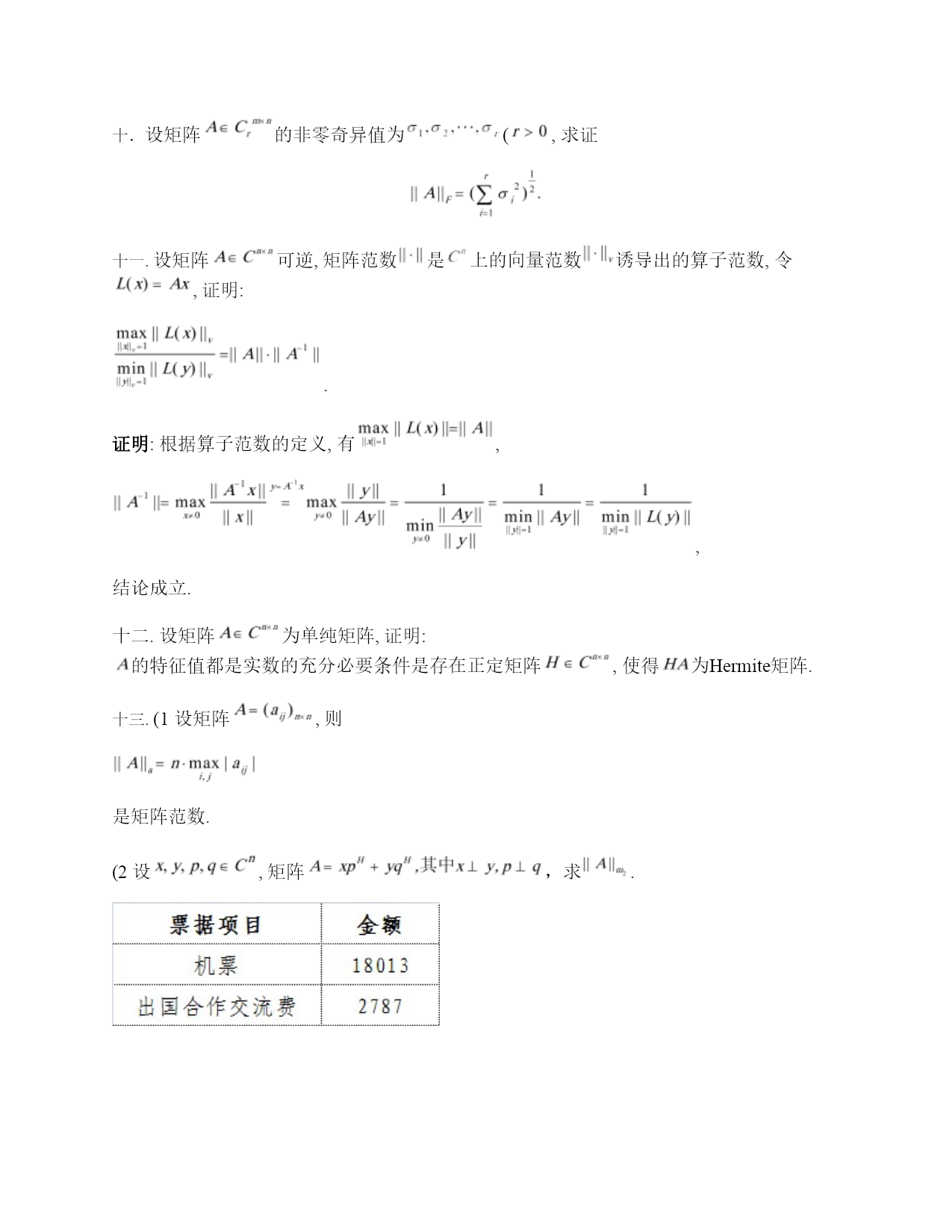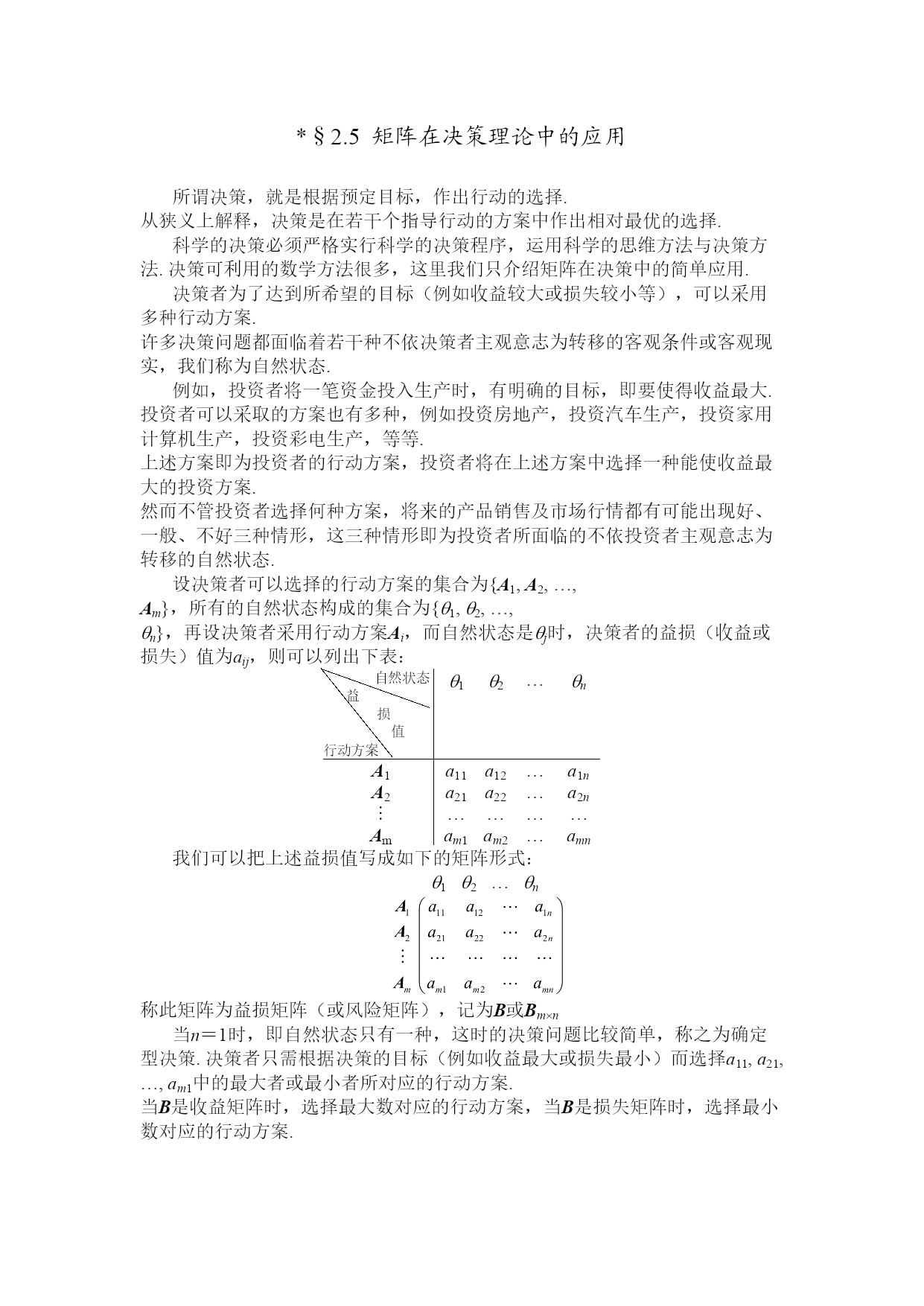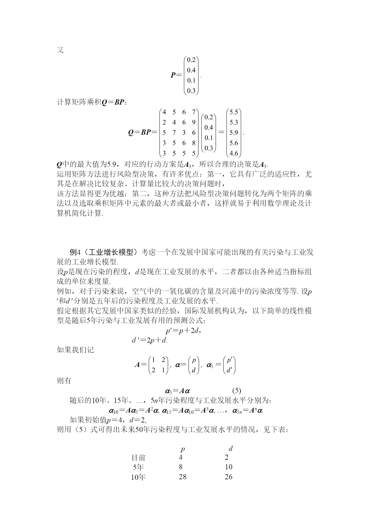 矩阵理论第一二章典型例题(完整版)实用资料(可以直接使用,可编辑完整版实用资料,欢迎下载)《矩阵理论》第一二章典型例题一、判断题1.,(2.设是矩阵A的特征值,则.(3.如果,且,,则.(4.若设,则.(5.设的奇异值为,则.(6.设,且有某种算子范数,使得,则,其中E为n阶单位矩阵.(7.设(其中,E为n阶单位矩阵,,则(8.设为正规矩阵,则矩阵的谱半径.(9.设可逆,,若对算子范数有,则可逆.(10.设A为矩阵,P为m阶酉矩阵,则PA与A有相同的奇异值.(11.设,且A的所有列和都相等,则.(12.如果,则是向量范数.(13.设则矩阵范数与向量的1-范数相容.(14、设是不可逆矩阵,则对任一自相容矩阵范数有,其中为单位矩阵.(二、设,,证明:(1为矩阵范数;(2为与向量2-范数相容.三、试证:如果A为n阶正规矩阵,且和,其中,,那么x与y正交.四、(1设为严格对角占优矩阵,,其中为A的对角元,E为n阶单位矩阵,则存在一个矩阵范数使得.(2设,为任意给定的正数,为矩阵的谱半径。证明:至少存在一个矩阵范数使得五.设矩阵U是酉矩阵,,证明:的所有特征值满足不等式.六.设是上的相容的矩阵范数,矩阵都是n阶可逆矩阵,且及都小于或等于1,证明:对任意矩阵定义了上的一个相容的矩阵范数.七.设是可逆矩阵,是的一个特征值,对于任意的算子范数,证明.八.设是Hermite矩阵,且的特征值,证明矩阵的Rayleigh商恒等于.九.已知中的两种矩阵算子范数与,对于任意矩阵,验证是中的相容矩阵范数.十.设矩阵的非零奇异值为(,求证十一.设矩阵可逆,矩阵范数是上的向量范数诱导出的算子范数,令,证明:.证明:根据算子范数的定义,有,,结论成立.十二.设矩阵为单纯矩阵,证明:的特征值都是实数的充分必要条件是存在正定矩阵,使得为Hermite矩阵.十三.(1设矩阵,则是矩阵范数.(2设,矩阵,求.*§2.5矩阵在决策理论中的应用所谓决策,就是根据预定目标,作出行动的选择.从狭义上解释,决策是在若干个指导行动的方案中作出相对最优的选择.科学的决策必须严格实行科学的决策程序,运用科学的思维方法与决策方法.决策可利用的数学方法很多,这里我们只介绍矩阵在决策中的简单应用.决策者为了达到所希望的目标(例如收益较大或损失较小等),可以采用多种行动方案.许多决策问题都面临着若干种不依决策者主观意志为转移的客观条件或客观现实,我们称为自然状态.例如,投资者将一笔资金投入生产时,有明确的目标,即要使得收益最大.投资者可以采取的方案也有多种,例如投资房地产,投资汽车生产,投资家用计算机生产,投资彩电生产,等等.上述方案即为投资者的行动方案,投资者将在上述方案中选择一种能使收益最大的投资方案.然而不管投资者选择何种方案,将来的产品销售及市场行情都有可能出现好、一般、不好三种情形,这三种情形即为投资者所面临的不依投资者主观意志为转移的自然状态.设决策者可以选择的行动方案的集合为{A1,A2,…,Am},所有的自然状态构成的集合为{1,2,…,n},再设决策者采用行动方案Ai,而自然状态是j时,决策者的益损(收益或损失)值为aij,则可以列出下表:自然状态益损值行动方案12…nA1a11a12…a1nA2a21a22…a2n…………Amam1am2…amn我们可以把上述益损值写成如下的矩阵形式:12…n称此矩阵为益损矩阵(或风险矩阵),记为B或Bmn当n=1时,即自然状态只有一种,这时的决策问题比较简单,称之为确定型决策.决策者只需根据决策的目标(例如收益最大或损失最小)而选择a11,a21,…,am1中的最大者或最小者所对应的行动方案.当B是收益矩阵时,选择最大数对应的行动方案,当B是损失矩阵时,选择最小数对应的行动方案.当n>1时,需要知道自然状态1,2,…,n出现的可能性(即出现的概率),我们用百分比表示这些可能性.设1,2,…,n出现的可能性分别是p1,p2,…,pn.则易知p1+p2+…+pn=1.在实际进行决策时,有时会出现某种自然状态j发生的可能性很大(接近百分之百)的情形,此时我们可以认定自然状态j一定出现,其它自然状态一定不出现,从而变为确定型决策问题,可按照上述确定型的决策方法进行决策.假设任何一种自然状态没有绝对的把握一定出现,这种决策称为风险型决策.我们可以利用矩阵的乘法进行决策.如果采取行动A1,那么益损期望值(即加权平均数)为E(A1)=a11p1+a12p2+…+a1npn.同样如果采取行动Ai,那么益损期望值为E(Ai)=ai1p1+ai2p2+…+ainpn.一般地,记P=