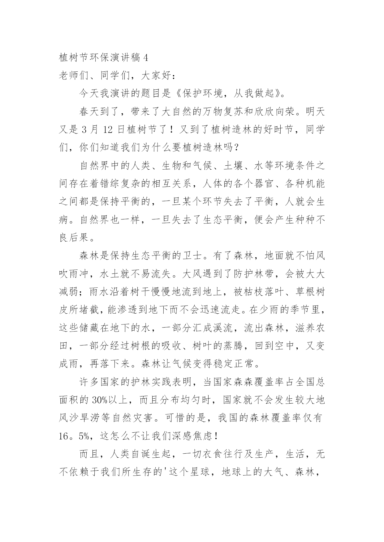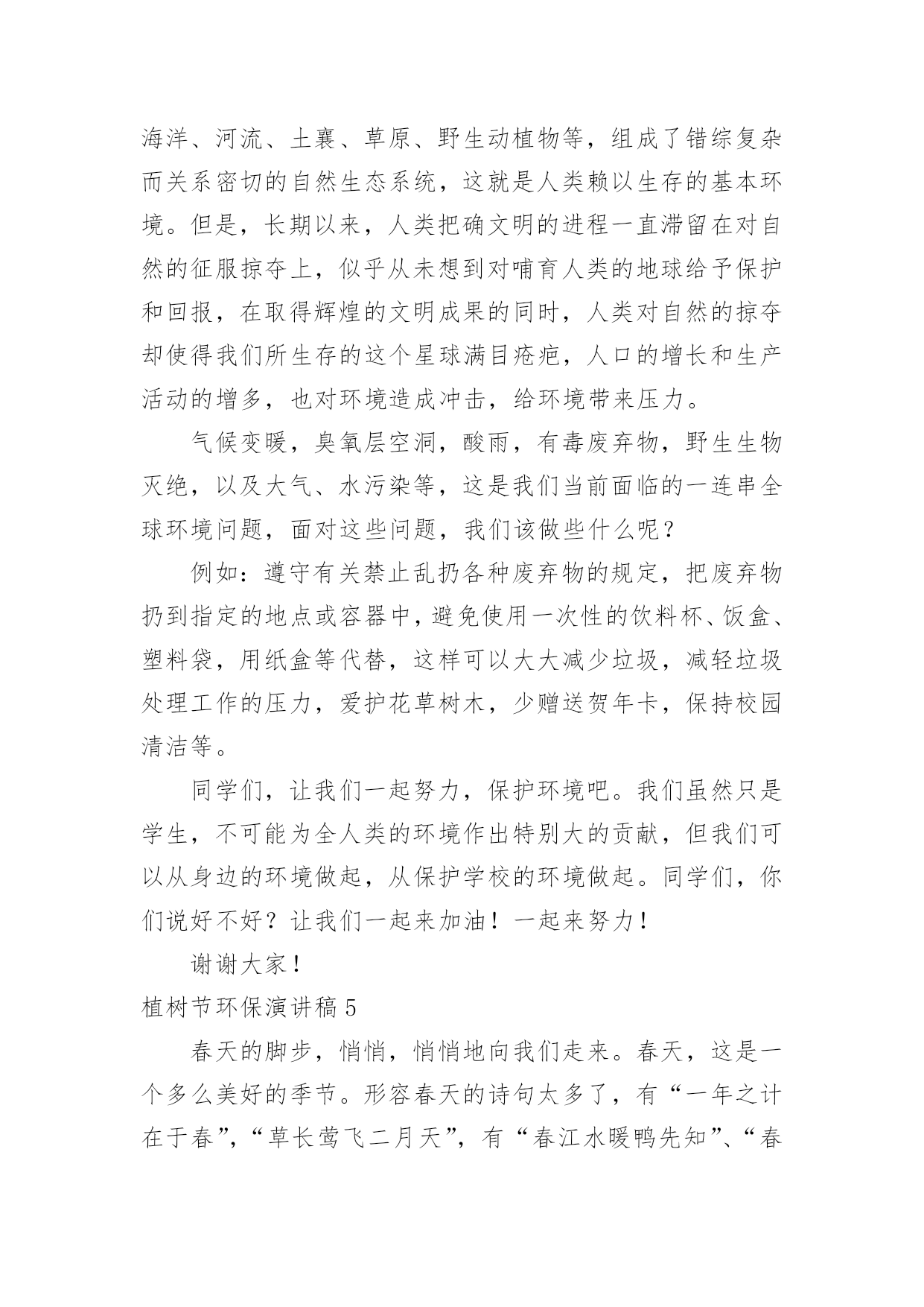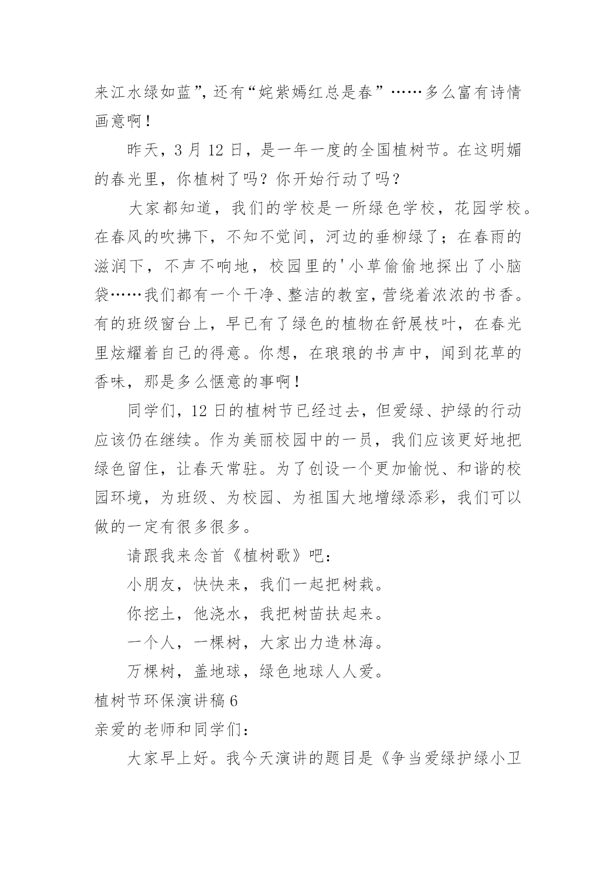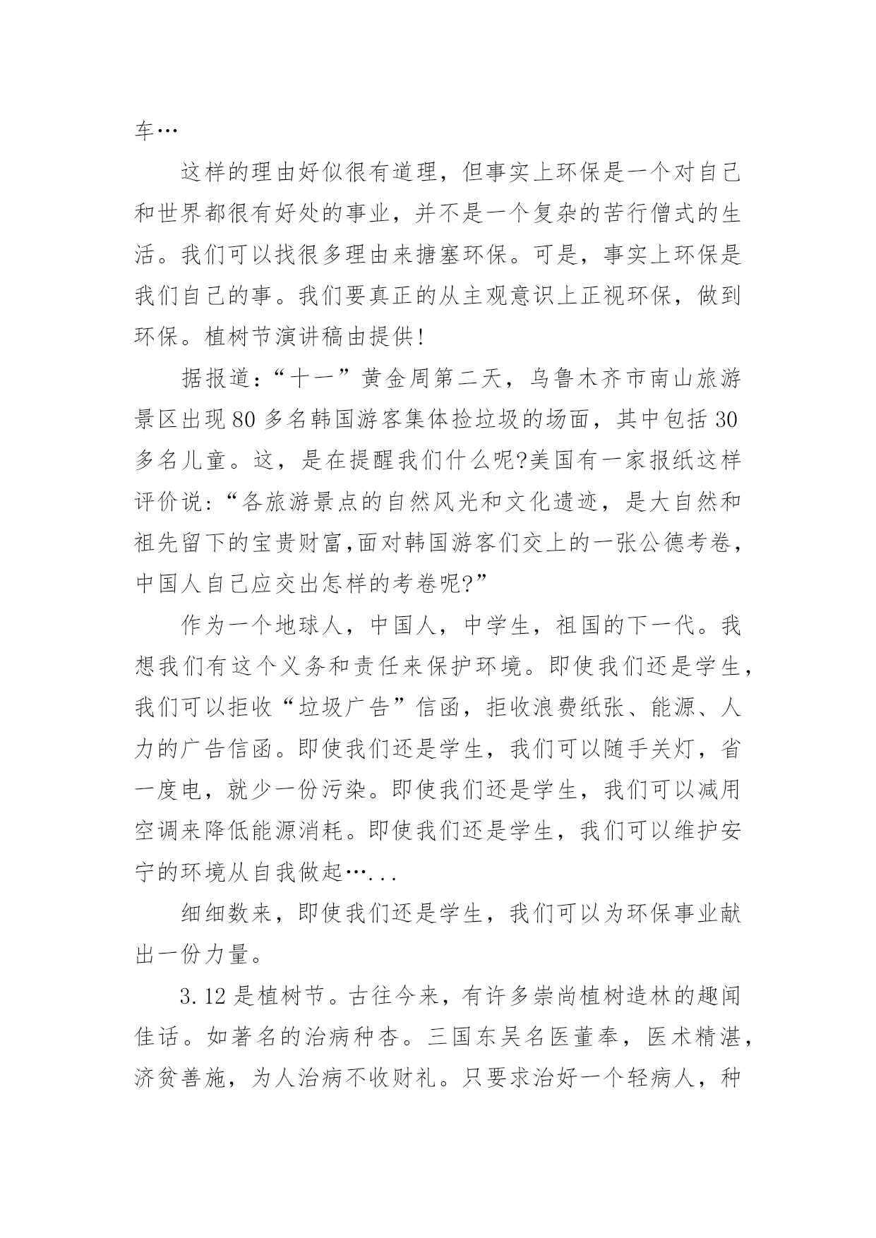 植树节环保演讲稿植树节环保演讲稿13篇演讲稿的格式由称谓、开场白、主干、结尾等几部分组成。在日新月异的现代社会中,演讲稿应用范围愈来愈广泛,相信很多朋友都对写演讲稿感到非常苦恼吧,下面是小编收集整理的植树节环保演讲稿,希望能够帮助到大家。植树节环保演讲稿1同学们大家好:今天是植树节,我们中华民族自古就有“爱树、育树”的传统。爱白杨的挺拔,癌症治疗爱垂柳的柔美。爱松树不屈的风骨。除了这种精神的寄托外,人们更看重它的实用价值。有了树,才会有和谐美丽的大自然;有了树,才有清爽、新鲜的空气;有了树,才会有高楼、房屋和铁路。树,它不仅能防风固沙,保持水土,还能美化环境,是城市的忠诚卫士,它用它特有的颜色为城市披上绿色的新装。这个忠诚的城市卫士,为了美化城市,还真做了不少的“工作”呢!比如绿树进行光合作用,提供人类呼吸所需的氧气。它还是吸收氮气、二氧化碳、臭氧的天然净化物,并且具有调节空气温度、湿度,吸粉尘、噪音等功能。所有这些,都使人们高度重视绿树的作用。于是才有了这一年一度的.绿色节日——植树节。如今,植树造林已成为民族风尚,绿化家园成为时代的追求。同学们,在植树节到来之前也要积极行动起来,在校内保护花草,给花坛里的小花浇一点水,给操场上的小树培一培土,一起来美化绿化我们的校园。除此之外我们同学更要争做绿化宣传员、环保小卫士,要爱护我们校园中的一草一木,爱护我们这个城市中的一草一木。植树节环保演讲稿2说起环保,我们都知道它是一个众所周知且永恒的话题。环境保护已经成为我们生活中密不可分的一点。报纸上,电视上,马路上到处都有人们呼吁环保的足迹。而我们赖以生存的地球现在的情况到底怎样了呢?全球变暖无疑是一个炙手可热的问题。据报道:在未来一百年内全球气温将升高1.5至6摄氏度,海平面将升高15至95厘米,沙漠将更干燥,气候将更恶劣,厄尔尼诺现象将更严重,全球变暖将直接或间接影响数以亿计人们的生活。近年来土地沙漠化日益严重,河水污染日益增多,而对于这些,我们,势单力薄的中学生,难道只能眼睁睁的看着吗?作为一个普通人,我相信没有一个会反对环保。而普遍人们却都把环保定义为:到处是绿的树,清的水。而这些,似乎都是国家要管的大事情,不是一个人两个人就能做起来的事。有一本杂志上说:“环保就这样有了坐享其成的色彩,那些不反对环保的人实际上并没为环保做些什么。”人们的理由有很多:我没有乱砍树木,我没有污染河水,我没有汽车…这样的理由好似很有道理,但事实上环保是一个对自己和世界都很有好处的事业,并不是一个复杂的苦行僧式的生活。我们可以找很多理由来搪塞环保。可是,事实上环保是我们自己的事。我们要真正的从主观意识上正视环保,做到环保。植树节演讲稿由提供!据报道:“十一”黄金周第二天,乌鲁木齐市南山旅游景区出现80多名韩国游客集体捡垃圾的场面,其中包括30多名儿童。这,是在提醒我们什么呢?美国有一家报纸这样评价说:“各旅游景点的自然风光和文化遗迹,是大自然和祖先留下的宝贵财富,面对韩国游客们交上的一张公德考卷,中国人自己应交出怎样的考卷呢?”作为一个地球人,中国人,中学生,祖国的下一代。我想我们有这个义务和责任来保护环境。即使我们还是学生,我们可以拒收“垃圾广告”信函,拒收浪费纸张、能源、人力的广告信函。即使我们还是学生,我们可以随手关灯,省一度电,就少一份污染。即使我们还是学生,我们可以减用空调来降低能源消耗。即使我们还是学生,我们可以维护安宁的环境从自我做起…...细细数来,即使我们还是学生,我们可以为环保事业献出一份力量。3.12是植树节。古往今来,有许多崇尚植树造林的趣闻佳话。如著名的治病种杏。三国东吴名医董奉,医术精湛,济贫善施,为人治病不收财礼。只要求治好一个轻病人,种一株杏树,治好一个重病人,种5株杏树。天长日久,他的房前屋后竟有10余万株杏树,人称“董林杏仙”。植树造林是一种美德,当我们播下一颗绿色的种子,就撒下了一片五彩的.希望。经济学家说:森林是绿色的银行。生物学家说:森林是是生命的摇篮。人类学家说:森林是人类的乐园。医学学家说:森林是绿色疗养院。艺术学家说:森林是大自然的美容师。由此可见植树是多么重要,植树与我们的生活有着十分重要的联系。如果要以一种独特的形象代表地球的活力,有一种单纯的生命象征,那就是树。绿色,是生命的渴望,生命的中心,生命的母亲,生命的模版。让我们就从现在做起,不再乱砍乱伐树木。让我们从现在做起,不再让森林流眼泪。让我们从现在做起,挽救人类曾经犯下的罪行。让我们从现在开始,不再摧毁我们赖以生存的可爱星球。让我们从现在做起,给世界上所有的人都交出一份满意的答卷吧。植树节环保演讲稿3亲爱的老师和同学们:大家早上好!今天我在国旗下的演讲是:植树节,我们期待绿水青山。你知道两天后是什么假期吗?(3月12日,“全国植树节”)同学们