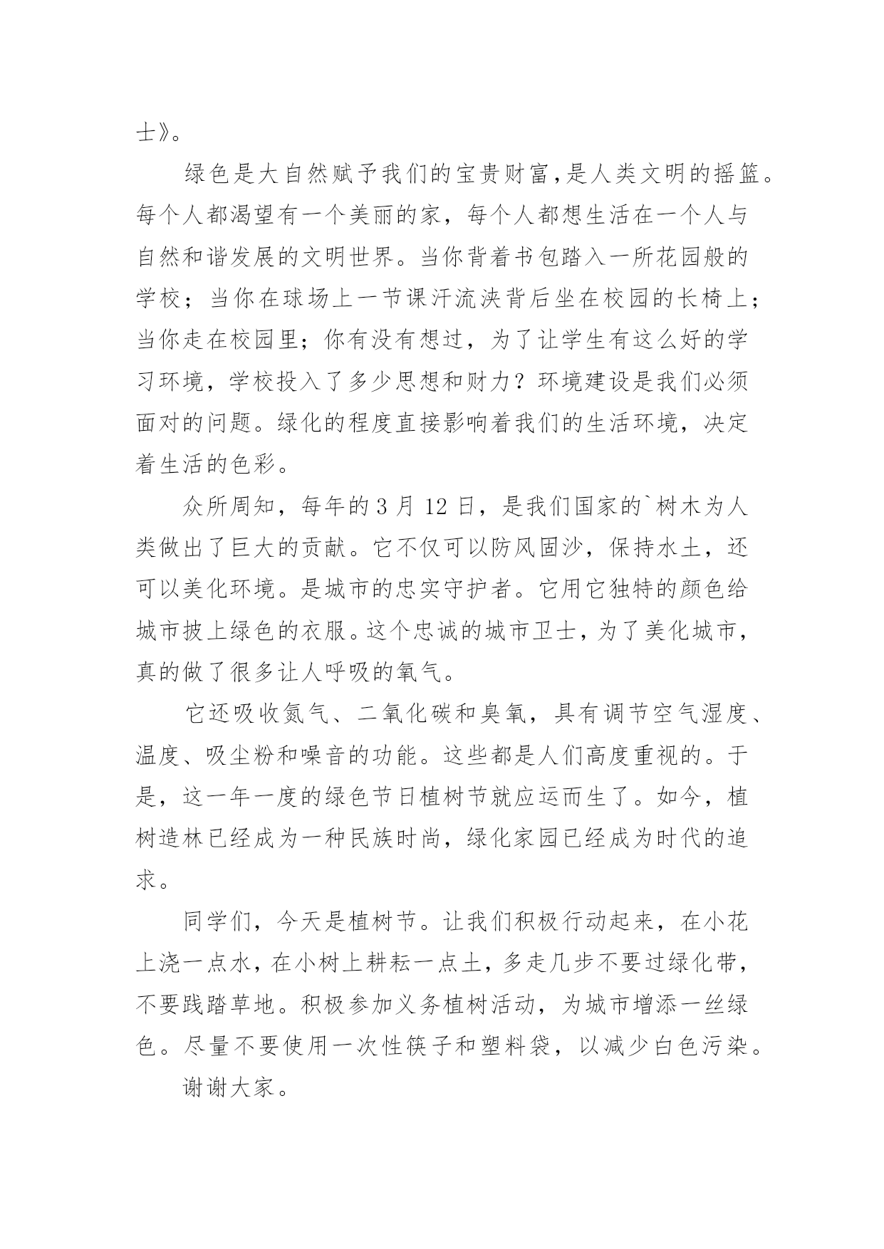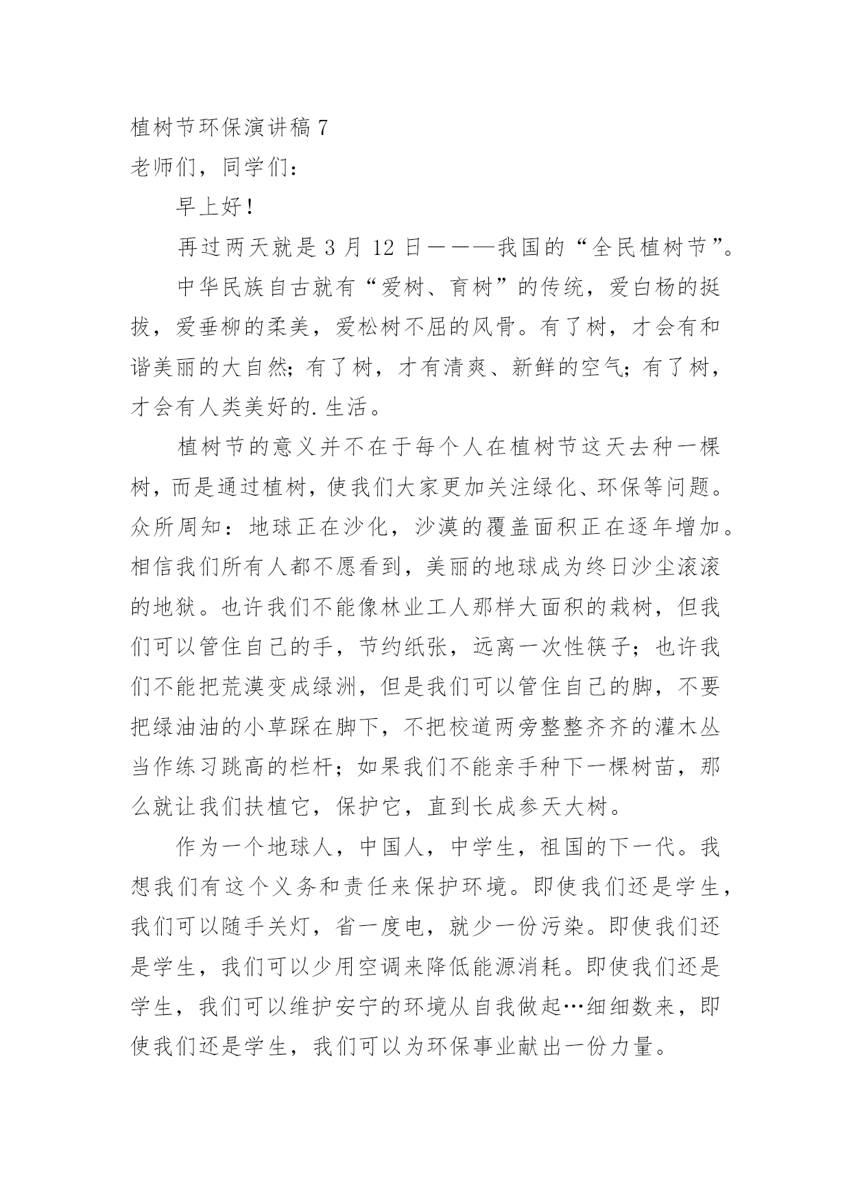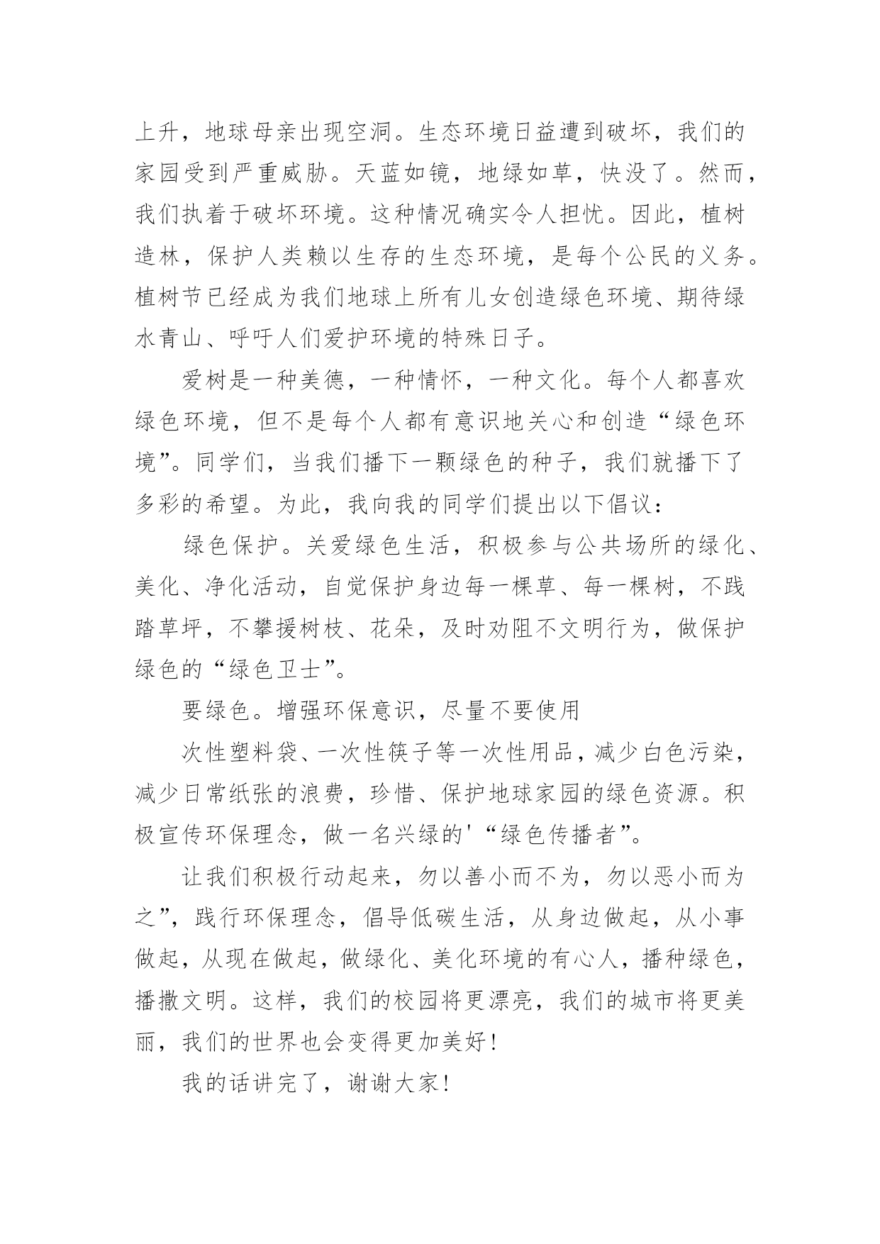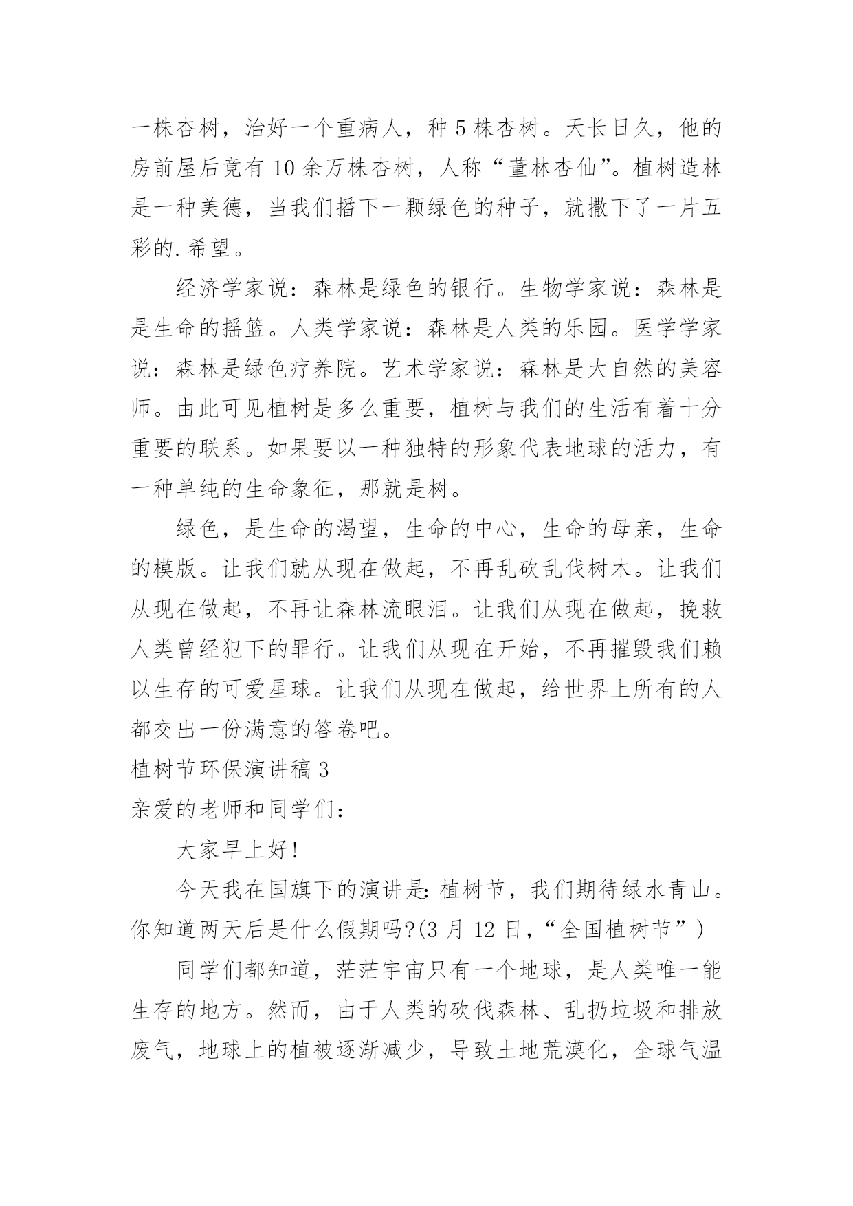 植树节环保演讲稿植树节环保演讲稿13篇演讲稿的格式由称谓、开场白、主干、结尾等几部分组成。在日新月异的现代社会中,演讲稿应用范围愈来愈广泛,相信很多朋友都对写演讲稿感到非常苦恼吧,下面是小编收集整理的植树节环保演讲稿,希望能够帮助到大家。植树节环保演讲稿1同学们大家好:今天是植树节,我们中华民族自古就有“爱树、育树”的传统。爱白杨的挺拔,癌症治疗爱垂柳的柔美。爱松树不屈的风骨。除了这种精神的寄托外,人们更看重它的实用价值。有了树,才会有和谐美丽的大自然;有了树,才有清爽、新鲜的空气;有了树,才会有高楼、房屋和铁路。树,它不仅能防风固沙,保持水土,还能美化环境,是城市的忠诚卫士,它用它特有的颜色为城市披上绿色的新装。这个忠诚的城市卫士,为了美化城市,还真做了不少的“工作”呢!比如绿树进行光合作用,提供人类呼吸所需的氧气。它还是吸收氮气、二氧化碳、臭氧的天然净化物,并且具有调节空气温度、湿度,吸粉尘、噪音等功能。所有这些,都使人们高度重视绿树的作用。于是才有了这一年一度的.绿色节日——植树节。如今,植树造林已成为民族风尚,绿化家园成为时代的追求。同学们,在植树节到来之前也要积极行动起来,在校内保护花草,给花坛里的小花浇一点水,给操场上的小树培一培土,一起来美化绿化我们的校园。除此之外我们同学更要争做绿化宣传员、环保小卫士,要爱护我们校园中的一草一木,爱护我们这个城市中的一草一木。植树节环保演讲稿2说起环保,我们都知道它是一个众所周知且永恒的话题。环境保护已经成为我们生活中密不可分的一点。报纸上,电视上,马路上到处都有人们呼吁环保的足迹。而我们赖以生存的地球现在的情况到底怎样了呢?全球变暖无疑是一个炙手可热的问题。据报道:在未来一百年内全球气温将升高1.5至6摄氏度,海平面将升高15至95厘米,沙漠将更干燥,气候将更恶劣,厄尔尼诺现象将更严重,全球变暖将直接或间接影响数以亿计人们的生活。近年来土地沙漠化日益严重,河水污染日益增多,而对于这些,我们,势单力薄的中学生,难道只能眼睁睁的看着吗?作为一个普通人,我相信没有一个会反对环保。而普遍人们却都把环保定义为:到处是绿的树,清的水。而这些,似乎都是国家要管的大事情,不是一个人两个人就能做起来的事。有一本杂志上说:“环保就这样有了坐享其成的色彩,那些不反对环保的人实际上并没为环保做些什么。”人们的理由有很多:我没有乱砍树木,我没有污染河水,我没有汽车…这样的理由好似很有道理,但事实上环保是一个对自己和世界都很有好处的事业,并不是一个复杂的苦行僧式的生活。我们可以找很多理由来搪塞环保。可是,事实上环保是我们自己的事。我们要真正的从主观意识上正视环保,做到环保。植树节演讲稿由提供!据报道:“十一”黄金周第二天,乌鲁木齐市南山旅游景区出现80多名韩国游客集体捡垃圾的场面,其中包括30多名儿童。这,是在提醒我们什么呢?美国有一家报纸这样评价说:“各旅游景点的自然风光和文化遗迹,是大自然和祖先留下的宝贵财富,面对韩国游客们交上的一张公德考卷,中国人自己应交出怎样的考卷呢?”作为一个地球人,中国人,中学生,祖国的下一代。我想我们有这个义务和责任来保护环境。即使我们还是学生,我们可以拒收“垃圾广告”信函,拒收浪费纸张、能源、人力的广告信函。即使我们还是学生,我们可以随手关灯,省一度电,就少一份污染。即使我们还是学生,我们可以减用空调来降低能源消耗。即使我们还是学生,我们可以维护安宁的环境从自我做起…...细细数来,即使我们还是学生,我们可以为环保事业献出一份力量。3.12是植树节。古往今来,有许多崇尚植树造林的趣闻佳话。如著名的治病种杏。三国东吴名医董奉,医术精湛,济贫善施,为人治病不收财礼。只要求治好一个轻病人,种一株杏树,治好一个重病人,种5株杏树。天长日久,他的房前屋后竟有10余万株杏树,人称“董林杏仙”。植树造林是一种美德,当我们播下一颗绿色的种子,就撒下了一片五彩的.希望。经济学家说:森林是绿色的银行。生物学家说:森林是是生命的摇篮。人类学家说:森林是人类的乐园。医学学家说:森林是绿色疗养院。艺术学家说:森林是大自然的美容师。由此可见植树是多么重要,植树与我们的生活有着十分重要的联系。如果要以一种独特的形象代表地球的活力,有一种单纯的生命象征,那就是树。绿色,是生命的渴望,生命的中心,生命的母亲,生命的模版。让我们就从现在做起,不再乱砍乱伐树木。让我们从现在做起,不再让森林流眼泪。让我们从现在做起,挽救人类曾经犯下的罪行。让我们从现在开始,不再摧毁我们赖以生存的可爱星球。让我们从现在做起,给世界上所有的人都交出一份满意的答卷吧。植树节环保演讲稿3亲爱的老师和同学们:大家早上好!今天我在国旗下的演讲是:植树节,我们期待绿水青山。你知道两天后是什么假期吗?(3月12日,“全国植树节”)同学们