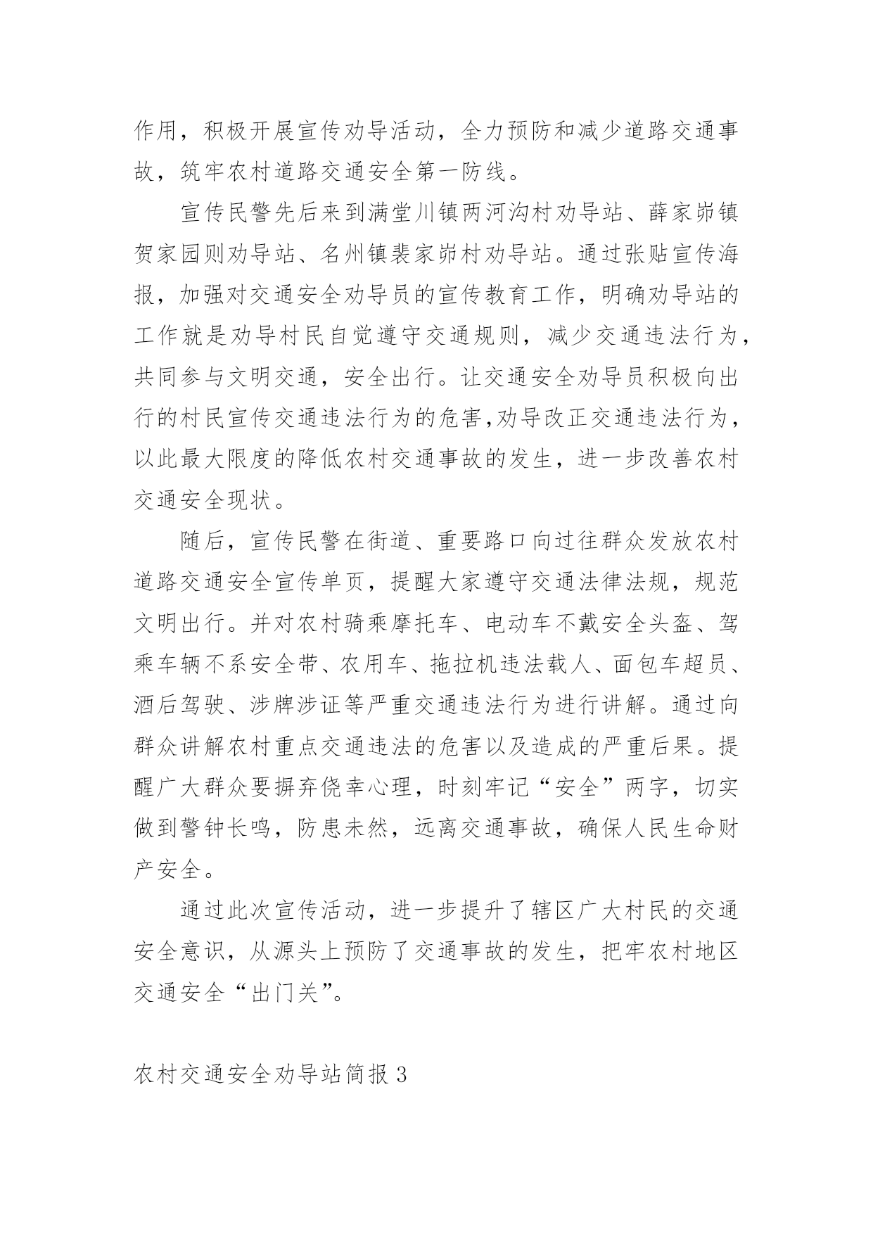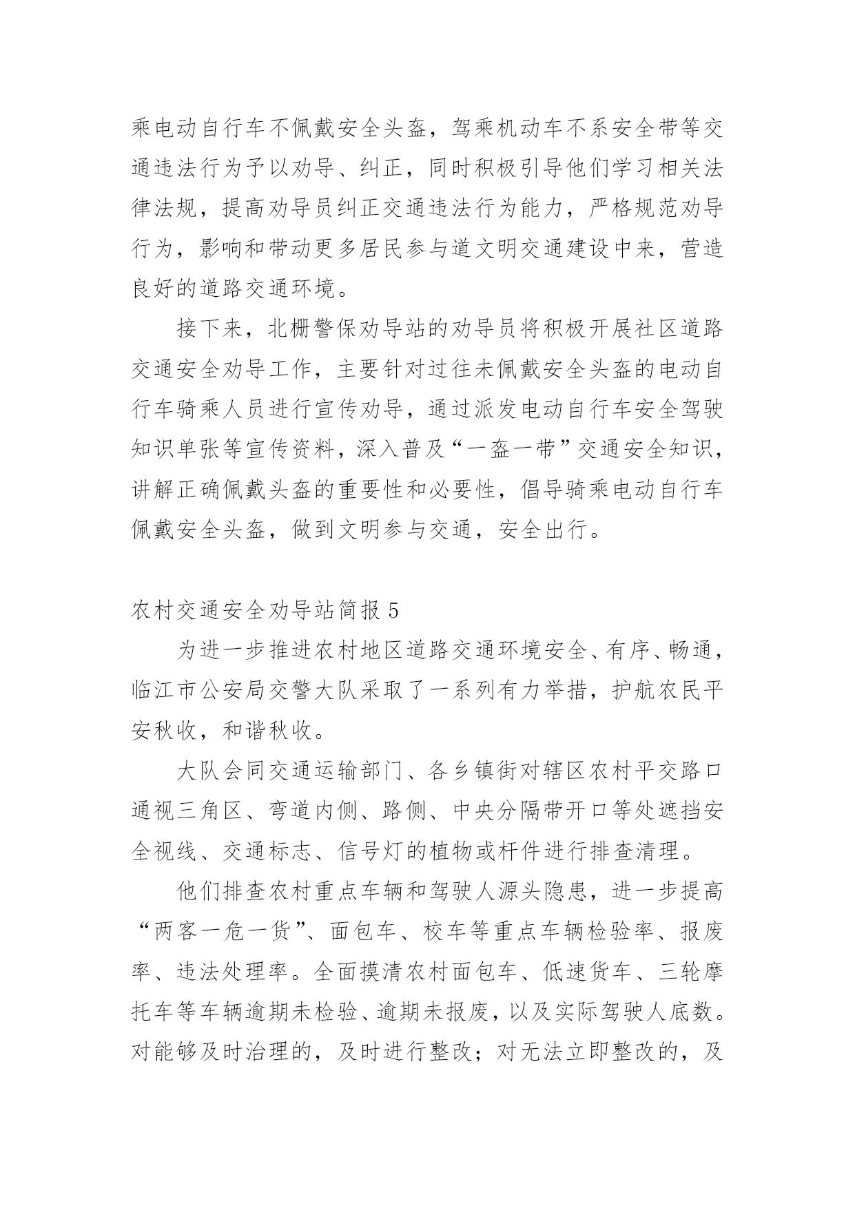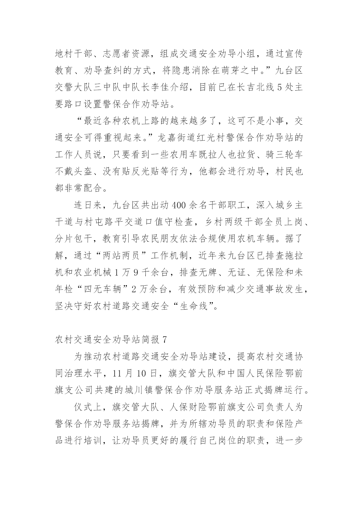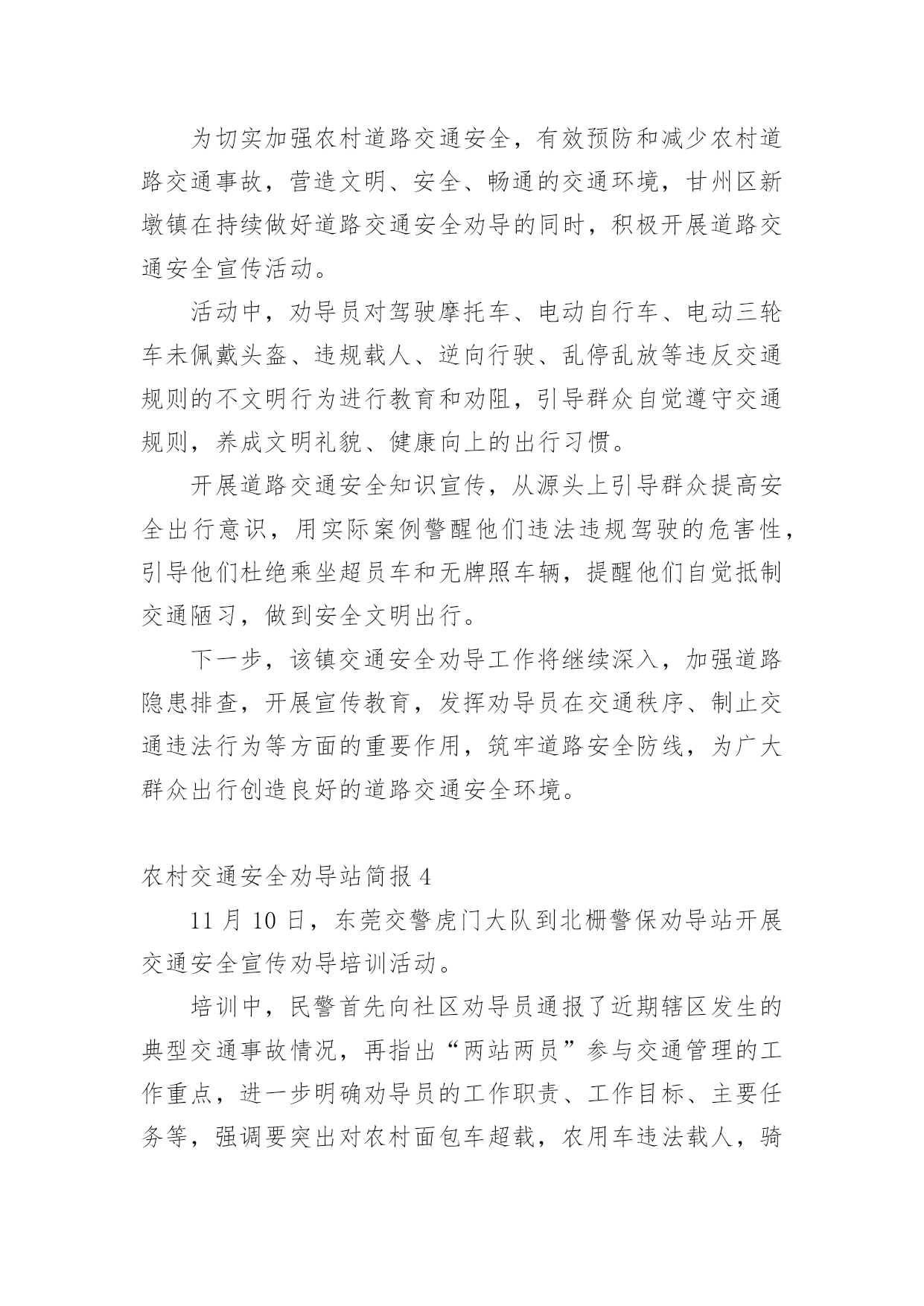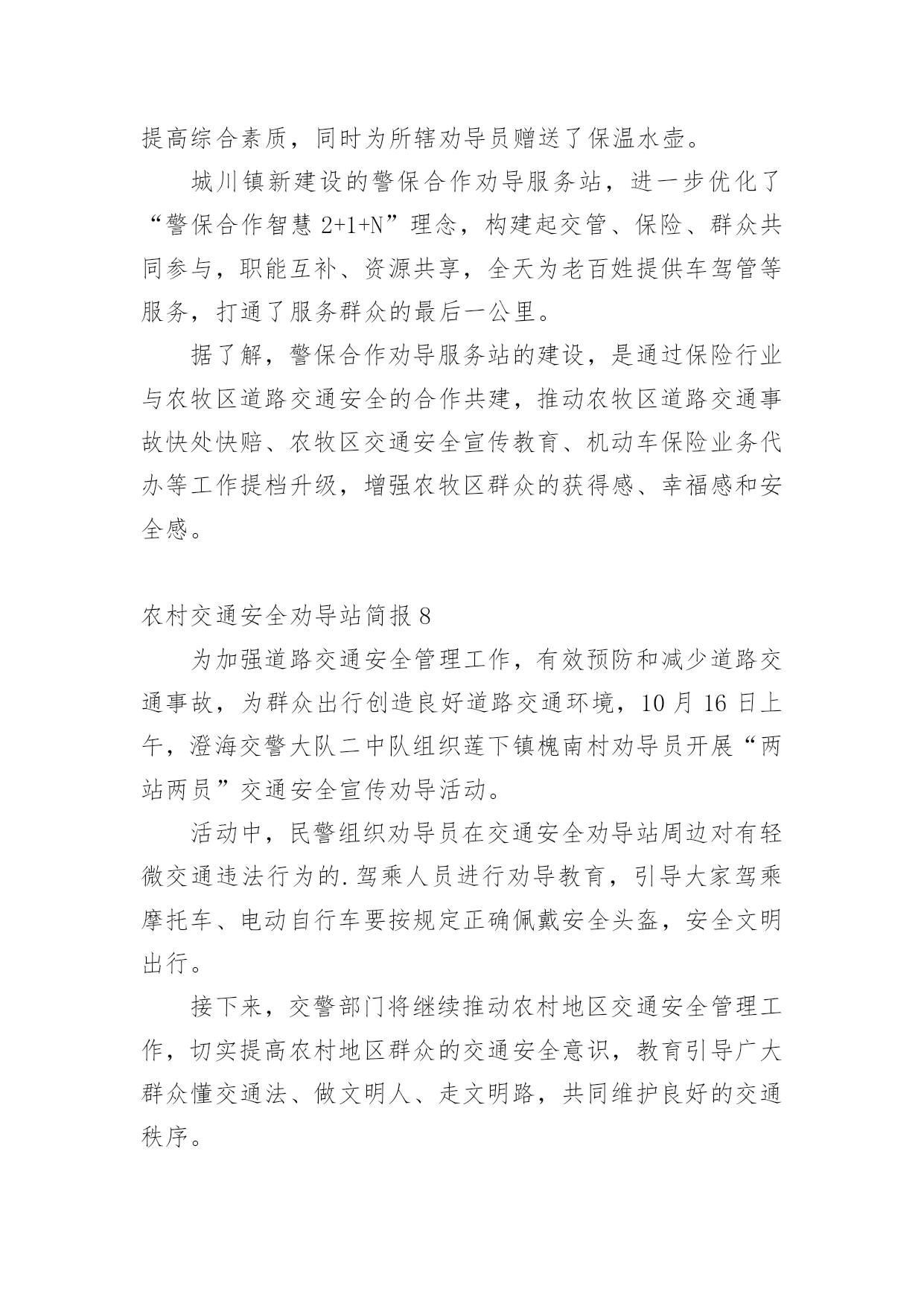 农村交通安全劝导站简报农村交通安全劝导站简报范文(通用10篇)在快速变化和不断变革的今天,我们每个人都可能会接触到简报,简报又称“动态”“简讯”“要情”“摘报”“工作通讯”“情况反映”“情况交流”“内部参考”等。还苦于找不到好的简报?以下是小编收集整理的农村交通安全劝导站简报范文(通用10篇),仅供参考,希望能够帮助到大家。农村交通安全劝导站简报1为进一步保障农村道路交通安全,提高机动车驾驶员的交通安全意识和文明行车意识,预防和减少农村道路交通事故发生,切实加强农村道路交通安全管理工作,近日,襄南镇召开2022年第二季度道路交通安全推进会议,镇党委书记张晓军出席会议并讲话。各村党支部书记、镇交管站全体成员、各村交通劝导员共60多人参加会议。会上,副镇长孟振宇传达学习了省市安全生产工作会议精神和通渭县道路交通安全委员会2022年第二次全体(扩大)会议精神,并对第二季度全镇农村道路交通安全工作进行全面的安排部署。会议强调,今年以来,由于新冠肺炎疫情影响,各村、各交管站闻令而动,自觉服从疫情防控大局的需要,不畏艰难险阻,在配合做好疫情防控工作的前提下,聚焦道路交通安全工作重点,一手抓道路保通保畅,一手抓交通事故预防,确保了辖区道路交通安全形势基本保持平稳。但随着“五一”小长假的到来和春耕生产全面推开,群众出行和道路运输逐步恢复,车流人流量大幅增加,各类道路交通安全风险隐患叠加,安全形势不容乐观。各村要全面提升全镇道路交通安全整体水平,做好各类工作记录、台账填写及“农交安”APP上传工作。在重点时间段开展酒后驾驶、农村面包车超员、拖拉机、货车载人、骑乘摩托车不戴安全头盔、电动车载人、市场占道经营等违法行为进行劝导,及时消除安全隐患。要以党的二十大交通安保为主线,以事故预防“减量控大”为抓手,以推动道路交通现代治理为支撑,以推进改革创新为动力,全力以赴做好交通安全各项工作,努力为党的二十大胜利召开、全镇经济社会高质量追赶发展、人民群众平安出行创造良好的道路交通环境。下一步,襄南镇将高度重视农村道路交通安全工作,把农村道路交通安全劝导作为全镇一项重要工作狠抓落实,尤其在重要节日组织派出所、交警队、安监站等多部门开展联合执法,严厉打击交通违法行为,竭尽全力创造平安祥和的交通出行环境。农村交通安全劝导站简报2为进一步贯彻落实交通安全宣传教育工作,预防和减少农村道路交通事故,确保农村道路交通安全、有序。近日,绥德县公安局交通管理大队依托警保合作劝导站打造交通安全宣传阵地,携手交通安全劝导员充分发挥“两站两员”作用,积极开展宣传劝导活动,全力预防和减少道路交通事故,筑牢农村道路交通安全第一防线。宣传民警先后来到满堂川镇两河沟村劝导站、薛家峁镇贺家园则劝导站、名州镇裴家峁村劝导站。通过张贴宣传海报,加强对交通安全劝导员的宣传教育工作,明确劝导站的工作就是劝导村民自觉遵守交通规则,减少交通违法行为,共同参与文明交通,安全出行。让交通安全劝导员积极向出行的村民宣传交通违法行为的危害,劝导改正交通违法行为,以此最大限度的降低农村交通事故的发生,进一步改善农村交通安全现状。随后,宣传民警在街道、重要路口向过往群众发放农村道路交通安全宣传单页,提醒大家遵守交通法律法规,规范文明出行。并对农村骑乘摩托车、电动车不戴安全头盔、驾乘车辆不系安全带、农用车、拖拉机违法载人、面包车超员、酒后驾驶、涉牌涉证等严重交通违法行为进行讲解。通过向群众讲解农村重点交通违法的危害以及造成的严重后果。提醒广大群众要摒弃侥幸心理,时刻牢记“安全”两字,切实做到警钟长鸣,防患未然,远离交通事故,确保人民生命财产安全。通过此次宣传活动,进一步提升了辖区广大村民的交通安全意识,从源头上预防了交通事故的发生,把牢农村地区交通安全“出门关”。农村交通安全劝导站简报3为切实加强农村道路交通安全,有效预防和减少农村道路交通事故,营造文明、安全、畅通的交通环境,甘州区新墩镇在持续做好道路交通安全劝导的同时,积极开展道路交通安全宣传活动。活动中,劝导员对驾驶摩托车、电动自行车、电动三轮车未佩戴头盔、违规载人、逆向行驶、乱停乱放等违反交通规则的不文明行为进行教育和劝阻,引导群众自觉遵守交通规则,养成文明礼貌、健康向上的出行习惯。开展道路交通安全知识宣传,从源头上引导群众提高安全出行意识,用实际案例警醒他们违法违规驾驶的危害性,引导他们杜绝乘坐超员车和无牌照车辆,提醒他们自觉抵制交通陋习,做到安全文明出行。下一步,该镇交通安全劝导工作将继续深入,加强道路隐患排查,开展宣传教育,发挥劝导员在交通秩序、制止交通违法行为等方面的重要作用,筑牢道路安全防线,为广大群众出行创造良好的道路交通安全环境。农村交通安全劝导站简报411月10日,东莞交警虎门大队到北栅警保劝导站开展交通安全宣传劝导培训活动。培训中,民警
