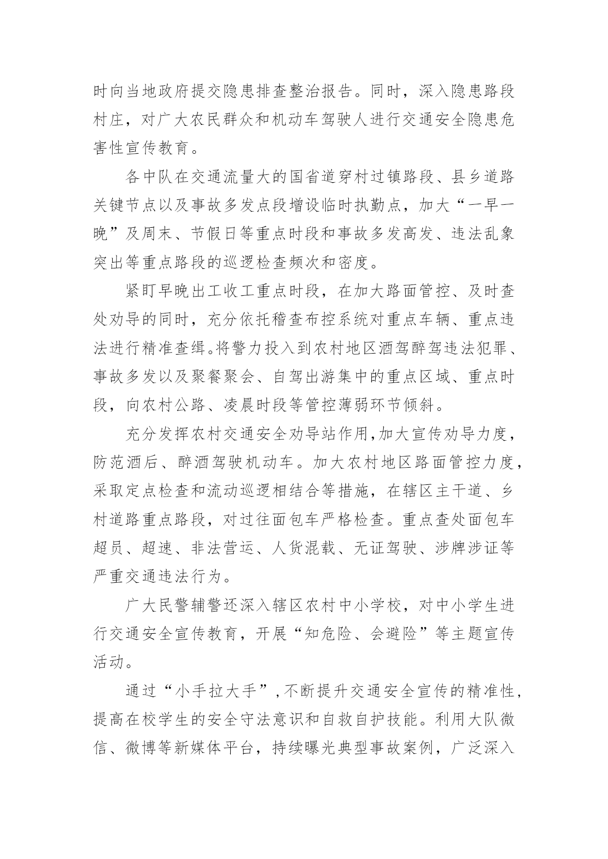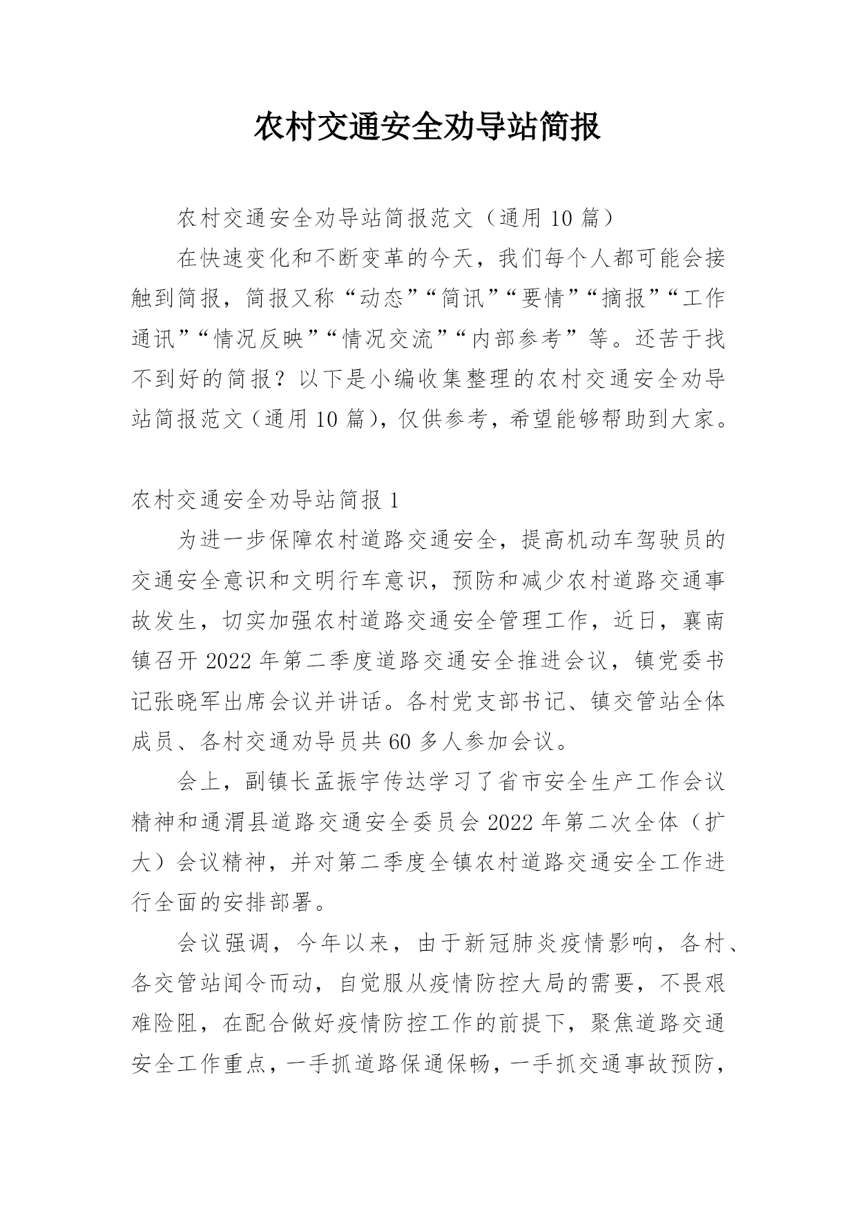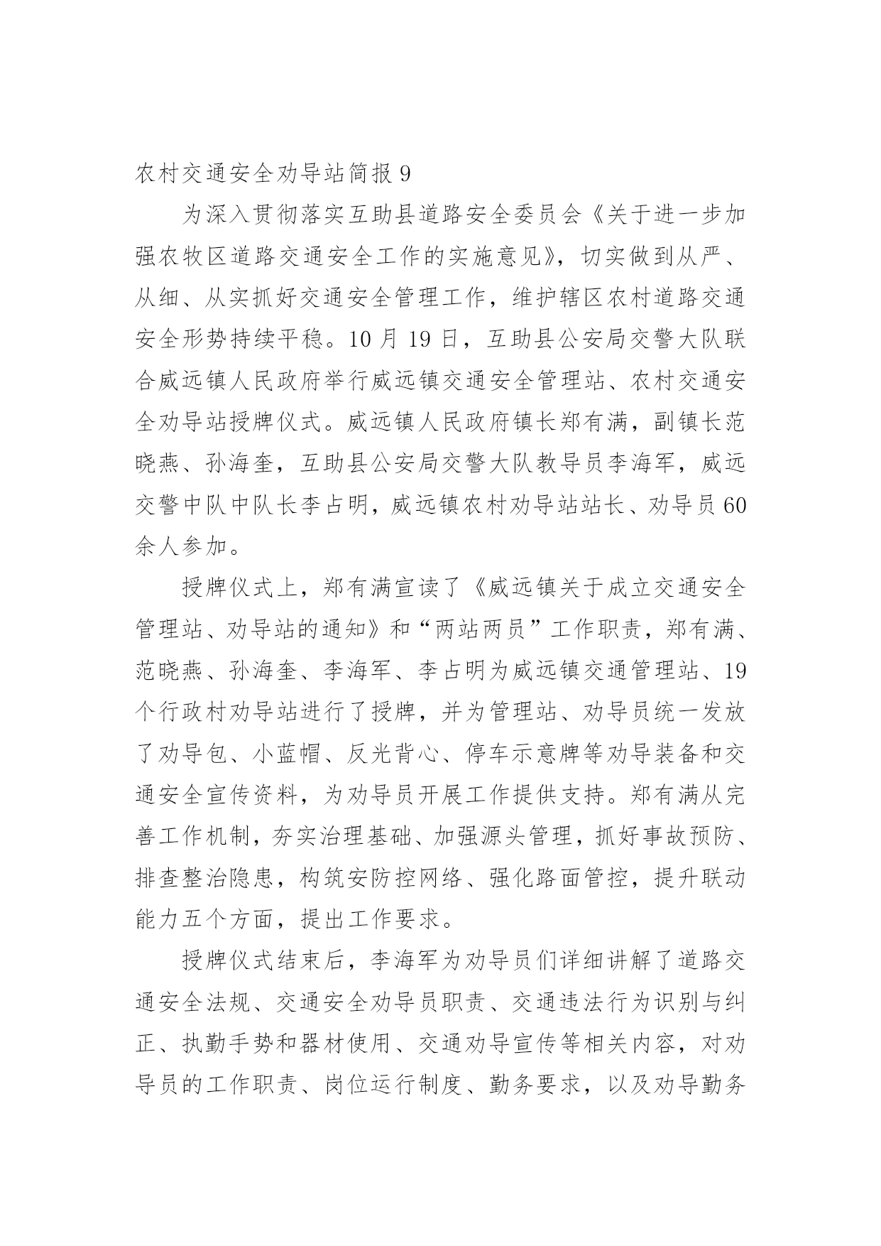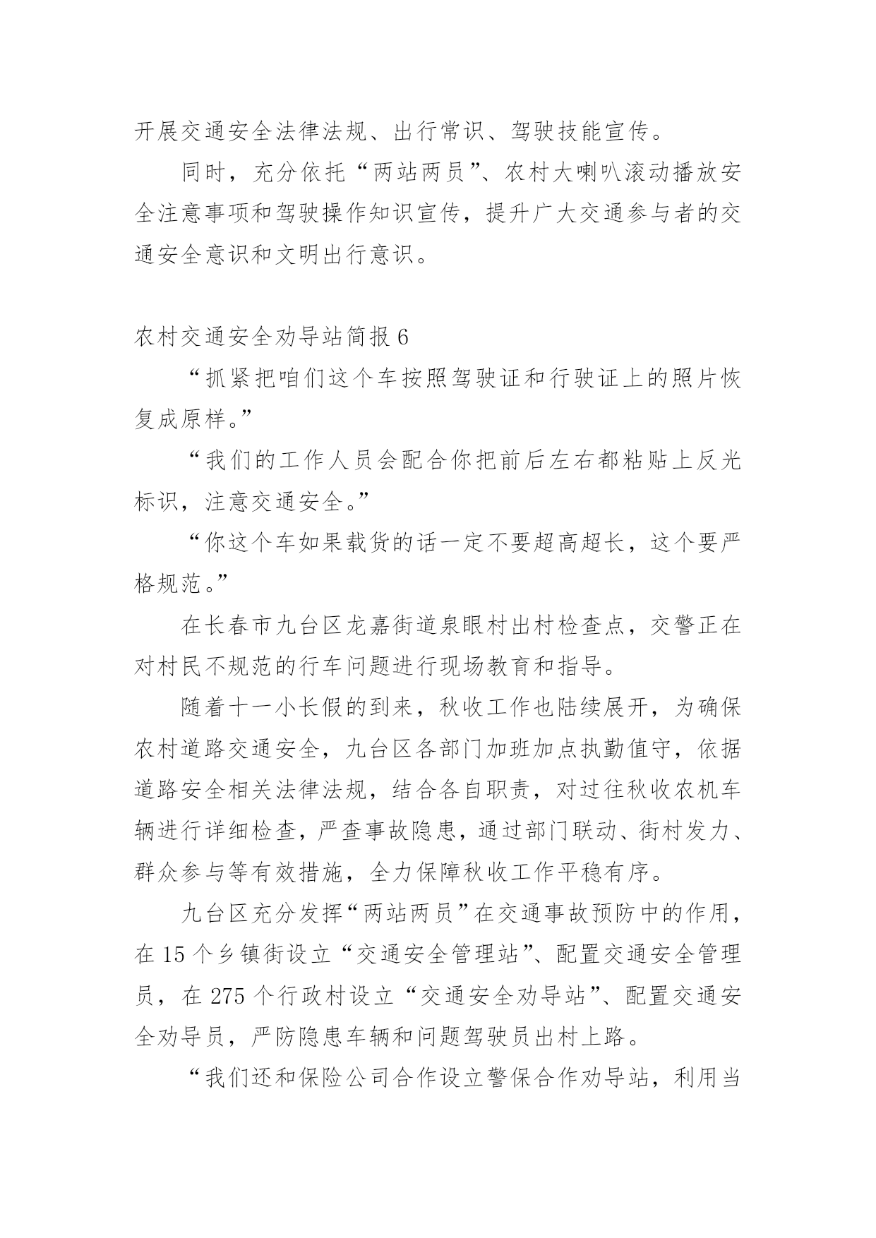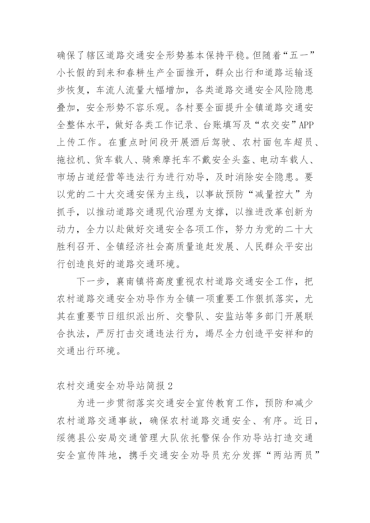 农村交通安全劝导站简报农村交通安全劝导站简报范文(通用10篇)在快速变化和不断变革的今天,我们每个人都可能会接触到简报,简报又称“动态”“简讯”“要情”“摘报”“工作通讯”“情况反映”“情况交流”“内部参考”等。还苦于找不到好的简报?以下是小编收集整理的农村交通安全劝导站简报范文(通用10篇),仅供参考,希望能够帮助到大家。农村交通安全劝导站简报1为进一步保障农村道路交通安全,提高机动车驾驶员的交通安全意识和文明行车意识,预防和减少农村道路交通事故发生,切实加强农村道路交通安全管理工作,近日,襄南镇召开2022年第二季度道路交通安全推进会议,镇党委书记张晓军出席会议并讲话。各村党支部书记、镇交管站全体成员、各村交通劝导员共60多人参加会议。会上,副镇长孟振宇传达学习了省市安全生产工作会议精神和通渭县道路交通安全委员会2022年第二次全体(扩大)会议精神,并对第二季度全镇农村道路交通安全工作进行全面的安排部署。会议强调,今年以来,由于新冠肺炎疫情影响,各村、各交管站闻令而动,自觉服从疫情防控大局的需要,不畏艰难险阻,在配合做好疫情防控工作的前提下,聚焦道路交通安全工作重点,一手抓道路保通保畅,一手抓交通事故预防,确保了辖区道路交通安全形势基本保持平稳。但随着“五一”小长假的到来和春耕生产全面推开,群众出行和道路运输逐步恢复,车流人流量大幅增加,各类道路交通安全风险隐患叠加,安全形势不容乐观。各村要全面提升全镇道路交通安全整体水平,做好各类工作记录、台账填写及“农交安”APP上传工作。在重点时间段开展酒后驾驶、农村面包车超员、拖拉机、货车载人、骑乘摩托车不戴安全头盔、电动车载人、市场占道经营等违法行为进行劝导,及时消除安全隐患。要以党的二十大交通安保为主线,以事故预防“减量控大”为抓手,以推动道路交通现代治理为支撑,以推进改革创新为动力,全力以赴做好交通安全各项工作,努力为党的二十大胜利召开、全镇经济社会高质量追赶发展、人民群众平安出行创造良好的道路交通环境。下一步,襄南镇将高度重视农村道路交通安全工作,把农村道路交通安全劝导作为全镇一项重要工作狠抓落实,尤其在重要节日组织派出所、交警队、安监站等多部门开展联合执法,严厉打击交通违法行为,竭尽全力创造平安祥和的交通出行环境。农村交通安全劝导站简报2为进一步贯彻落实交通安全宣传教育工作,预防和减少农村道路交通事故,确保农村道路交通安全、有序。近日,绥德县公安局交通管理大队依托警保合作劝导站打造交通安全宣传阵地,携手交通安全劝导员充分发挥“两站两员”作用,积极开展宣传劝导活动,全力预防和减少道路交通事故,筑牢农村道路交通安全第一防线。宣传民警先后来到满堂川镇两河沟村劝导站、薛家峁镇贺家园则劝导站、名州镇裴家峁村劝导站。通过张贴宣传海报,加强对交通安全劝导员的宣传教育工作,明确劝导站的工作就是劝导村民自觉遵守交通规则,减少交通违法行为,共同参与文明交通,安全出行。让交通安全劝导员积极向出行的村民宣传交通违法行为的危害,劝导改正交通违法行为,以此最大限度的降低农村交通事故的发生,进一步改善农村交通安全现状。随后,宣传民警在街道、重要路口向过往群众发放农村道路交通安全宣传单页,提醒大家遵守交通法律法规,规范文明出行。并对农村骑乘摩托车、电动车不戴安全头盔、驾乘车辆不系安全带、农用车、拖拉机违法载人、面包车超员、酒后驾驶、涉牌涉证等严重交通违法行为进行讲解。通过向群众讲解农村重点交通违法的危害以及造成的严重后果。提醒广大群众要摒弃侥幸心理,时刻牢记“安全”两字,切实做到警钟长鸣,防患未然,远离交通事故,确保人民生命财产安全。通过此次宣传活动,进一步提升了辖区广大村民的交通安全意识,从源头上预防了交通事故的发生,把牢农村地区交通安全“出门关”。农村交通安全劝导站简报3为切实加强农村道路交通安全,有效预防和减少农村道路交通事故,营造文明、安全、畅通的交通环境,甘州区新墩镇在持续做好道路交通安全劝导的同时,积极开展道路交通安全宣传活动。活动中,劝导员对驾驶摩托车、电动自行车、电动三轮车未佩戴头盔、违规载人、逆向行驶、乱停乱放等违反交通规则的不文明行为进行教育和劝阻,引导群众自觉遵守交通规则,养成文明礼貌、健康向上的出行习惯。开展道路交通安全知识宣传,从源头上引导群众提高安全出行意识,用实际案例警醒他们违法违规驾驶的危害性,引导他们杜绝乘坐超员车和无牌照车辆,提醒他们自觉抵制交通陋习,做到安全文明出行。下一步,该镇交通安全劝导工作将继续深入,加强道路隐患排查,开展宣传教育,发挥劝导员在交通秩序、制止交通违法行为等方面的重要作用,筑牢道路安全防线,为广大群众出行创造良好的道路交通安全环境。农村交通安全劝导站简报411月10日,东莞交警虎门大队到北栅警保劝导站开展交通安全宣传劝导培训活动。培训中,民警
