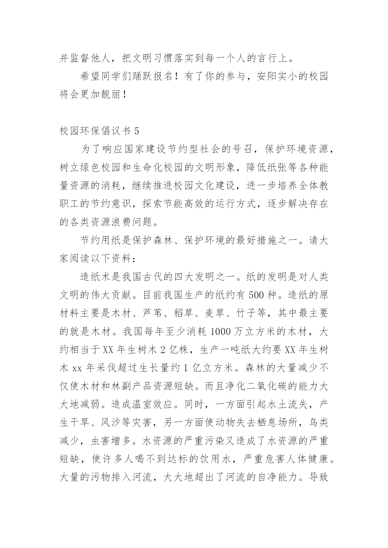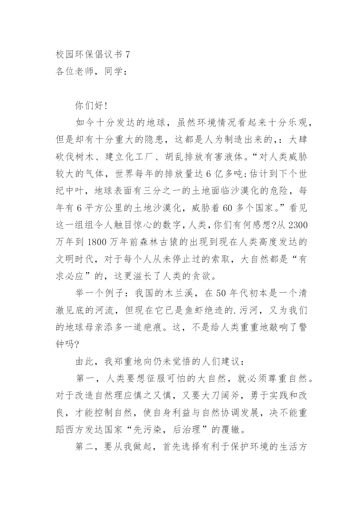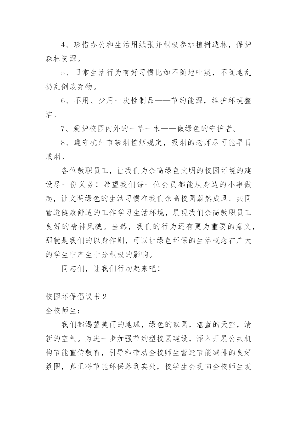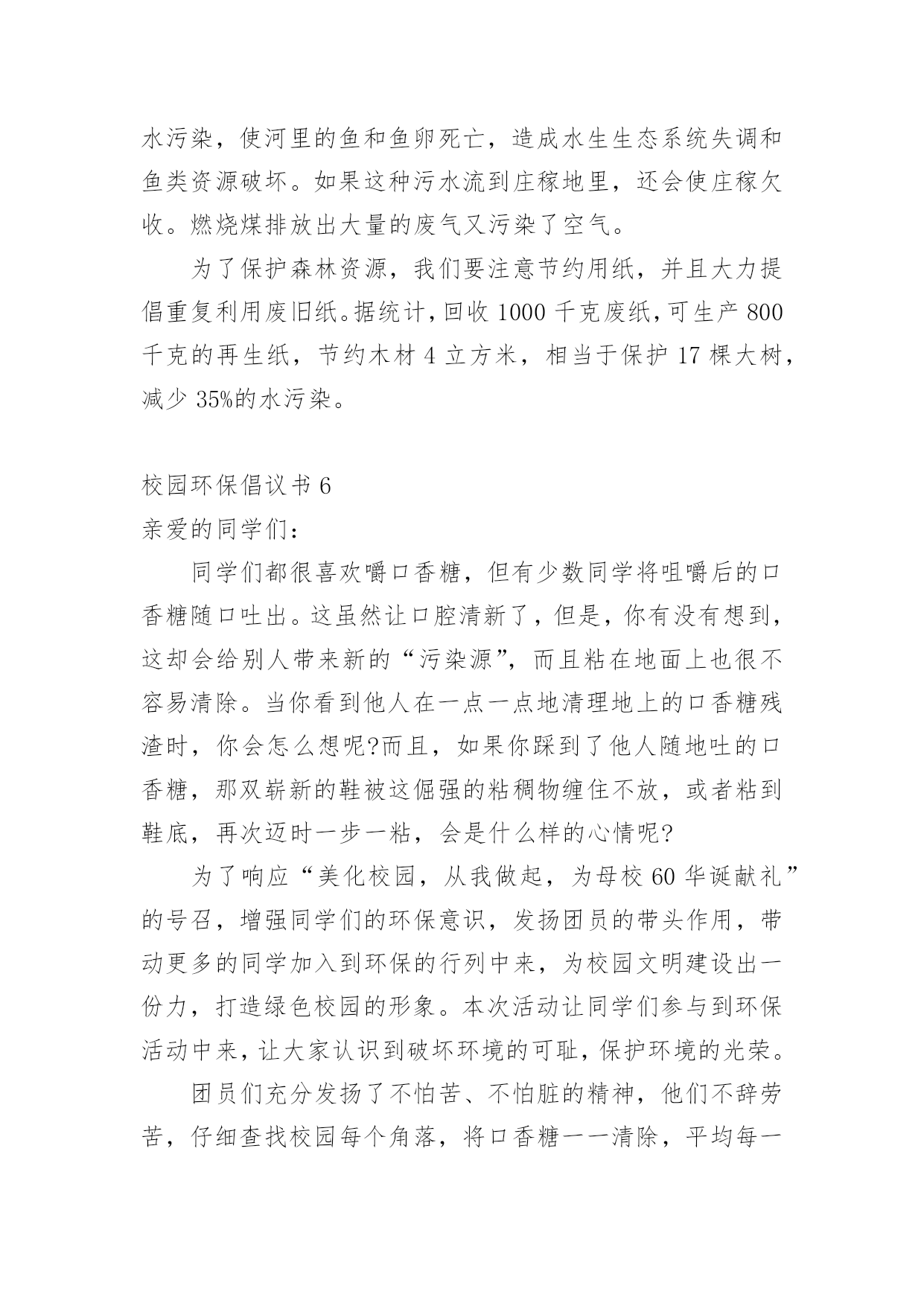 校园环保倡议书校园环保倡议书合集15篇在社会发展不断提速的今天,需要使用倡议书的事情愈发增多,使用正确的写作思路书写倡议书会更加事半功倍。那么,怎么去写倡议书呢?下面是小编收集整理的校园环保倡议书,仅供参考,欢迎大家阅读。校园环保倡议书1各位教职员工:在余高,我们共同享受着校园的鸟语花香和四季常绿;我们一起愉悦于宽敞明亮、整洁卫生的工作环境;我们也同样担负着让余高的校园生活更绿色的职责和义务。在我们日常的工作生活中,一个小小的行为就有可能留下永久令人心痛的痕迹,我们的一些看似无伤大雅的偶尔的行为也有可能给学生造成负面的影响。我们大家都知道,自然万物的生长需要雨露的滋养,我们也应该明白校园美好环境的存在和绿色生活的行为需要我们每个人的营造和维护。为此,学校工会特向全体会员倡议如下:1、以节水为荣——随手关紧水龙头,别让水空流。2、以节电为荣——省一度电,少一分污染,多一分贡献。3、以节粮为荣——爱惜粮食,让节俭美德代代相传。4、珍惜办公和生活用纸张并积极参加植树造林,保护森林资源。5、日常生活行为有好习惯比如不随地吐痰,不随地乱扔乱倒废弃物。6、不用、少用一次性制品——节约能源,维护环境整洁。7、爱护校园内外的一草一木——做绿色的守护者。8、遵守杭州市禁烟控烟规定,吸烟的老师尽可能早日戒烟。各位教职员工,让我们为余高绿色文明的校园环境的建设尽一份义务!希望我们每一位会员都能从身边的小事做起,让文明绿色的生活习惯在我们余高校园蔚然成风。共同营造健康舒适的工作学习生活环境,展现我们余高教职员工良好的精神风貌。当然,我们的行为还有更为重要的意义,那就是我们的以身作则,可以让绿色环保的生活概念在广大的学生中产生十分积极的影响。同志们,让我们行动起来吧!校园环保倡议书2全校师生:我们都渴望美丽的地球,绿色的家园,湛蓝的天空,清新的空气。为进一步加强节约型校园建设,深入开展公共机构节能宣传教育,引导和带动全校师生营造节能减排的良好氛围,真正将节能环保落到实处,校学生会现向全校师生发起以下倡议:1、要增强能源忧患意识和节约环保意识,弘扬中华民族勤俭节约的传统美德,养成良好的生活习惯,在全校形成人人有责的环保意识,树立环保良好风尚。2、立足生活实践,提倡极简生活,减少生活和办公资源消耗,从节约每一度电、每一滴水、每一张纸、每一粒米的点滴小事做起,不铺张浪费。做自觉践行节能减排的楷模,节约用纸,提倡双面使用打印纸。通过一点一滴的积累,培养良好习惯。3、减少私家车的使用,倡导大家外出时尽量步行,骑车或乘坐交通工具,提倡三层以下步行上下楼,减少乘坐电梯次数,减少电器设备(电脑、打印机、复印机等)的待机时间,外出时及时关闭电器设备电源。请大家积极参加低碳活动,体验环保带来的乐趣。4、形成垃圾分类投放的意识,增强对垃圾的二次利用,提高垃圾使用效率。培养不随地扔垃圾的良好习惯。5、在食堂用餐,不浪费,不挥霍,爱惜粮食,保持节约的生活态度,均衡饮食,文明用餐。6、树立节电意识,开展节电行动。杜绝长明灯的出现,随手关灯,做到人走灯熄;随手关闭电源,减少电脑等各种电器的待机时间;使用节能型环保型电器产品,提倡使用节能灯具,积极参与地球一小时活动。7、树立节约用水的意识。洗手后及时关闭水龙头,一水多用,衣物集中洗涤,减少洗衣次数,避免使用含磷洗衣粉,防治水体污染。8、树立爱护环境,绿色消费的意识。购物时,自带购物袋;购买商品时,注重商品的质量,减少购物袋使用,减少白色垃圾的产生,提倡节俭,反对浪费,自觉抵制商品过度包装,倡导节俭,反对浪费。9、减少一次性用品的使用,如签字笔、纸巾、纸杯等。提倡使用钢笔和可更换笔芯的圆珠笔和签字笔,自带毛巾、杯具等。节约地球资源,维护生态环境,让我们从自己做起,节约水电,积极提倡低碳生活,建设美丽校园。校学生会20xx年xx月xx日校园环保倡议书3敬爱的老师、亲爱的同学们:你们好!阳光明媚,空气清新,鸟语花香是我们梦寐以求的校园环境。多年来,我校一直努力绿化、美化、净化校园。还通过多种渠道普及环保理念,倡导绿色文明,更好的营造“环境友好、构建和谐”的人文环境。但是,随手乱扔垃圾、肆意浪费粮食、破坏花草树木、上下楼梯不讲秩序等不文明现象还时常出现在同学们的身边。我们每个人都希望在一个清洁、舒适的环境中学习生活,健康地成长,而美丽的环境需要我们共同营造,文明的习惯靠我们平时一点一滴地养成。在此我们特向全校师生发出以下倡议:1、不乱丢果皮纸屑,不随地吐痰,主动清理地面和墙壁上的污垢;2、主动捡拾别人丢在地上的垃圾,养成“随手丢下垃圾可耻,弯腰拾起垃圾光荣”的良好习惯;争做“戴红领巾、讲普通话、做文明卫士”小标兵;3、上下楼梯讲秩序,真正做到“礼让右行”;4、爱护公物,不在桌椅、墙体上乱涂乱画,爱护校园内的一草一木;5、不带不吃零食。吃