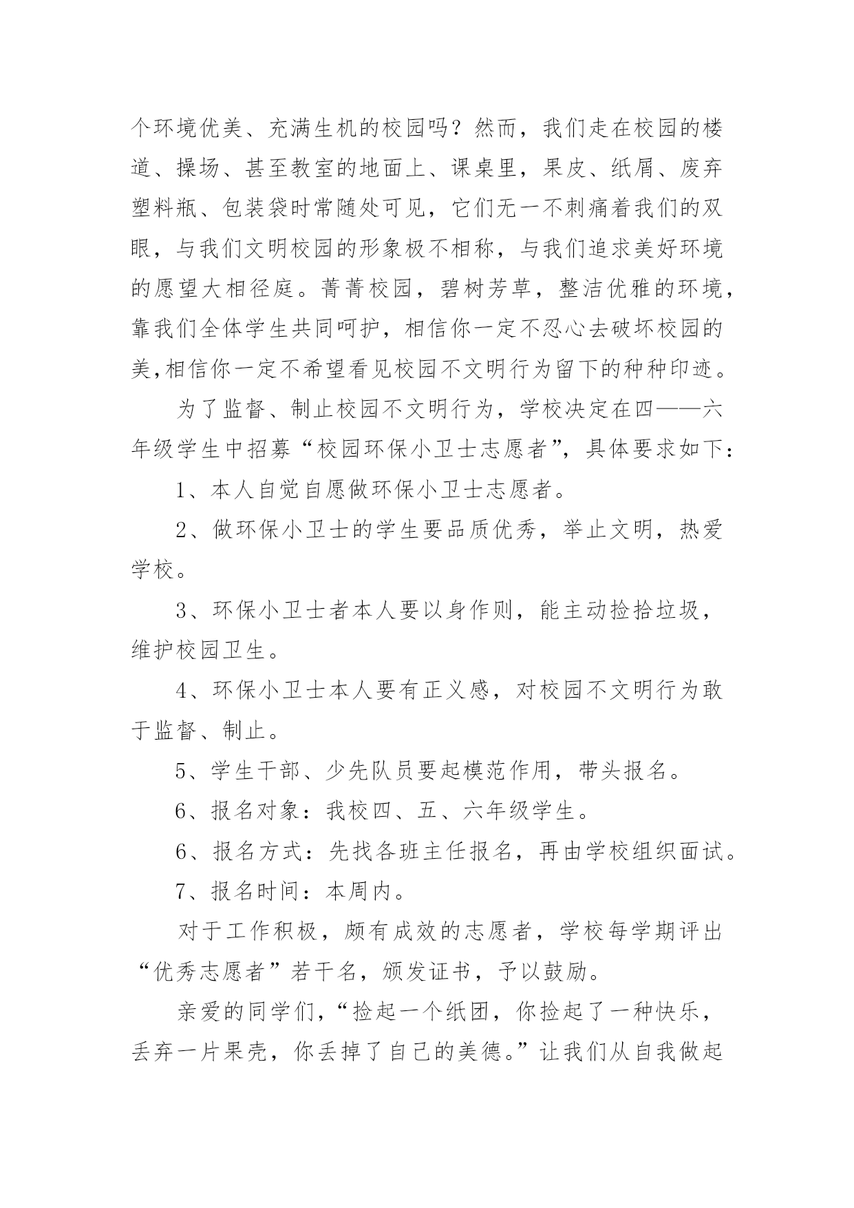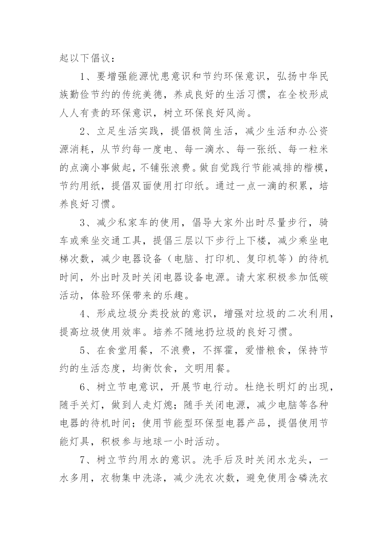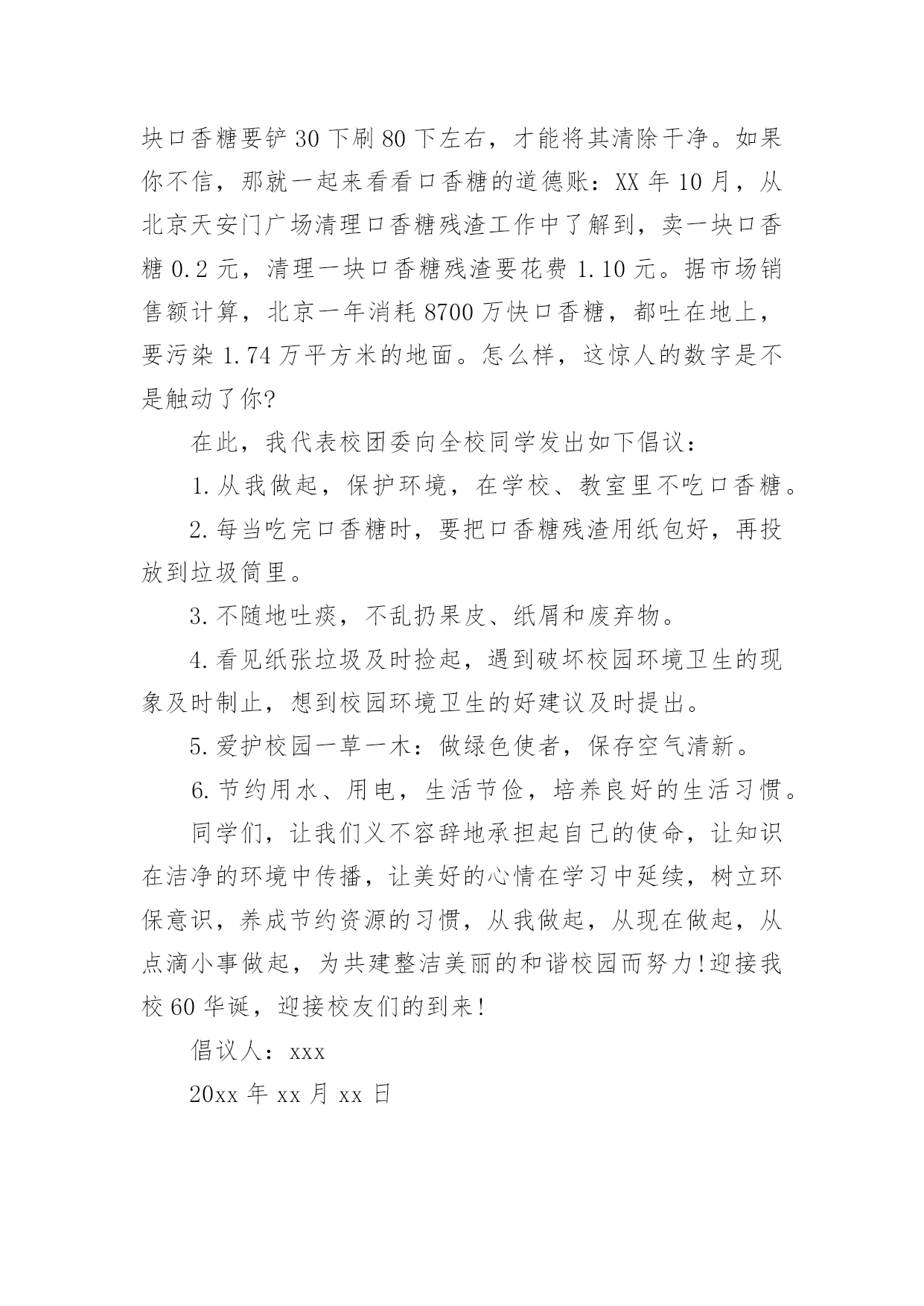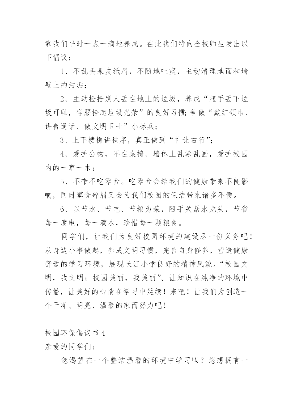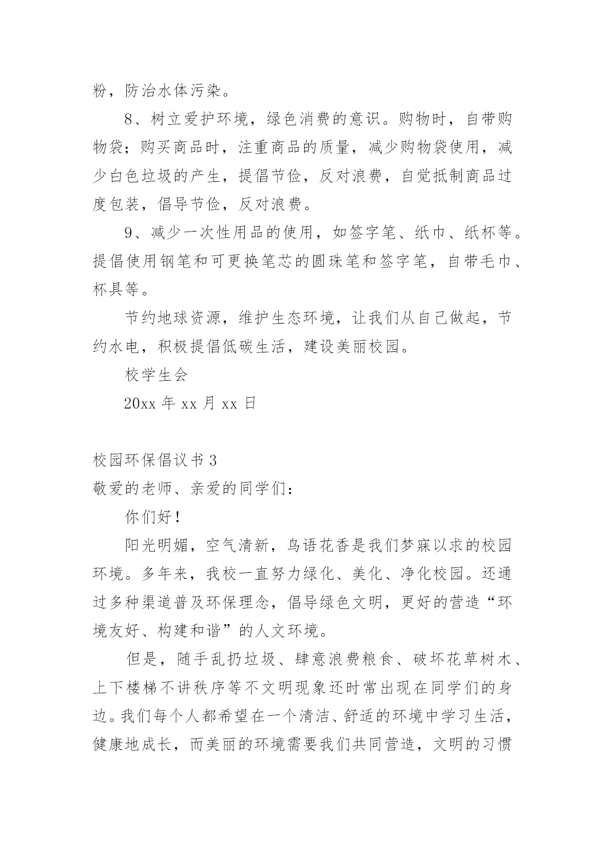 校园环保倡议书校园环保倡议书合集15篇在社会发展不断提速的今天,需要使用倡议书的事情愈发增多,使用正确的写作思路书写倡议书会更加事半功倍。那么,怎么去写倡议书呢?下面是小编收集整理的校园环保倡议书,仅供参考,欢迎大家阅读。校园环保倡议书1各位教职员工:在余高,我们共同享受着校园的鸟语花香和四季常绿;我们一起愉悦于宽敞明亮、整洁卫生的工作环境;我们也同样担负着让余高的校园生活更绿色的职责和义务。在我们日常的工作生活中,一个小小的行为就有可能留下永久令人心痛的痕迹,我们的一些看似无伤大雅的偶尔的行为也有可能给学生造成负面的影响。我们大家都知道,自然万物的生长需要雨露的滋养,我们也应该明白校园美好环境的存在和绿色生活的行为需要我们每个人的营造和维护。为此,学校工会特向全体会员倡议如下:1、以节水为荣——随手关紧水龙头,别让水空流。2、以节电为荣——省一度电,少一分污染,多一分贡献。3、以节粮为荣——爱惜粮食,让节俭美德代代相传。4、珍惜办公和生活用纸张并积极参加植树造林,保护森林资源。5、日常生活行为有好习惯比如不随地吐痰,不随地乱扔乱倒废弃物。6、不用、少用一次性制品——节约能源,维护环境整洁。7、爱护校园内外的一草一木——做绿色的守护者。8、遵守杭州市禁烟控烟规定,吸烟的老师尽可能早日戒烟。各位教职员工,让我们为余高绿色文明的校园环境的建设尽一份义务!希望我们每一位会员都能从身边的小事做起,让文明绿色的生活习惯在我们余高校园蔚然成风。共同营造健康舒适的工作学习生活环境,展现我们余高教职员工良好的精神风貌。当然,我们的行为还有更为重要的意义,那就是我们的以身作则,可以让绿色环保的生活概念在广大的学生中产生十分积极的影响。同志们,让我们行动起来吧!校园环保倡议书2全校师生:我们都渴望美丽的地球,绿色的家园,湛蓝的天空,清新的空气。为进一步加强节约型校园建设,深入开展公共机构节能宣传教育,引导和带动全校师生营造节能减排的良好氛围,真正将节能环保落到实处,校学生会现向全校师生发起以下倡议:1、要增强能源忧患意识和节约环保意识,弘扬中华民族勤俭节约的传统美德,养成良好的生活习惯,在全校形成人人有责的环保意识,树立环保良好风尚。2、立足生活实践,提倡极简生活,减少生活和办公资源消耗,从节约每一度电、每一滴水、每一张纸、每一粒米的点滴小事做起,不铺张浪费。做自觉践行节能减排的楷模,节约用纸,提倡双面使用打印纸。通过一点一滴的积累,培养良好习惯。3、减少私家车的使用,倡导大家外出时尽量步行,骑车或乘坐交通工具,提倡三层以下步行上下楼,减少乘坐电梯次数,减少电器设备(电脑、打印机、复印机等)的待机时间,外出时及时关闭电器设备电源。请大家积极参加低碳活动,体验环保带来的乐趣。4、形成垃圾分类投放的意识,增强对垃圾的二次利用,提高垃圾使用效率。培养不随地扔垃圾的良好习惯。5、在食堂用餐,不浪费,不挥霍,爱惜粮食,保持节约的生活态度,均衡饮食,文明用餐。6、树立节电意识,开展节电行动。杜绝长明灯的出现,随手关灯,做到人走灯熄;随手关闭电源,减少电脑等各种电器的待机时间;使用节能型环保型电器产品,提倡使用节能灯具,积极参与地球一小时活动。7、树立节约用水的意识。洗手后及时关闭水龙头,一水多用,衣物集中洗涤,减少洗衣次数,避免使用含磷洗衣粉,防治水体污染。8、树立爱护环境,绿色消费的意识。购物时,自带购物袋;购买商品时,注重商品的质量,减少购物袋使用,减少白色垃圾的产生,提倡节俭,反对浪费,自觉抵制商品过度包装,倡导节俭,反对浪费。9、减少一次性用品的使用,如签字笔、纸巾、纸杯等。提倡使用钢笔和可更换笔芯的圆珠笔和签字笔,自带毛巾、杯具等。节约地球资源,维护生态环境,让我们从自己做起,节约水电,积极提倡低碳生活,建设美丽校园。校学生会20xx年xx月xx日校园环保倡议书3敬爱的老师、亲爱的同学们:你们好!阳光明媚,空气清新,鸟语花香是我们梦寐以求的校园环境。多年来,我校一直努力绿化、美化、净化校园。还通过多种渠道普及环保理念,倡导绿色文明,更好的营造“环境友好、构建和谐”的人文环境。但是,随手乱扔垃圾、肆意浪费粮食、破坏花草树木、上下楼梯不讲秩序等不文明现象还时常出现在同学们的身边。我们每个人都希望在一个清洁、舒适的环境中学习生活,健康地成长,而美丽的环境需要我们共同营造,文明的习惯靠我们平时一点一滴地养成。在此我们特向全校师生发出以下倡议:1、不乱丢果皮纸屑,不随地吐痰,主动清理地面和墙壁上的污垢;2、主动捡拾别人丢在地上的垃圾,养成“随手丢下垃圾可耻,弯腰拾起垃圾光荣”的良好习惯;争做“戴红领巾、讲普通话、做文明卫士”小标兵;3、上下楼梯讲秩序,真正做到“礼让右行”;4、爱护公物,不在桌椅、墙体上乱涂乱画,爱护校园内的一草一木;5、不带不吃零食。吃
