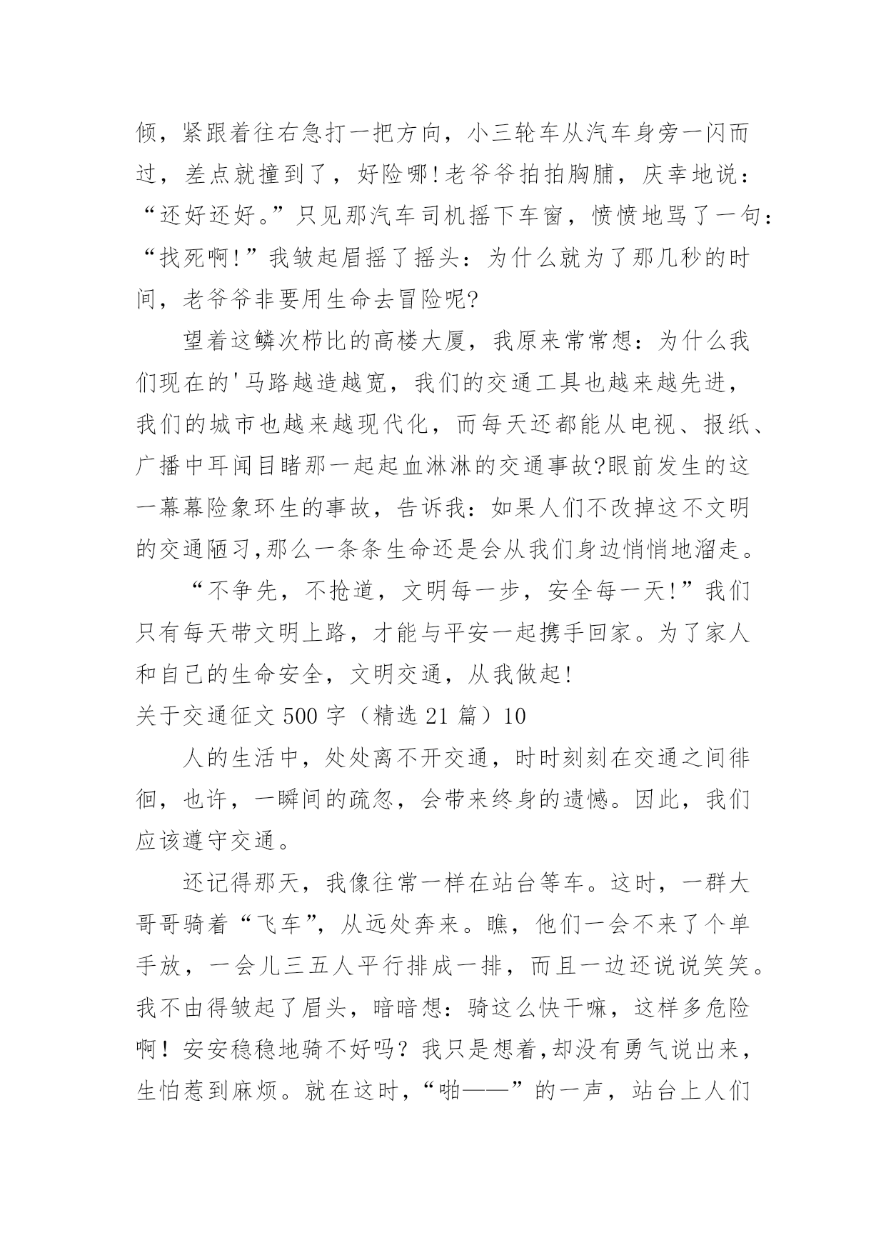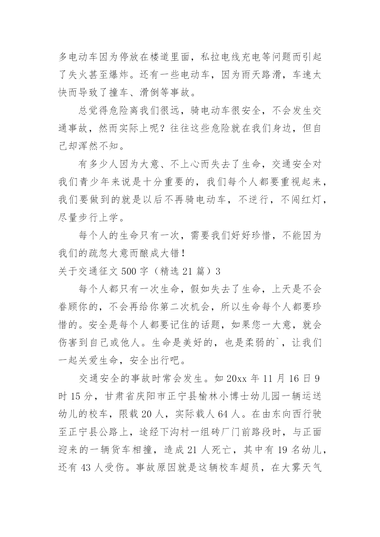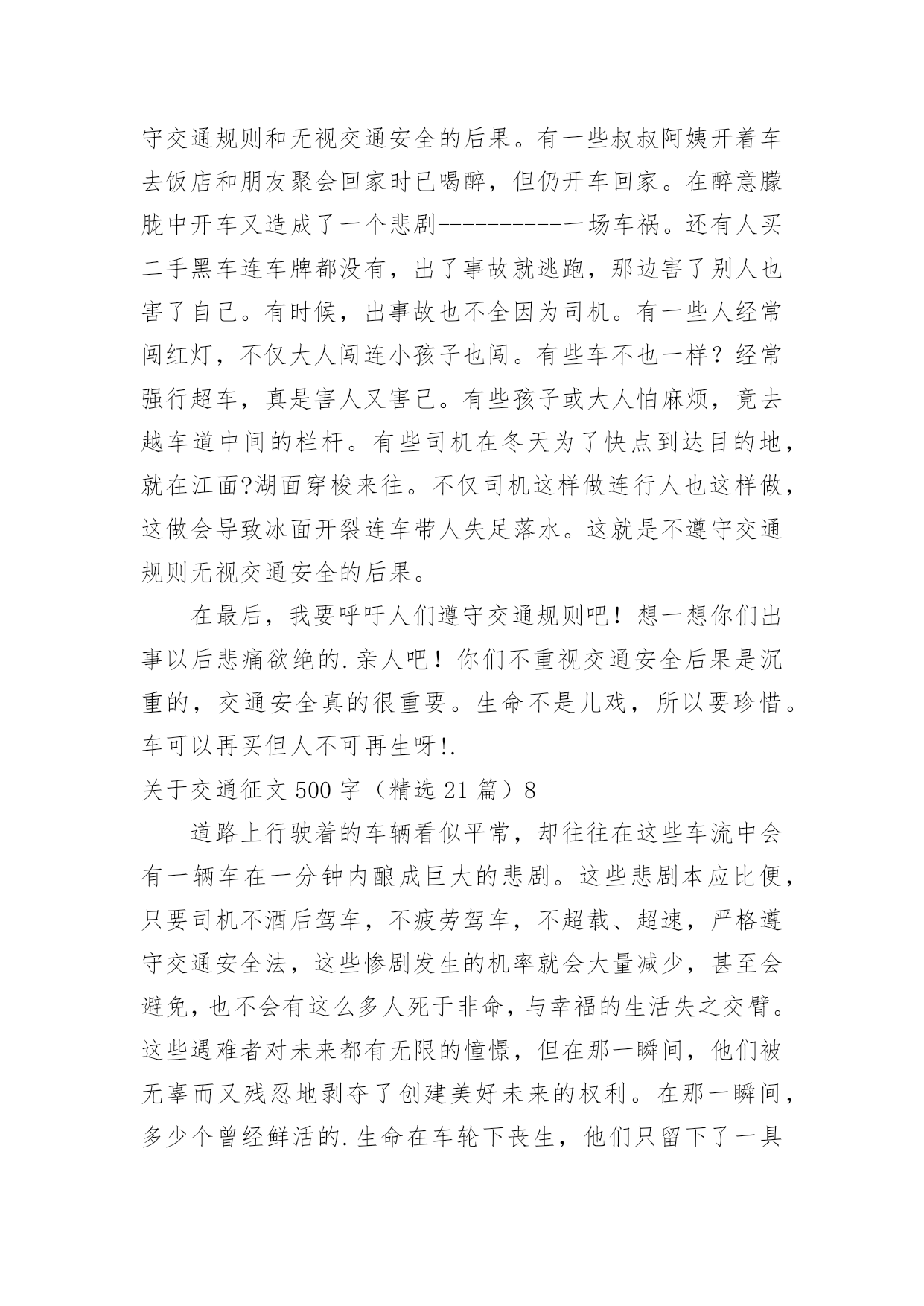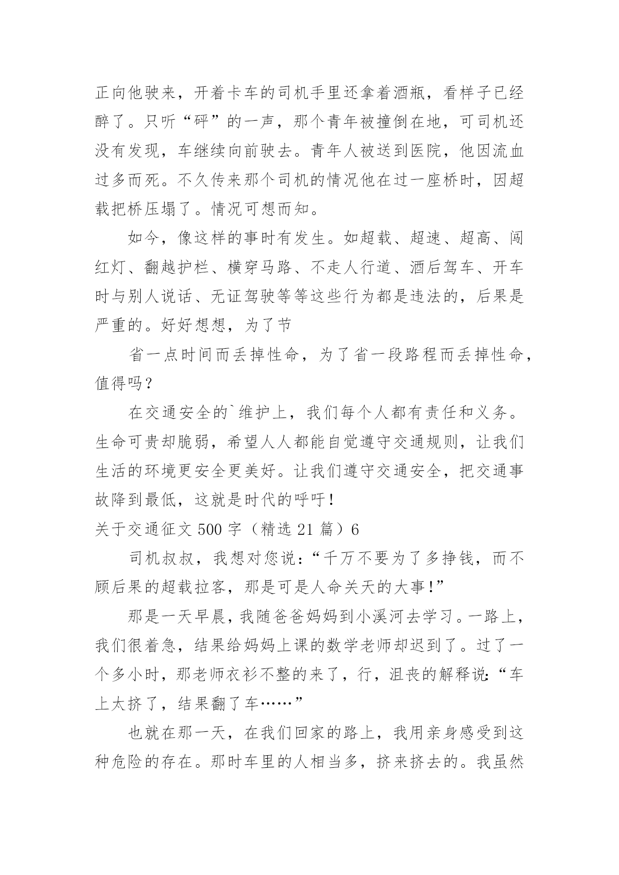 交通征文关于交通征文500字(精选21篇)在平平淡淡的学习、工作、生活中,许多人都有过写征文的经历,对征文都不陌生吧,征文的结尾要或紧扣开头,首尾呼应,或重申观点,再次点题,或给读者留下想象的空间等。你所见过的征文是什么样的呢?下面是小编精心整理的关于交通征文500字(精选21篇),欢迎阅读,希望大家能够喜欢。关于交通征文500字(精选21篇)1在日常生活中,只要一出行,便同交通打上了交道。行走时走神,侥幸过马路,违章开车,小小的疏忽都会使一个美好的生命葬送天堂。上学时,我总看见有一些驾驶员在交警不注意时闯红灯,他们都抱侥幸心理想蒙混过关。不怕一万只怕万一,为了节省时间而闯红灯,是一件多么愚蠢的事啊!遵守交规关系到自己的安全,同时也尊重了他人的.生命。作为一名小学生,遵守交规是应有的行为习惯。文明行走,构筑和谐,这需要每个人从自己做起。想到这儿,我不禁从书架上抽出一本关于交通安全的书。看了一页又一页,我总结出一句话:红灯停,绿灯行,不超载,拐弯要开灯,雨后要慢行,标志手势要看懂,酒后驾车很不好。透过川流不息的车辆,“关爱生命,安全出行”八个字在我的脑海里显得更加突出。发达的.交通给人们带来便利,也增加了许多隐患。人们应学会保护自己,养成文明行车、走路的习惯,营造良好交通环境将为和谐社会撑起一片蓝天。交警叔叔说,道路上发生的交通事故有上万。有些青年在大街上骑摩托车划着S形一路狂奔,拦都拦不住,殊不知道一旦悲剧发生后悔都来不及。生命是美好的,我要提醒大家,车祸无情!我们一定要重视交通安全,时刻加强安全意识,行动起来,让交通安全知识警钟长鸣。关于交通征文500字(精选21篇)2关于交通安全问题,学校很是重视,不止一遍的强调,不让同学们骑电动车上学,不逆行,不闯红灯……学校为此,以前还让我们写过保证书。每年因为电动车所出的安全事故已经不在少数,而且不仅仅是电动车,三轮,四轮也占较大的.比例,可是很多同学却依旧不把安全放在心上。前不久规定的四轮电动车必须上牌照才能上路后,昨天各个工作群,小区群又发了通知,所有两轮电动车也必须上牌照,车主要佩戴头盔才可以上路。是有点突然,但是这毕竟是为了大家的安全。继续说交通安全问题,下午的班会就是关于此主题。谢老师让我们观看了两个关于电动车事故的视频,视频中,许多电动车因为停放在楼道里面,私拉电线充电等问题而引起了失火甚至爆炸。还有一些电动车,因为雨天路滑,车速太快而导致了撞车、滑倒等事故。总觉得危险离我们很远,骑电动车很安全,不会发生交通事故,然而实际上呢?往往这些危险就在我们身边,但自己却浑然不知。有多少人因为大意、不上心而失去了生命,交通安全对我们青少年来说是十分重要的,我们每个人都要重视起来,我们要做到的就是以后不再骑电动车,不逆行,不闯红灯,尽量步行上学。每个人的生命只有一次,需要我们好好珍惜,不能因为我们的疏忽大意而酿成大错!关于交通征文500字(精选21篇)3每个人都只有一次生命,假如失去了生命,上天是不会眷顾你的,不会再给你第二次机会,所以生命每个人都要珍惜的。安全是每个人都要记住的话题,如果您一大意,就会伤害到自己或他人。生命是美好的,也是柔弱的`,让我们一起关爱生命,安全出行吧。交通安全的事故时常会发生。如20xx年11月16日9时15分,甘肃省庆阳市正宁县榆林小博士幼儿园一辆运送幼儿的校车,限载20人,实际载人64人。在由东向西行驶至正宁县公路上,途经下沟村一组砖厂门前路段时,与正面迎来的一辆货车相撞,造成21人死亡,其中有19名幼儿,还有43人受伤。事故原因就是这辆校车超员,在大雾天气下超速行驶。驾驶人在事故中付出了生命的代价。校车驾驶员超速行驶,花儿带血飘零啊!这个事例告诉我们,学生安全关乎学校、家庭和社会的安宁,涉及到千家万户,校车安全更是学校安全工作最重要的一部分。作为校车驾驶员一定要有责任感,时刻保持着清醒的头脑,严格遵守交通法规,做到不超速、不超载。关爱生命,安全出行是我们永恒的话题。关爱生命,安全出行是我们永恒的话题。我们小学生要时时刻刻注意出行的安全,信号绿灯亮时,我们可以通过;黄灯亮时,不许人通过;红灯亮时,不许人和车辆通过。过马路时,要左右都瞧一瞧,大家都要走人行道。马路上若没有斑马线,直通行不要打打闹闹。在过马路时,集中思想,不要东张西望,不能边走边玩耍,不要三五成群并排走。可能有些人会认为乱过马路没有关系,反正驾驶员会刹车,没什么好怕的。其实刹车并不是一刹就停的。就像我们在跑步,突然停下来,总会再向前跑几步,所以过马路时还是存在危险的。生命是无价之宝,只有一次。不要让美好的生命在马路上丧失。让我们携手一起,关爱生命,安全出行吧。在马路上要做到,一停、二看、三通过。关于交通征文500字(精选21篇)4”车祸“一个熟悉而又陌生的词语。每天的新闻报道中几乎都有