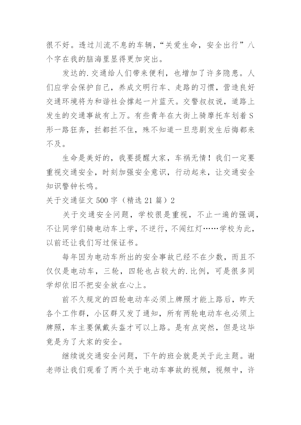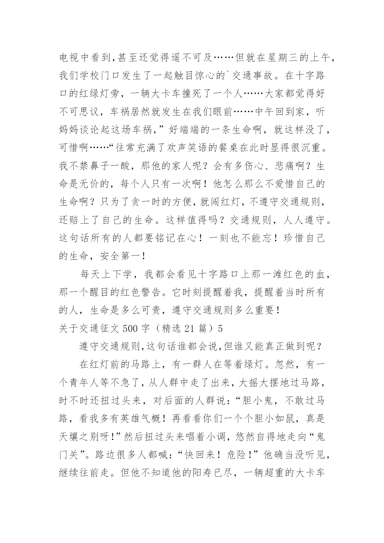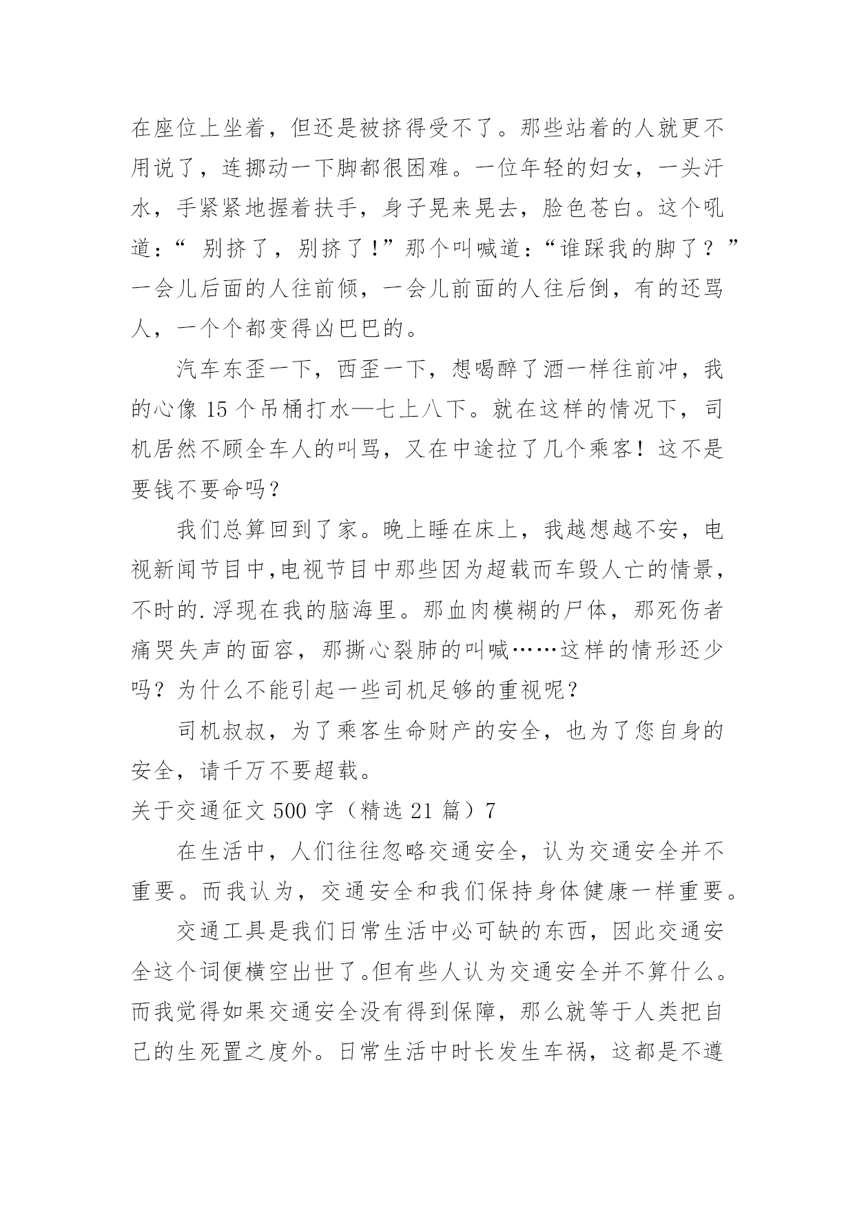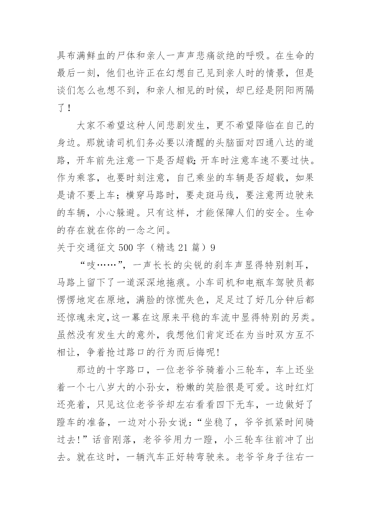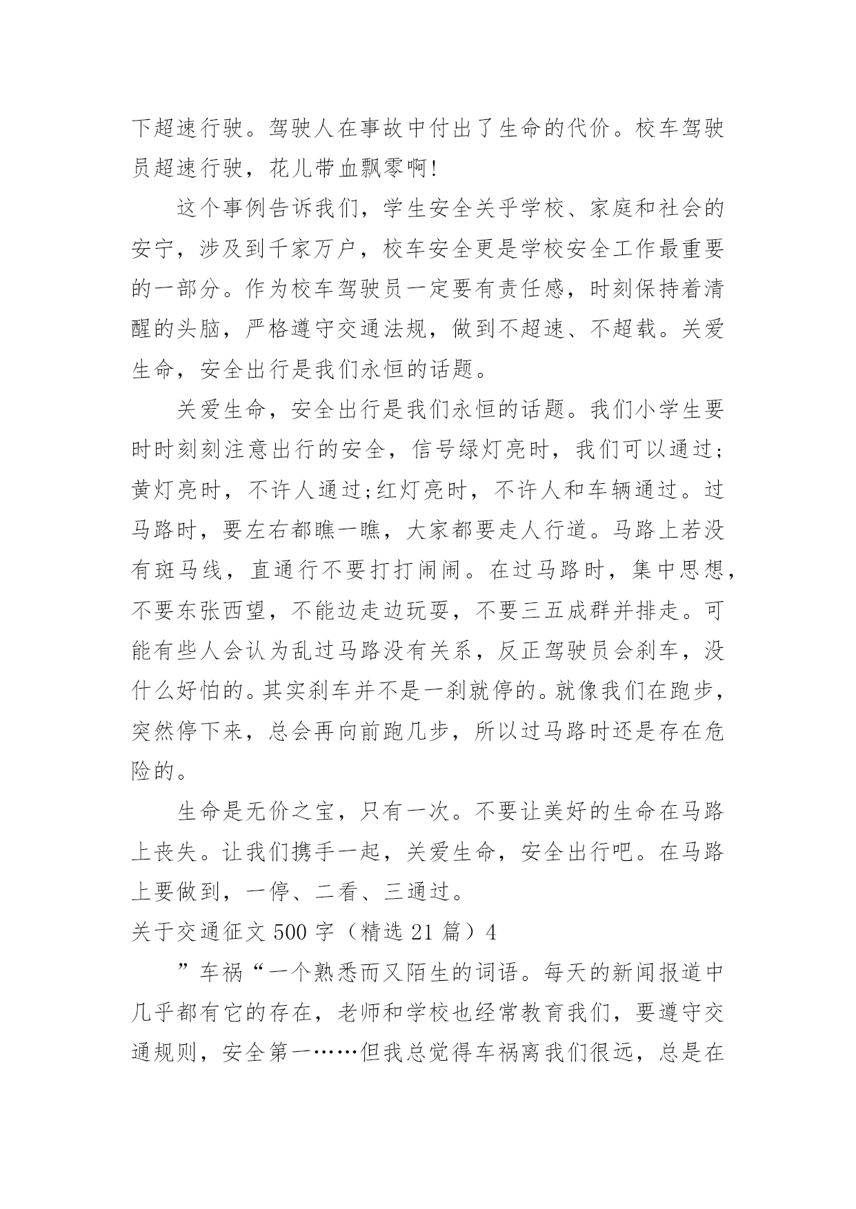 交通征文关于交通征文500字(精选21篇)在平平淡淡的学习、工作、生活中,许多人都有过写征文的经历,对征文都不陌生吧,征文的结尾要或紧扣开头,首尾呼应,或重申观点,再次点题,或给读者留下想象的空间等。你所见过的征文是什么样的呢?下面是小编精心整理的关于交通征文500字(精选21篇),欢迎阅读,希望大家能够喜欢。关于交通征文500字(精选21篇)1在日常生活中,只要一出行,便同交通打上了交道。行走时走神,侥幸过马路,违章开车,小小的疏忽都会使一个美好的生命葬送天堂。上学时,我总看见有一些驾驶员在交警不注意时闯红灯,他们都抱侥幸心理想蒙混过关。不怕一万只怕万一,为了节省时间而闯红灯,是一件多么愚蠢的事啊!遵守交规关系到自己的安全,同时也尊重了他人的.生命。作为一名小学生,遵守交规是应有的行为习惯。文明行走,构筑和谐,这需要每个人从自己做起。想到这儿,我不禁从书架上抽出一本关于交通安全的书。看了一页又一页,我总结出一句话:红灯停,绿灯行,不超载,拐弯要开灯,雨后要慢行,标志手势要看懂,酒后驾车很不好。透过川流不息的车辆,“关爱生命,安全出行”八个字在我的脑海里显得更加突出。发达的.交通给人们带来便利,也增加了许多隐患。人们应学会保护自己,养成文明行车、走路的习惯,营造良好交通环境将为和谐社会撑起一片蓝天。交警叔叔说,道路上发生的交通事故有上万。有些青年在大街上骑摩托车划着S形一路狂奔,拦都拦不住,殊不知道一旦悲剧发生后悔都来不及。生命是美好的,我要提醒大家,车祸无情!我们一定要重视交通安全,时刻加强安全意识,行动起来,让交通安全知识警钟长鸣。关于交通征文500字(精选21篇)2关于交通安全问题,学校很是重视,不止一遍的强调,不让同学们骑电动车上学,不逆行,不闯红灯……学校为此,以前还让我们写过保证书。每年因为电动车所出的安全事故已经不在少数,而且不仅仅是电动车,三轮,四轮也占较大的.比例,可是很多同学却依旧不把安全放在心上。前不久规定的四轮电动车必须上牌照才能上路后,昨天各个工作群,小区群又发了通知,所有两轮电动车也必须上牌照,车主要佩戴头盔才可以上路。是有点突然,但是这毕竟是为了大家的安全。继续说交通安全问题,下午的班会就是关于此主题。谢老师让我们观看了两个关于电动车事故的视频,视频中,许多电动车因为停放在楼道里面,私拉电线充电等问题而引起了失火甚至爆炸。还有一些电动车,因为雨天路滑,车速太快而导致了撞车、滑倒等事故。总觉得危险离我们很远,骑电动车很安全,不会发生交通事故,然而实际上呢?往往这些危险就在我们身边,但自己却浑然不知。有多少人因为大意、不上心而失去了生命,交通安全对我们青少年来说是十分重要的,我们每个人都要重视起来,我们要做到的就是以后不再骑电动车,不逆行,不闯红灯,尽量步行上学。每个人的生命只有一次,需要我们好好珍惜,不能因为我们的疏忽大意而酿成大错!关于交通征文500字(精选21篇)3每个人都只有一次生命,假如失去了生命,上天是不会眷顾你的,不会再给你第二次机会,所以生命每个人都要珍惜的。安全是每个人都要记住的话题,如果您一大意,就会伤害到自己或他人。生命是美好的,也是柔弱的`,让我们一起关爱生命,安全出行吧。交通安全的事故时常会发生。如20xx年11月16日9时15分,甘肃省庆阳市正宁县榆林小博士幼儿园一辆运送幼儿的校车,限载20人,实际载人64人。在由东向西行驶至正宁县公路上,途经下沟村一组砖厂门前路段时,与正面迎来的一辆货车相撞,造成21人死亡,其中有19名幼儿,还有43人受伤。事故原因就是这辆校车超员,在大雾天气下超速行驶。驾驶人在事故中付出了生命的代价。校车驾驶员超速行驶,花儿带血飘零啊!这个事例告诉我们,学生安全关乎学校、家庭和社会的安宁,涉及到千家万户,校车安全更是学校安全工作最重要的一部分。作为校车驾驶员一定要有责任感,时刻保持着清醒的头脑,严格遵守交通法规,做到不超速、不超载。关爱生命,安全出行是我们永恒的话题。关爱生命,安全出行是我们永恒的话题。我们小学生要时时刻刻注意出行的安全,信号绿灯亮时,我们可以通过;黄灯亮时,不许人通过;红灯亮时,不许人和车辆通过。过马路时,要左右都瞧一瞧,大家都要走人行道。马路上若没有斑马线,直通行不要打打闹闹。在过马路时,集中思想,不要东张西望,不能边走边玩耍,不要三五成群并排走。可能有些人会认为乱过马路没有关系,反正驾驶员会刹车,没什么好怕的。其实刹车并不是一刹就停的。就像我们在跑步,突然停下来,总会再向前跑几步,所以过马路时还是存在危险的。生命是无价之宝,只有一次。不要让美好的生命在马路上丧失。让我们携手一起,关爱生命,安全出行吧。在马路上要做到,一停、二看、三通过。关于交通征文500字(精选21篇)4”车祸“一个熟悉而又陌生的词语。每天的新闻报道中几乎都有