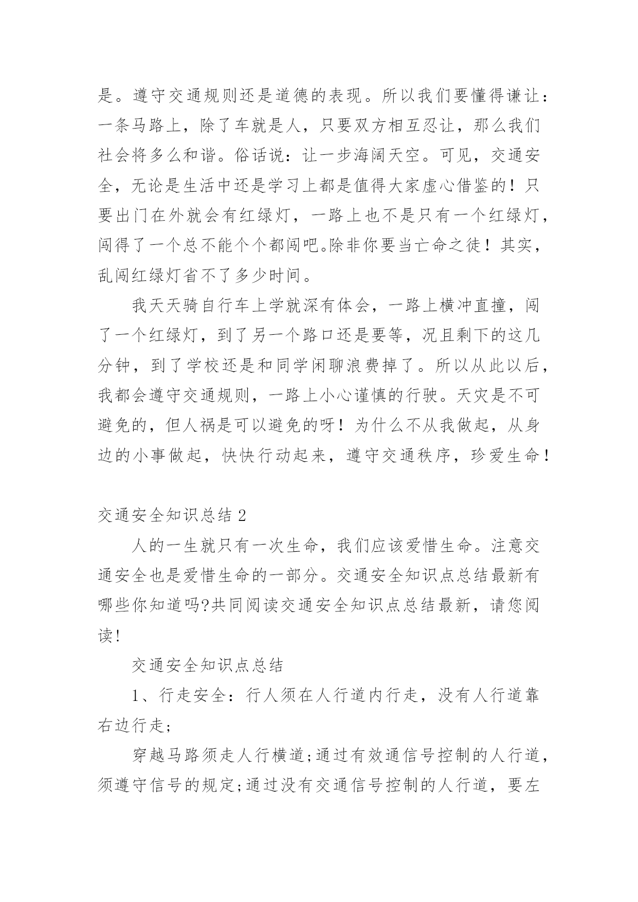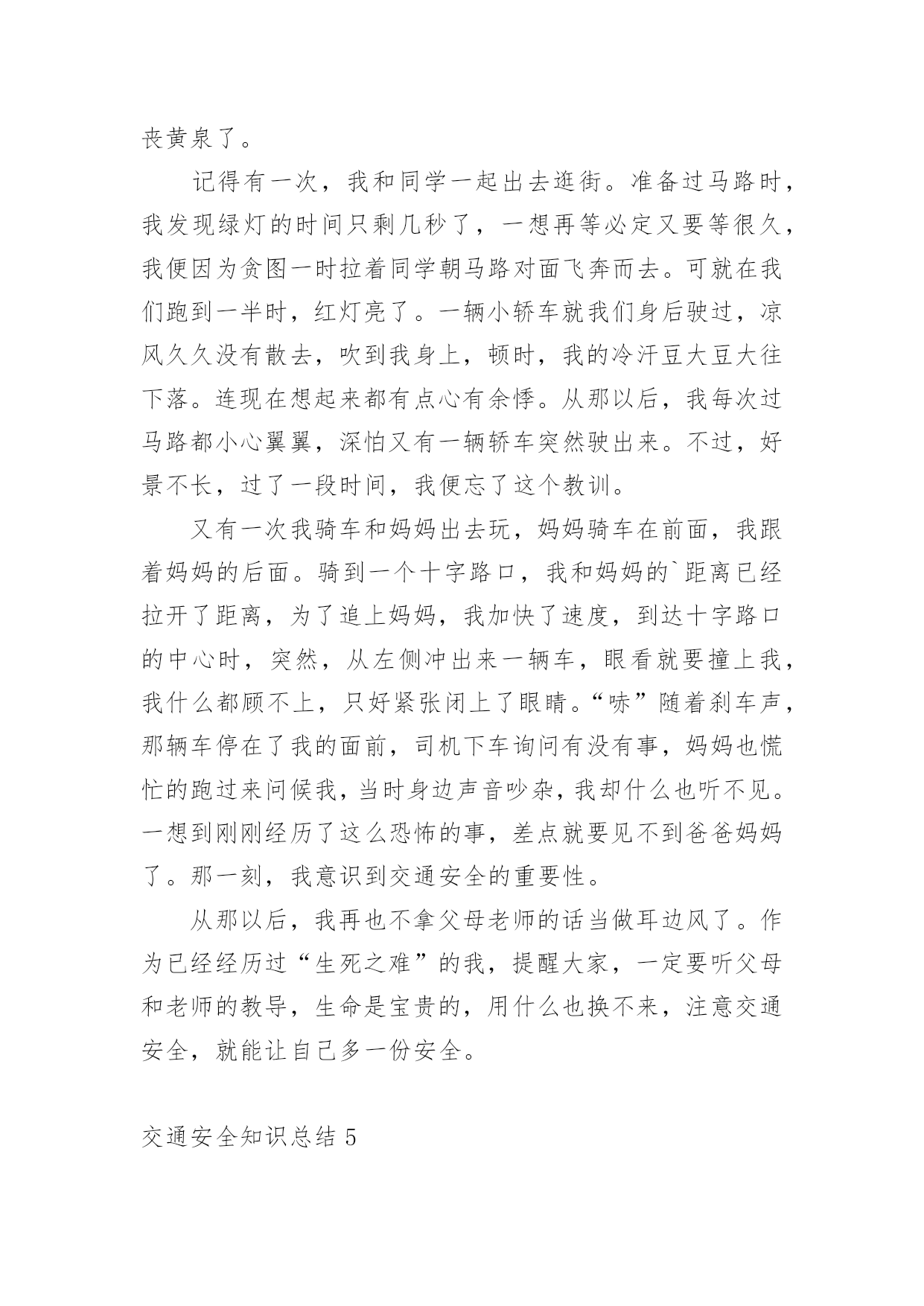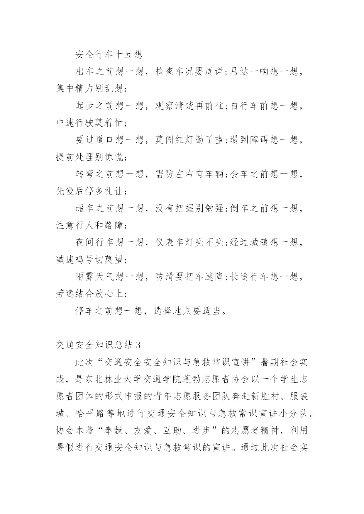 交通安全知识总结交通安全知识总结(集合15篇)总结是指社会团体、企业单位和个人在自身的某一时期、某一项目或某些工作告一段落或者全部完成后进行回顾检查、分析评价,从而肯定成绩,得到经验,找出差距,得出教训和一些规律性认识的一种书面材料,它能帮我们理顺知识结构,突出重点,突破难点,不如我们来制定一份总结吧。如何把总结做到重点突出呢?下面是小编整理的交通安全知识总结,供大家参考借鉴,希望可以帮助到有需要的朋友。交通安全知识总结1交通安全,学校老师讲,校长讲,家里父母讲,我想这四个字大家已不陌生了吧。哦,应该说是听得不耐烦了。可是,我要问一句,这四个字,大家都记在心里了吗?走路不要闯红绿灯,这句话连幼儿园小朋友都知道。可是,又有多少人真正做到了呢?为什么马路要设置红绿灯?不就是为了让交通秩序井然吗?其实遵守交通规则就是对自己的生命负责。我们活着,不仅是为自己而活,更是对关心你、爱护你的人负责。再说,现在我们青少年正处于青春似的年华,为什么我们不能善待生命,开开心心过好每一天?据说,在国外,几乎没有人横穿马路,就算马路上没有汽车,也没有人闯红绿灯。而在中国,横穿马路的人多的.是。遵守交通规则还是道德的表现。所以我们要懂得谦让:一条马路上,除了车就是人,只要双方相互忍让,那么我们社会将多么和谐。俗话说:让一步海阔天空。可见,交通安全,无论是生活中还是学习上都是值得大家虚心借鉴的!只要出门在外就会有红绿灯,一路上也不是只有一个红绿灯,闯得了一个总不能个个都闯吧。除非你要当亡命之徒!其实,乱闯红绿灯省不了多少时间。我天天骑自行车上学就深有体会,一路上横冲直撞,闯了一个红绿灯,到了另一个路口还是要等,况且剩下的这几分钟,到了学校还是和同学闲聊浪费掉了。所以从此以后,我都会遵守交通规则,一路上小心谨慎的行驶。天灾是不可避免的,但人祸是可以避免的呀!为什么不从我做起,从身边的小事做起,快快行动起来,遵守交通秩序,珍爱生命!交通安全知识总结2人的一生就只有一次生命,我们应该爱惜生命。注意交通安全也是爱惜生命的一部分。交通安全知识点总结最新有哪些你知道吗?共同阅读交通安全知识点总结最新,请您阅读!交通安全知识点总结1、行走安全:行人须在人行道内行走,没有人行道靠右边行走;穿越马路须走人行横道;通过有效通信号控制的人行道,须遵守信号的规定;通过没有交通信号控制的人行道,要左顾右盼,注意来往车辆,不准追逐,奔跑;没有行人横道的,须直行通过,不准在车辆临近时突然横穿;有人行过街天桥或地道的,须走人行过街天桥或地道;不准爬越马路边和路中的护栏、隔离栏,不准在道路上扒车、追车、强行拦车或抛物击车。2、骑自行车(电动车、摩托车)安全:不满16周岁不能在道路上骑电动车、摩托车;不打伞骑车;不脱手骑车;不骑车带人;不骑“病”车;不骑快车;不与机动车抢道;不平行骑车;不在恶劣天气骑车。3、乘车安全:乘公共汽车要停稳后上下车,在车上要抓好扶手,头、手等身体部位不能伸出窗外,管好身边物品,防止扒窃;乘高速汽车要系安全带;不乘超载车。小学生交通安全知识1、汽车不是一刹车就停的有的学生认为乱过马路没有什么关系,反正驾驶员会刹车的。其实,汽车不是一刹就停的。由于惯性作用,刹车后车还会向前滑一段路,这就是力的惯性作用。就像人在奔跑中,突然停下来,还会不由自主地身前冲几步一样。何况还有可能驾驶员不注意,刹车不灵等。所以,乱穿马路是十分危险的,不少交通事故就是因为行人乱过马路造成的。血的教训应当引以为戒。2、安全走路走路,谁不会呢?其实不然,如果我们不注意交通安全,走路就会闯祸。所以上学读书、放学回家、节假日外出时走在人来车往的交通繁忙的'道路上,要遵守交通规则,增强自我保护意识。走路要走人行道上。在没有人行道的地方,应靠道路右边行走。走路时,思想要集中,不要东张西望,不能一边走一边玩耍,不能一边走路一边看书,不能三五成群并行行走,不要乱过马路,更不要追赶车辆嬉戏打闹。更不要在马路上踢球、溜冰、放风筝、做游戏。一旦被来往车辆装倒,后果十分严重。3、不在车前车后急穿马路有人总是喜欢在汽车前、后急穿马路这是很危险的。驾驶员眼睛看不到的地方,被称为“视线死角”。要是有人在车前车后驾驶员眼睛看不到的“视线死角”内急穿马路,就会造成车祸。所以我们横过马路要注意左右来往车辆,先向左看,后向右看,当看清没有来车时才横过马路。在有“人行横到”和“人行天桥“上行走,这样才比较安全。4、礼貌乘车在等乘公共汽车时,应在站台上有次序地候车。要做到等车停稳后,让车上的人先下来,然后依次车。车辆行驶时,要坐好或站稳,并抓住扶手,防止紧急刹车时摔倒。不能将身体的任何部分伸出车外下来后,要注意安全,不要从车前车后突然穿出或猛跑过马路,以免发生伤亡事故。安全行车十五想出车之前想一想,检查车况要周详;马达一响想一想,