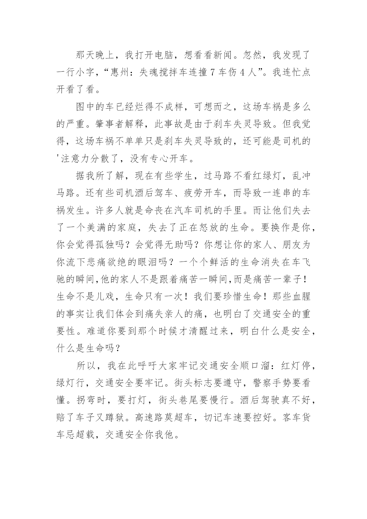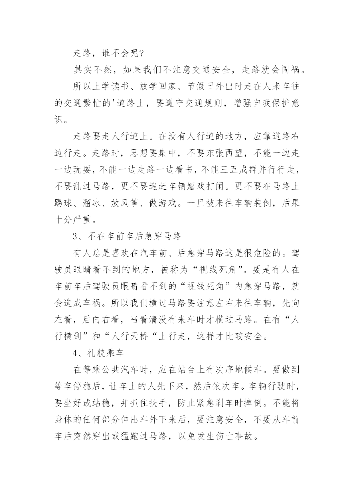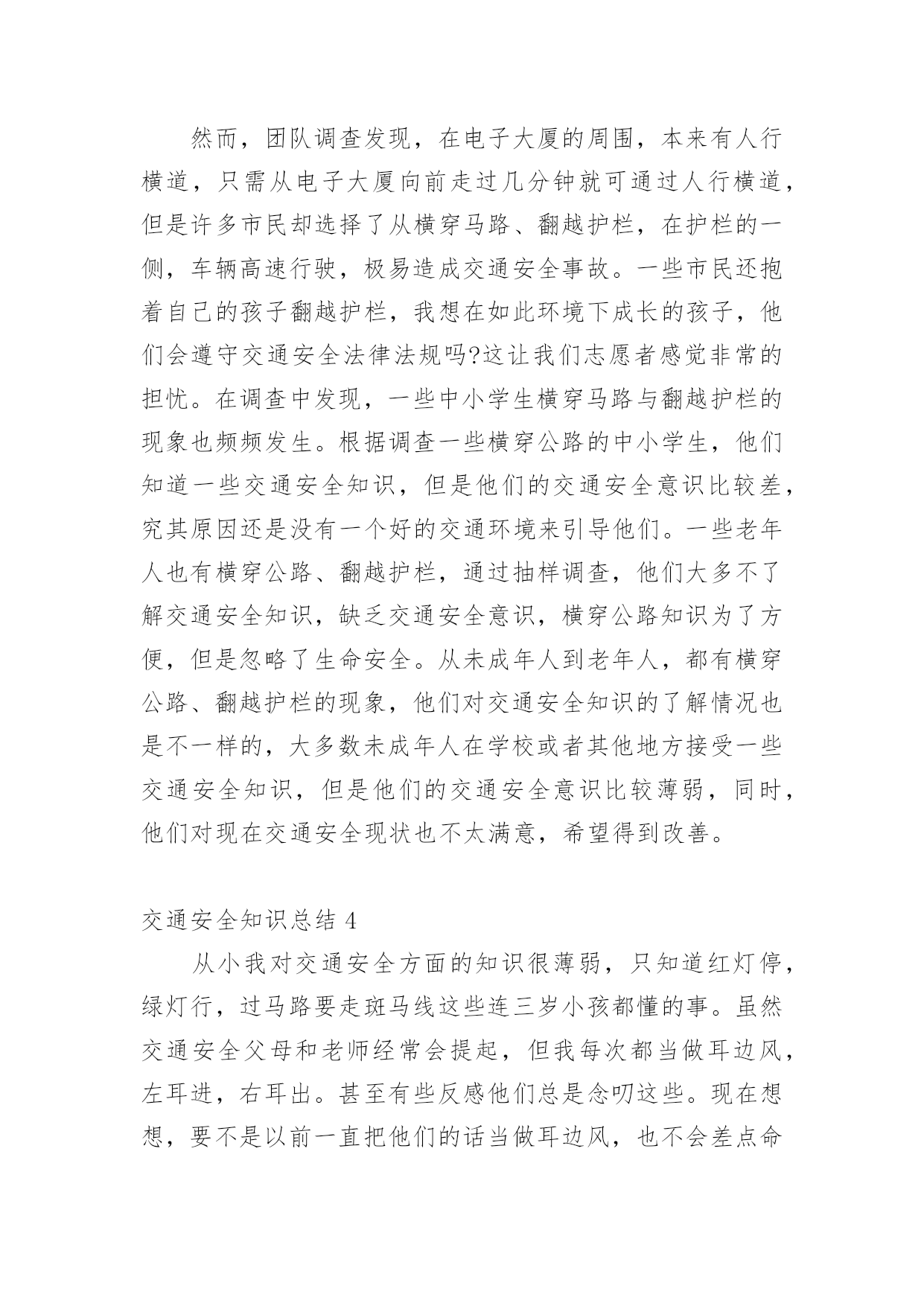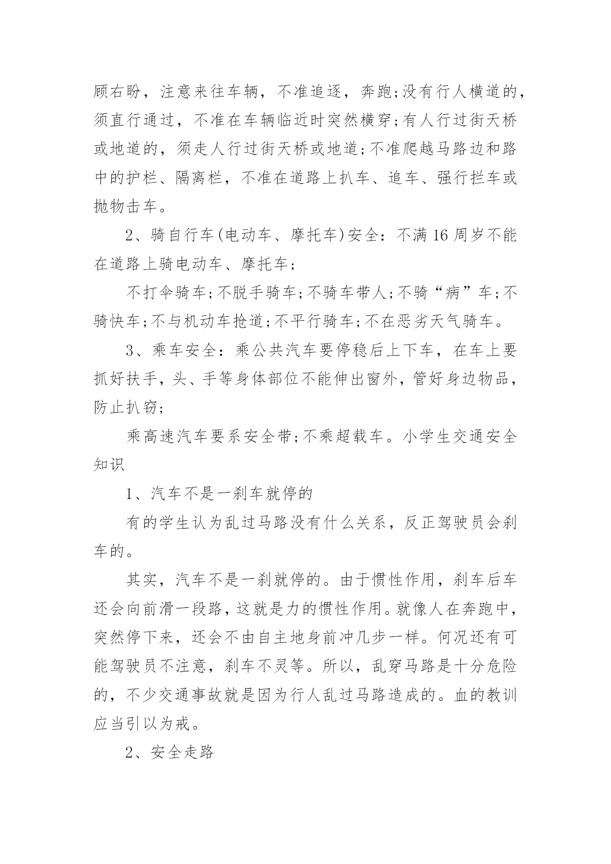 交通安全知识总结交通安全知识总结(集合15篇)总结是指社会团体、企业单位和个人在自身的某一时期、某一项目或某些工作告一段落或者全部完成后进行回顾检查、分析评价,从而肯定成绩,得到经验,找出差距,得出教训和一些规律性认识的一种书面材料,它能帮我们理顺知识结构,突出重点,突破难点,不如我们来制定一份总结吧。如何把总结做到重点突出呢?下面是小编整理的交通安全知识总结,供大家参考借鉴,希望可以帮助到有需要的朋友。交通安全知识总结1交通安全,学校老师讲,校长讲,家里父母讲,我想这四个字大家已不陌生了吧。哦,应该说是听得不耐烦了。可是,我要问一句,这四个字,大家都记在心里了吗?走路不要闯红绿灯,这句话连幼儿园小朋友都知道。可是,又有多少人真正做到了呢?为什么马路要设置红绿灯?不就是为了让交通秩序井然吗?其实遵守交通规则就是对自己的生命负责。我们活着,不仅是为自己而活,更是对关心你、爱护你的人负责。再说,现在我们青少年正处于青春似的年华,为什么我们不能善待生命,开开心心过好每一天?据说,在国外,几乎没有人横穿马路,就算马路上没有汽车,也没有人闯红绿灯。而在中国,横穿马路的人多的.是。遵守交通规则还是道德的表现。所以我们要懂得谦让:一条马路上,除了车就是人,只要双方相互忍让,那么我们社会将多么和谐。俗话说:让一步海阔天空。可见,交通安全,无论是生活中还是学习上都是值得大家虚心借鉴的!只要出门在外就会有红绿灯,一路上也不是只有一个红绿灯,闯得了一个总不能个个都闯吧。除非你要当亡命之徒!其实,乱闯红绿灯省不了多少时间。我天天骑自行车上学就深有体会,一路上横冲直撞,闯了一个红绿灯,到了另一个路口还是要等,况且剩下的这几分钟,到了学校还是和同学闲聊浪费掉了。所以从此以后,我都会遵守交通规则,一路上小心谨慎的行驶。天灾是不可避免的,但人祸是可以避免的呀!为什么不从我做起,从身边的小事做起,快快行动起来,遵守交通秩序,珍爱生命!交通安全知识总结2人的一生就只有一次生命,我们应该爱惜生命。注意交通安全也是爱惜生命的一部分。交通安全知识点总结最新有哪些你知道吗?共同阅读交通安全知识点总结最新,请您阅读!交通安全知识点总结1、行走安全:行人须在人行道内行走,没有人行道靠右边行走;穿越马路须走人行横道;通过有效通信号控制的人行道,须遵守信号的规定;通过没有交通信号控制的人行道,要左顾右盼,注意来往车辆,不准追逐,奔跑;没有行人横道的,须直行通过,不准在车辆临近时突然横穿;有人行过街天桥或地道的,须走人行过街天桥或地道;不准爬越马路边和路中的护栏、隔离栏,不准在道路上扒车、追车、强行拦车或抛物击车。2、骑自行车(电动车、摩托车)安全:不满16周岁不能在道路上骑电动车、摩托车;不打伞骑车;不脱手骑车;不骑车带人;不骑“病”车;不骑快车;不与机动车抢道;不平行骑车;不在恶劣天气骑车。3、乘车安全:乘公共汽车要停稳后上下车,在车上要抓好扶手,头、手等身体部位不能伸出窗外,管好身边物品,防止扒窃;乘高速汽车要系安全带;不乘超载车。小学生交通安全知识1、汽车不是一刹车就停的有的学生认为乱过马路没有什么关系,反正驾驶员会刹车的。其实,汽车不是一刹就停的。由于惯性作用,刹车后车还会向前滑一段路,这就是力的惯性作用。就像人在奔跑中,突然停下来,还会不由自主地身前冲几步一样。何况还有可能驾驶员不注意,刹车不灵等。所以,乱穿马路是十分危险的,不少交通事故就是因为行人乱过马路造成的。血的教训应当引以为戒。2、安全走路走路,谁不会呢?其实不然,如果我们不注意交通安全,走路就会闯祸。所以上学读书、放学回家、节假日外出时走在人来车往的交通繁忙的'道路上,要遵守交通规则,增强自我保护意识。走路要走人行道上。在没有人行道的地方,应靠道路右边行走。走路时,思想要集中,不要东张西望,不能一边走一边玩耍,不能一边走路一边看书,不能三五成群并行行走,不要乱过马路,更不要追赶车辆嬉戏打闹。更不要在马路上踢球、溜冰、放风筝、做游戏。一旦被来往车辆装倒,后果十分严重。3、不在车前车后急穿马路有人总是喜欢在汽车前、后急穿马路这是很危险的。驾驶员眼睛看不到的地方,被称为“视线死角”。要是有人在车前车后驾驶员眼睛看不到的“视线死角”内急穿马路,就会造成车祸。所以我们横过马路要注意左右来往车辆,先向左看,后向右看,当看清没有来车时才横过马路。在有“人行横到”和“人行天桥“上行走,这样才比较安全。4、礼貌乘车在等乘公共汽车时,应在站台上有次序地候车。要做到等车停稳后,让车上的人先下来,然后依次车。车辆行驶时,要坐好或站稳,并抓住扶手,防止紧急刹车时摔倒。不能将身体的任何部分伸出车外下来后,要注意安全,不要从车前车后突然穿出或猛跑过马路,以免发生伤亡事故。安全行车十五想出车之前想一想,检查车况要周详;马达一响想一想,
