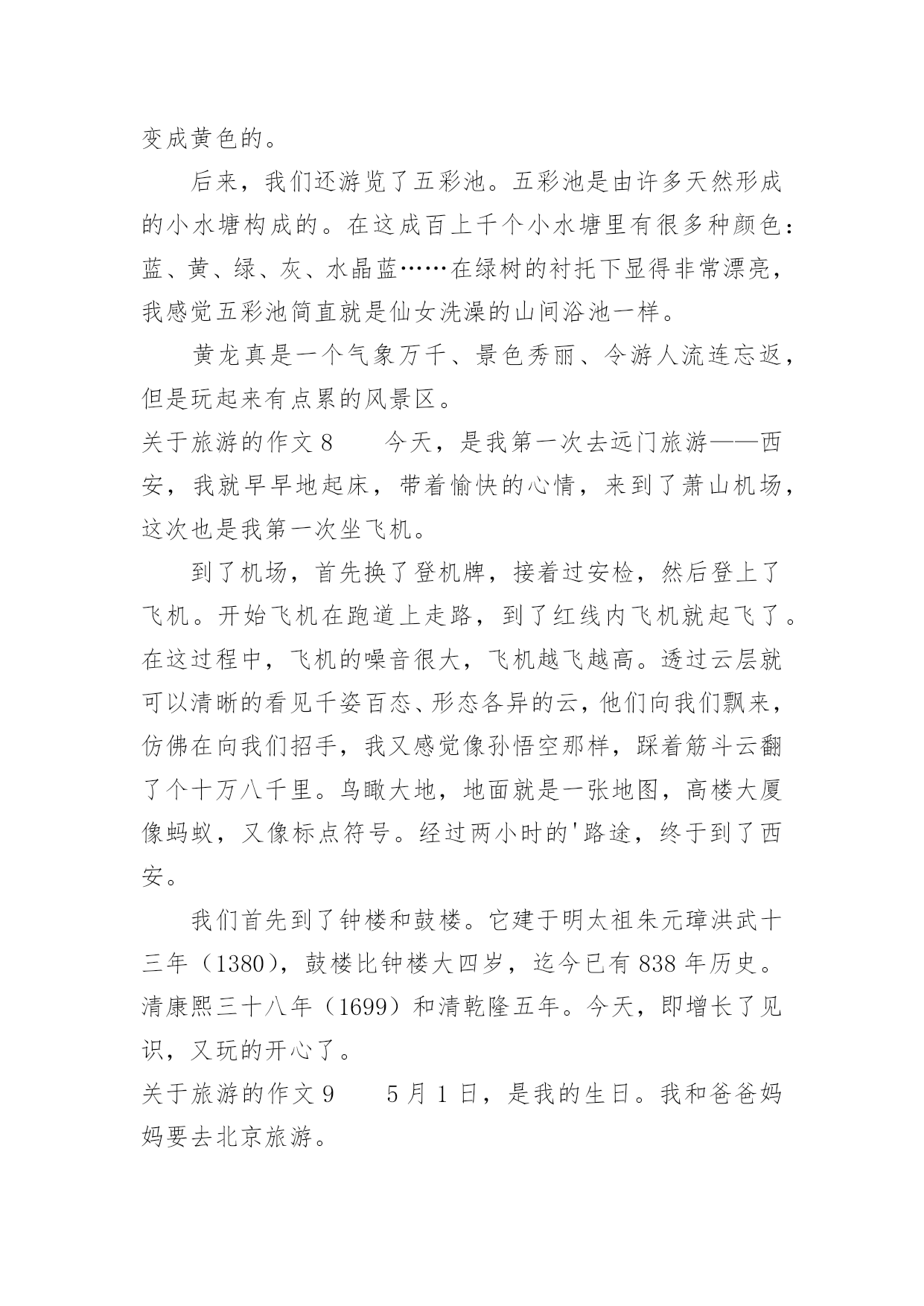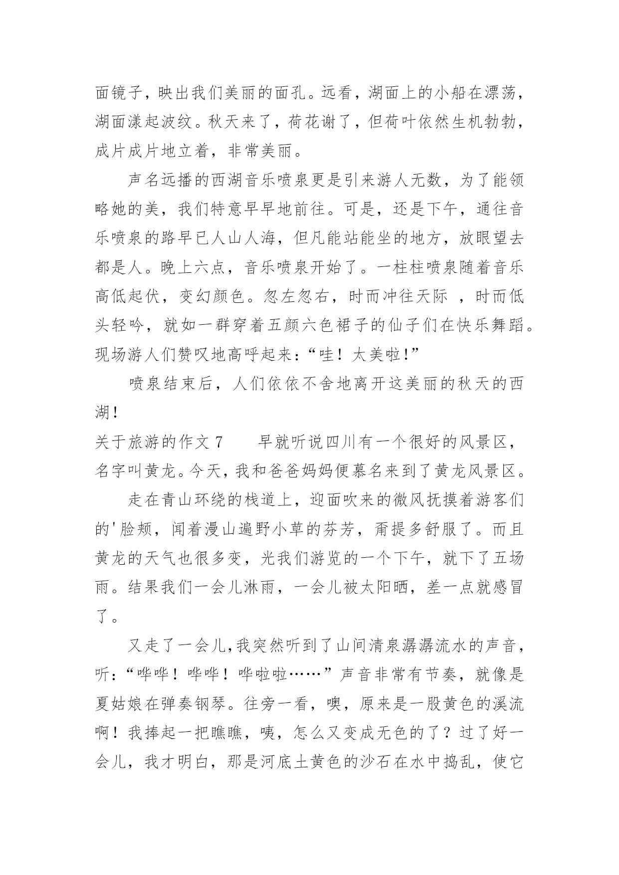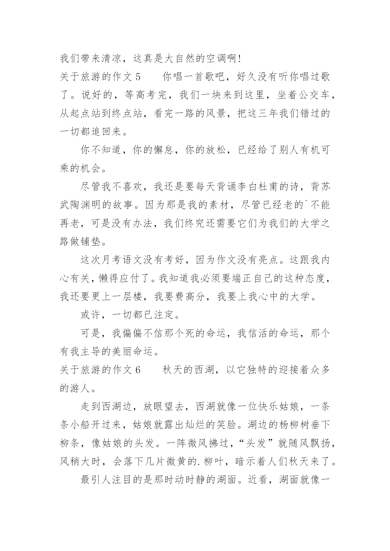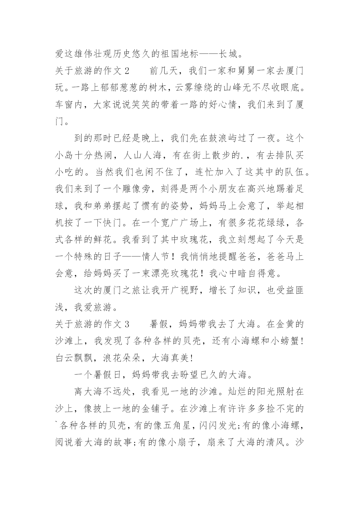 旅游的作文关于旅游的作文(范例10篇)在平凡的学习、工作、生活中,许多人都有过写作文的经历,对作文都不陌生吧,作文是人们把记忆中所存储的有关知识、经验和思想用书面形式表达出来的记叙方式。怎么写作文才能避免踩雷呢?下面是小编帮大家整理的关于旅游的作文,仅供参考,欢迎大家阅读。关于旅游的作文1暑假期间,我游览了祖国的首都——北京。北京处处都有迷人的风景名胜。有景色怡人的颐和园、威武庄严的天安门广场、金碧辉煌的故宫,但是最令我难忘的要数雄伟壮观的长城了。早晨5:00多,我就迫不及待地从床上跳起来,急急忙忙吃完早餐就和朋友们一起乘坐出租车爬长城去了。还没到长城脚下,我的心就已经飞到长城上了。终于到了!真壮观啊!我站在长城脚下抬头望,长城就像一条巨龙在崇山峻岭间蜿蜒盘旋。这么高耸如云怎么爬上去呢?开始爬长城了,我奋力地往上爬,花了九牛二虎之力才爬到最大的`一个垛口。我从垛口向外望去,刚才看到的高耸入云的山都在我的脚下了。一座座青山连绵起伏,像绿色的波浪;山间的公路为群山缠上腰带,山顶的长城则为他们系上围巾。抬头看天,仿佛一伸手就能够到天;闭上眼睛,感觉自己像一只雄鹰在翱翔。这真是一种享受啊!长城是我国古代劳动人民用心血和智慧建造出来的。据说宇航员在太空中也能看到它呢!长城真是一个建筑奇迹啊!我爱这雄伟壮观历史悠久的祖国地标——长城。关于旅游的作文2前几天,我们一家和舅舅一家去厦门玩。一路上郁郁葱葱的树木,云雾缭绕的山峰无不尽收眼底。车窗内,大家说说笑笑的带着一路的好心情,我们来到了厦门。到的那时已经是晚上,我们先在鼓浪屿过了一夜。这个小岛十分热闹,人山人海,有在街上散步的.,有去排队买小吃的。当然我们也闲不住了,连忙加入了这其中的队伍。我们来到了一个雕像旁,刻得是两个小朋友在高兴地踢着足球,我和弟弟摆起了惯有的姿势,妈妈马上会意了,举起相机按了一下快门。在一个宽广广场上,有很多花花绿绿,各式各样的鲜花。我看到了其中玫瑰花,我立刻想起了今天是一个特殊的日子——情人节!我悄悄地提醒爸爸,爸爸马上会意,给妈妈买了一束漂亮玫瑰花!我心中暗自得意。这次的厦门之旅让我开广视野,增长了知识,也受益匪浅,我爱旅游。关于旅游的作文3暑假,妈妈带我去了大海。在金黄的沙滩上,我发现了各种各样的贝壳,还有小海螺和小螃蟹!白云飘飘,浪花朵朵,大海真美!一个暑假日,妈妈带我去盼望已久的大海。离大海不远处,我看见一地的沙滩。灿烂的阳光照射在沙上,像披上一地的金铺子。在沙滩上有许许多多捡不完的`各种各样的贝壳,有的像五角星,闪闪发光;有的像小海螺,阅说着大海的故事;有的像小扇子,扇来了大海的清风。沙滩上还有许许多多大大小小的洞,这些洞是淘气可爱的小螃蟹的窝。有的懒洋洋地晒太阳;有的威武着大钳子;有的一会儿钻进沙里,一会儿跳出来,好像在和我们玩捉迷藏呢!平静的孩子在沉睡的甜蜜的梦香,天空中飘着朵朵白去,海鸥唱着清脆的大海的歌,这真是“海阔凭鱼跃,天高任鸟飞。”冲向海滩,飞溅起洁白无暇,晶莹剔透的浪花。啊!大海真美啊!我爱你。关于旅游的作文4假期,我和妈妈与妈妈的同事来到福州。我们先随着大巴到了三坊七巷。三坊七巷是福州市历史名城的重要标志之一,三坊”是:衣锦坊、文儒坊、光禄坊;“七巷”是:杨桥巷、郎官巷、安民巷、黄巷、塔巷、宫巷、吉庇巷。我们在三坊七巷里喝了鱼丸汤,参观了冰心奶奶的学堂和林则徐的.家。下午,我们坐车绕过弯弯曲曲的山道,来到了天池景区。我们辛苦地爬过海拔1078米高的山,到达山峰。这里风景优美,远远的草坪上弥漫着浓浓的云雾,就如同天地马上合一似的。我们走在云雾里,就如同孙悟空一样腾云驾雾。在草坪中有着一潭清澈碧绿的湖。微风徐徐吹过,水面上泛起微微波纹。鱼儿在水中嬉水,时不时扬起欢乐的水花。这里就如同人间仙境似的。一群牛在这人间仙境里,它们给这里增添了许多光彩。牛儿们有的在悠哉地吃草,有的在悠闲地散步,还有的在瞪着我们,好像不欢迎我们似的。晚上,一阵阵凉风吹过,它把早上的炎热吹走了,它给我们带来清凉,这真是大自然的空调啊!关于旅游的作文5你唱一首歌吧,好久没有听你唱过歌了。说好的,等高考完,我们一块来到这里,坐着公交车,从起点站到终点站,看完一路的风景,把这三年我们错过的一切都追回来。你不知道,你的懈怠,你的放松,已经给了别人有机可乘的机会。尽管我不喜欢,我还是要每天背诵李白杜甫的诗,背苏武陶渊明的故事。因为那是我的素材,尽管已经老的`不能再老,可是没有办法,我们终究还需要它们为我们的大学之路做铺垫。这次月考语文没有考好,因为作文没有亮点。这跟我内心有关,懒得应付了。我知道我必须要端正自己的这种态度,我还要更上一层楼,我要费高分,我要上我心中的大学。或许,一切都已注定。可是,我偏偏不信那个死的命运,我信活的命运,那个有我主导的美丽命运。关于旅游的作文6秋天