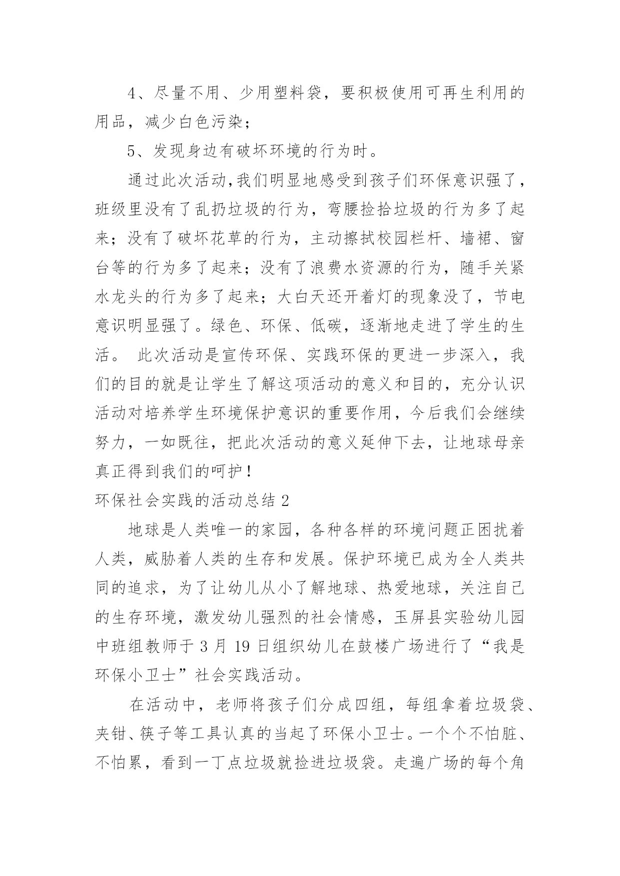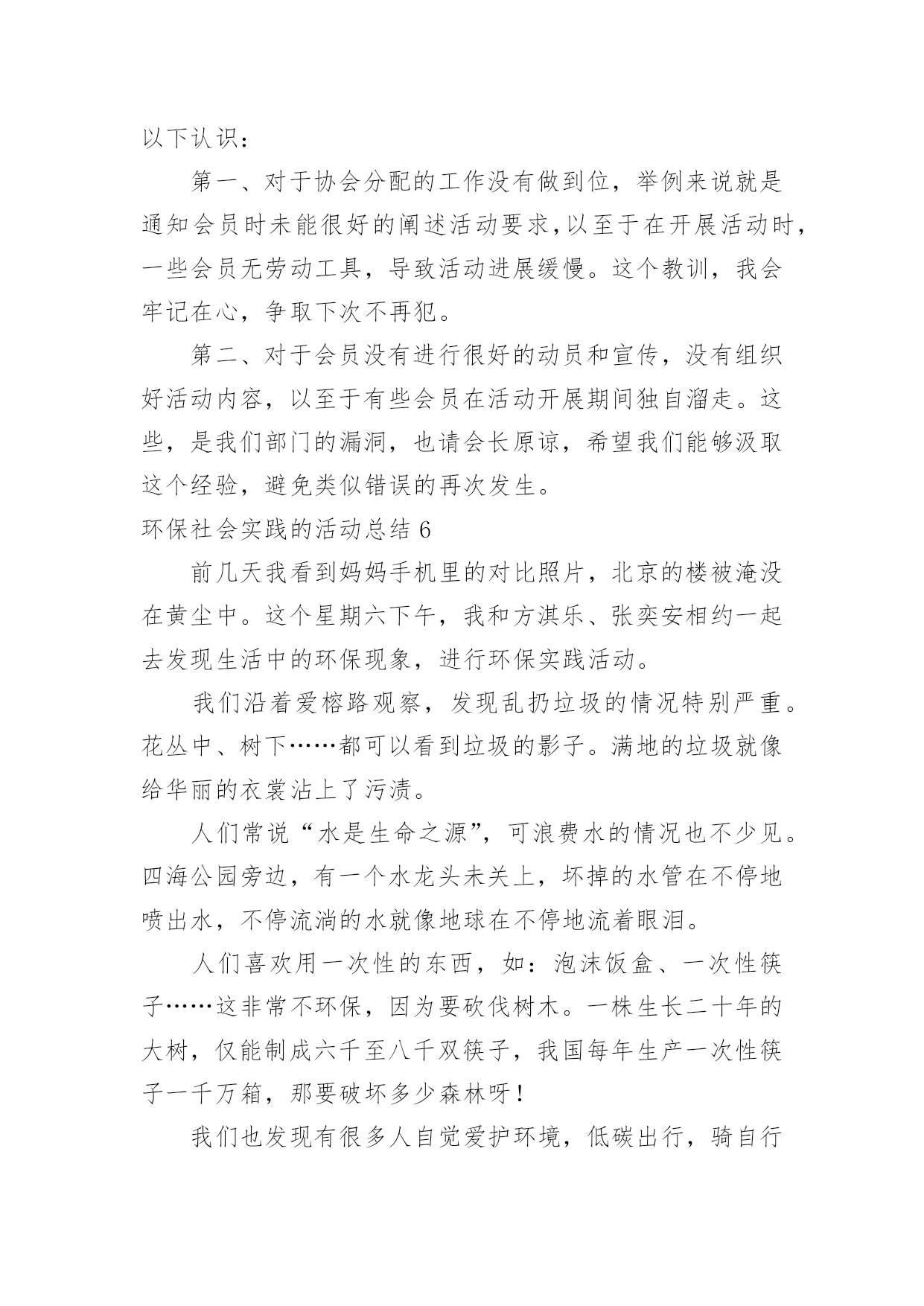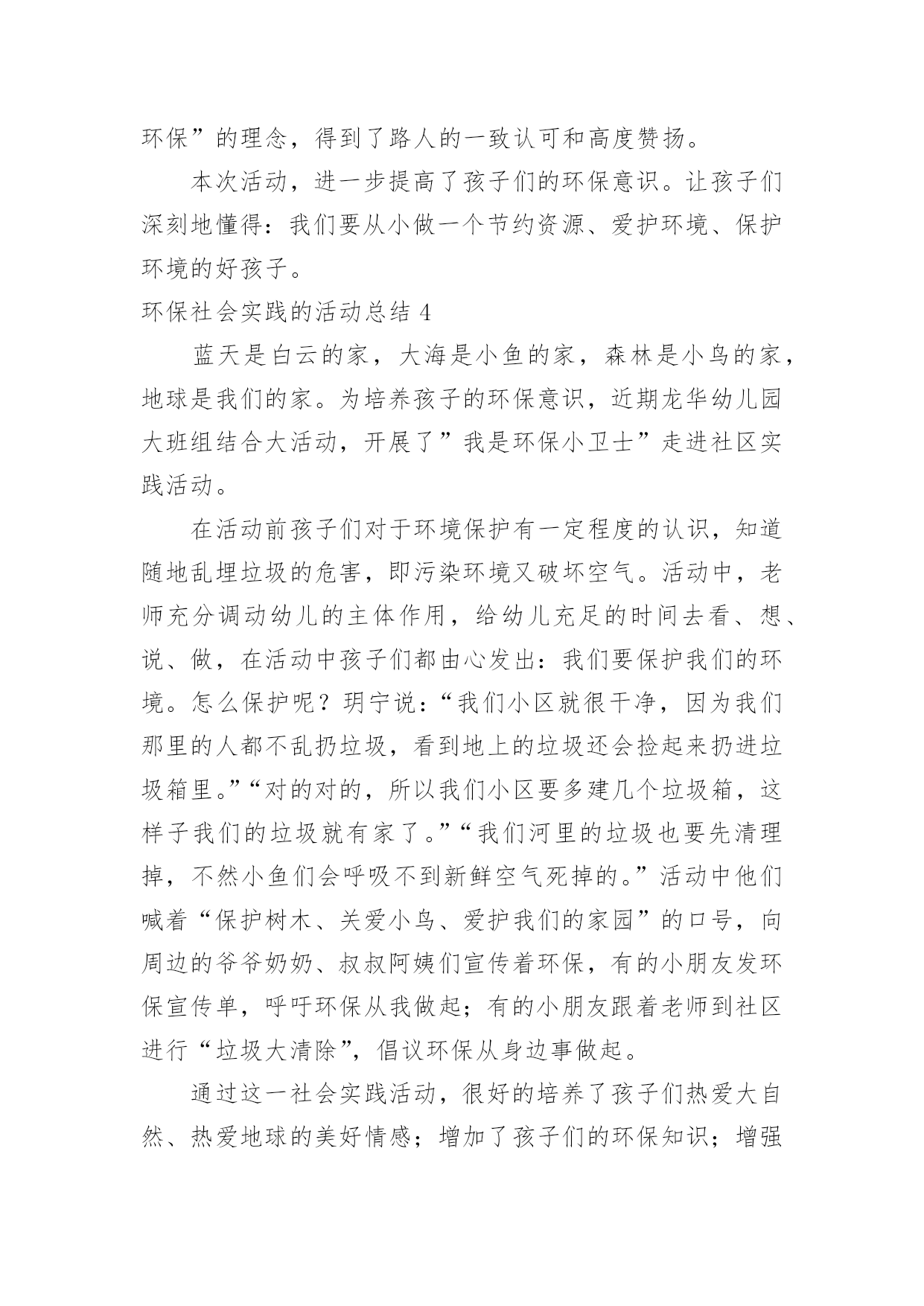 环保社会实践的活动总结环保社会实践的活动总结总结是在某一时期、某一项目或某些工作告一段落或者全部完成后进行回顾检查、分析评价,从而得出教训和一些规律性认识的一种书面材料,它可以明确下一步的工作方向,少走弯路,少犯错误,提高工作效益,因此,让我们写一份总结吧。那么总结应该包括什么内容呢?以下是小编为大家整理的环保社会实践的活动总结,仅供参考,希望能够帮助到大家。环保社会实践的活动总结1我们就是社会的主人,改善地球环境,是我们这代人义不容辞的责任和义务。我们应该努力增强环保意识,节约资源。如果全球人人破坏,天天破坏,地球就会变成垃圾场;如果全球人人环保,天天环保,就能创造一个美好的世界。让我们携起手行动起来,共同努力保护好地球——我们共同的家园。在此,要求我们应从自身做起,从一点一滴小事做起,要时刻做到:1、不乱扔垃圾及废弃物,将垃圾放到指定的垃圾箱内;2、我们学校早已经设置了“垃圾分类存放处”,我们就要积极参与和宣传;3、不要浪费,包括不浪费一张纸、一滴水、一分钱;4、尽量不用、少用塑料袋,要积极使用可再生利用的用品,减少白色污染;5、发现身边有破坏环境的行为时。通过此次活动,我们明显地感受到孩子们环保意识强了,班级里没有了乱扔垃圾的行为,弯腰捡拾垃圾的行为多了起来;没有了破坏花草的行为,主动擦拭校园栏杆、墙裙、窗台等的行为多了起来;没有了浪费水资源的行为,随手关紧水龙头的行为多了起来;大白天还开着灯的现象没了,节电意识明显强了。绿色、环保、低碳,逐渐地走进了学生的生活。此次活动是宣传环保、实践环保的更进一步深入,我们的目的就是让学生了解这项活动的意义和目的,充分认识活动对培养学生环境保护意识的重要作用,今后我们会继续努力,一如既往,把此次活动的意义延伸下去,让地球母亲真正得到我们的呵护!环保社会实践的活动总结2地球是人类唯一的家园,各种各样的环境问题正困扰着人类,威胁着人类的生存和发展。保护环境已成为全人类共同的追求,为了让幼儿从小了解地球、热爱地球,关注自己的生存环境,激发幼儿强烈的社会情感,玉屏县实验幼儿园中班组教师于3月19日组织幼儿在鼓楼广场进行了“我是环保小卫士”社会实践活动。在活动中,老师将孩子们分成四组,每组拿着垃圾袋、夹钳、筷子等工具认真的当起了环保小卫士。一个个不怕脏、不怕累,看到一丁点垃圾就捡进垃圾袋。走遍广场的每个角落,无论是在灌木丛或广场的大小角落的烟蒂,还是在隐蔽角落的废纸团、橘子皮等,孩子们在来往的人群中走走停停,不放过任何一个角落。孩子们在一次次弯腰的过程中,为公共环境的清洁做出了自己的贡献,同时,也切身体验到了清理工作的辛苦,感受到了环卫工人每天工作的辛劳,明白了拥有清洁环境的不易。在活动中,有的小组被正在经过的行人拿出手机留下这具有纪念意义的一幕,有的被友好的奶奶询问是哪所幼儿园的,还有位叔叔对保洁阿姨说:“今天能轻松点了吧?”通过本次实践活动培养了幼儿对大自然及周边环境的探究兴趣,养成良好的环保行为,为环保和绿水青山做出了贡献,真正成为了大自然的好朋友!环保社会实践的活动总结34月22日是世界环保日。为了提高幼儿的环保意识,培养幼儿爱护环境、保护环境的良好行为习惯,4月24日上午,金山中心幼儿园中大班幼儿开展了“关爱地球妈妈一一绿色环保我先行”社会实践活动。活动前,孩子们以“绿色环保”为主题,制作了精美的环保卡片。活动中,孩子们来到金山镇街道广场,将自己手中的卡片送给过往的叔叔阿姨、爷爷奶奶,向他们介绍简单的环保小知识,并告诉他们要做一个节约资源、爱护环境的人。“阿姨,我们要节约用水。”“叔叔,我们要把垃圾扔进垃圾桶。”“爷爷,我们不能随地吐痰。”“奶奶,我们要做一个爱护环境的人。”孩子们以自己的实际行动践行着“绿色环保”的理念,得到了路人的一致认可和高度赞扬。本次活动,进一步提高了孩子们的环保意识。让孩子们深刻地懂得:我们要从小做一个节约资源、爱护环境、保护环境的好孩子。环保社会实践的活动总结4蓝天是白云的家,大海是小鱼的家,森林是小鸟的家,地球是我们的家。为培养孩子的环保意识,近期龙华幼儿园大班组结合大活动,开展了”我是环保小卫士”走进社区实践活动。在活动前孩子们对于环境保护有一定程度的认识,知道随地乱埋垃圾的危害,即污染环境又破坏空气。活动中,老师充分调动幼儿的主体作用,给幼儿充足的时间去看、想、说、做,在活动中孩子们都由心发出:我们要保护我们的环境。怎么保护呢?玥宁说:“我们小区就很干净,因为我们那里的人都不乱扔垃圾,看到地上的垃圾还会捡起来扔进垃圾箱里。”“对的对的,所以我们小区要多建几个垃圾箱,这样子我们的垃圾就有家了。”“我们河里的垃圾也要先清理掉,不然小鱼们会呼吸不到新鲜空气死掉的。”活动中他们喊着“保护树木、关爱小鸟、爱护我们的家园”的口号,向周边的爷爷奶奶、叔叔阿姨们