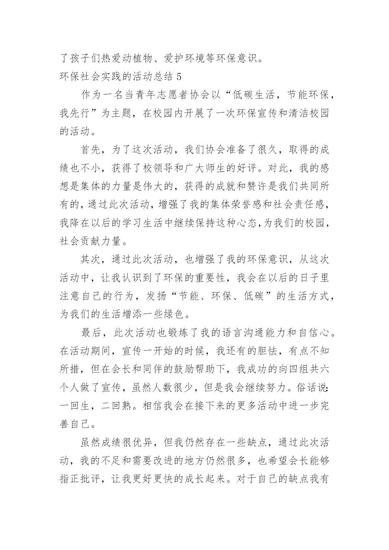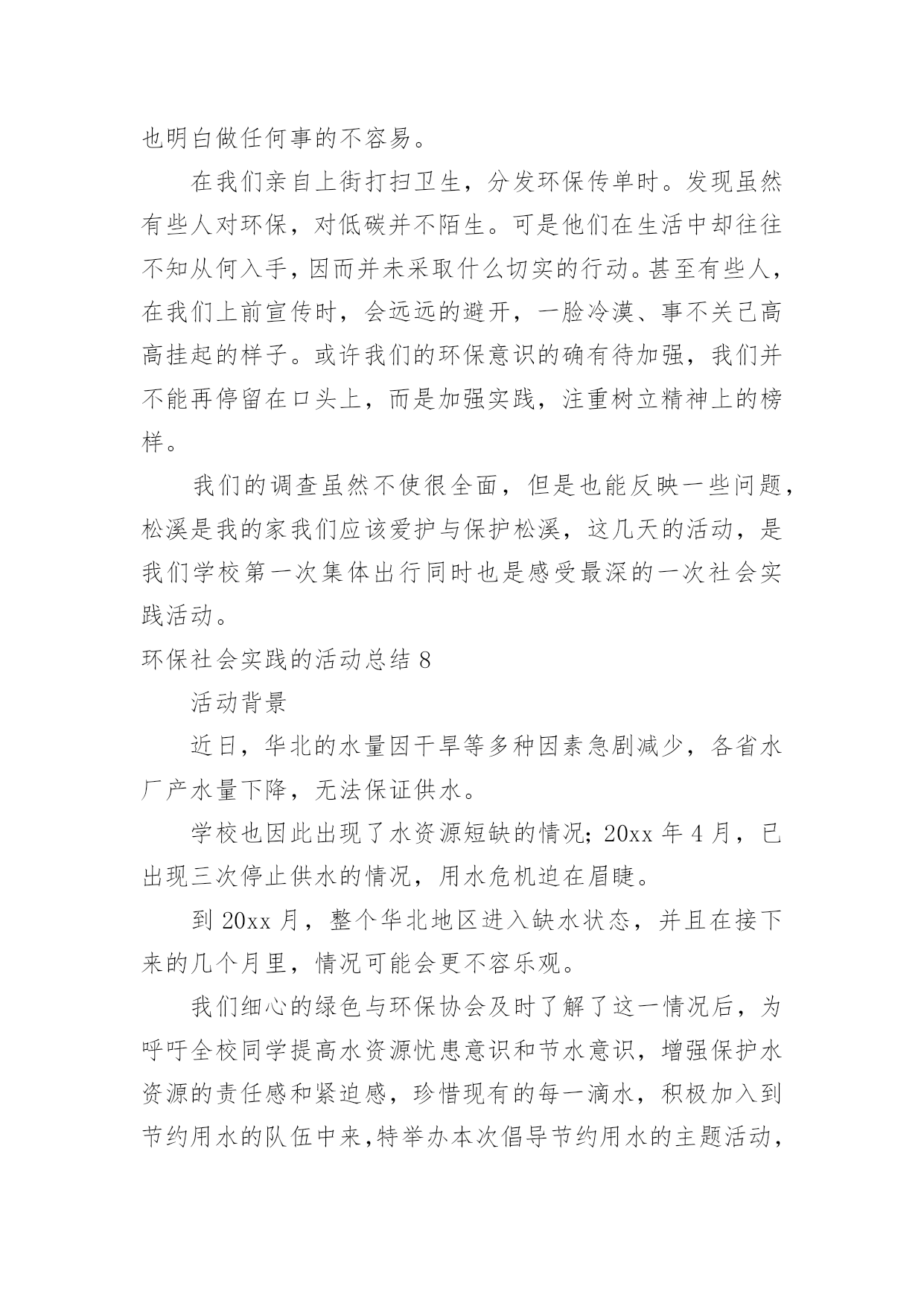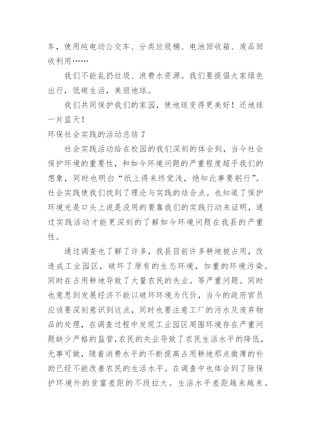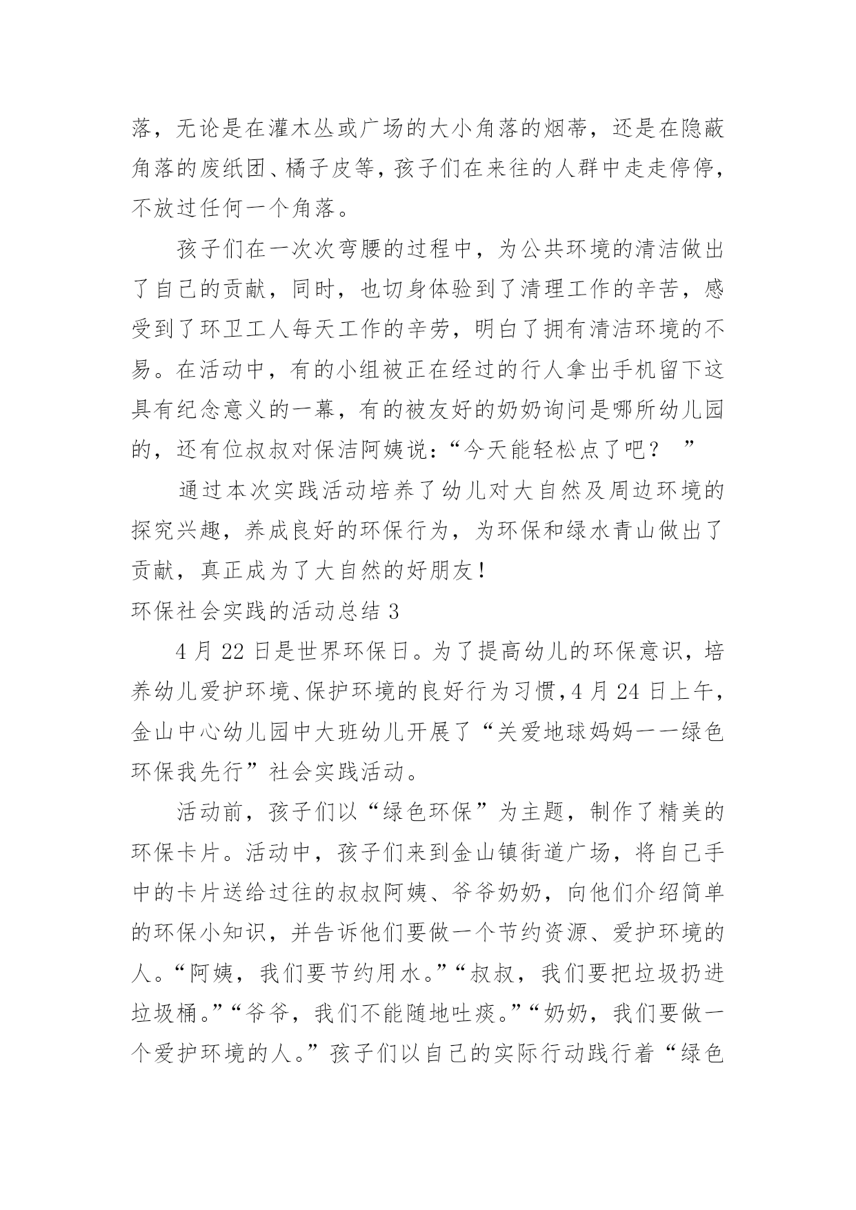 环保社会实践的活动总结环保社会实践的活动总结总结是在某一时期、某一项目或某些工作告一段落或者全部完成后进行回顾检查、分析评价,从而得出教训和一些规律性认识的一种书面材料,它可以明确下一步的工作方向,少走弯路,少犯错误,提高工作效益,因此,让我们写一份总结吧。那么总结应该包括什么内容呢?以下是小编为大家整理的环保社会实践的活动总结,仅供参考,希望能够帮助到大家。环保社会实践的活动总结1我们就是社会的主人,改善地球环境,是我们这代人义不容辞的责任和义务。我们应该努力增强环保意识,节约资源。如果全球人人破坏,天天破坏,地球就会变成垃圾场;如果全球人人环保,天天环保,就能创造一个美好的世界。让我们携起手行动起来,共同努力保护好地球——我们共同的家园。在此,要求我们应从自身做起,从一点一滴小事做起,要时刻做到:1、不乱扔垃圾及废弃物,将垃圾放到指定的垃圾箱内;2、我们学校早已经设置了“垃圾分类存放处”,我们就要积极参与和宣传;3、不要浪费,包括不浪费一张纸、一滴水、一分钱;4、尽量不用、少用塑料袋,要积极使用可再生利用的用品,减少白色污染;5、发现身边有破坏环境的行为时。通过此次活动,我们明显地感受到孩子们环保意识强了,班级里没有了乱扔垃圾的行为,弯腰捡拾垃圾的行为多了起来;没有了破坏花草的行为,主动擦拭校园栏杆、墙裙、窗台等的行为多了起来;没有了浪费水资源的行为,随手关紧水龙头的行为多了起来;大白天还开着灯的现象没了,节电意识明显强了。绿色、环保、低碳,逐渐地走进了学生的生活。此次活动是宣传环保、实践环保的更进一步深入,我们的目的就是让学生了解这项活动的意义和目的,充分认识活动对培养学生环境保护意识的重要作用,今后我们会继续努力,一如既往,把此次活动的意义延伸下去,让地球母亲真正得到我们的呵护!环保社会实践的活动总结2地球是人类唯一的家园,各种各样的环境问题正困扰着人类,威胁着人类的生存和发展。保护环境已成为全人类共同的追求,为了让幼儿从小了解地球、热爱地球,关注自己的生存环境,激发幼儿强烈的社会情感,玉屏县实验幼儿园中班组教师于3月19日组织幼儿在鼓楼广场进行了“我是环保小卫士”社会实践活动。在活动中,老师将孩子们分成四组,每组拿着垃圾袋、夹钳、筷子等工具认真的当起了环保小卫士。一个个不怕脏、不怕累,看到一丁点垃圾就捡进垃圾袋。走遍广场的每个角落,无论是在灌木丛或广场的大小角落的烟蒂,还是在隐蔽角落的废纸团、橘子皮等,孩子们在来往的人群中走走停停,不放过任何一个角落。孩子们在一次次弯腰的过程中,为公共环境的清洁做出了自己的贡献,同时,也切身体验到了清理工作的辛苦,感受到了环卫工人每天工作的辛劳,明白了拥有清洁环境的不易。在活动中,有的小组被正在经过的行人拿出手机留下这具有纪念意义的一幕,有的被友好的奶奶询问是哪所幼儿园的,还有位叔叔对保洁阿姨说:“今天能轻松点了吧?”通过本次实践活动培养了幼儿对大自然及周边环境的探究兴趣,养成良好的环保行为,为环保和绿水青山做出了贡献,真正成为了大自然的好朋友!环保社会实践的活动总结34月22日是世界环保日。为了提高幼儿的环保意识,培养幼儿爱护环境、保护环境的良好行为习惯,4月24日上午,金山中心幼儿园中大班幼儿开展了“关爱地球妈妈一一绿色环保我先行”社会实践活动。活动前,孩子们以“绿色环保”为主题,制作了精美的环保卡片。活动中,孩子们来到金山镇街道广场,将自己手中的卡片送给过往的叔叔阿姨、爷爷奶奶,向他们介绍简单的环保小知识,并告诉他们要做一个节约资源、爱护环境的人。“阿姨,我们要节约用水。”“叔叔,我们要把垃圾扔进垃圾桶。”“爷爷,我们不能随地吐痰。”“奶奶,我们要做一个爱护环境的人。”孩子们以自己的实际行动践行着“绿色环保”的理念,得到了路人的一致认可和高度赞扬。本次活动,进一步提高了孩子们的环保意识。让孩子们深刻地懂得:我们要从小做一个节约资源、爱护环境、保护环境的好孩子。环保社会实践的活动总结4蓝天是白云的家,大海是小鱼的家,森林是小鸟的家,地球是我们的家。为培养孩子的环保意识,近期龙华幼儿园大班组结合大活动,开展了”我是环保小卫士”走进社区实践活动。在活动前孩子们对于环境保护有一定程度的认识,知道随地乱埋垃圾的危害,即污染环境又破坏空气。活动中,老师充分调动幼儿的主体作用,给幼儿充足的时间去看、想、说、做,在活动中孩子们都由心发出:我们要保护我们的环境。怎么保护呢?玥宁说:“我们小区就很干净,因为我们那里的人都不乱扔垃圾,看到地上的垃圾还会捡起来扔进垃圾箱里。”“对的对的,所以我们小区要多建几个垃圾箱,这样子我们的垃圾就有家了。”“我们河里的垃圾也要先清理掉,不然小鱼们会呼吸不到新鲜空气死掉的。”活动中他们喊着“保护树木、关爱小鸟、爱护我们的家园”的口号,向周边的爷爷奶奶、叔叔阿姨们