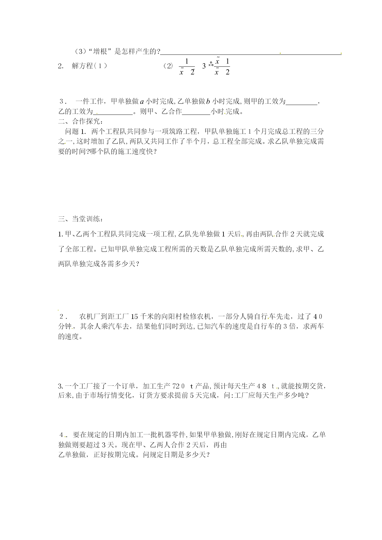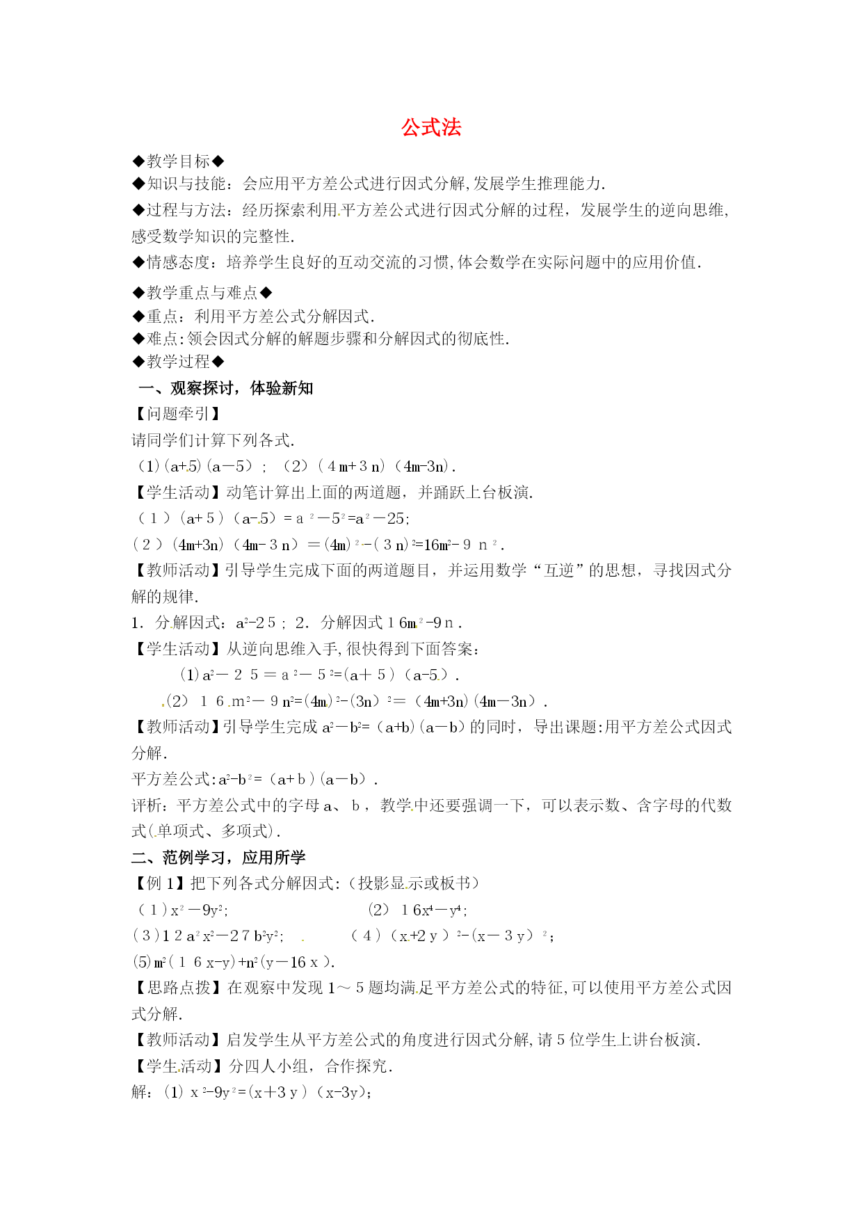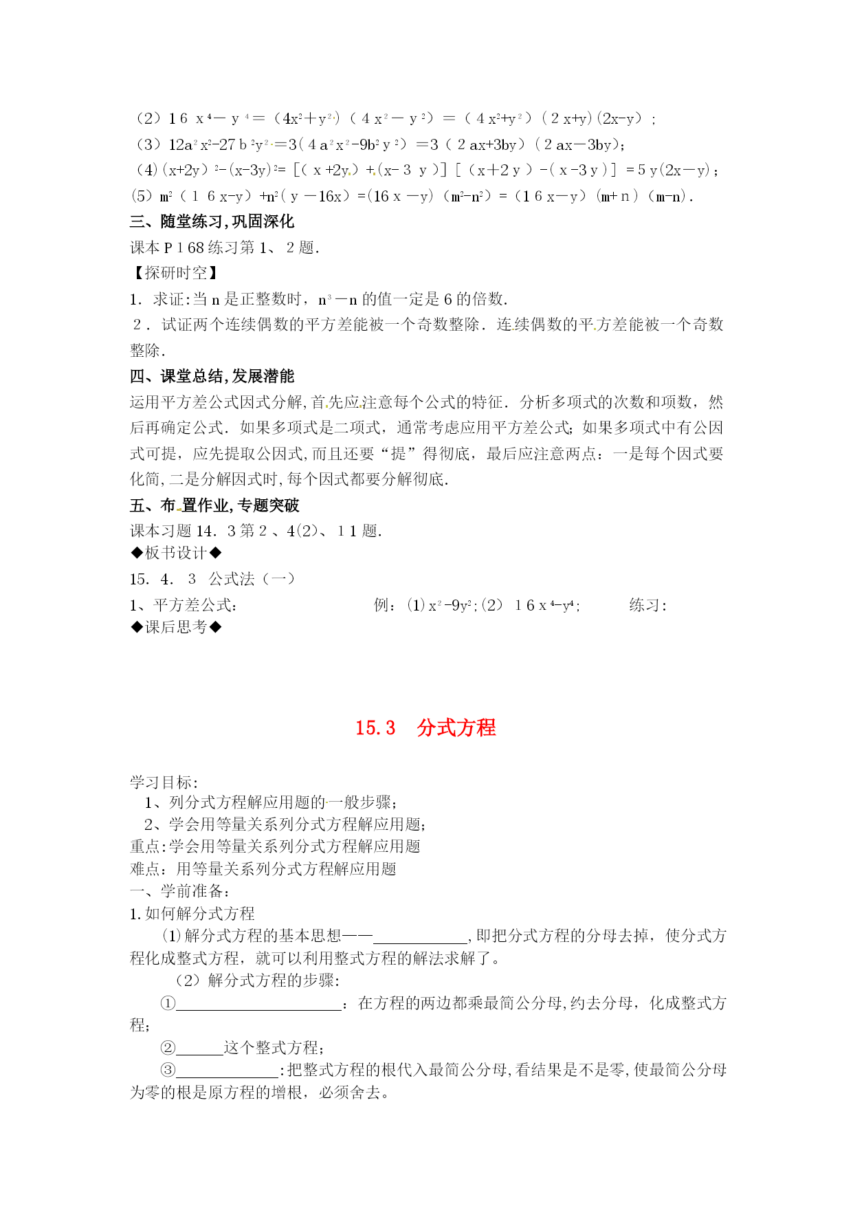 公式法◆教学目标◆◆知识与技能:会应用平方差公式进行因式分解,发展学生推理能力.◆过程与方法:经历探索利用平方差公式进行因式分解的过程,发展学生的逆向思维,感受数学知识的完整性.◆情感态度:培养学生良好的互动交流的习惯,体会数学在实际问题中的应用价值.◆教学重点与难点◆◆重点:利用平方差公式分解因式.◆难点:领会因式分解的解题步骤和分解因式的彻底性.◆教学过程◆一、观察探讨,体验新知【问题牵引】请同学们计算下列各式.(1)(a+5)(a-5);(2)(4m+3n)(4m-3n).【学生活动】动笔计算出上面的两道题,并踊跃上台板演.(1)(a+5)(a-5)=a2-52=a2-25;(2)(4m+3n)(4m-3n)=(4m)2-(3n)2=16m2-9n2.【教师活动】引导学生完成下面的两道题目,并运用数学“互逆”的思想,寻找因式分解的规律.1.分解因式:a2-25;2.分解因式16m2-9n.【学生活动】从逆向思维入手,很快得到下面答案:(1)a2-25=a2-52=(a+5)(a-5).(2)16m2-9n2=(4m)2-(3n)2=(4m+3n)(4m-3n).【教师活动】引导学生完成a2-b2=(a+b)(a-b)的同时,导出课题:用平方差公式因式分解.平方差公式:a2-b2=(a+b)(a-b).评析:平方差公式中的字母a、b,教学中还要强调一下,可以表示数、含字母的代数式(单项式、多项式).二、范例学习,应用所学【例1】把下列各式分解因式:(投影显示或板书)(1)x2-9y2;(2)16x4-y4;(3)12a2x2-27b2y2;(4)(x+2y)2-(x-3y)2;(5)m2(16x-y)+n2(y-16x).【思路点拨】在观察中发现1~5题均满足平方差公式的特征,可以使用平方差公式因式分解.【教师活动】启发学生从平方差公式的角度进行因式分解,请5位学生上讲台板演.【学生活动】分四人小组,合作探究.解:(1)x2-9y2=(x+3y)(x-3y);(2)16x4-y4=(4x2+y2)(4x2-y2)=(4x2+y2)(2x+y)(2x-y);(3)12a2x2-27b2y2=3(4a2x2-9b2y2)=3(2ax+3by)(2ax-3by);(4)(x+2y)2-(x-3y)2=[(x+2y)+(x-3y)][(x+2y)-(x-3y)]=5y(2x-y);(5)m2(16x-y)+n2(y-16x)=(16x-y)(m2-n2)=(16x-y)(m+n)(m-n).三、随堂练习,巩固深化课本P168练习第1、2题.【探研时空】1.求证:当n是正整数时,n3-n的值一定是6的倍数.2.试证两个连续偶数的平方差能被一个奇数整除.连续偶数的平方差能被一个奇数整除.四、课堂总结,发展潜能运用平方差公式因式分解,首先应注意每个公式的特征.分析多项式的次数和项数,然后再确定公式.如果多项式是二项式,通常考虑应用平方差公式;如果多项式中有公因式可提,应先提取公因式,而且还要“提”得彻底,最后应注意两点:一是每个因式要化简,二是分解因式时,每个因式都要分解彻底.五、布置作业,专题突破课本习题14.3第2、4(2)、11题.◆板书设计◆15.4.3公式法(一)1、平方差公式:例:(1)x2-9y2;(2)16x4-y4;练习:◆课后思考◆15.3分式方程学习目标:1、列分式方程解应用题的一般步骤;2、学会用等量关系列分式方程解应用题;重点:学会用等量关系列分式方程解应用题难点:用等量关系列分式方程解应用题一、学前准备:1.如何解分式方程(1)解分式方程的基本思想——,即把分式方程的分母去掉,使分式方程化成整式方程,就可以利用整式方程的解法求解了。(2)解分式方程的步骤:①:在方程的两边都乘最简公分母,约去分母,化成整式方程;②这个整式方程;③:把整式方程的根代入最简公分母,看结果是不是零,使最简公分母为零的根是原方程的增根,必须舍去。(3)“增根”是怎样产生的?2.解方程(1)(2)3.一件工作,甲单独做小时完成,乙单独做小时完成,则甲的工效为,乙的工效为。则甲、乙合作小时完成。二、合作探究:问题1.两个工程队共同参与一项筑路工程,甲队单独施工1个月完成总工程的三分之一,这时增加了乙队,两队又共同工作了半个月,总工程全部完成。求乙队单独完成需要的时间?哪个队的施工速度快?三、当堂训练:1.甲、乙两个工程队共同完成一项工程,乙队先单独做1天后,再由两队合作2天就完成了全部工程。已知甲队单独完成工程所需的天数是乙队单独完成所需天数的,求甲、乙两队单独完成各需多少天?