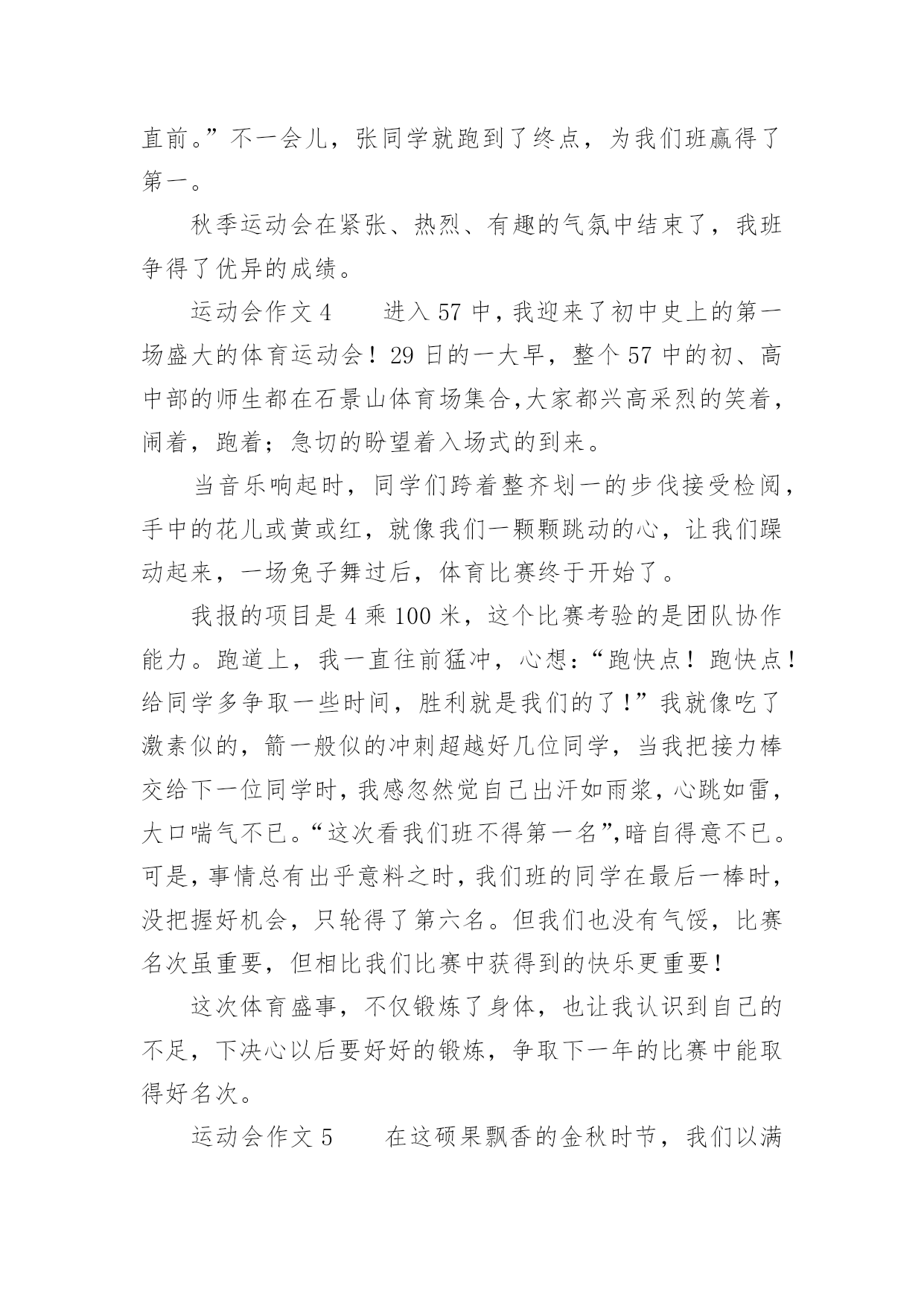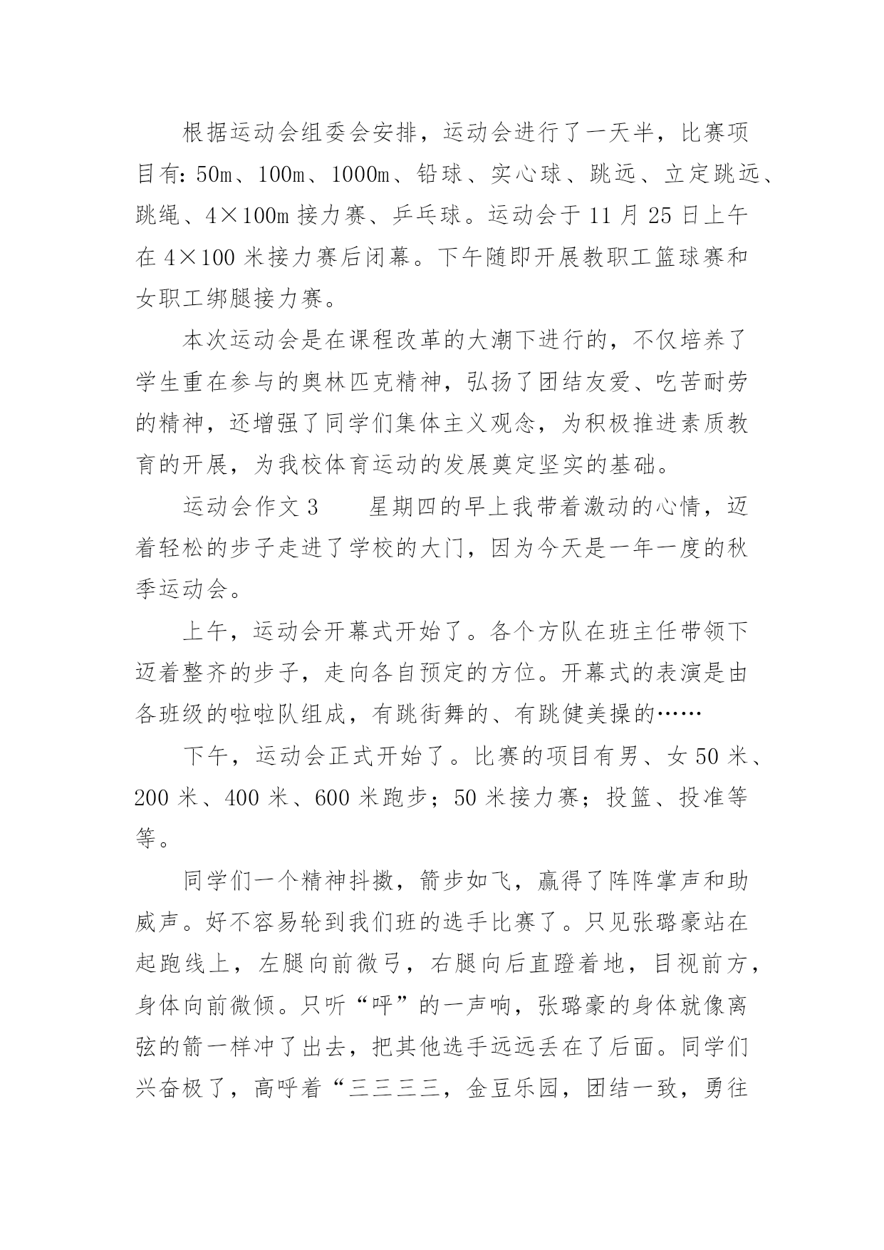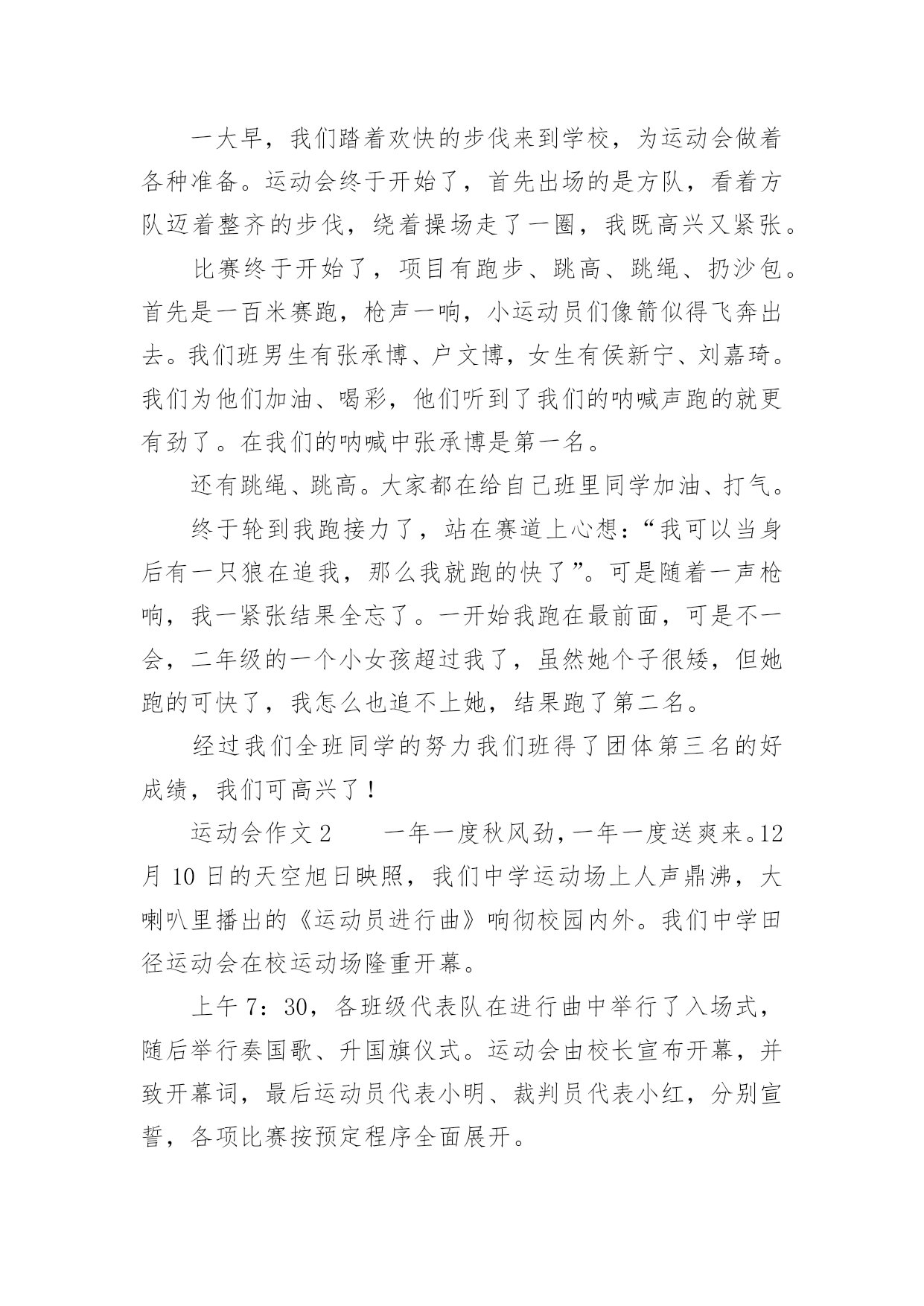 运动会作文400字运动会作文400字作文的分类写作时限来分从作文的写作时限来分,作文可以分为限时作文和非限时作文。限时作文又可以分为课堂作文和考试作文两类。写作字数来分从作文的写作字数来分,作文可以分为限字作文和非限字作文。教育部的新课程标准在学生作文的字数上有了一定的要求,要想让学生在有限的文字中写出非同寻常的好作文,必须要在“想”上下功夫。写作命题来分从作文的写作命题来分,作文可以分为命题作文和非命题作文。命题作文,一般是指出题者给出一个既定的题目,要求应试者根据这个给定题目进行写作。运动会作文400字(精选100篇)在日常的学习、工作、生活中,大家都经常接触到作文吧,作文一定要做到主题集中,围绕同一主题作深入阐述,切忌东拉西扯,主题涣散甚至无主题。你写作文时总是无从下笔?以下是小编帮大家整理的运动会作文400字(精选100篇),仅供参考,大家一起来看看吧。运动会作文1每年一季的秋季运动会开始了,同学们的脸上都带着欢快的笑容。一大早,我们踏着欢快的步伐来到学校,为运动会做着各种准备。运动会终于开始了,首先出场的是方队,看着方队迈着整齐的步伐,绕着操场走了一圈,我既高兴又紧张。比赛终于开始了,项目有跑步、跳高、跳绳、扔沙包。首先是一百米赛跑,枪声一响,小运动员们像箭似得飞奔出去。我们班男生有张承博、户文博,女生有侯新宁、刘嘉琦。我们为他们加油、喝彩,他们听到了我们的呐喊声跑的就更有劲了。在我们的呐喊中张承博是第一名。还有跳绳、跳高。大家都在给自己班里同学加油、打气。终于轮到我跑接力了,站在赛道上心想:“我可以当身后有一只狼在追我,那么我就跑的快了”。可是随着一声枪响,我一紧张结果全忘了。一开始我跑在最前面,可是不一会,二年级的一个小女孩超过我了,虽然她个子很矮,但她跑的可快了,我怎么也追不上她,结果跑了第二名。经过我们全班同学的努力我们班得了团体第三名的好成绩,我们可高兴了!运动会作文2一年一度秋风劲,一年一度送爽来。12月10日的天空旭日映照,我们中学运动场上人声鼎沸,大喇叭里播出的《运动员进行曲》响彻校园内外。我们中学田径运动会在校运动场隆重开幕。上午7:30,各班级代表队在进行曲中举行了入场式,随后举行奏国歌、升国旗仪式。运动会由校长宣布开幕,并致开幕词,最后运动员代表小明、裁判员代表小红,分别宣誓,各项比赛按预定程序全面展开。根据运动会组委会安排,运动会进行了一天半,比赛项目有:50m、100m、1000m、铅球、实心球、跳远、立定跳远、跳绳、4×100m接力赛、乒乓球。运动会于11月25日上午在4×100米接力赛后闭幕。下午随即开展教职工篮球赛和女职工绑腿接力赛。本次运动会是在课程改革的大潮下进行的,不仅培养了学生重在参与的奥林匹克精神,弘扬了团结友爱、吃苦耐劳的精神,还增强了同学们集体主义观念,为积极推进素质教育的开展,为我校体育运动的发展奠定坚实的基础。运动会作文3星期四的早上我带着激动的心情,迈着轻松的步子走进了学校的大门,因为今天是一年一度的秋季运动会。上午,运动会开幕式开始了。各个方队在班主任带领下迈着整齐的步子,走向各自预定的方位。开幕式的表演是由各班级的啦啦队组成,有跳街舞的、有跳健美操的……下午,运动会正式开始了。比赛的项目有男、女50米、200米、400米、600米跑步;50米接力赛;投篮、投准等等。同学们一个精神抖擞,箭步如飞,赢得了阵阵掌声和助威声。好不容易轮到我们班的选手比赛了。只见张璐豪站在起跑线上,左腿向前微弓,右腿向后直蹬着地,目视前方,身体向前微倾。只听“呯”的一声响,张璐豪的身体就像离弦的箭一样冲了出去,把其他选手远远丢在了后面。同学们兴奋极了,高呼着“三三三三,金豆乐园,团结一致,勇往直前。”不一会儿,张同学就跑到了终点,为我们班赢得了第一。秋季运动会在紧张、热烈、有趣的气氛中结束了,我班争得了优异的成绩。运动会作文4进入57中,我迎来了初中史上的第一场盛大的体育运动会!29日的一大早,整个57中的初、高中部的师生都在石景山体育场集合,大家都兴高采烈的笑着,闹着,跑着;急切的盼望着入场式的到来。当音乐响起时,同学们跨着整齐划一的步伐接受检阅,手中的花儿或黄或红,就像我们一颗颗跳动的心,让我们躁动起来,一场兔子舞过后,体育比赛终于开始了。我报的项目是4乘100米,这个比赛考验的是团队协作能力。跑道上,我一直往前猛冲,心想:“跑快点!跑快点!给同学多争取一些时间,胜利就是我们的了!”我就像吃了激素似的,箭一般似的冲刺超越好几位同学,当我把接力棒交给下一位同学时,我感忽然觉自己出汗如雨浆,心跳如雷,大口喘气不已。“这次看我们班不得第一名”,暗自得意不已。可是,事情总有出乎意料之时,我们班的同学在最后一棒时,没把握好机会,只轮得了第六名。但我们也没有气馁,比赛名次虽重要,但相比我们比